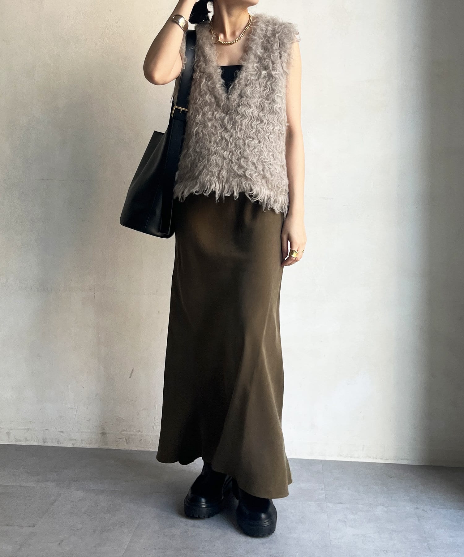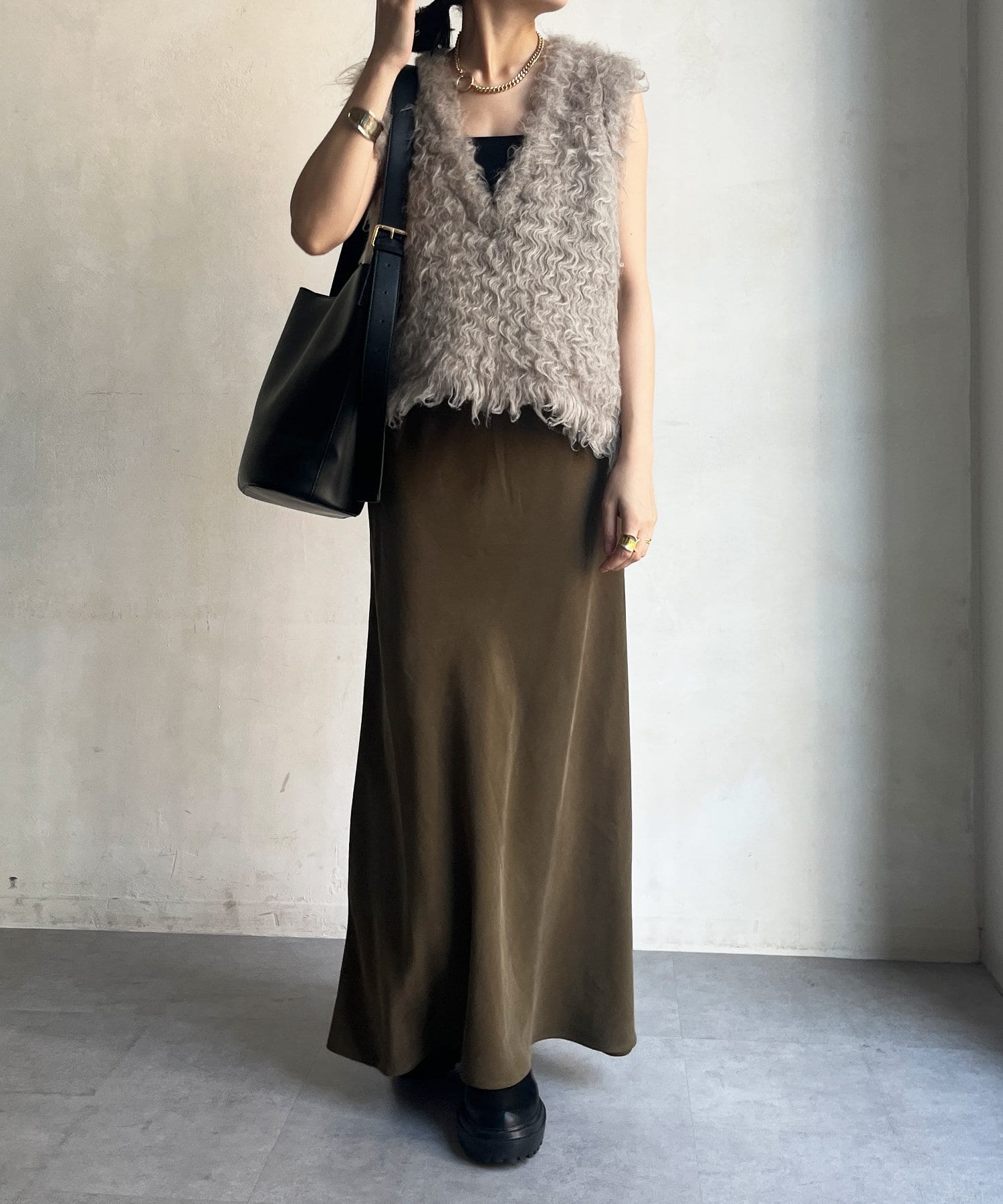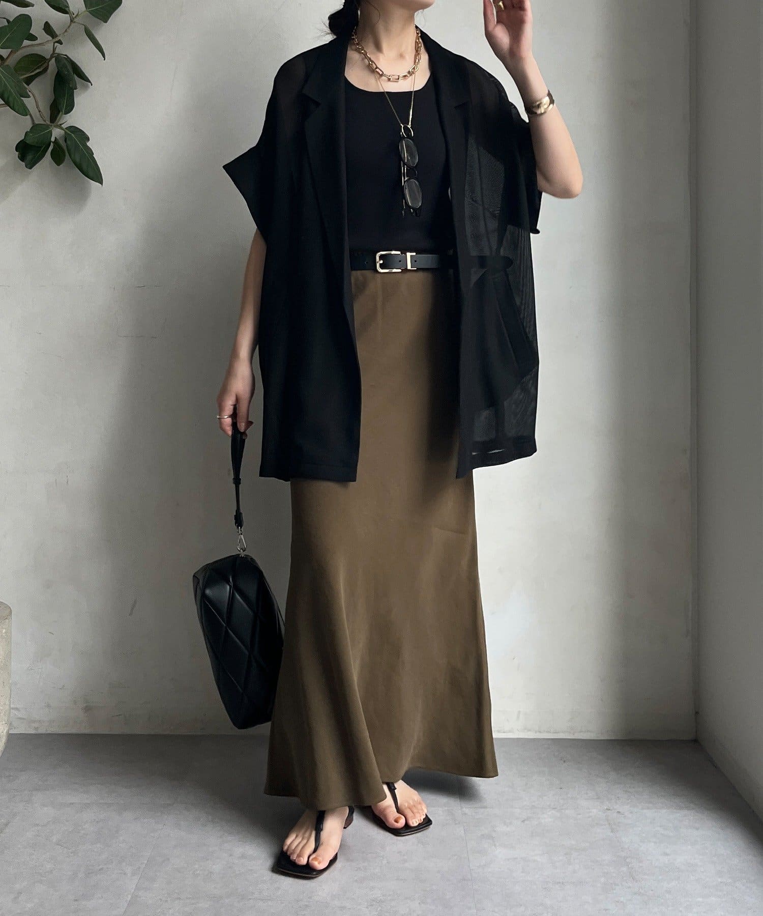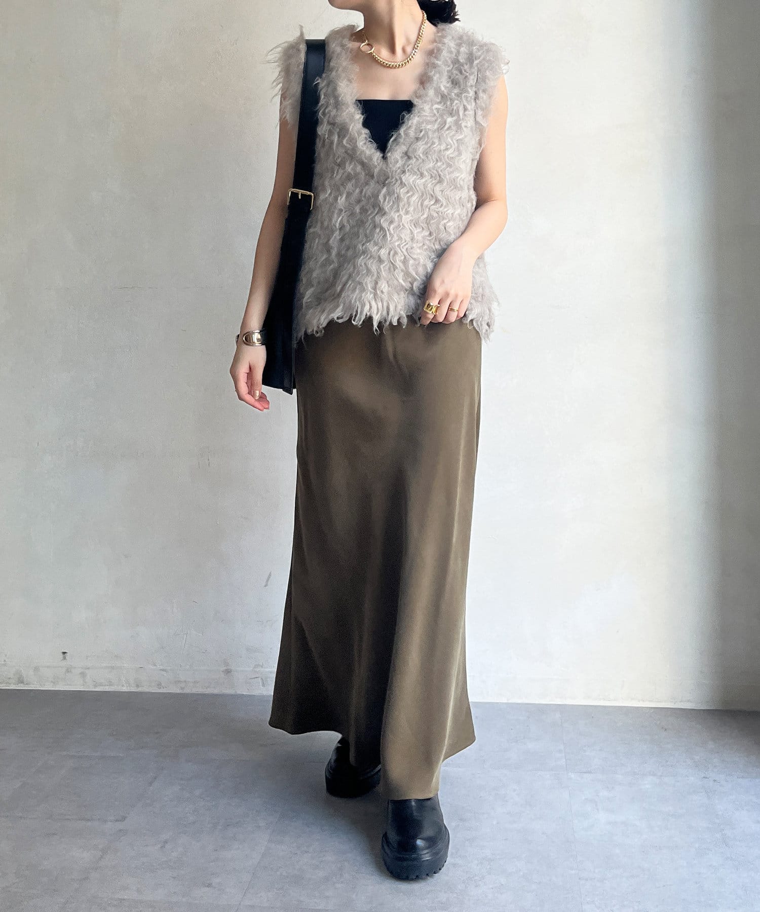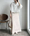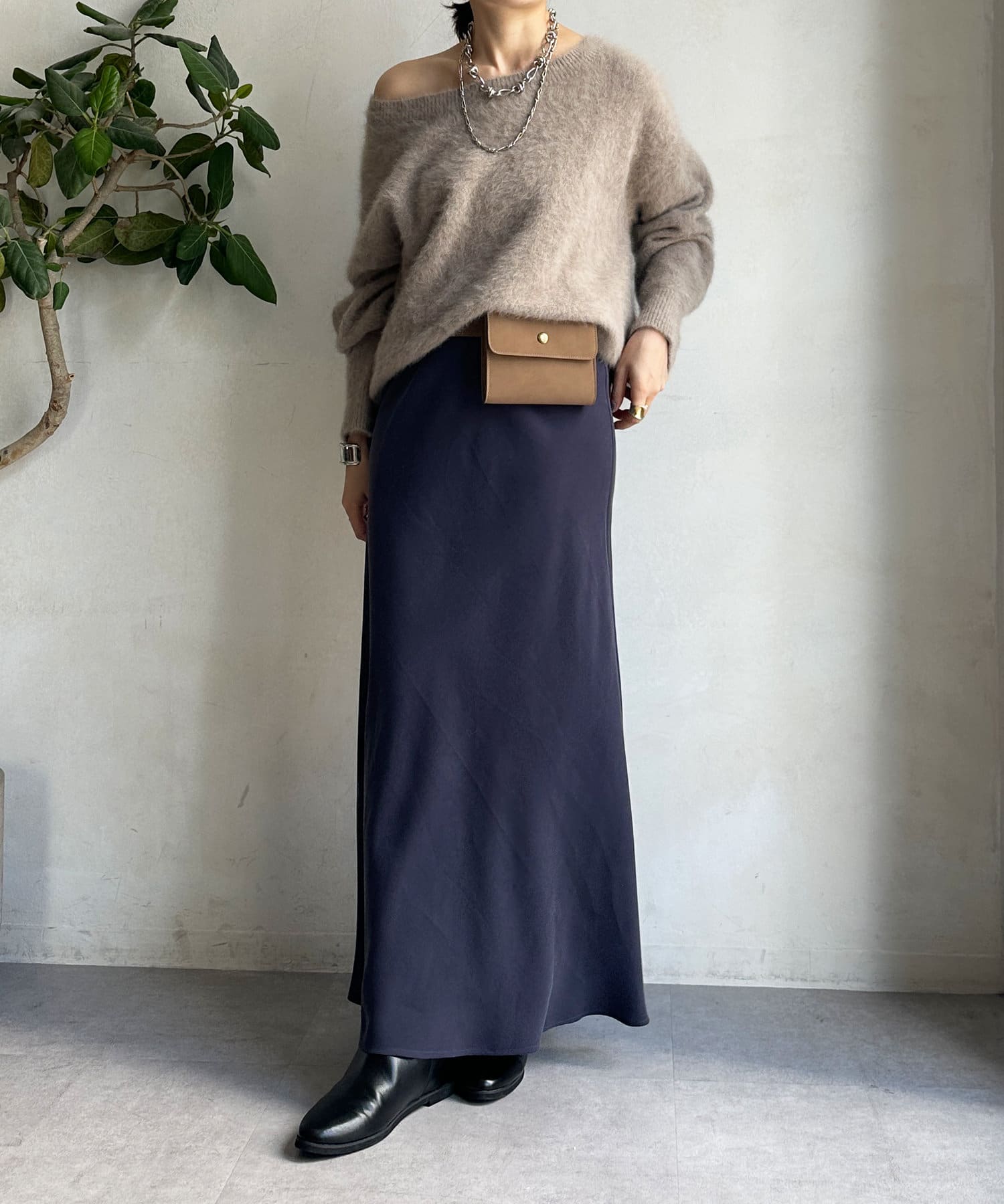 すっきりとしたきれいなシルエットがレディライクな印象を与えてくれるサテンスカート。