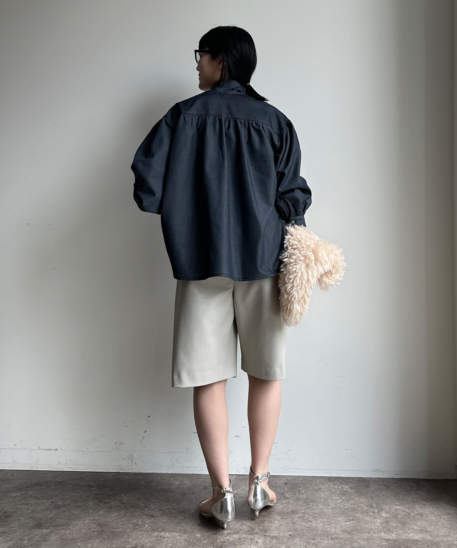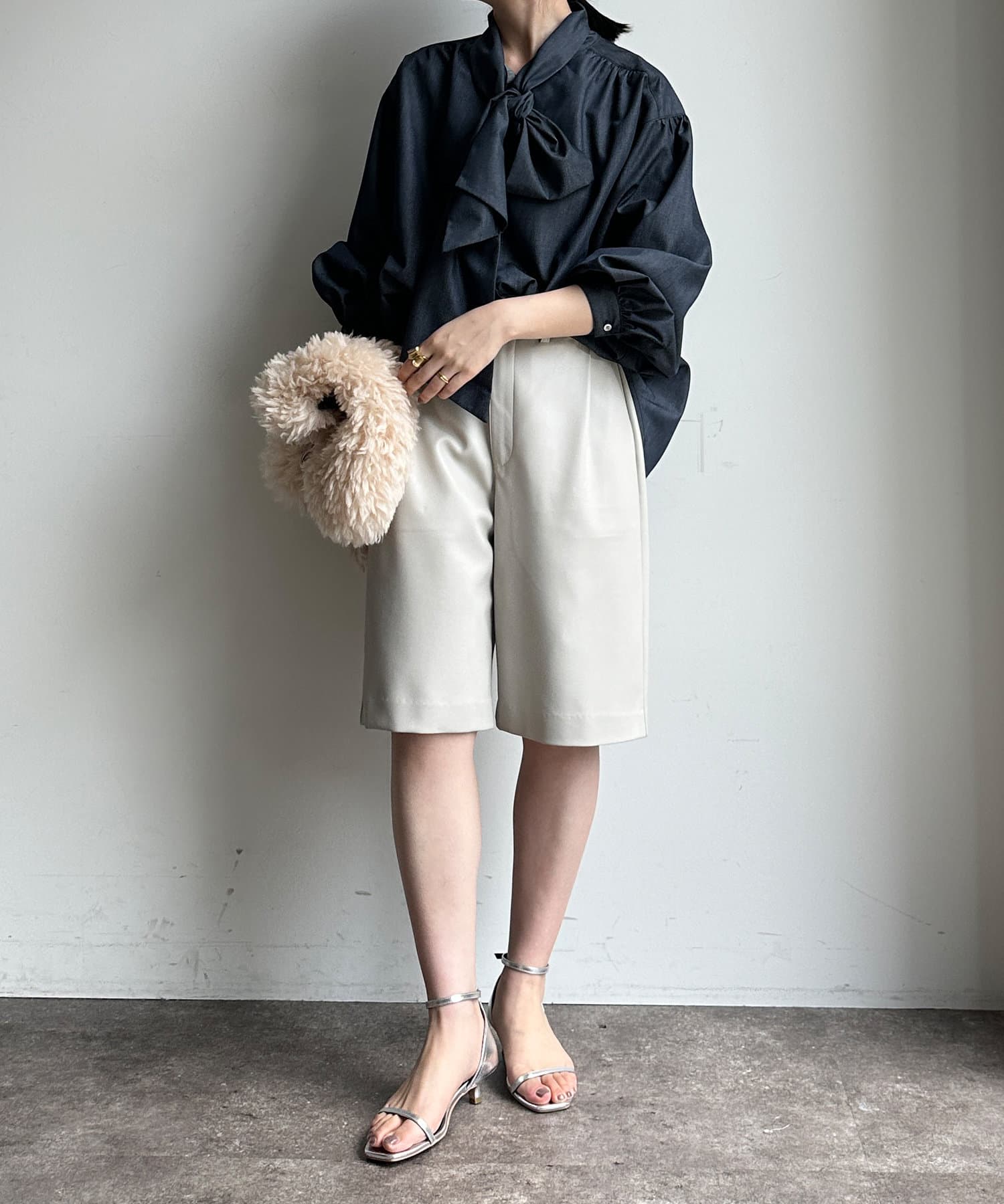 晩夏~秋にはブラウスなど、冬には表情のあるニットなどの質感の違うアイテムと合わすのがおすすめ。