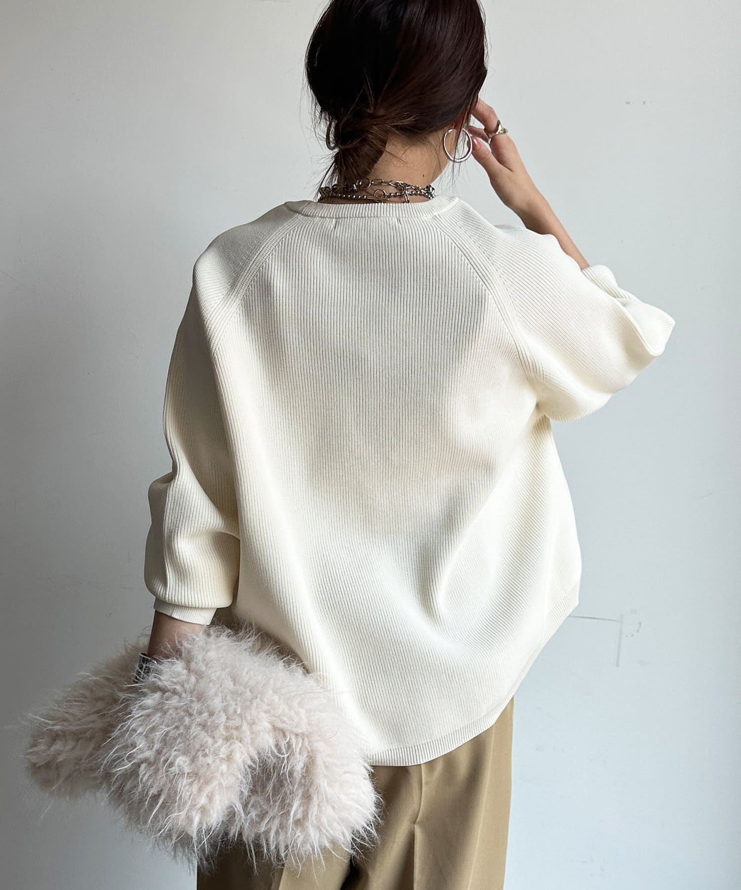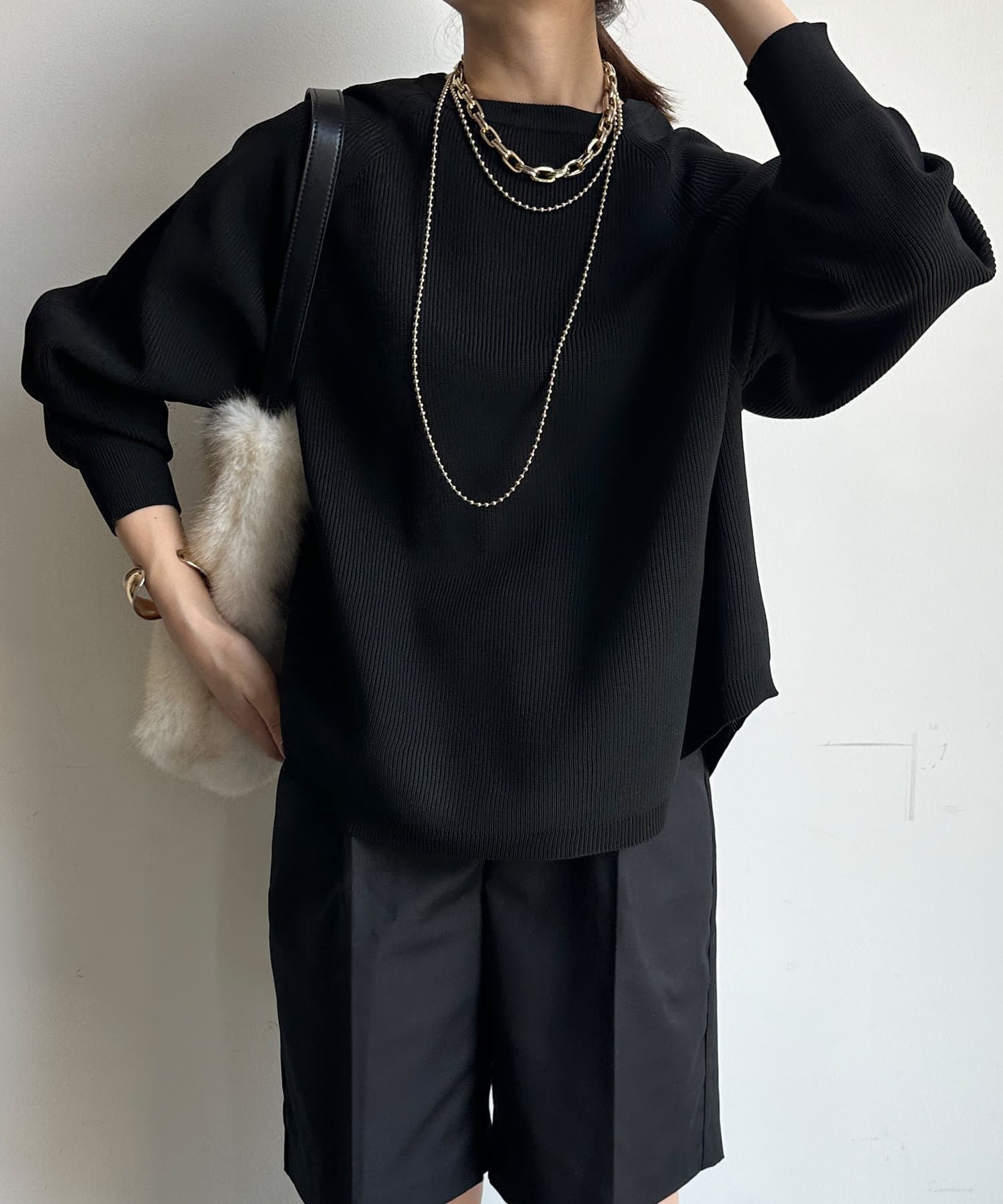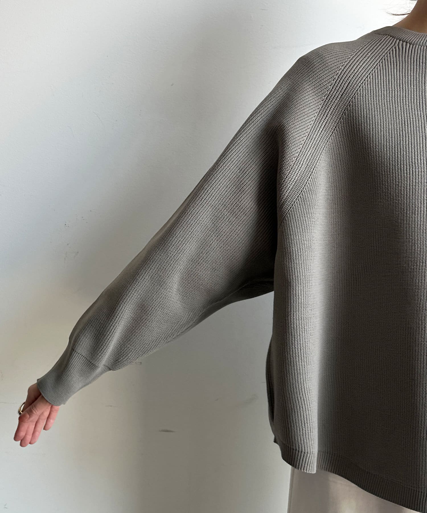 軽やかな着心地とチクチク感ない素材が魅力のニット。