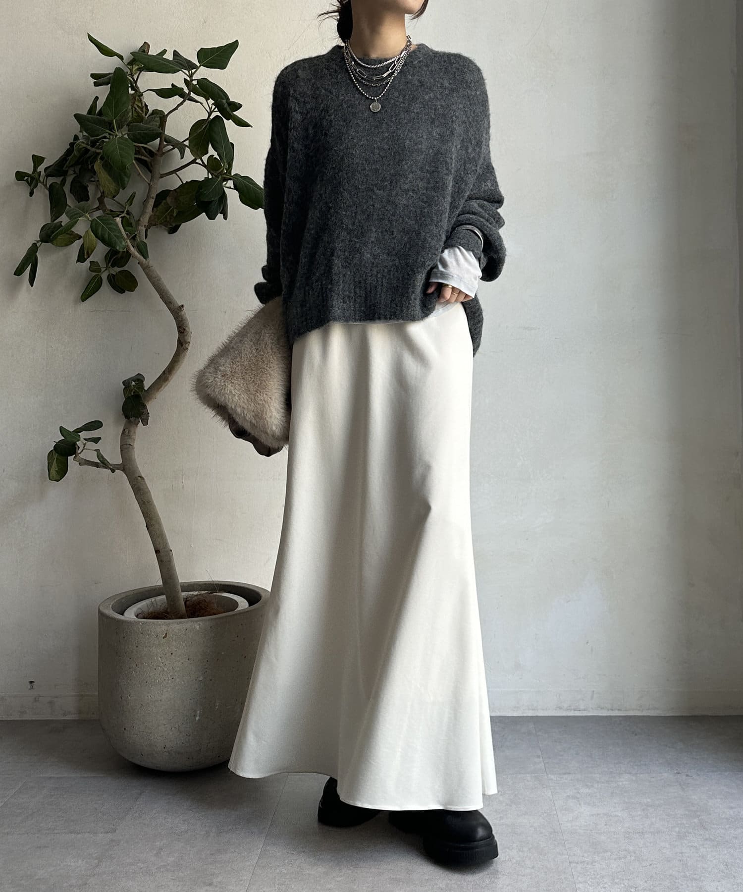 緩やかな後ろ下がりデザインとバック裾部分にはスリットを加え、程よく抜け感の出るポイントに。