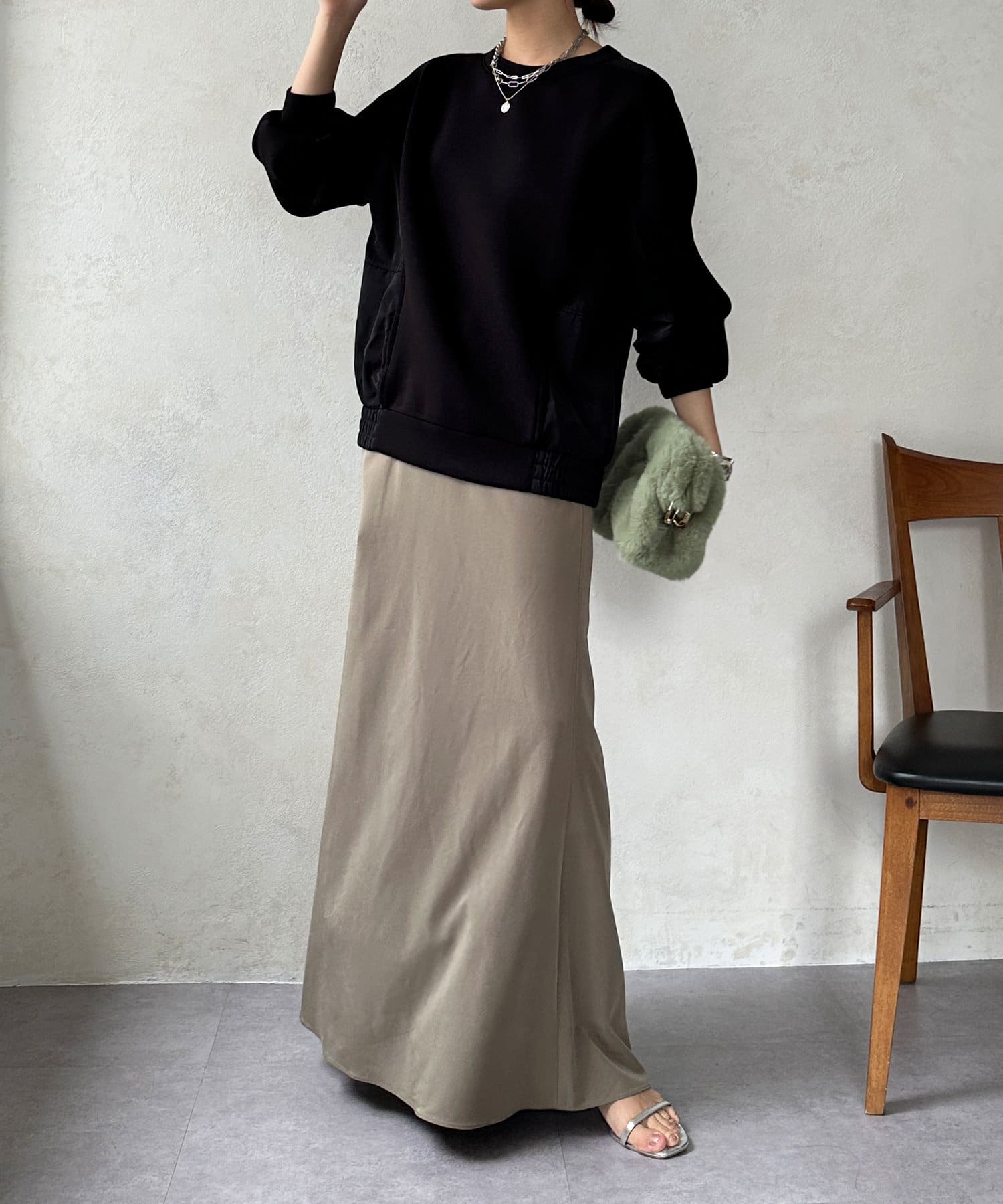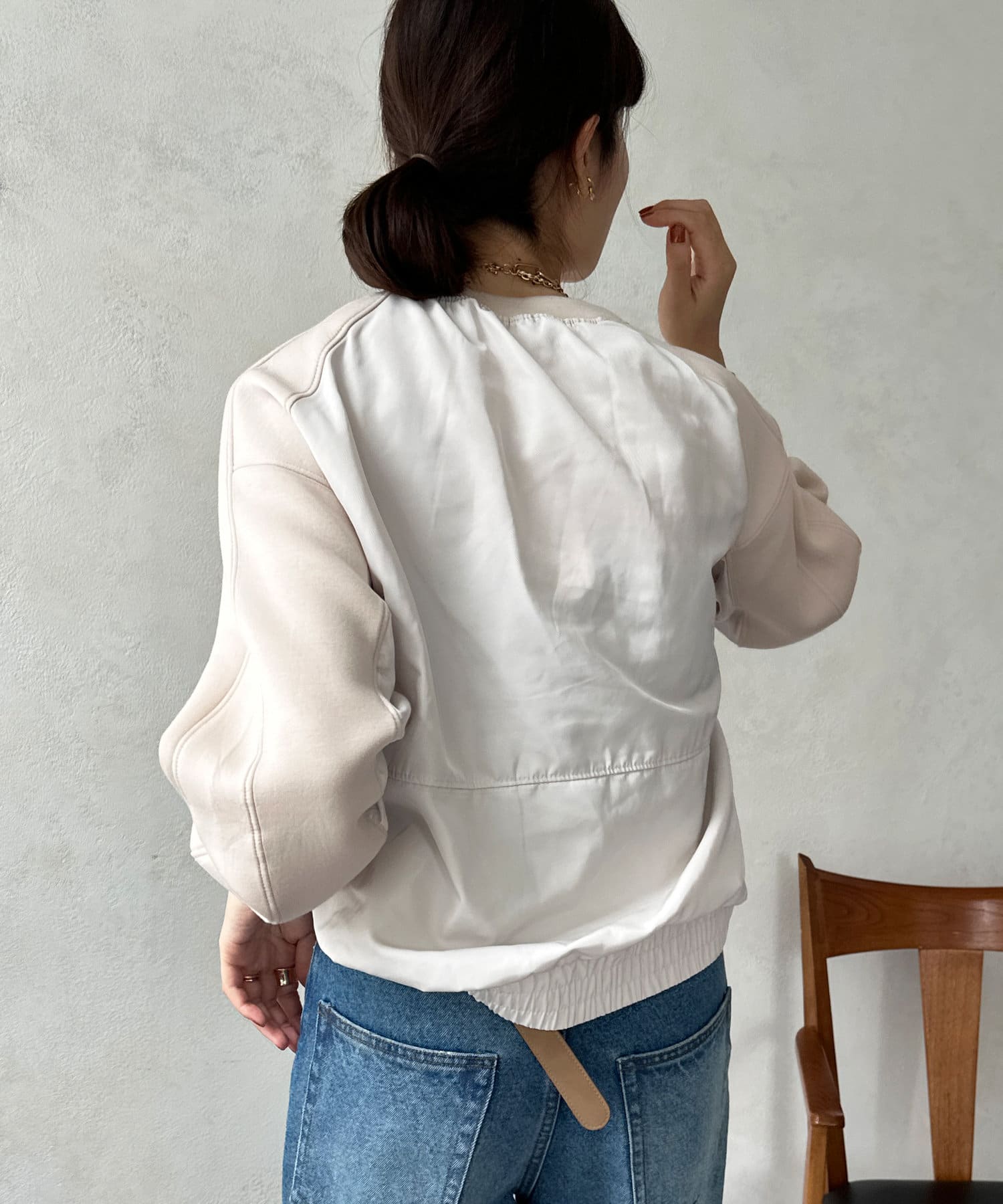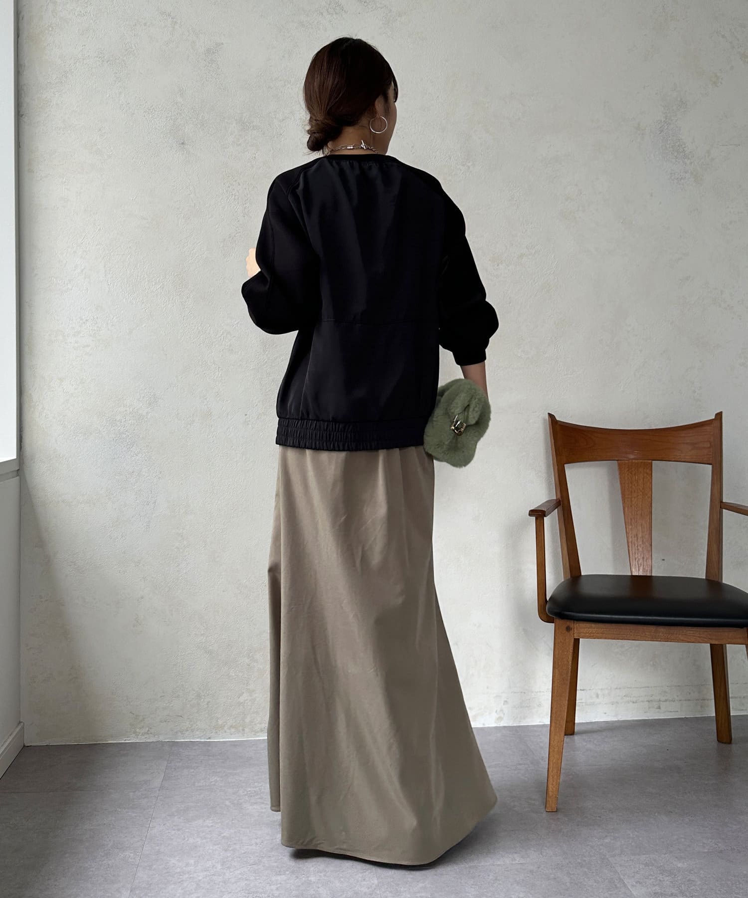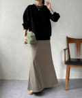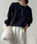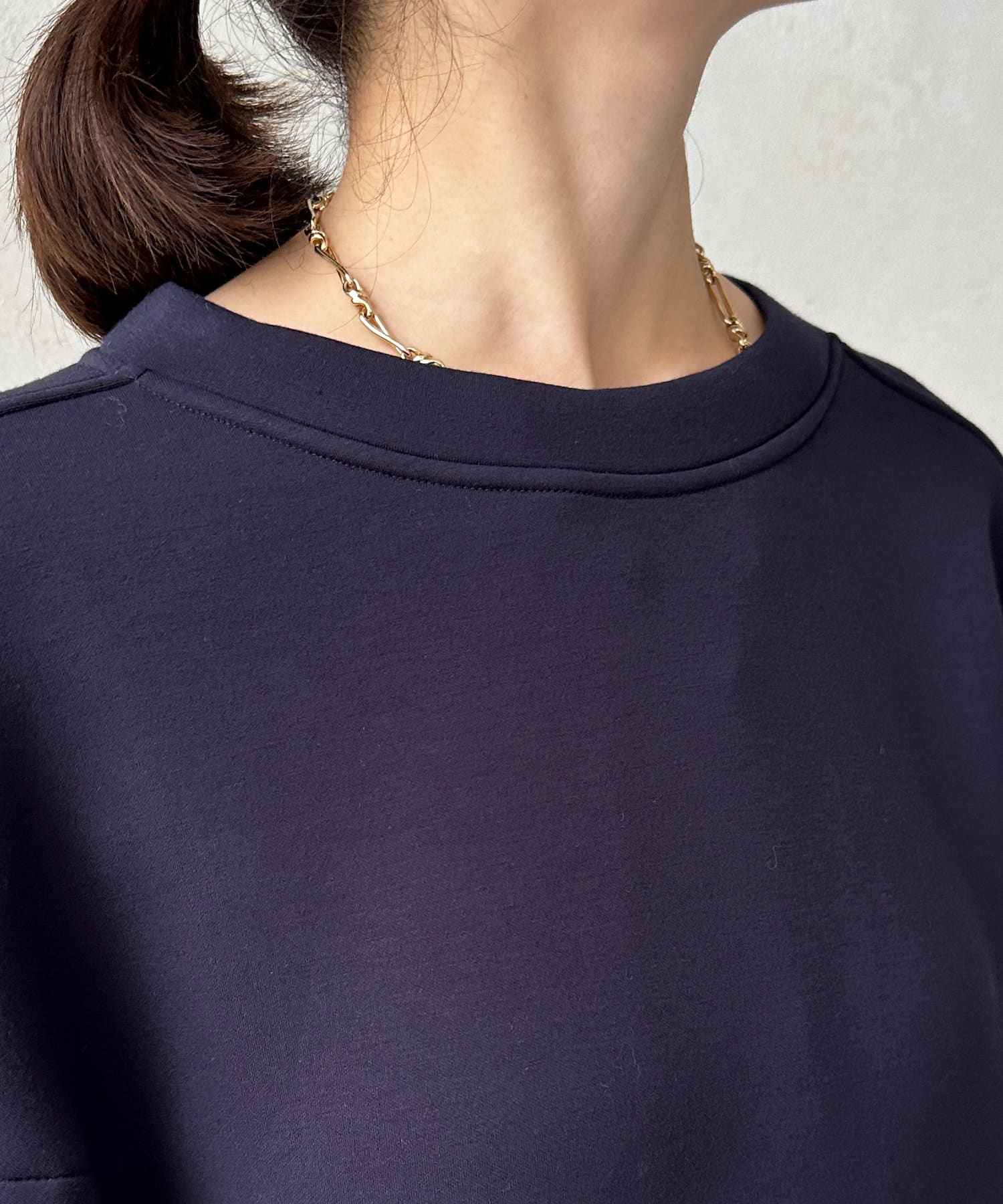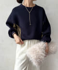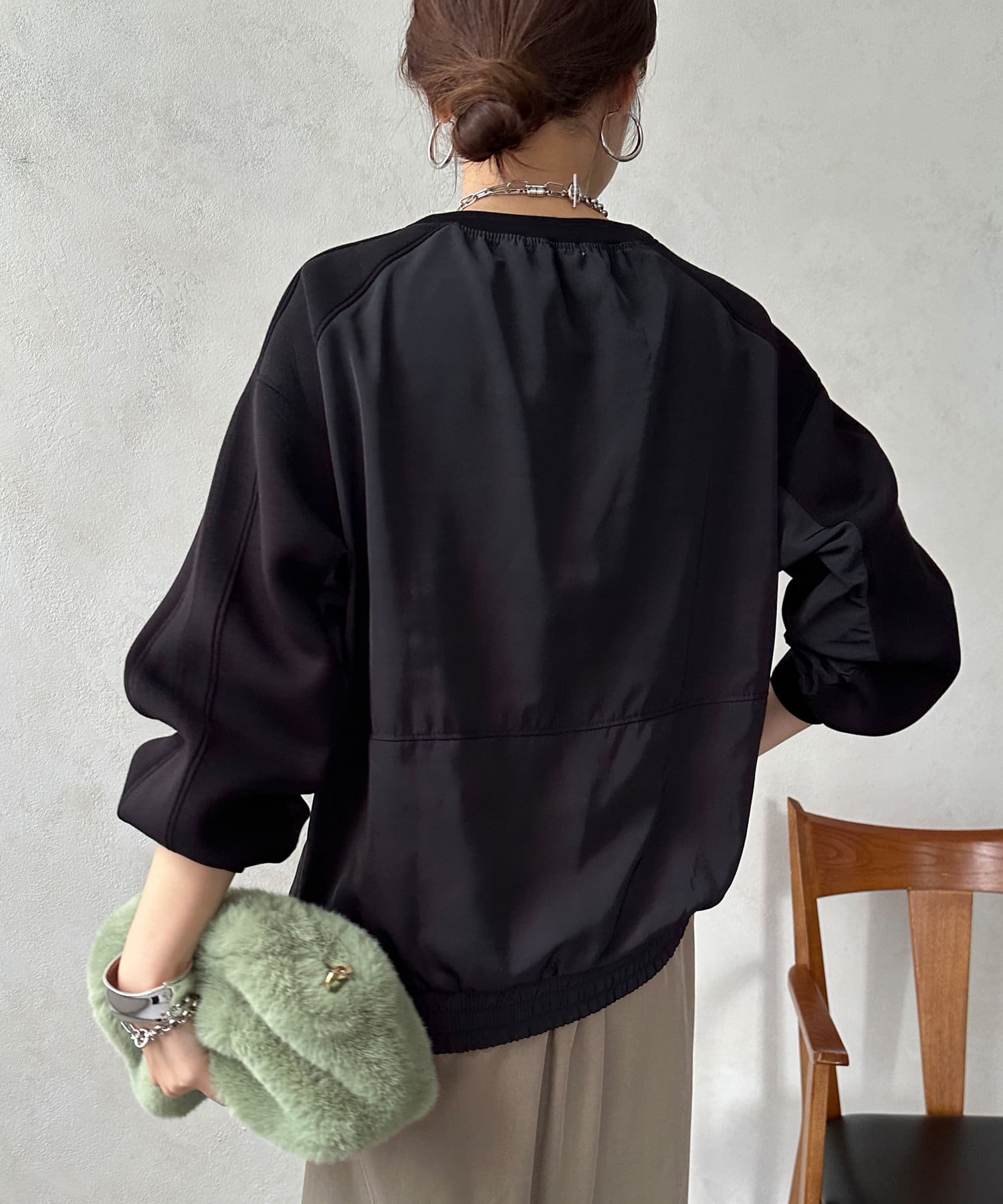 ベックネック部分のギャザーや、切り替え、サイド裾にゴムを入れた仕様など、自然と丸みの出るシルエットをが特徴です。