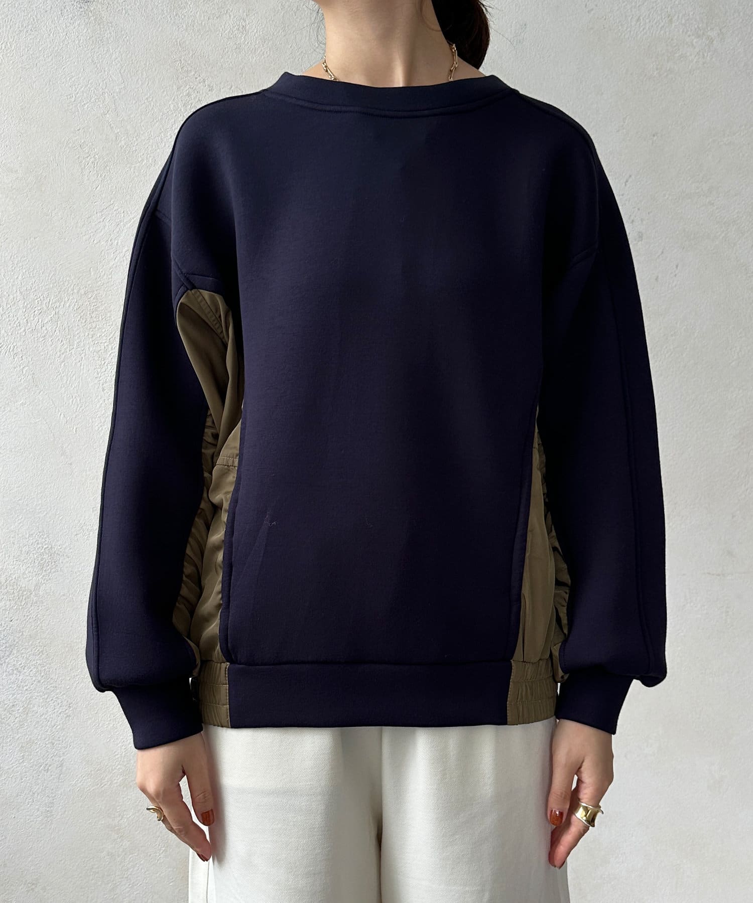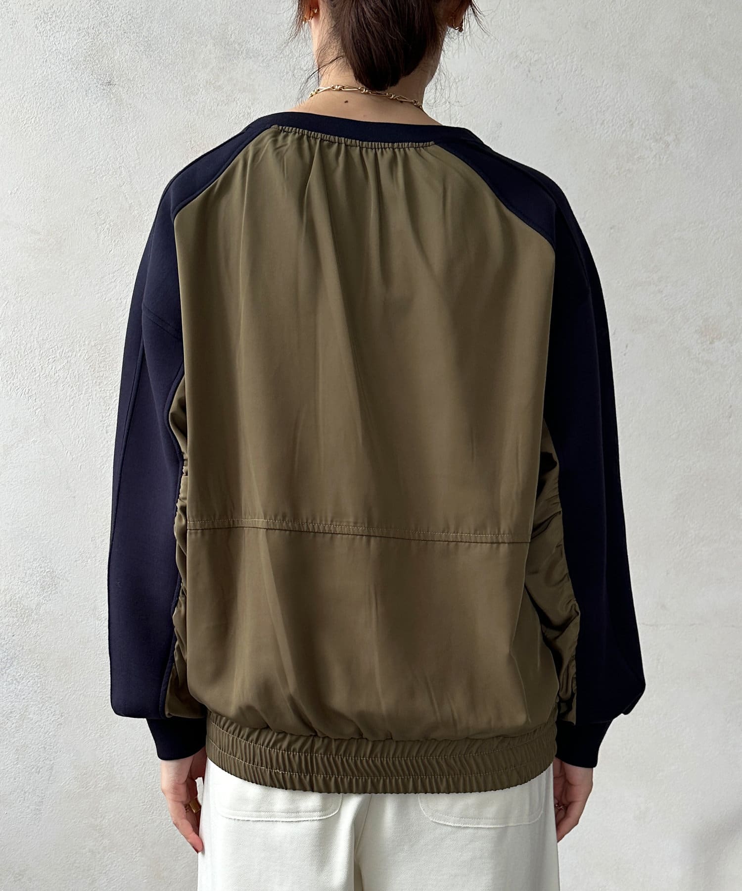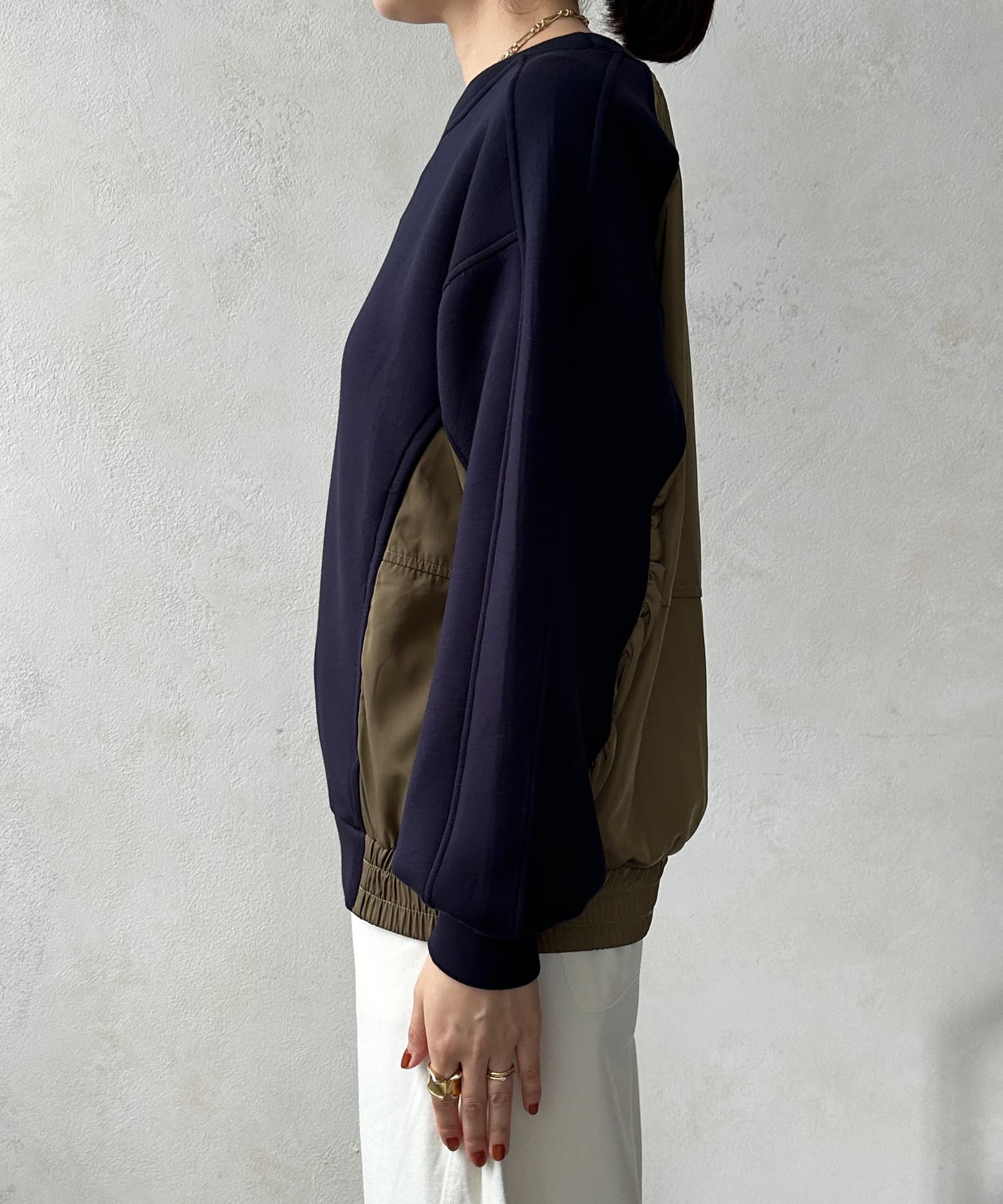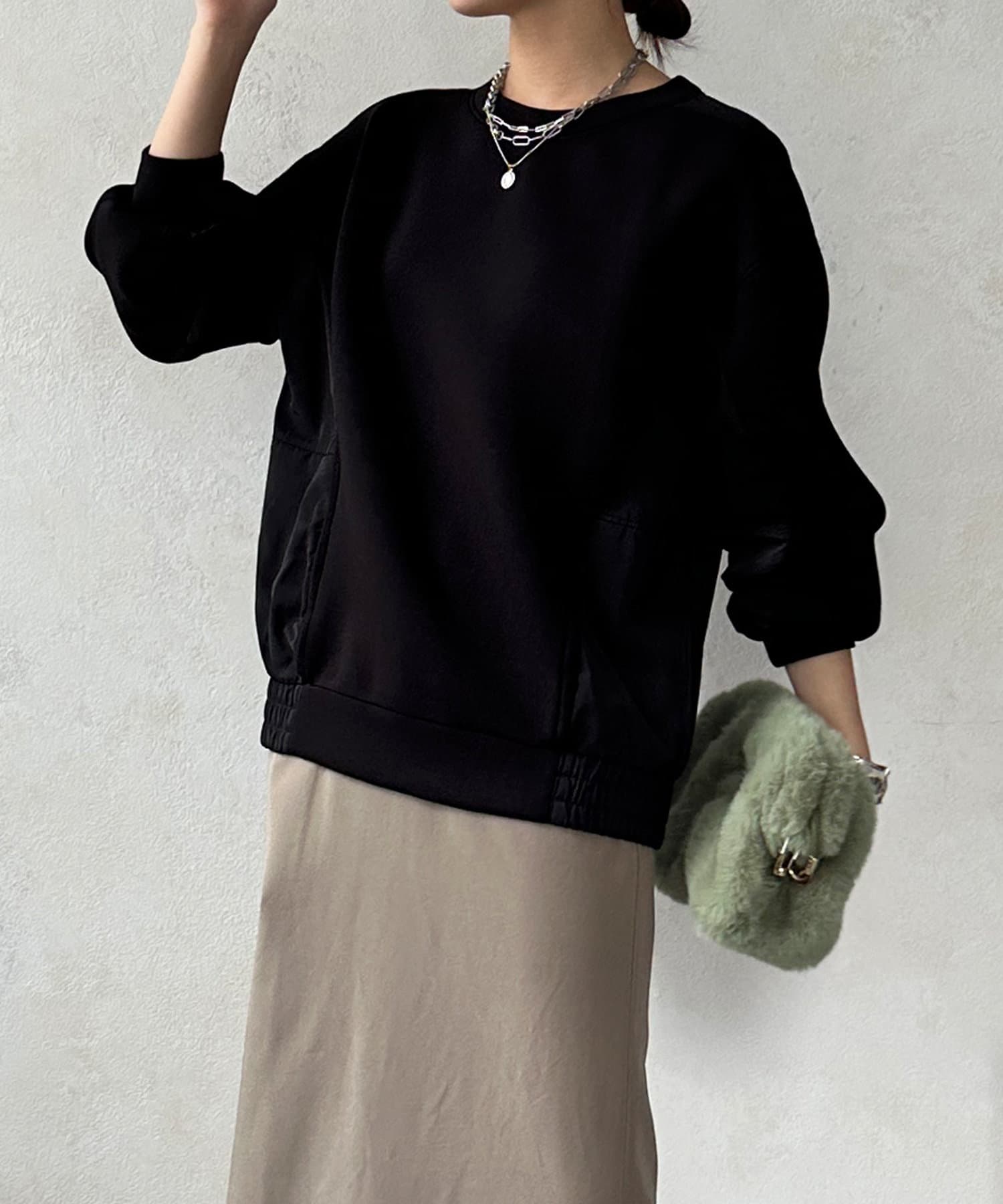 異素材切り替えがおしゃれなプルオーバー。