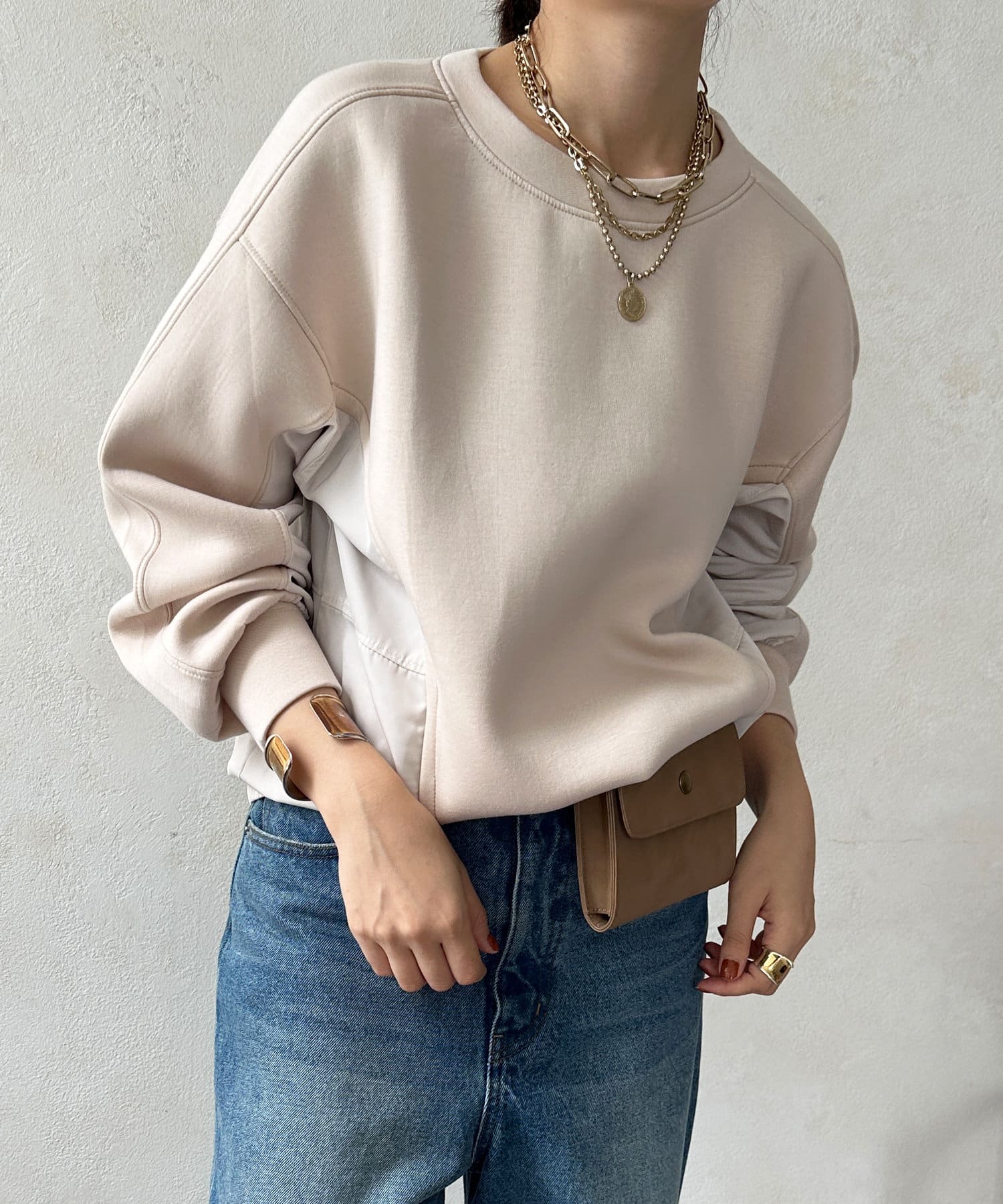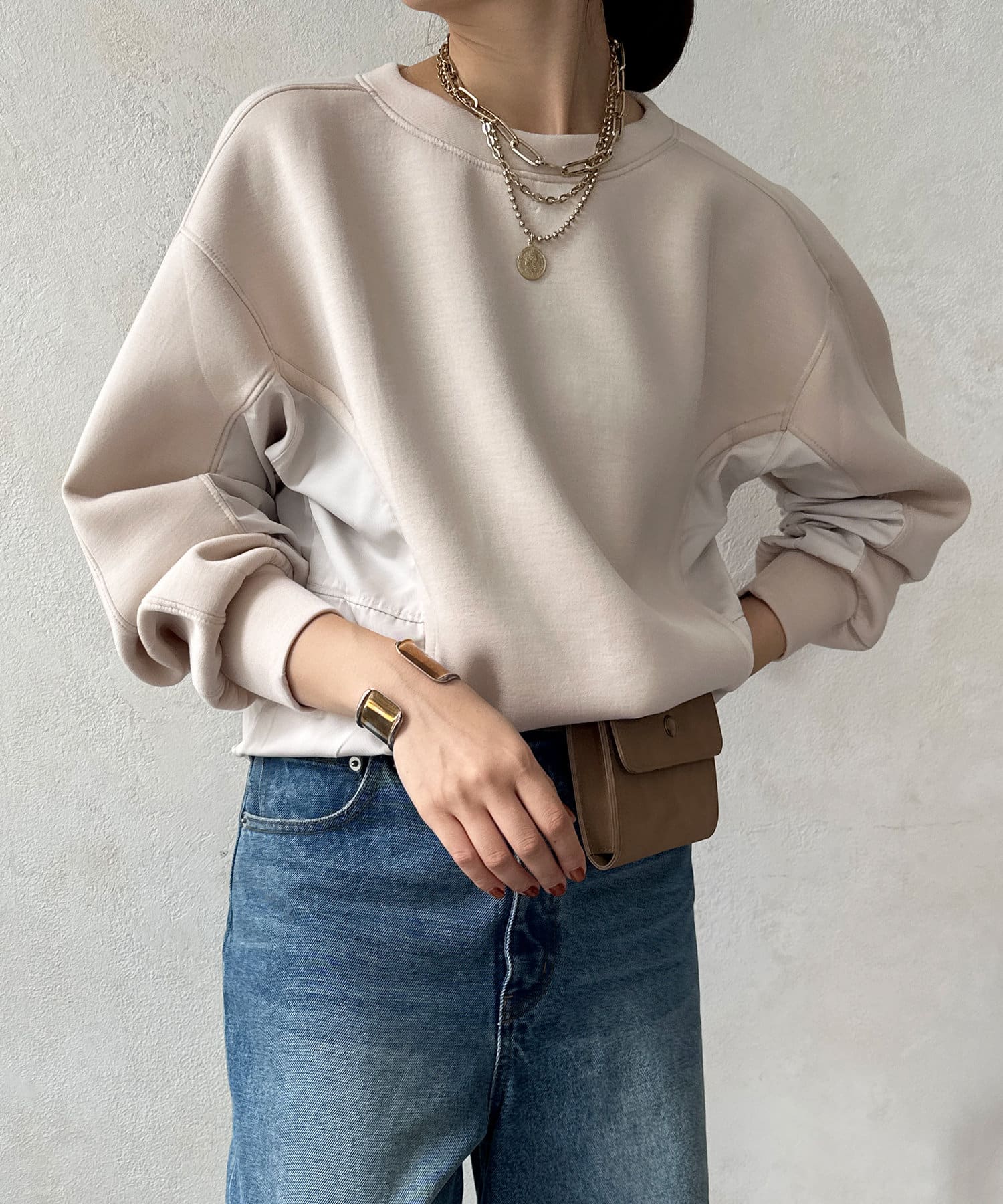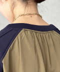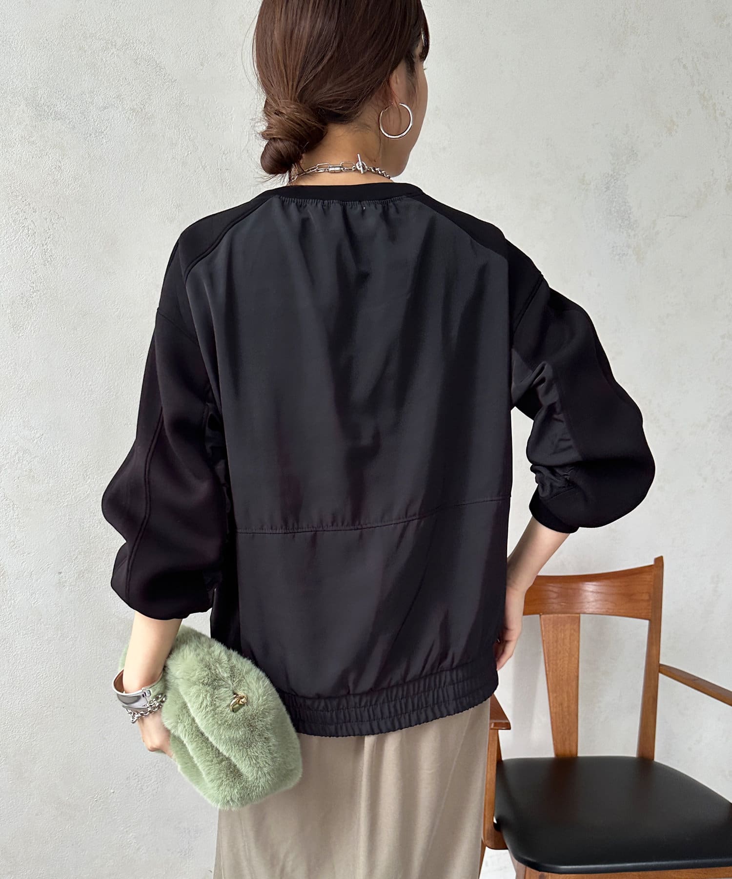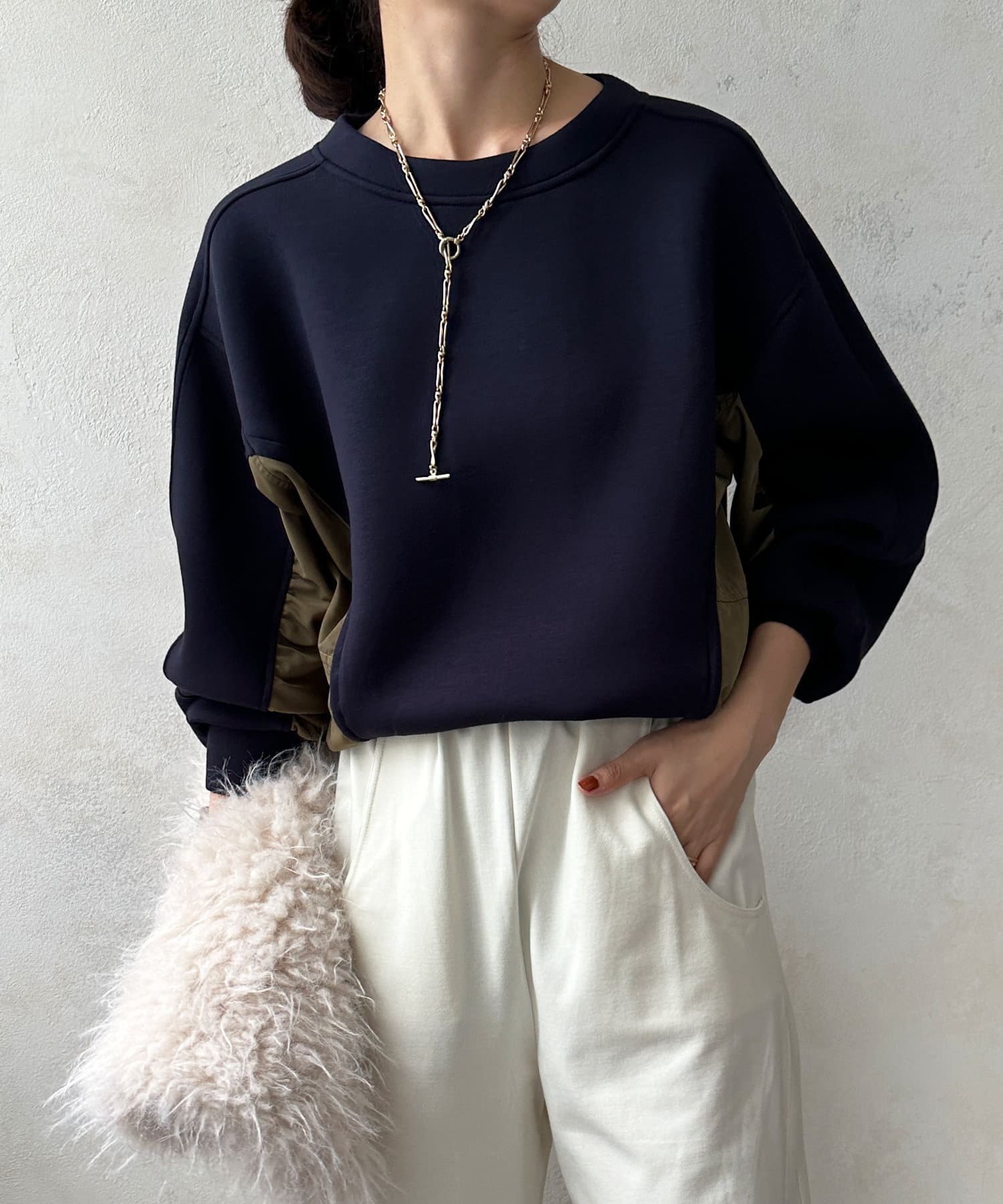 異素材切り替えがおしゃれなプルオーバー。