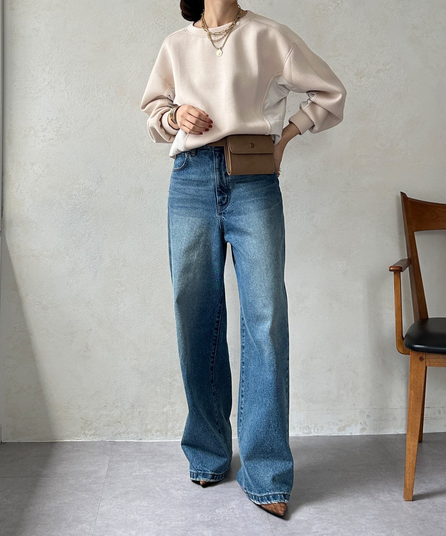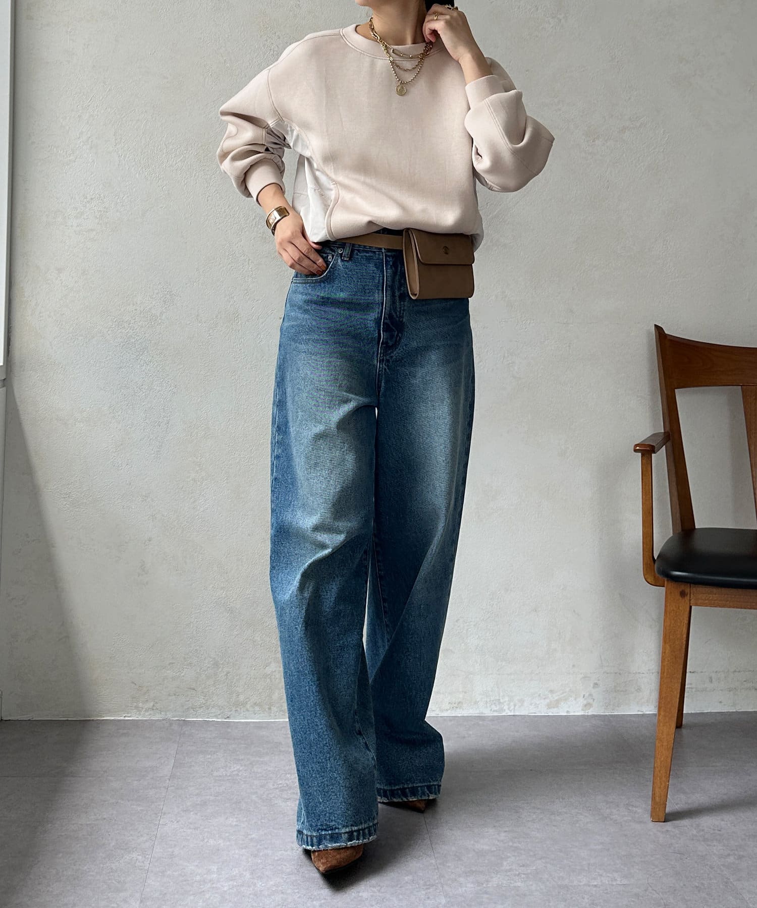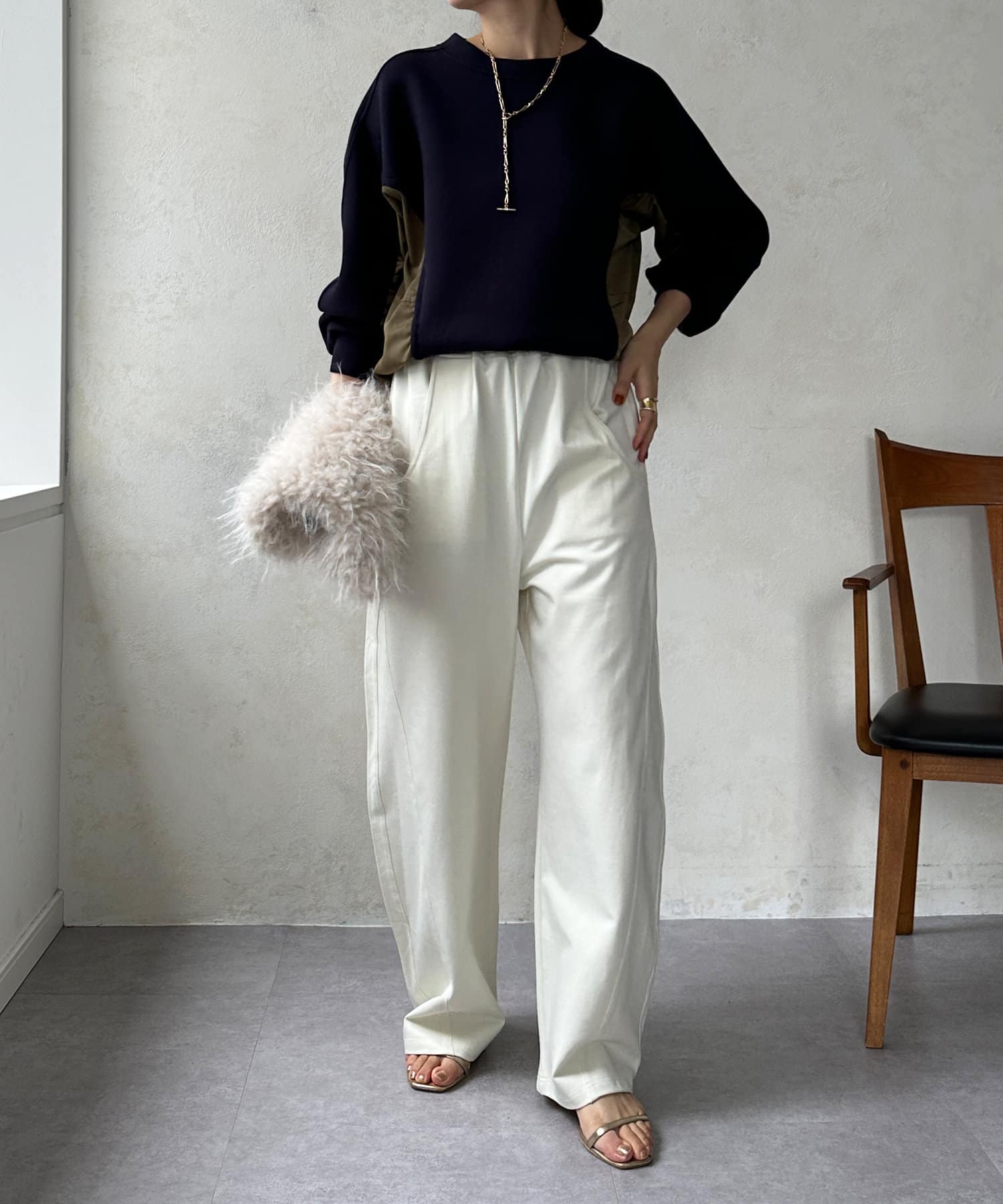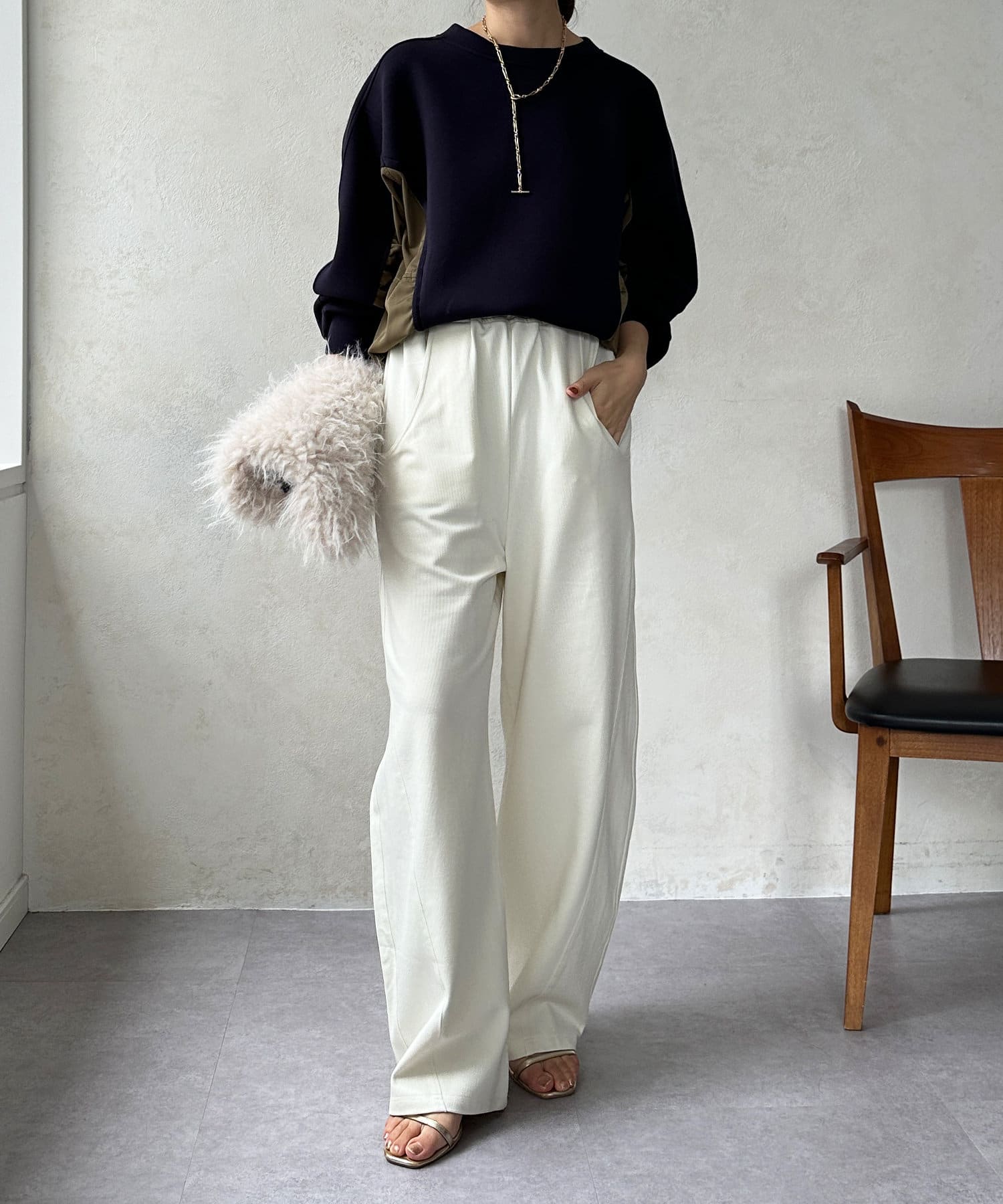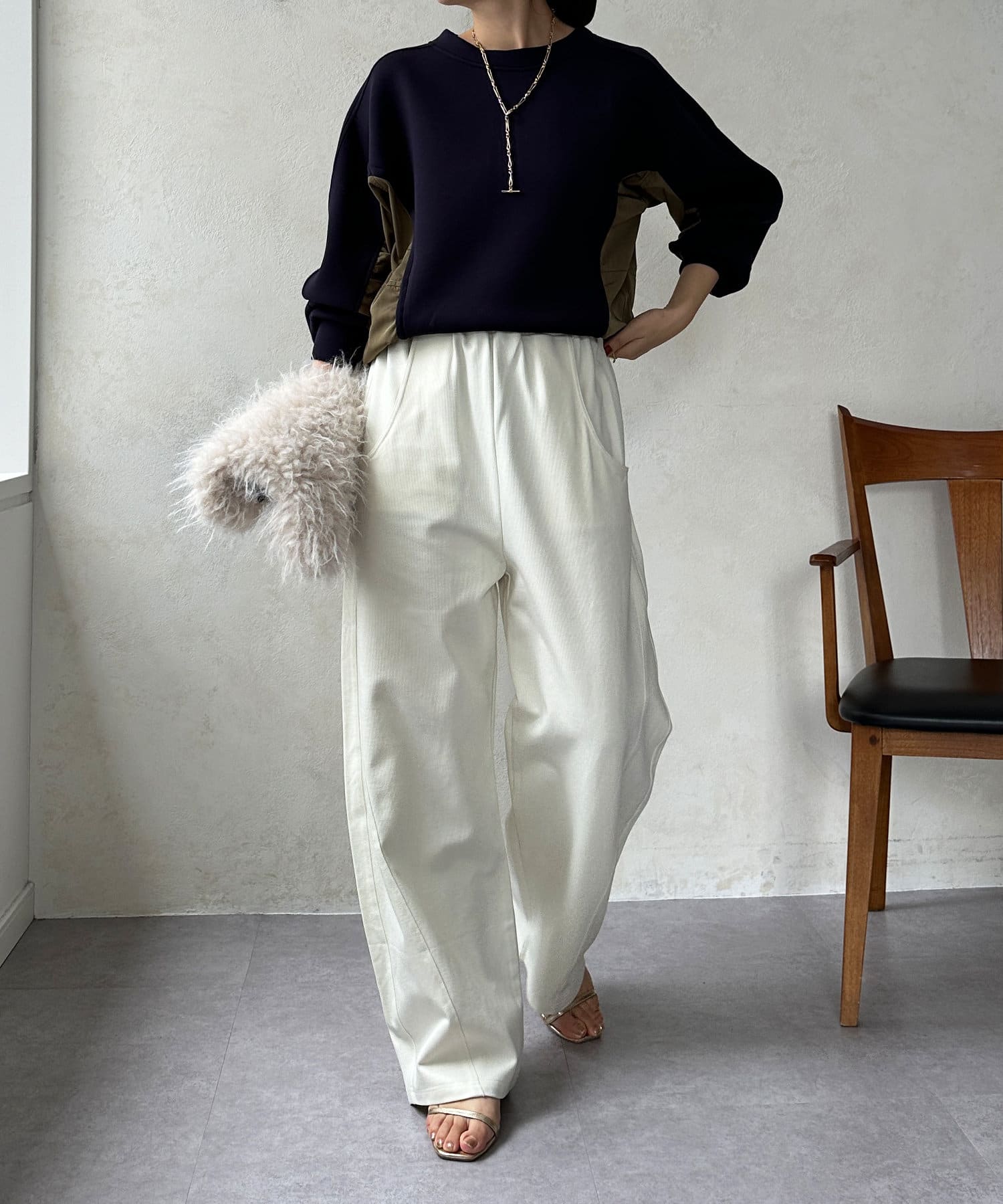 ウエスト高めのパンツと合わせます
