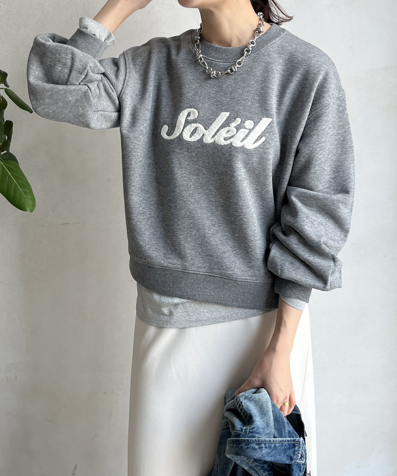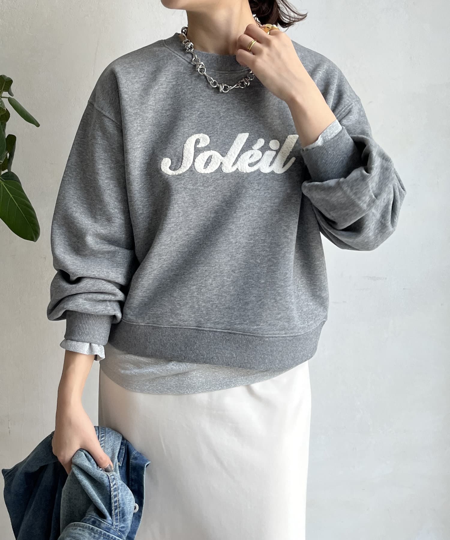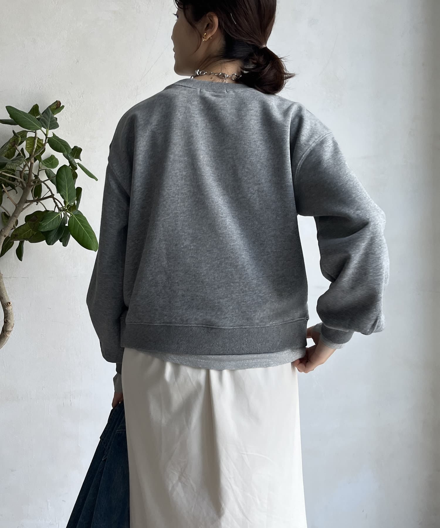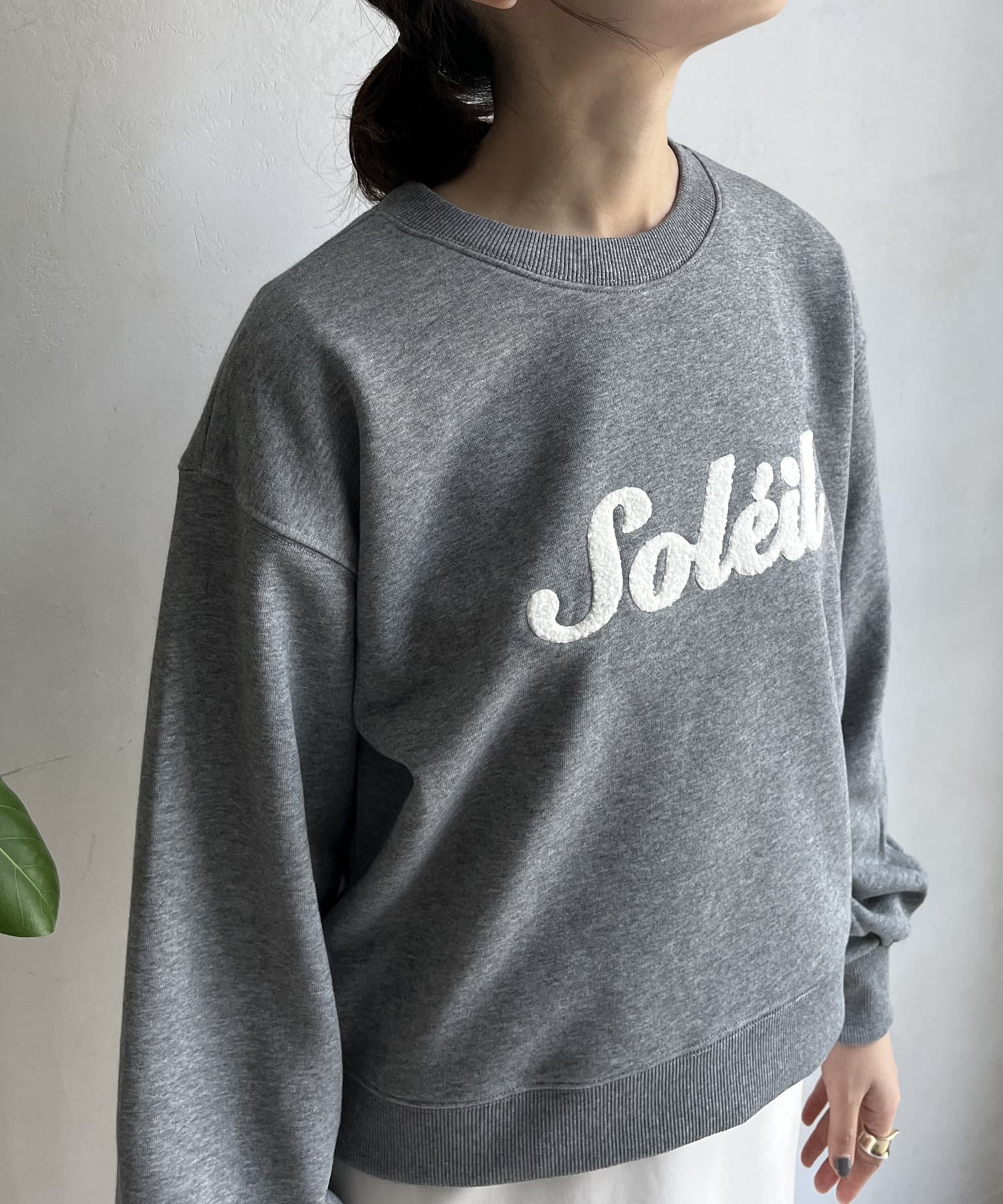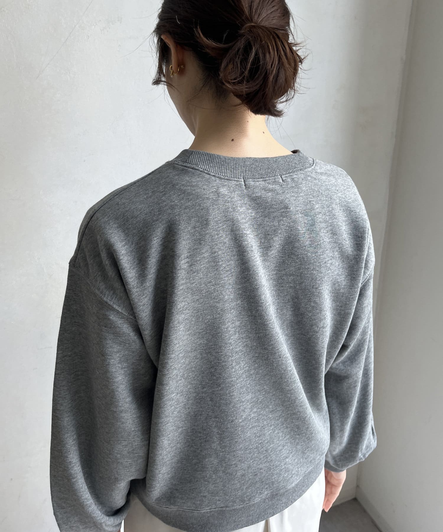 シンプルながら、サガラ刺繡がスタイリングのポイントになるスウエット。
