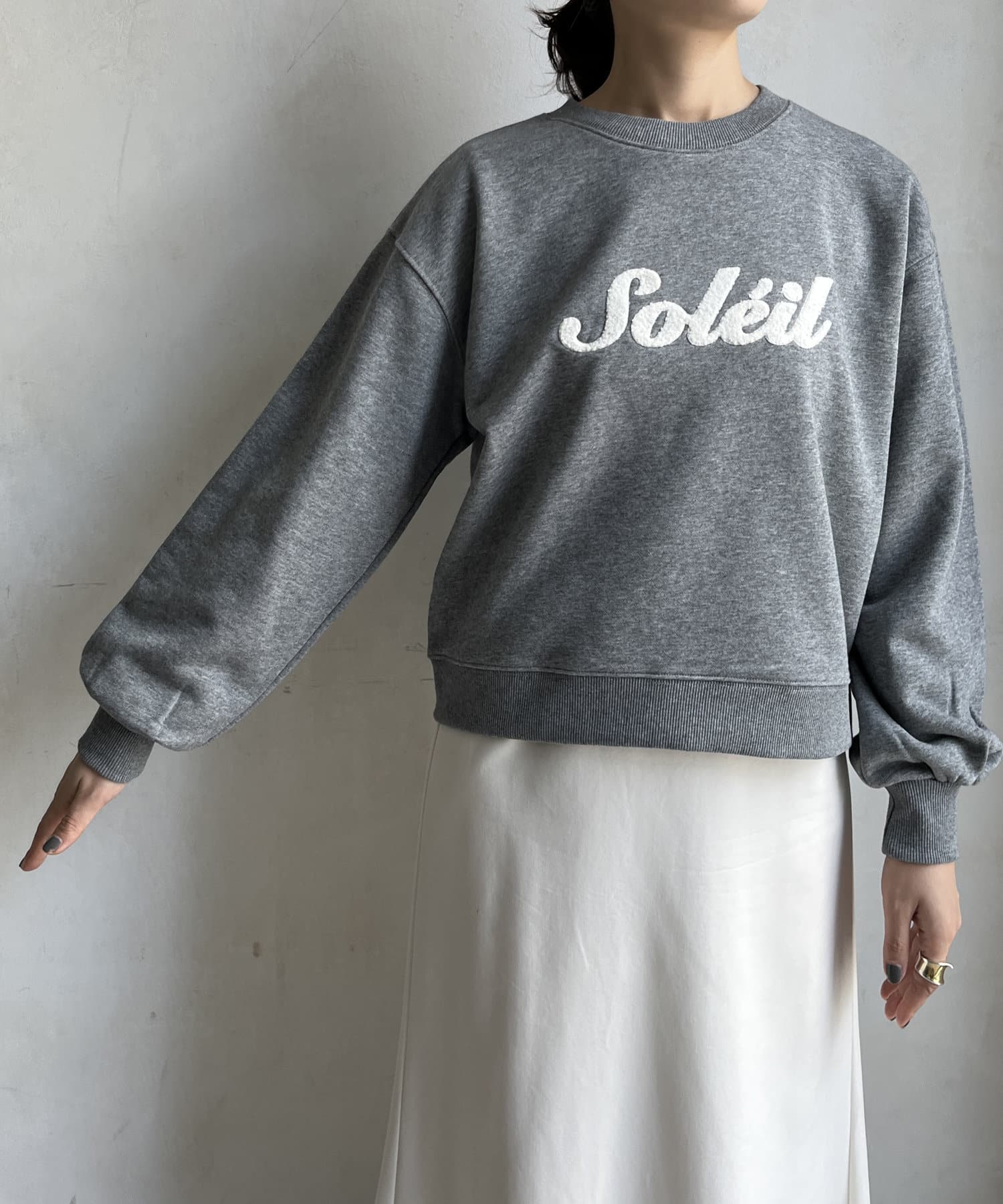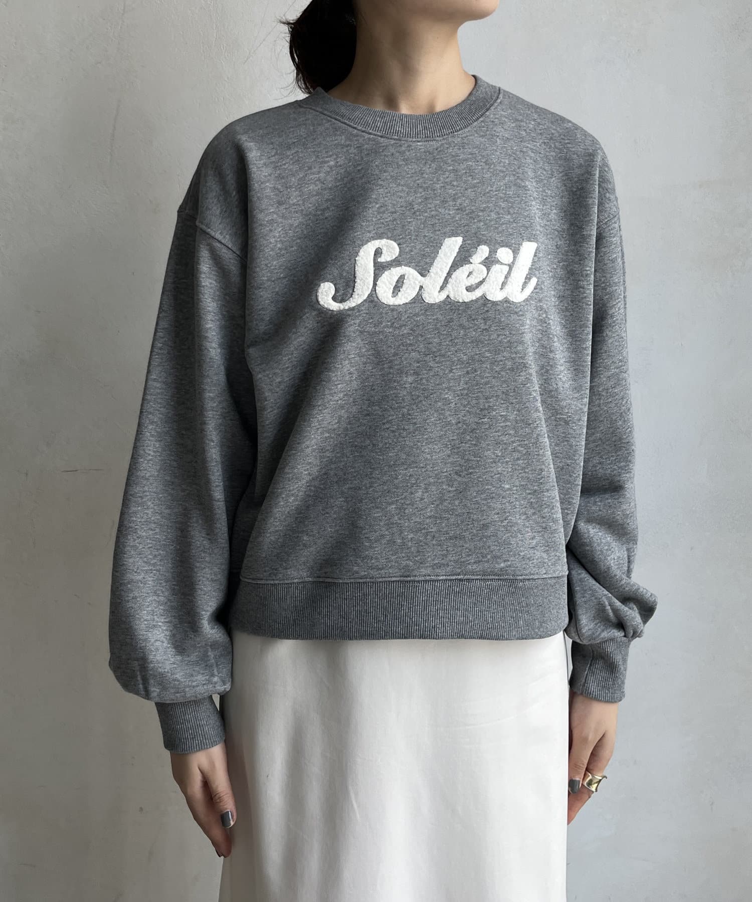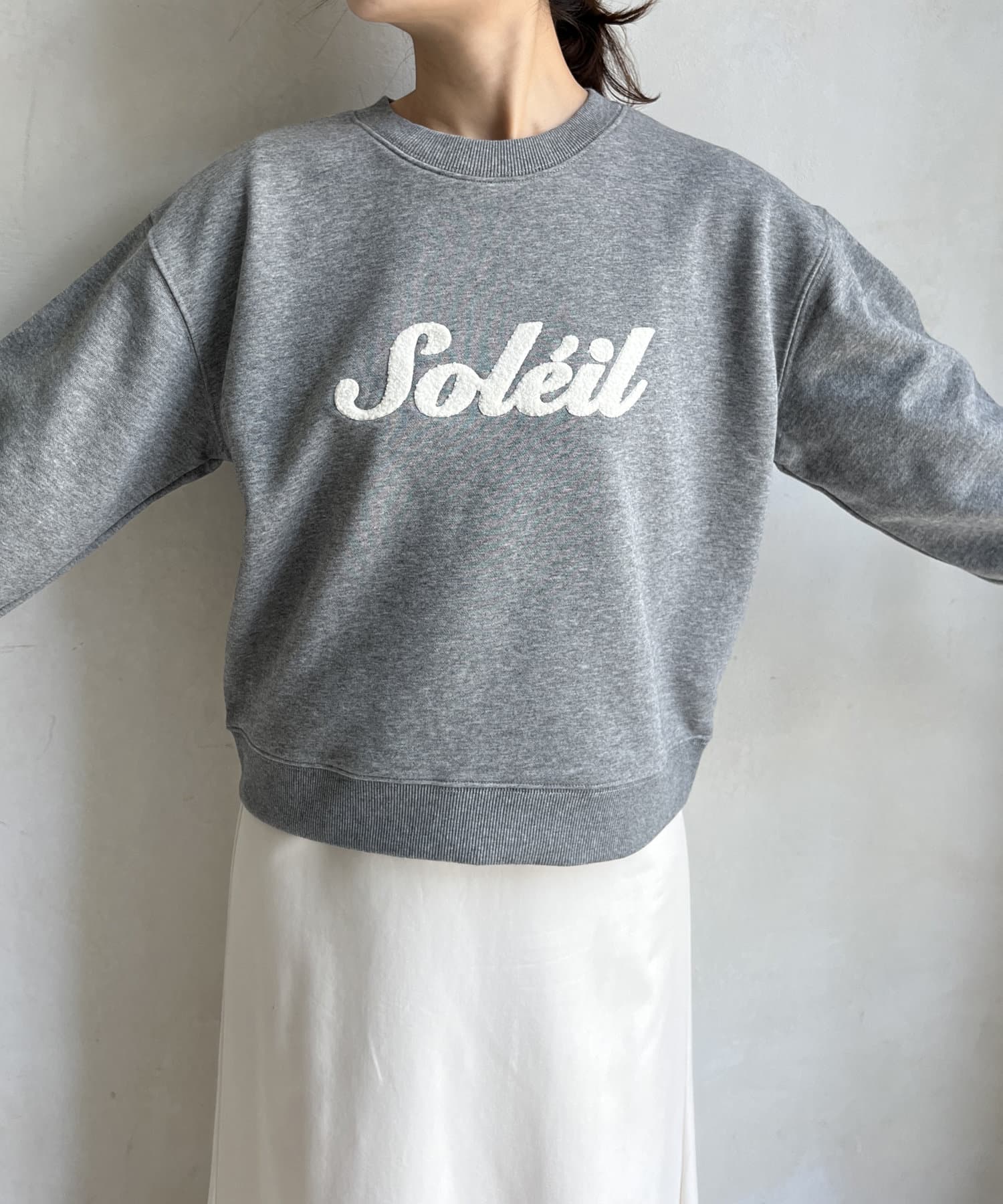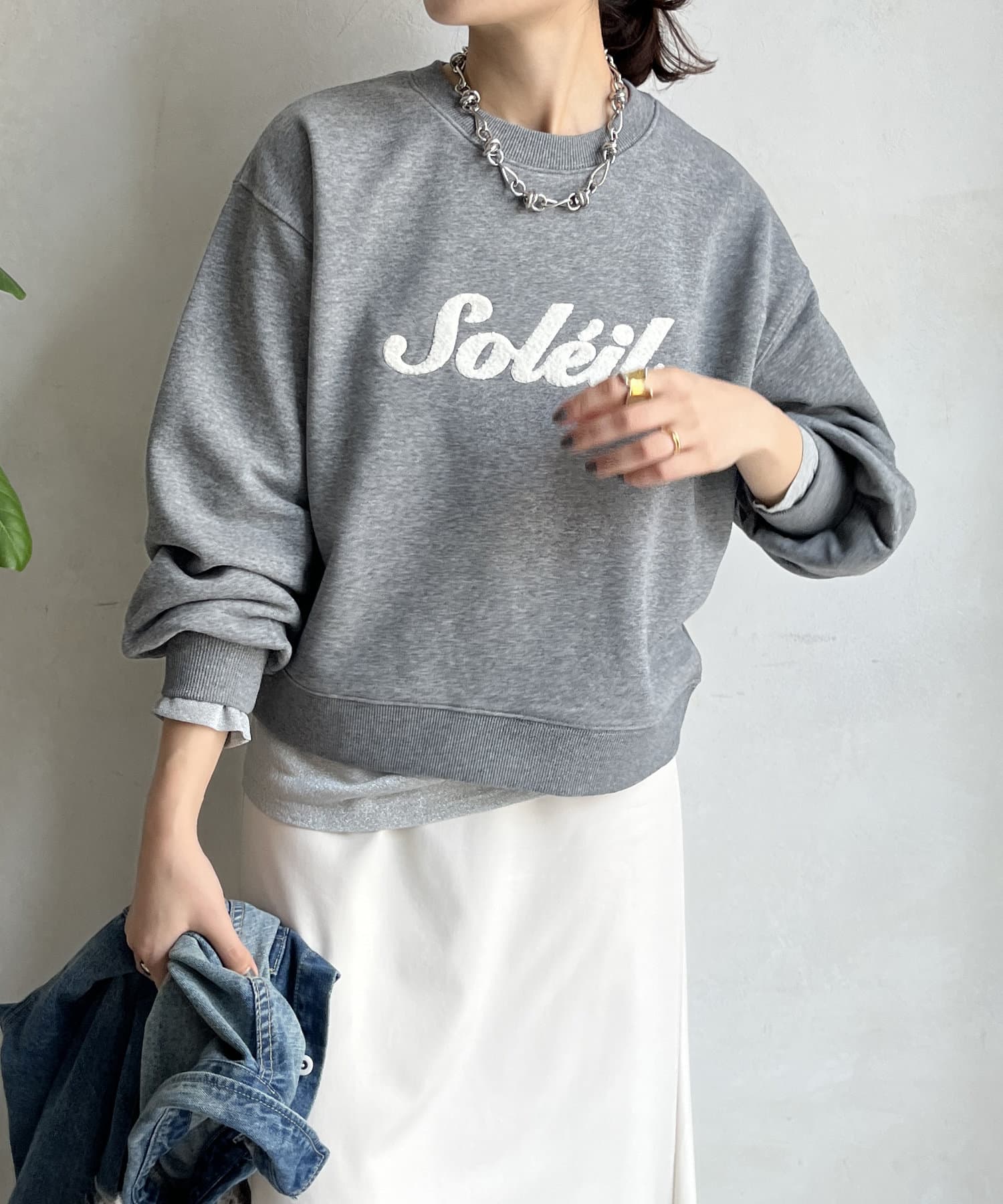 シンプルながら、サガラ刺繡がスタイリングのポイントになるスウエット。