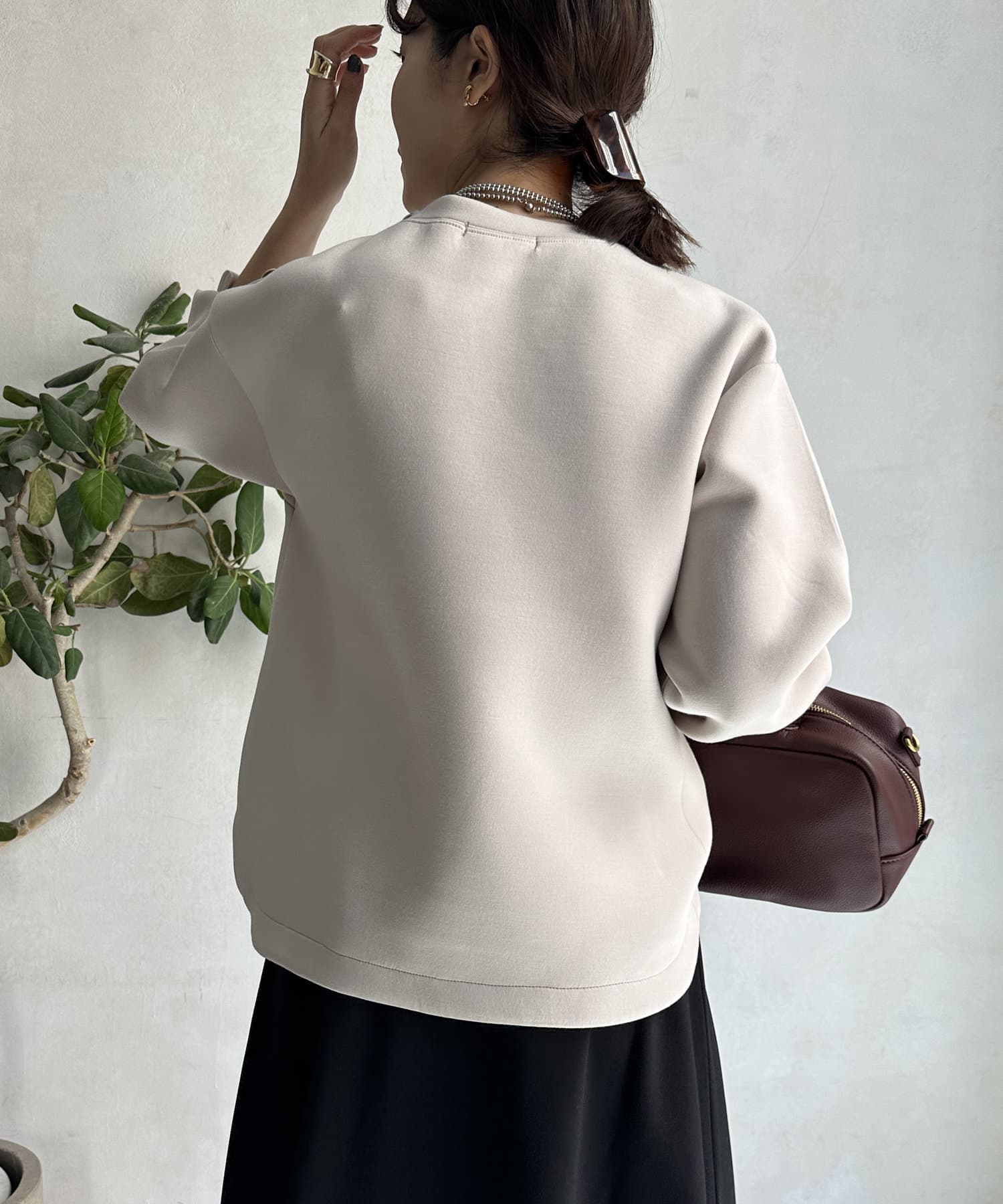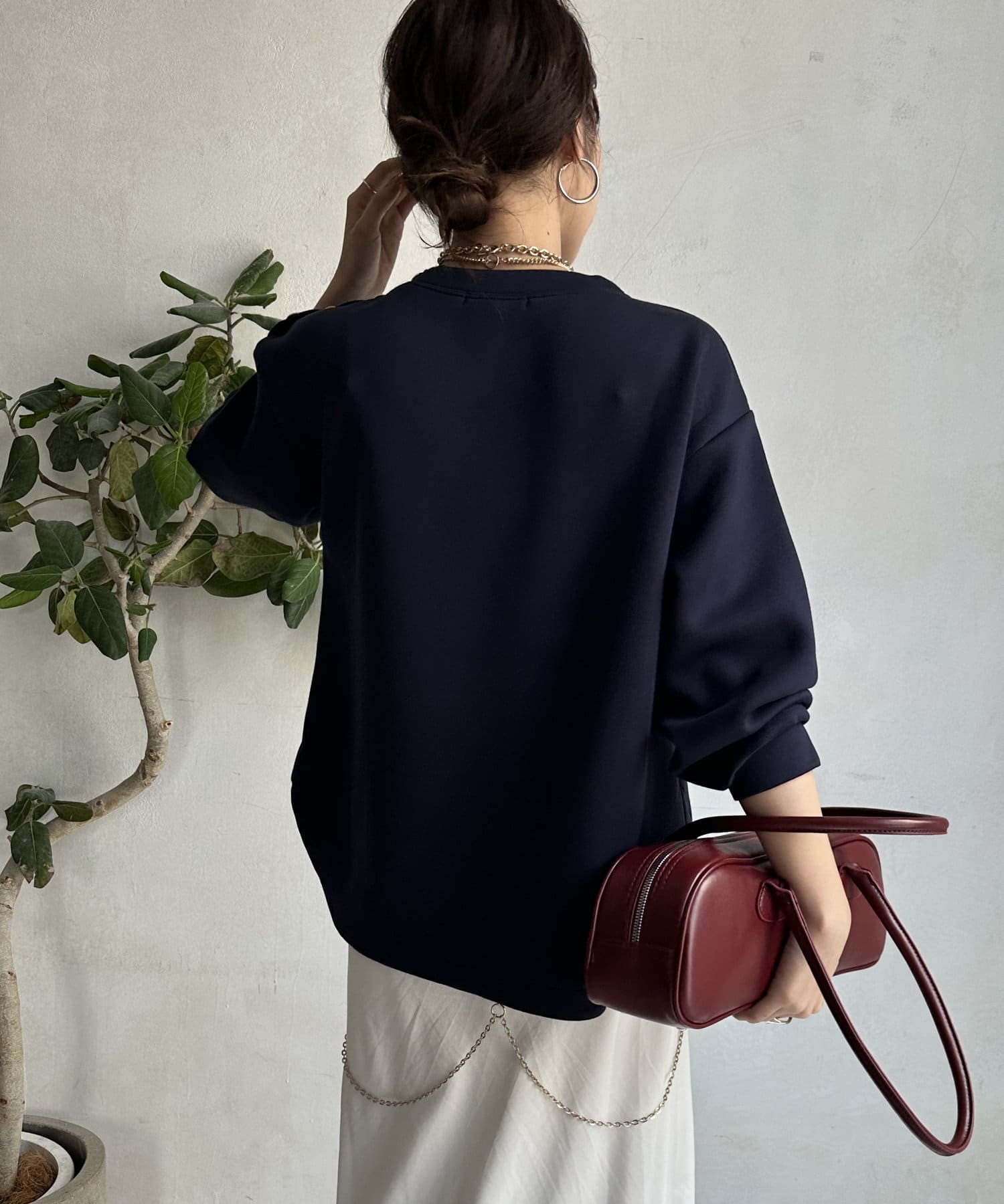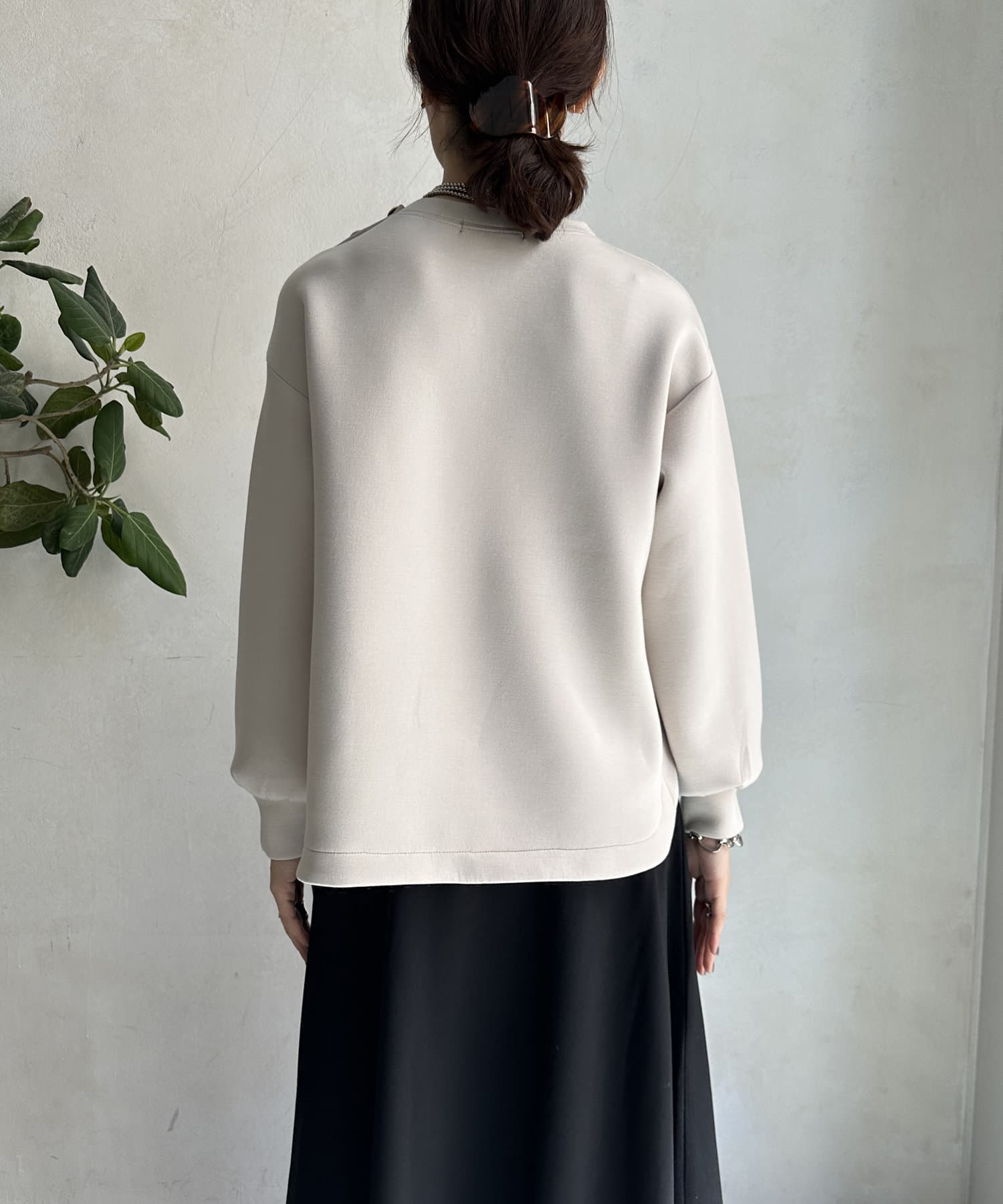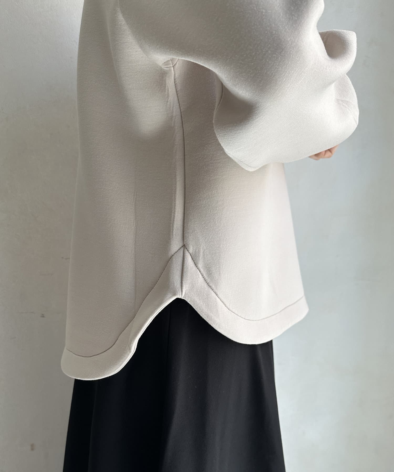 程よくゆとりのあるシルエットで身体のラインを拾いにくく、また袖口のスリットがさり気ないワンポイントとなり