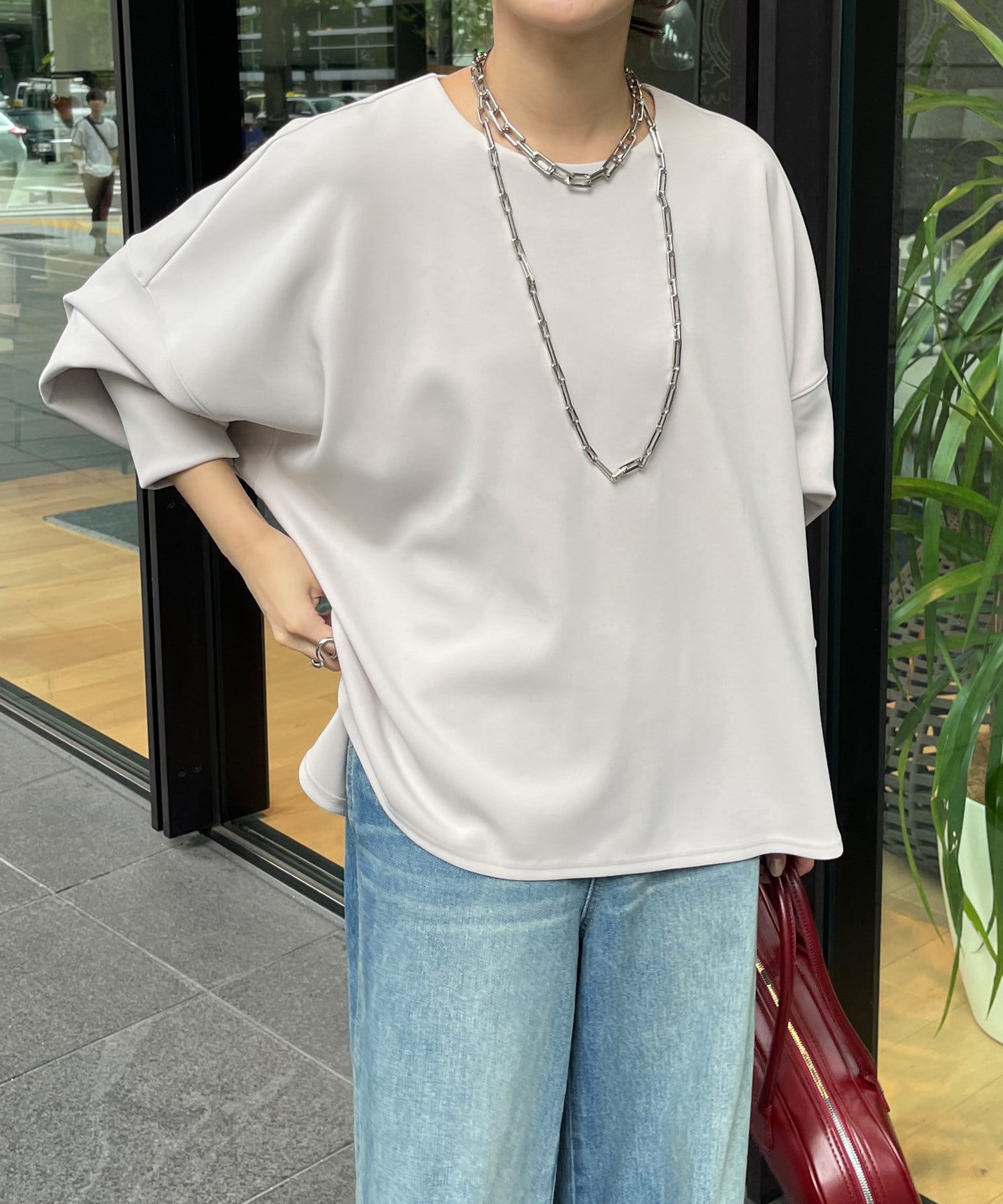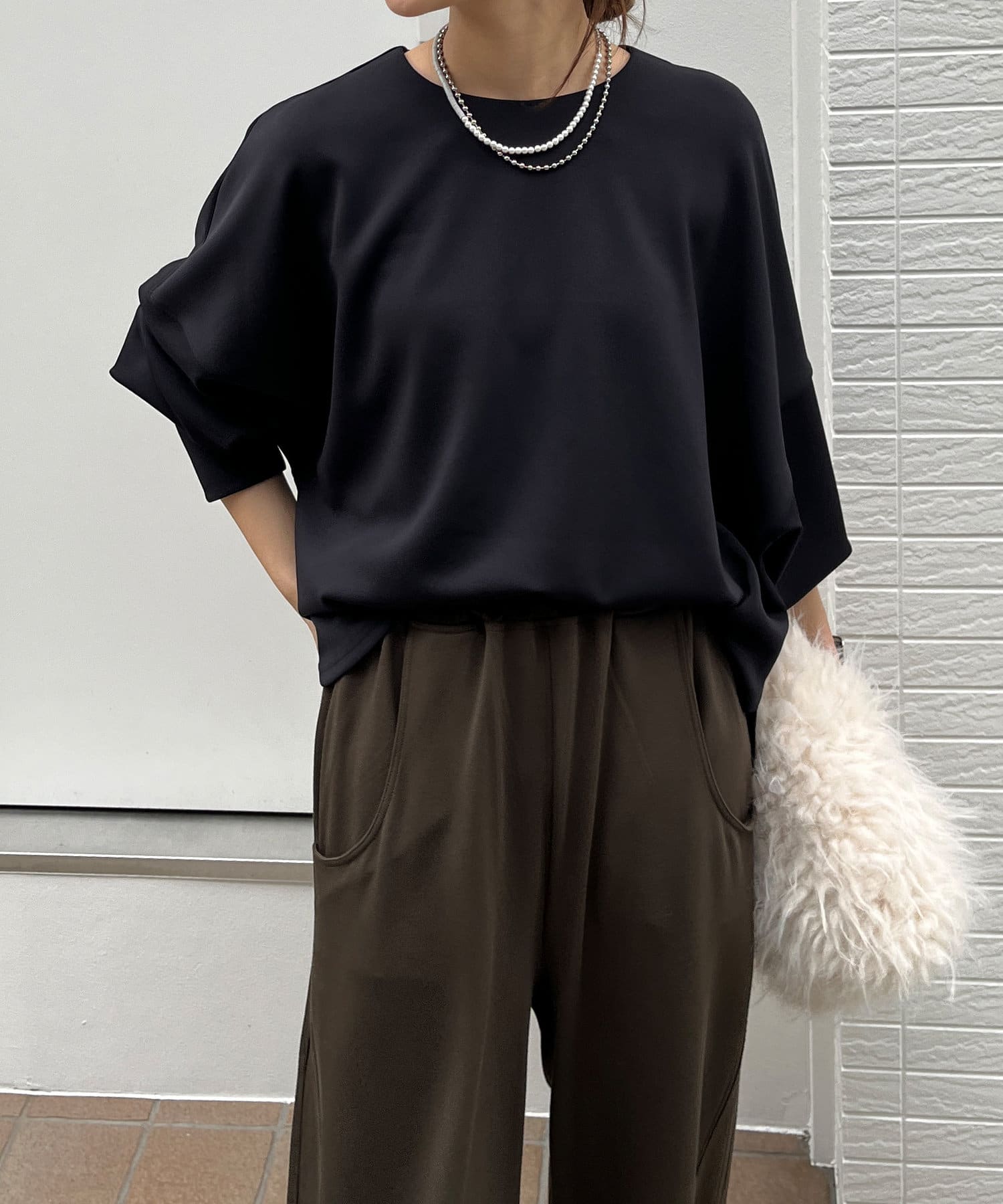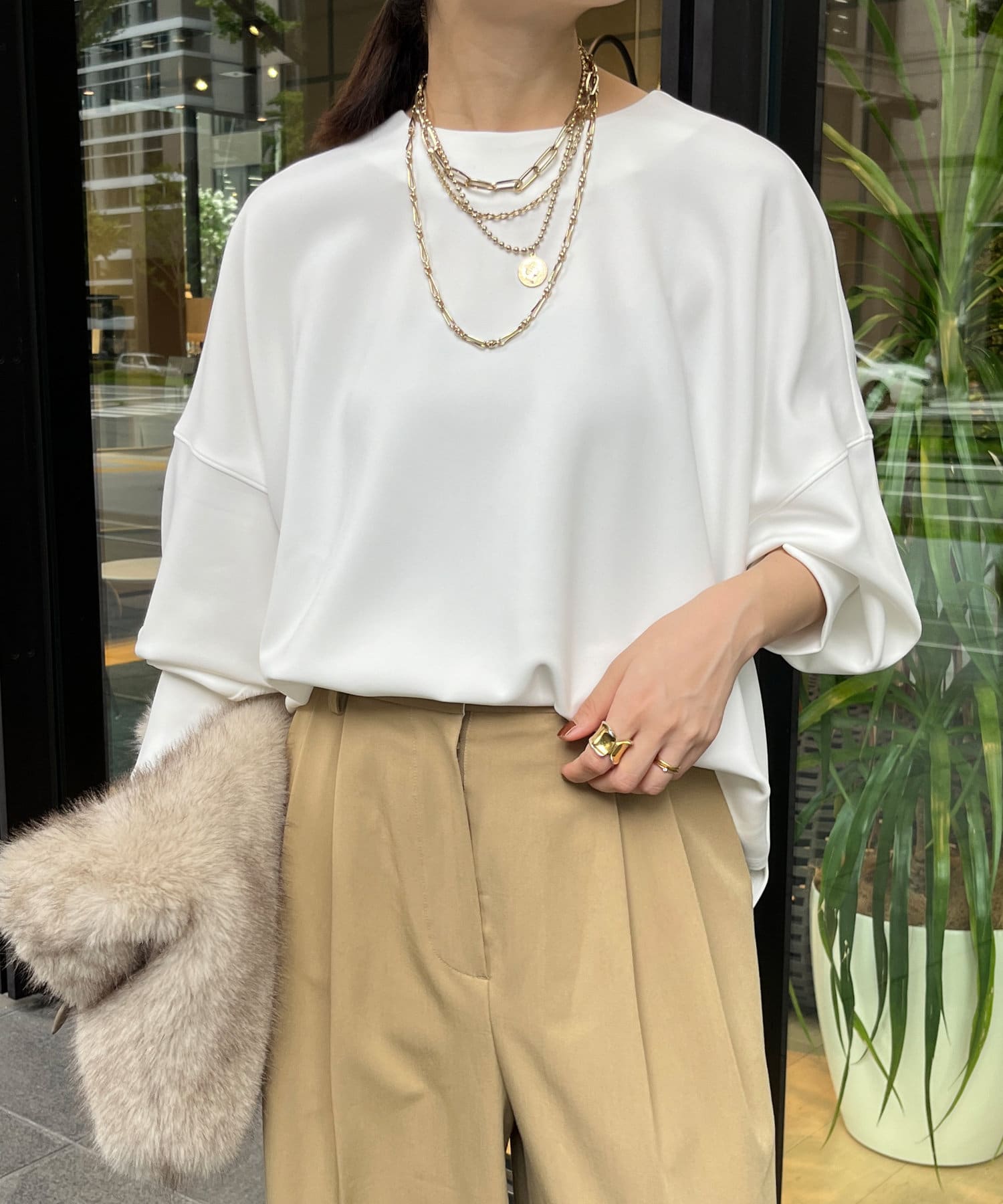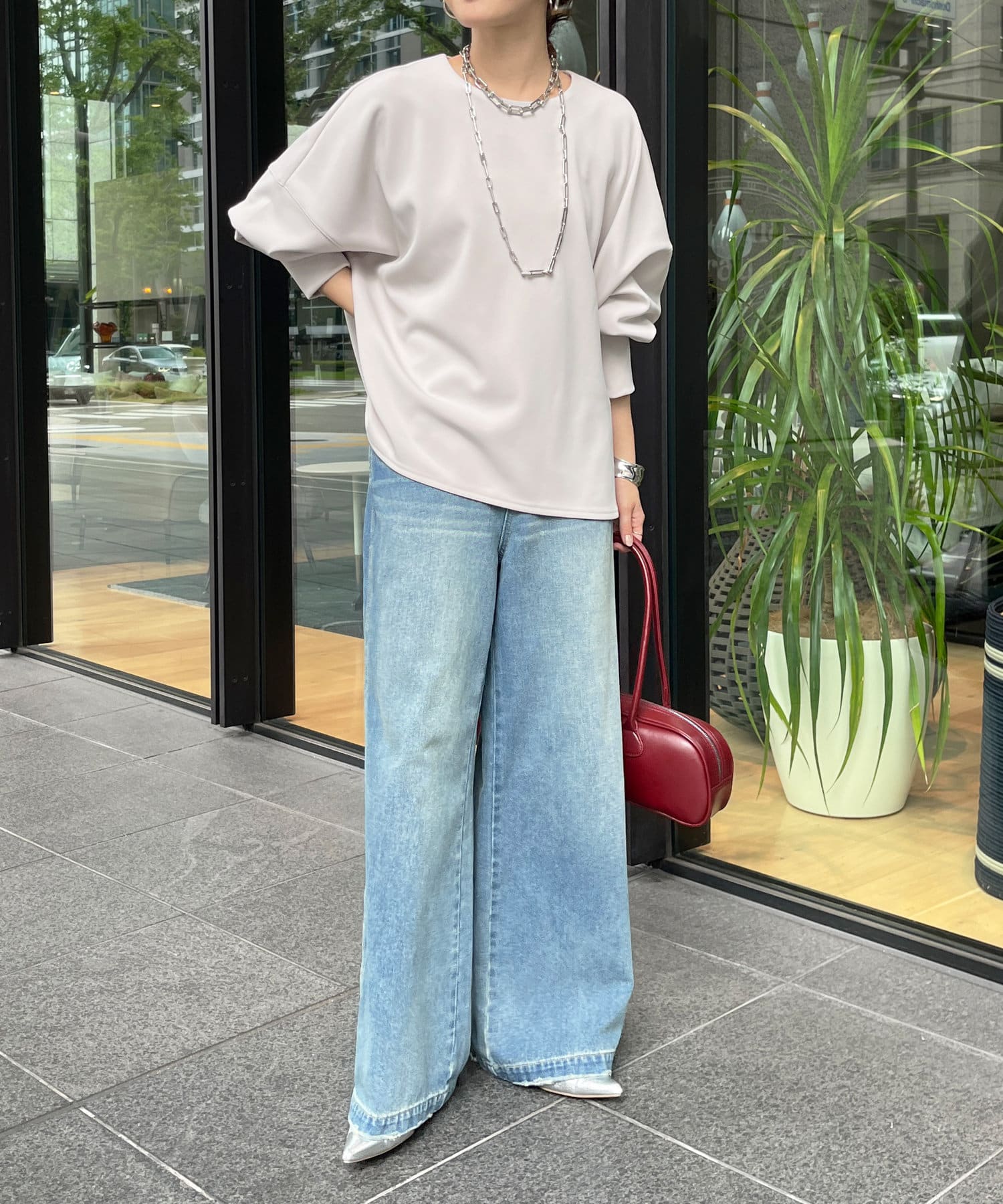 フラットな表面感で、通常のカットソーよりもきれいめな印象に決まるのがポイントです。