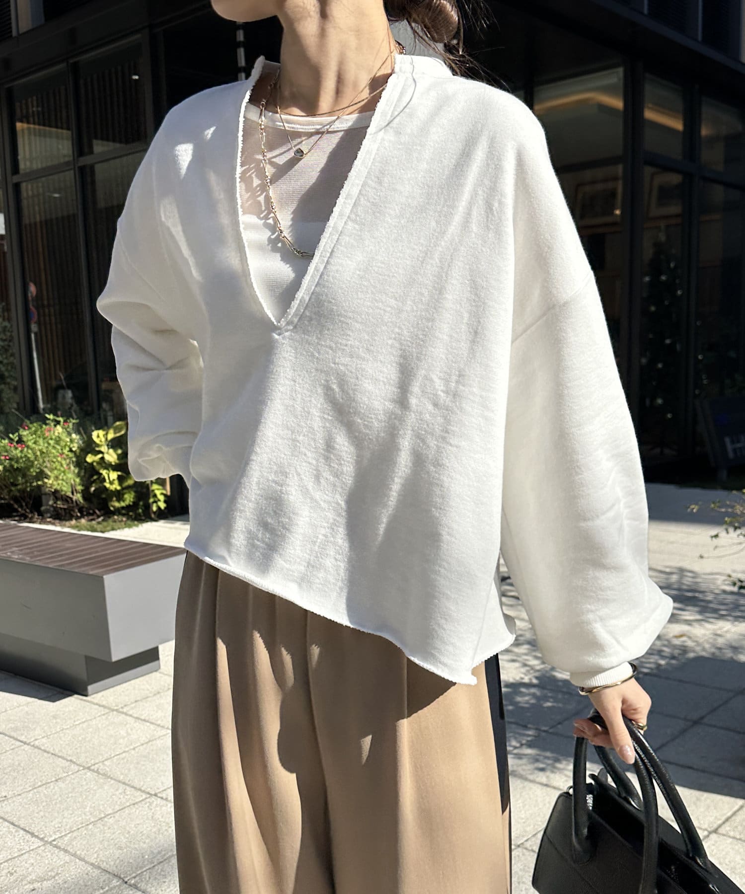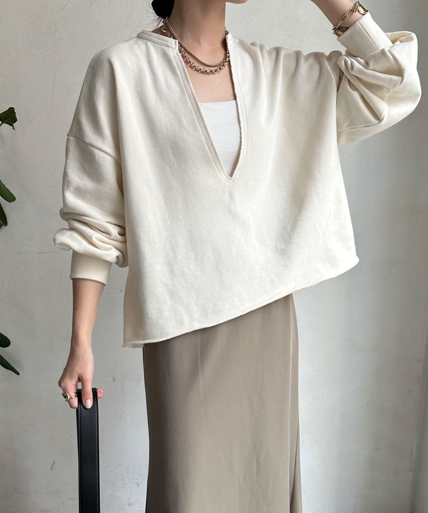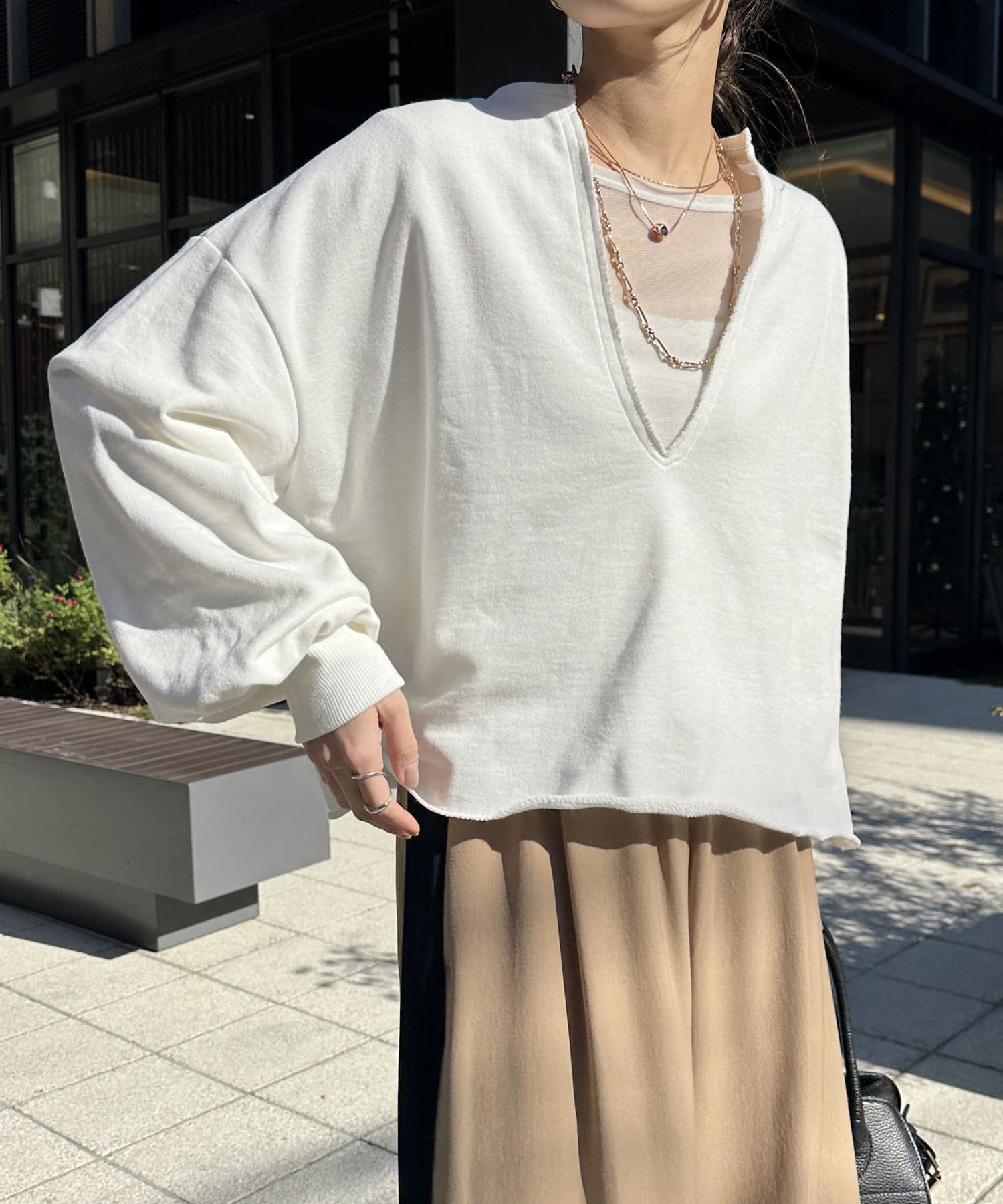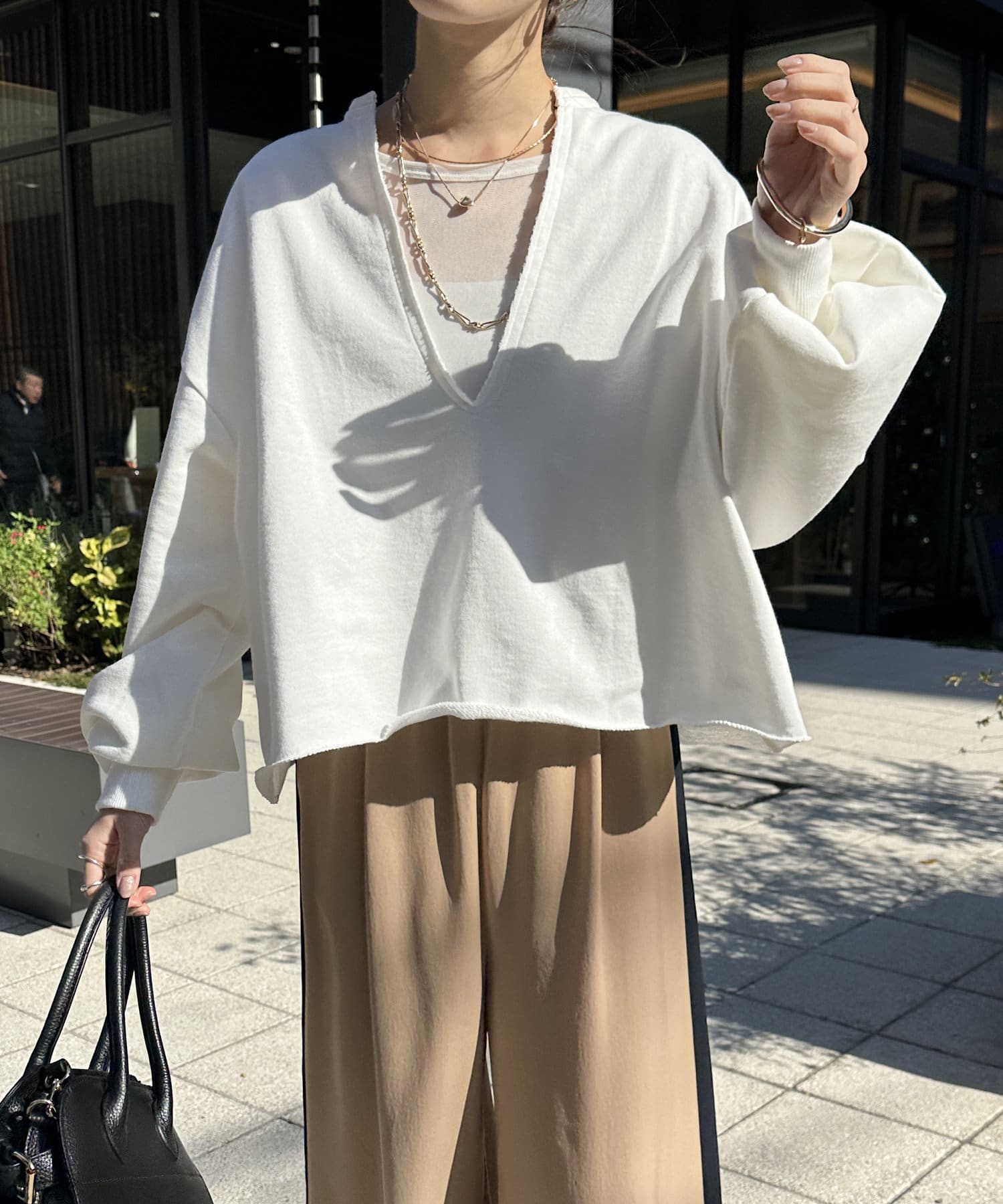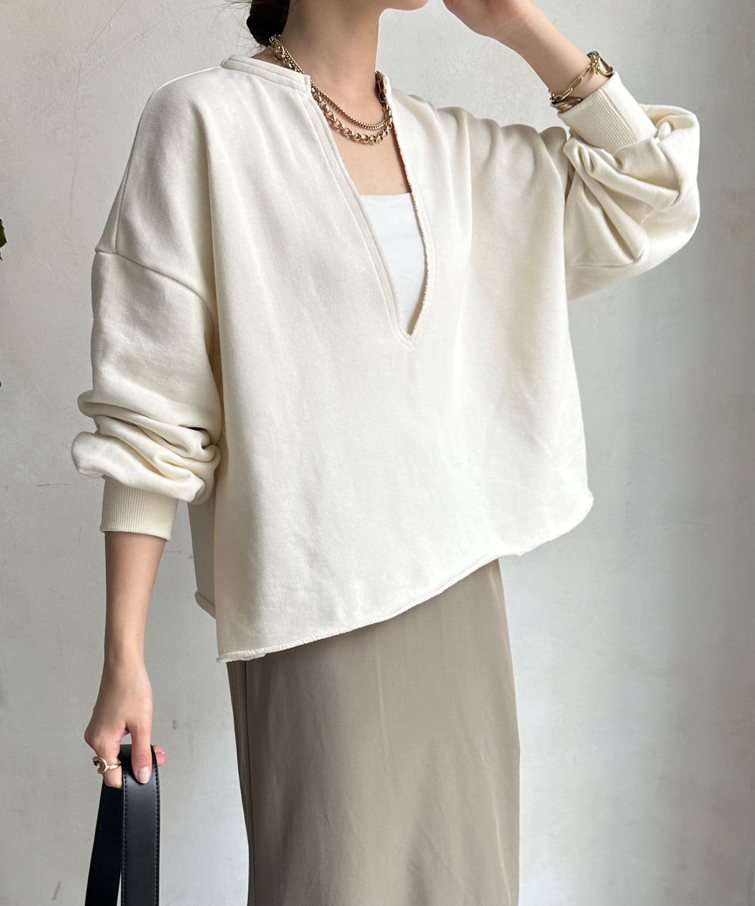 ネックラインのざっくりとしたカットがポイントで、顔回りをすっきりと、そしておしゃれな印象に仕上げます。