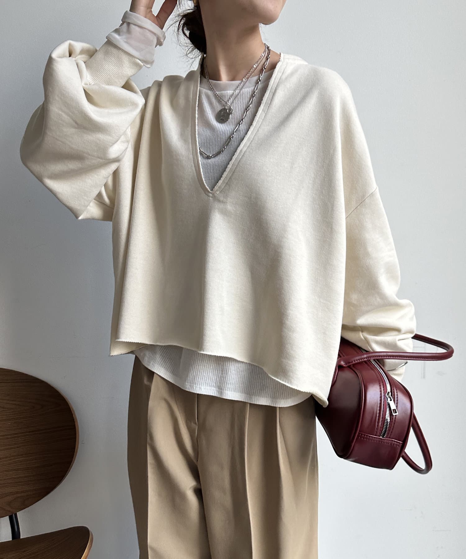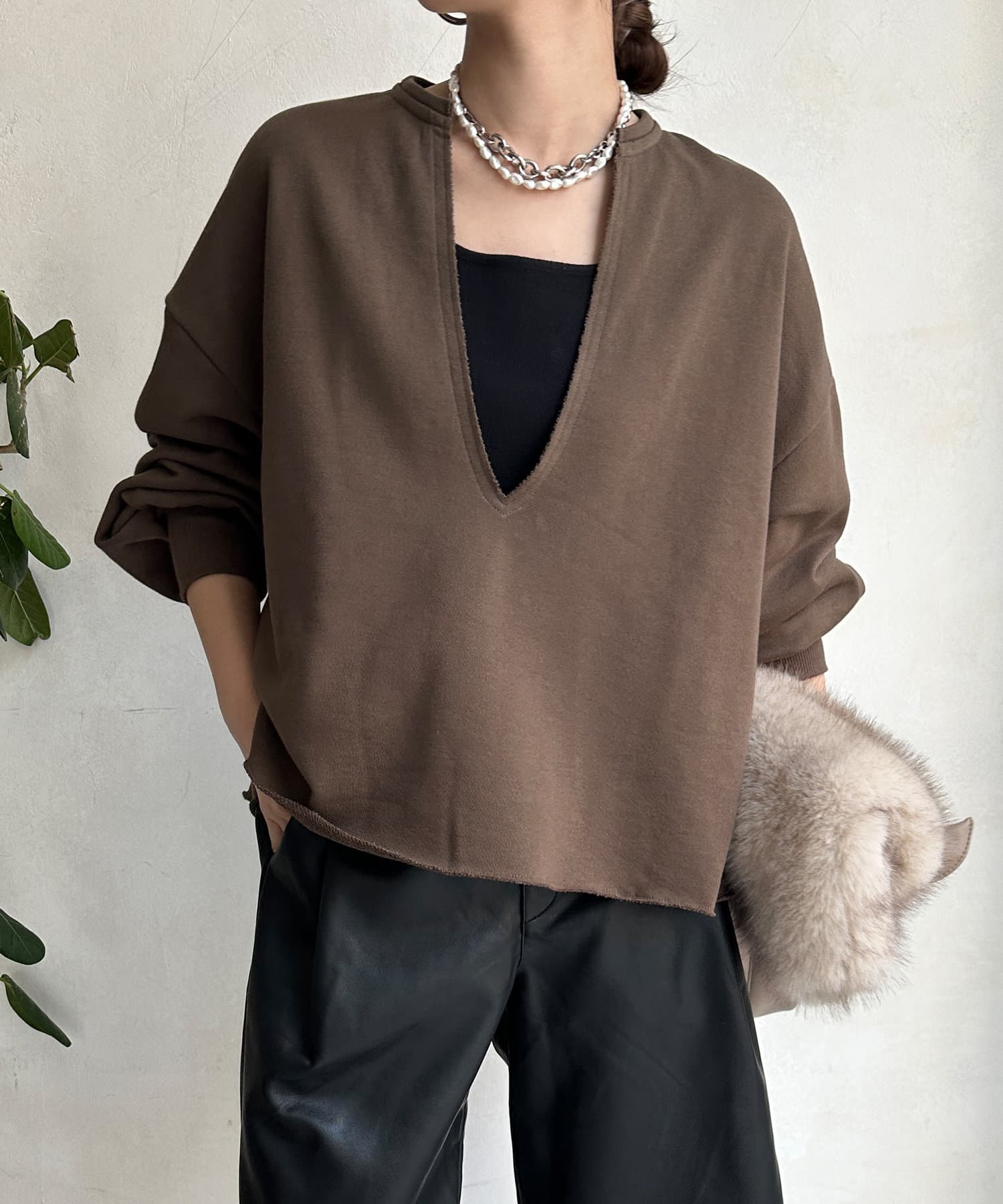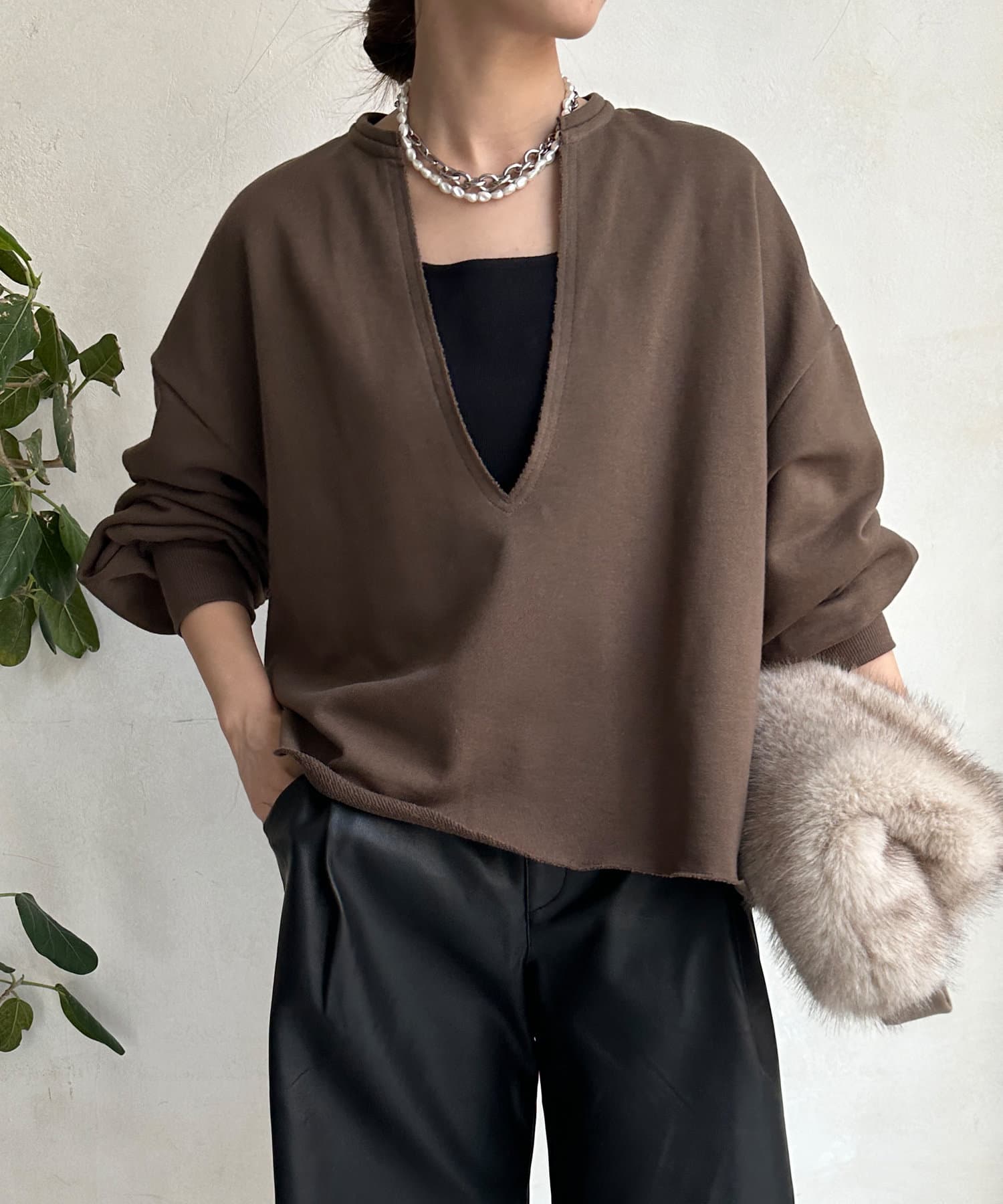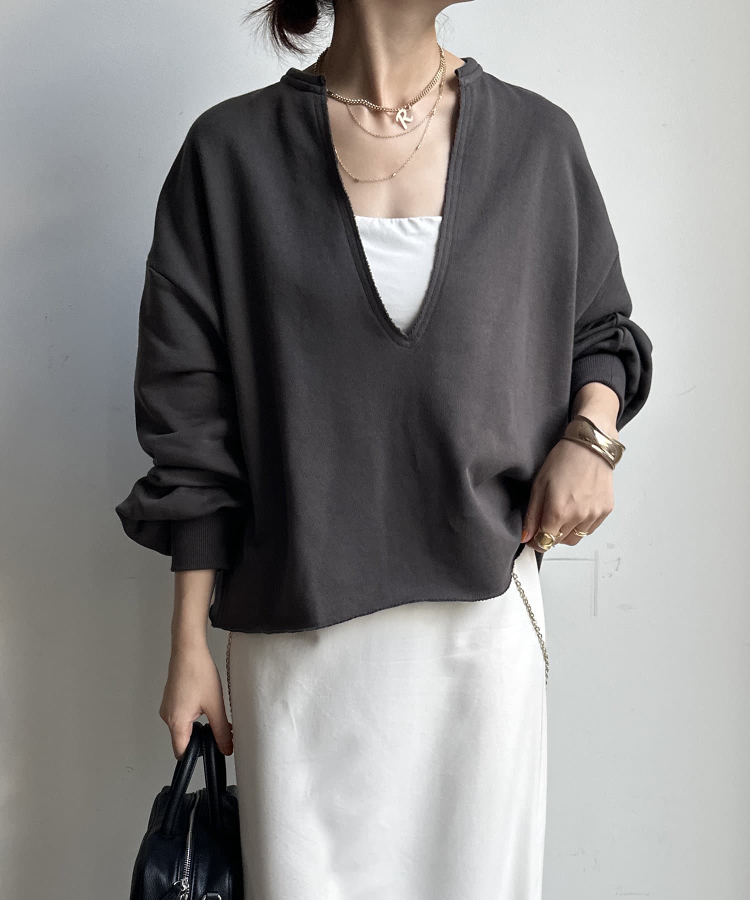 ネックラインのざっくりとしたカットがポイントで、顔回りをすっきりと、そしておしゃれな印象に仕上げます。