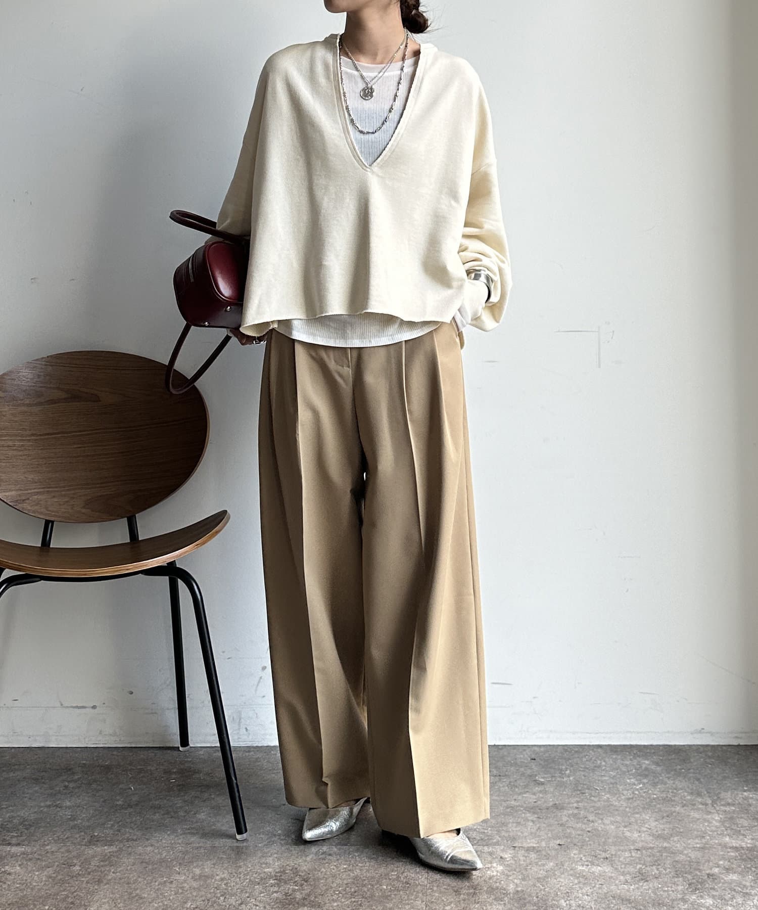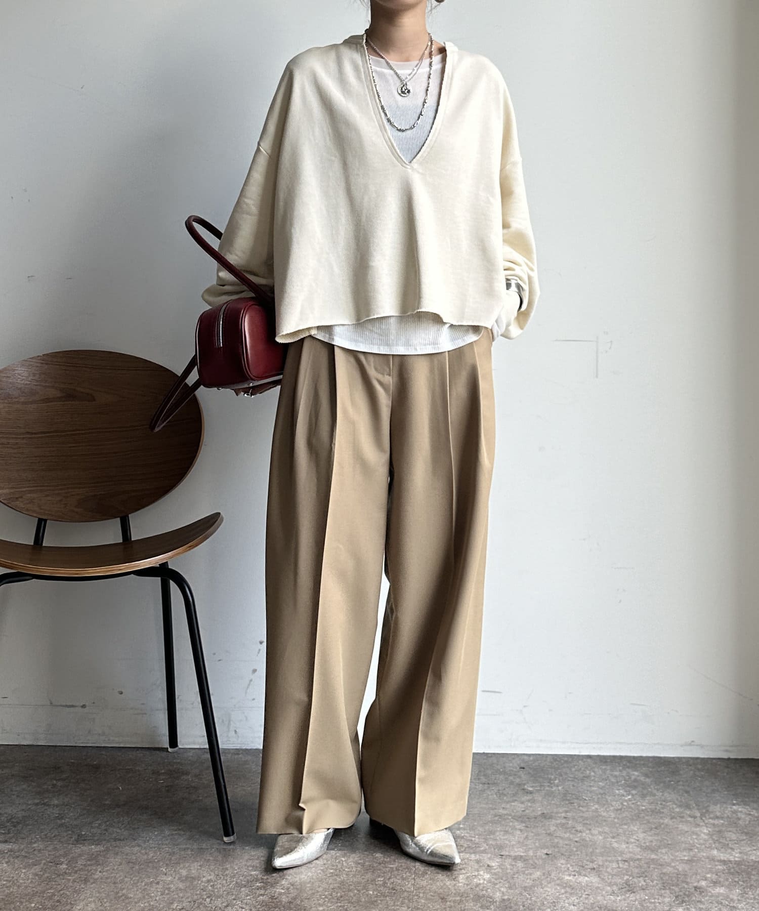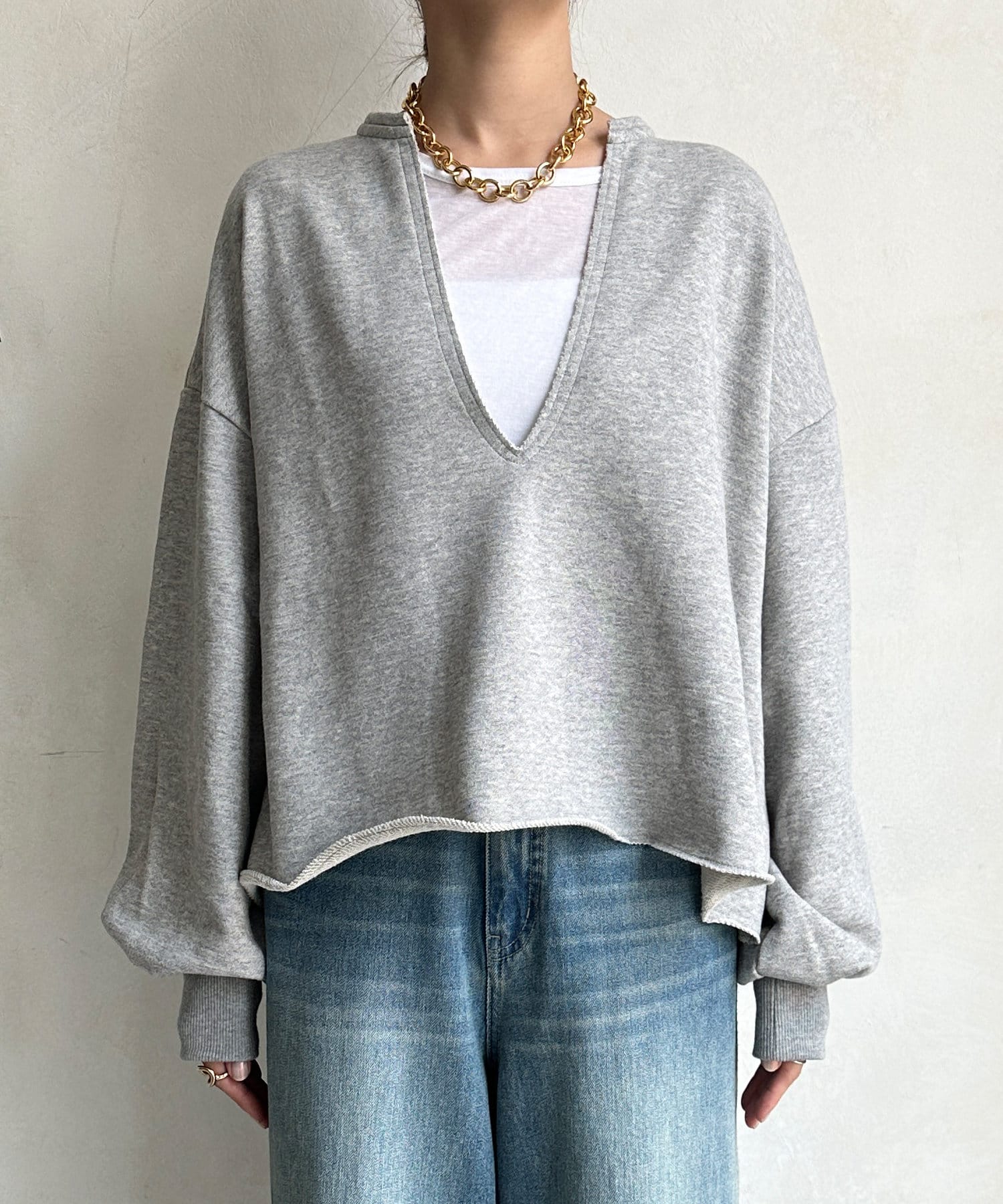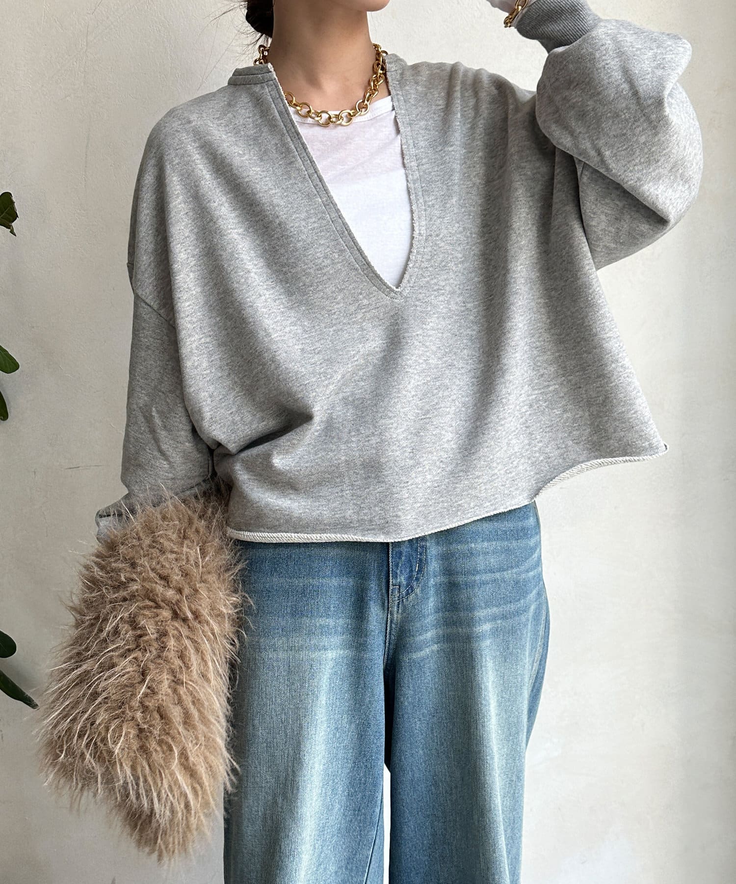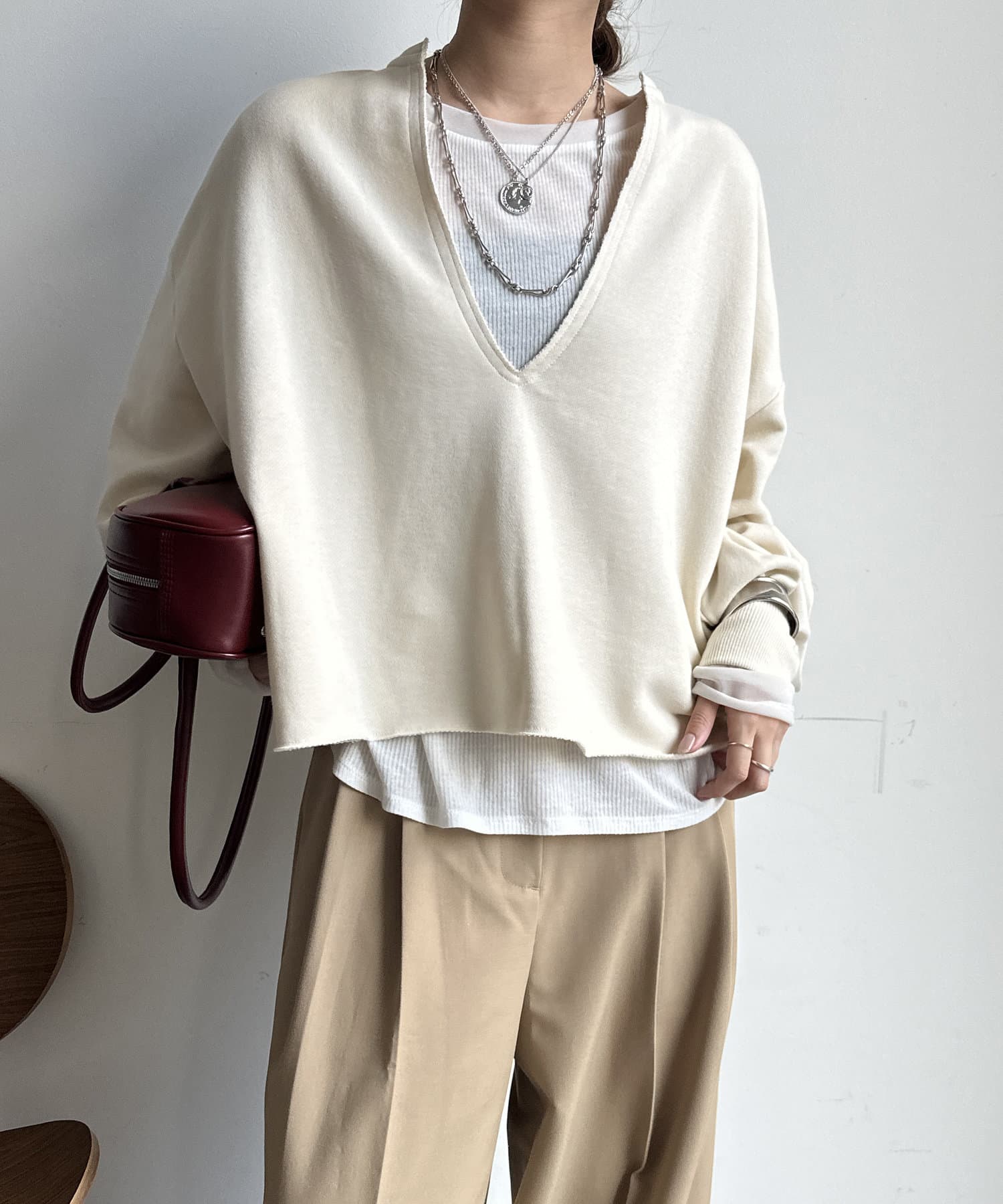 ネックラインのざっくりとしたカットがポイントで、顔回りをすっきりと、そしておしゃれな印象に仕上げます。