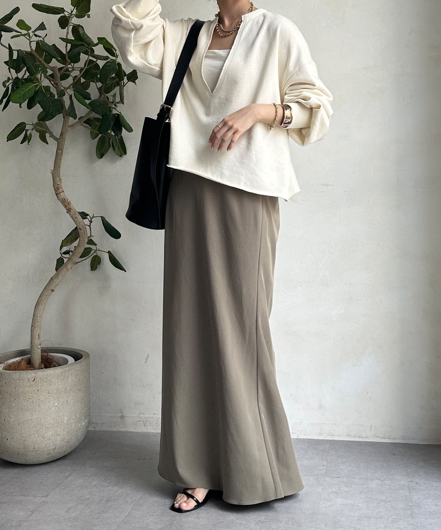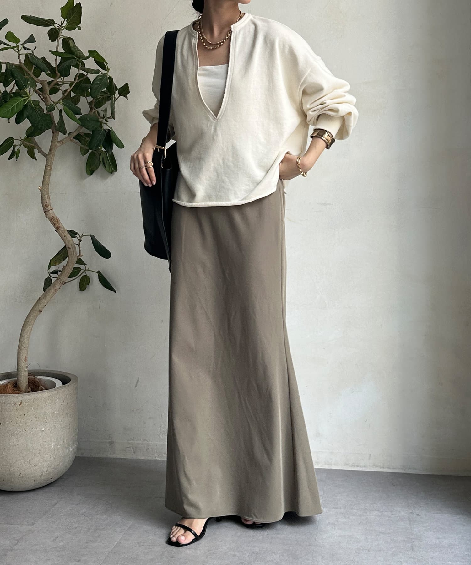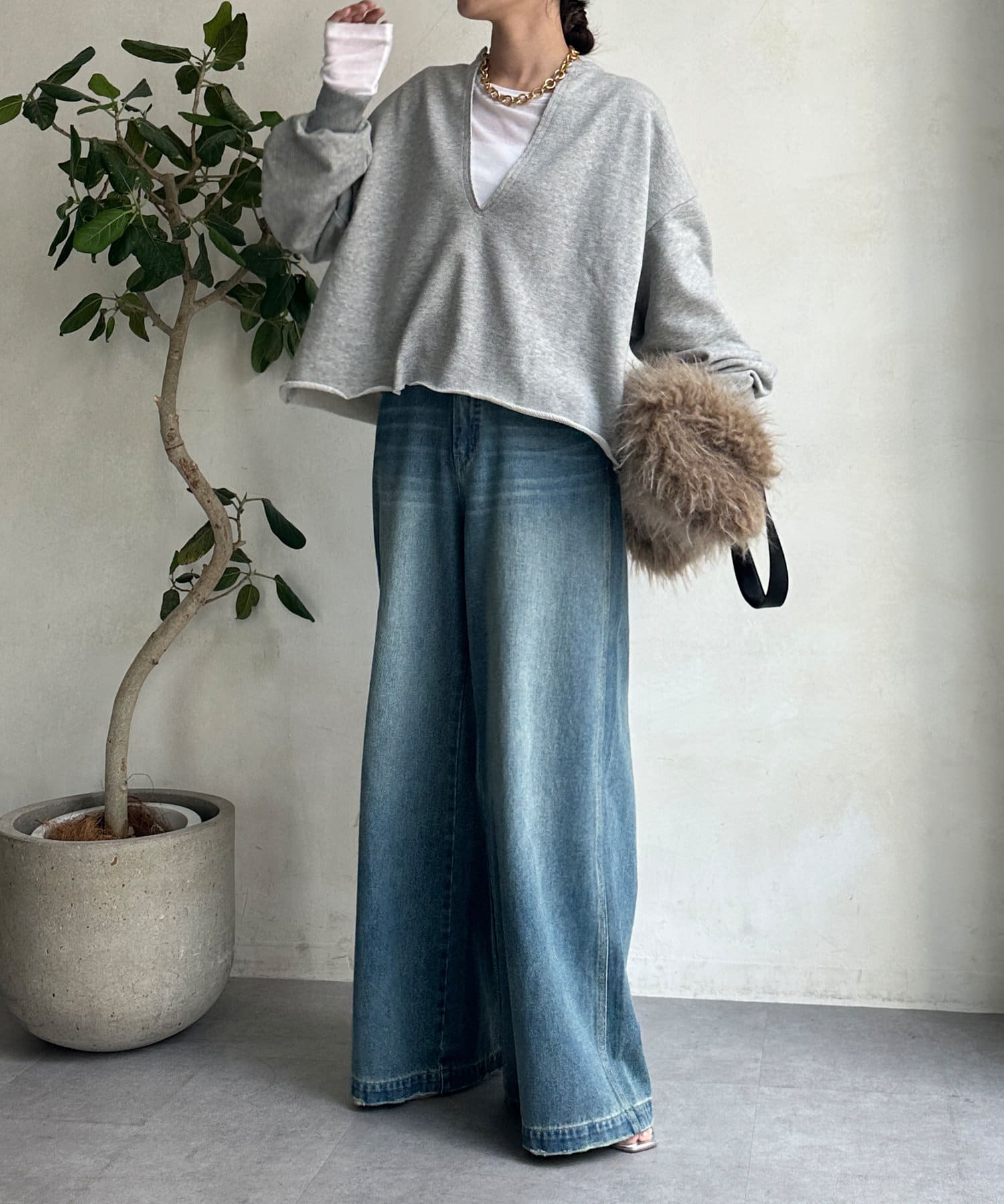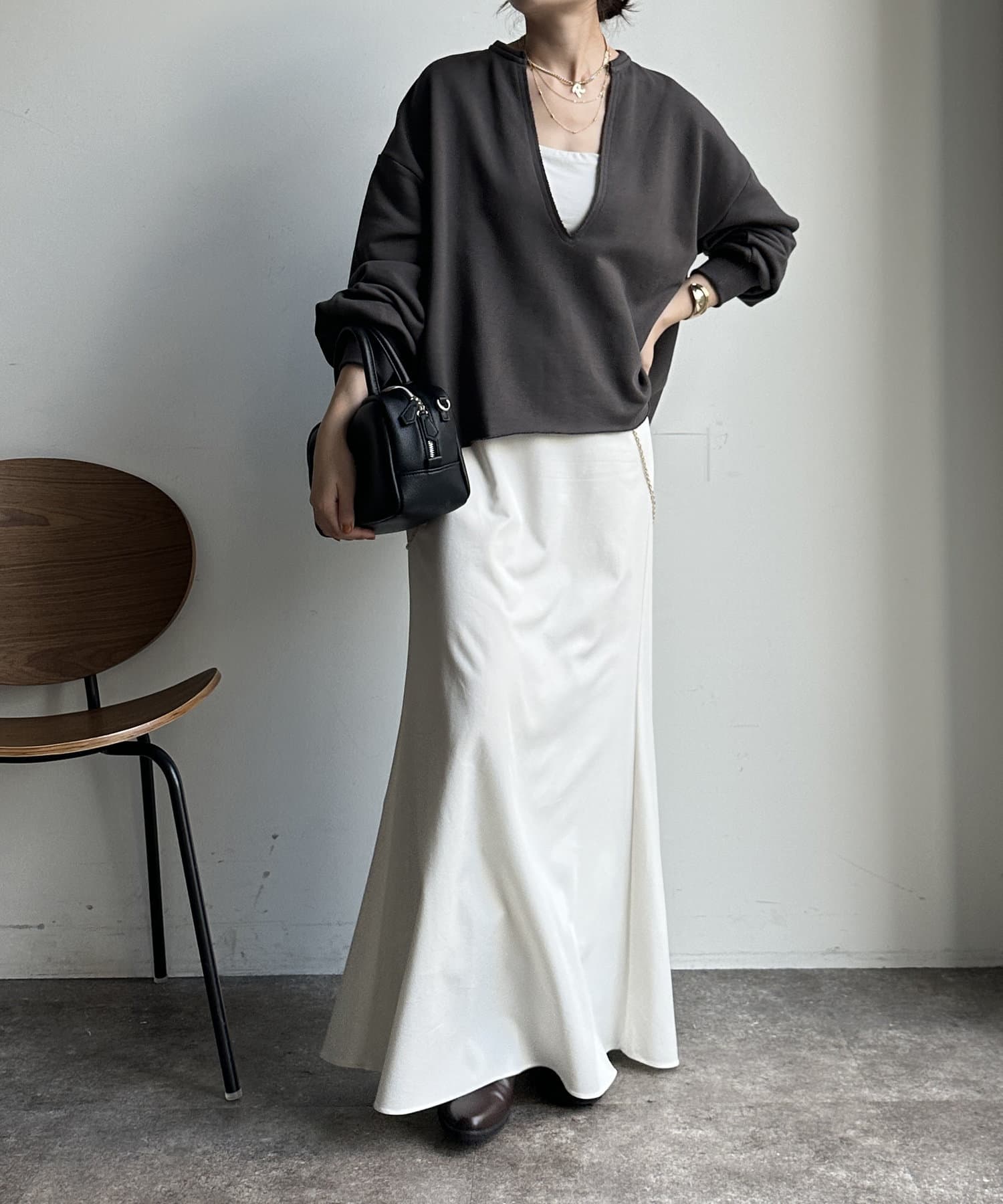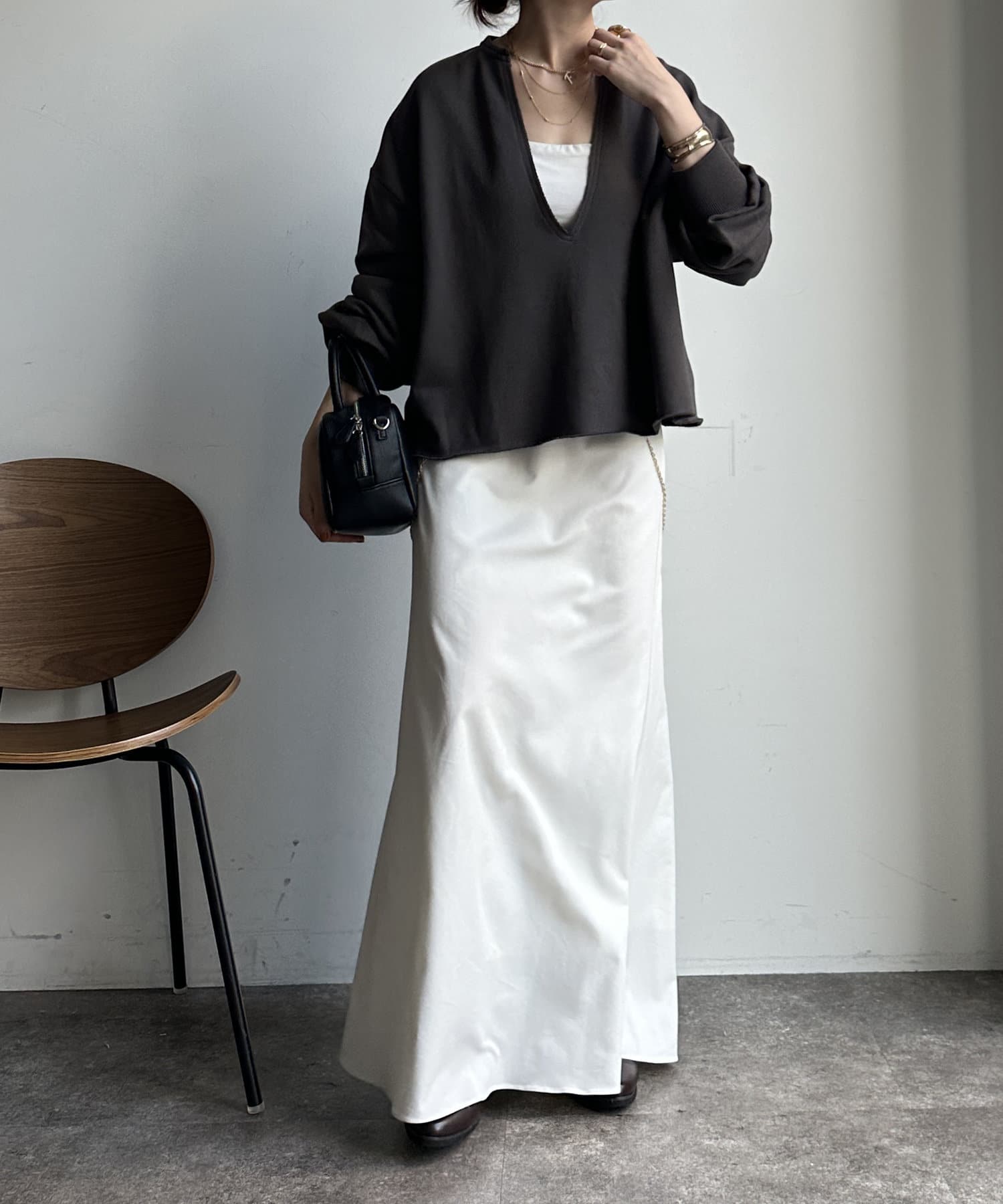 ネックラインのざっくりとしたカットがポイントで、顔回りをすっきりと、そしておしゃれな印象に仕上げます。