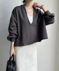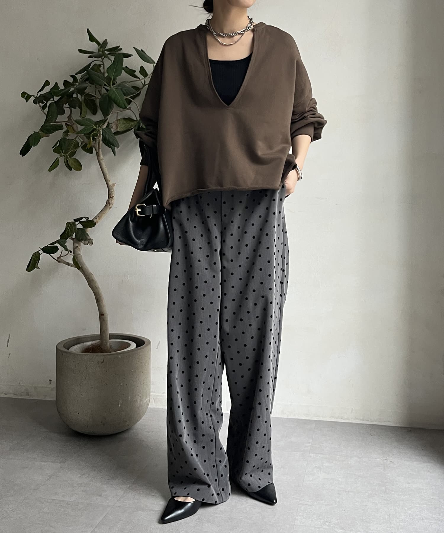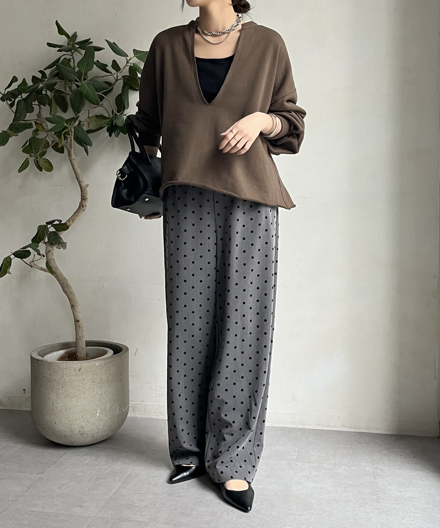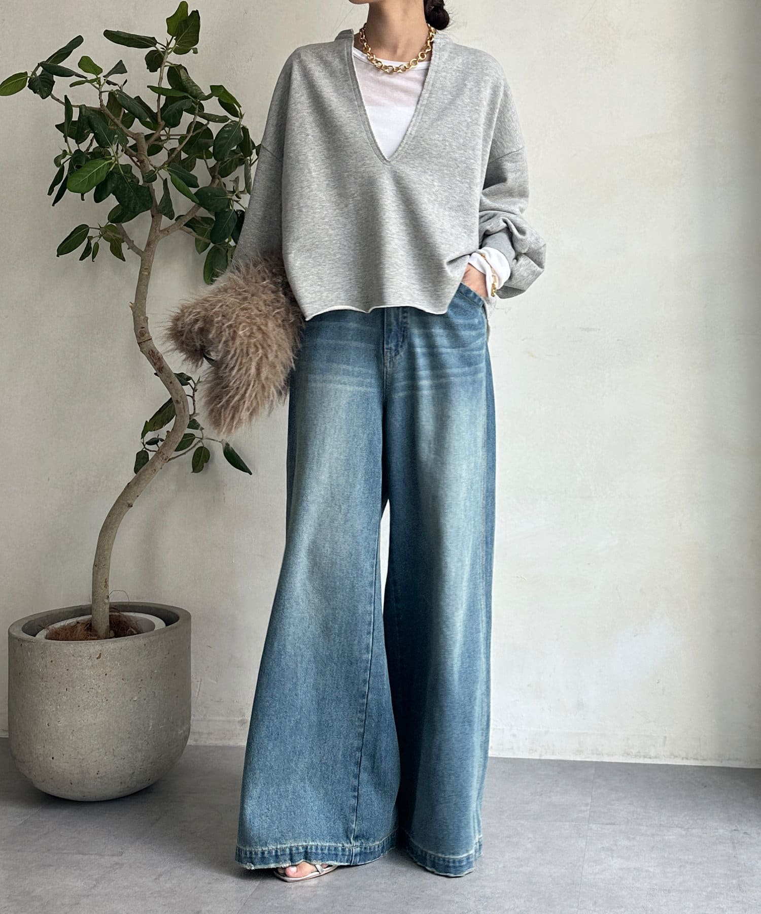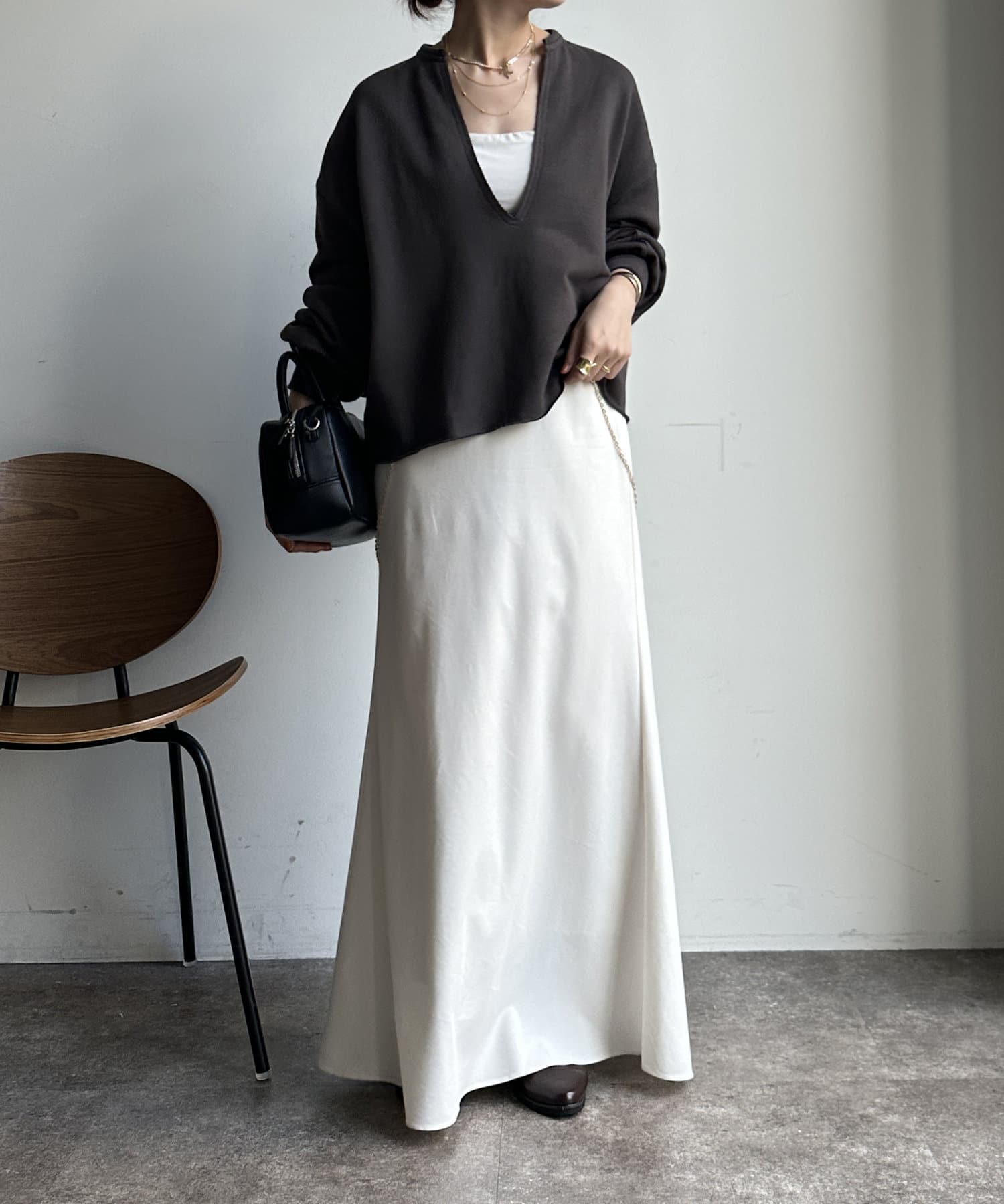 ネックラインのざっくりとしたカットがポイントで、顔回りをすっきりと、そしておしゃれな印象に仕上げます。