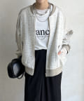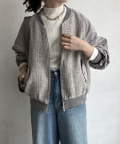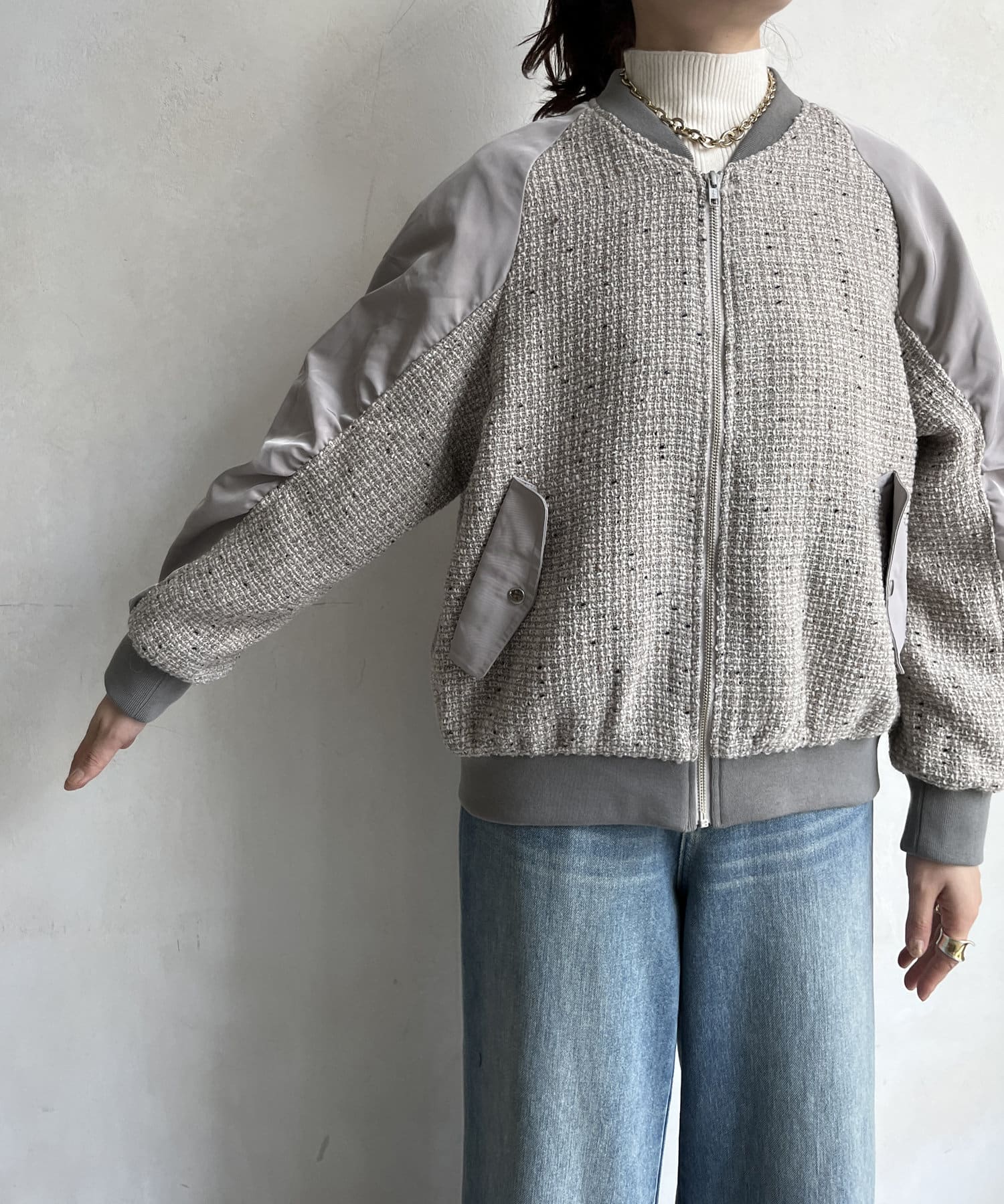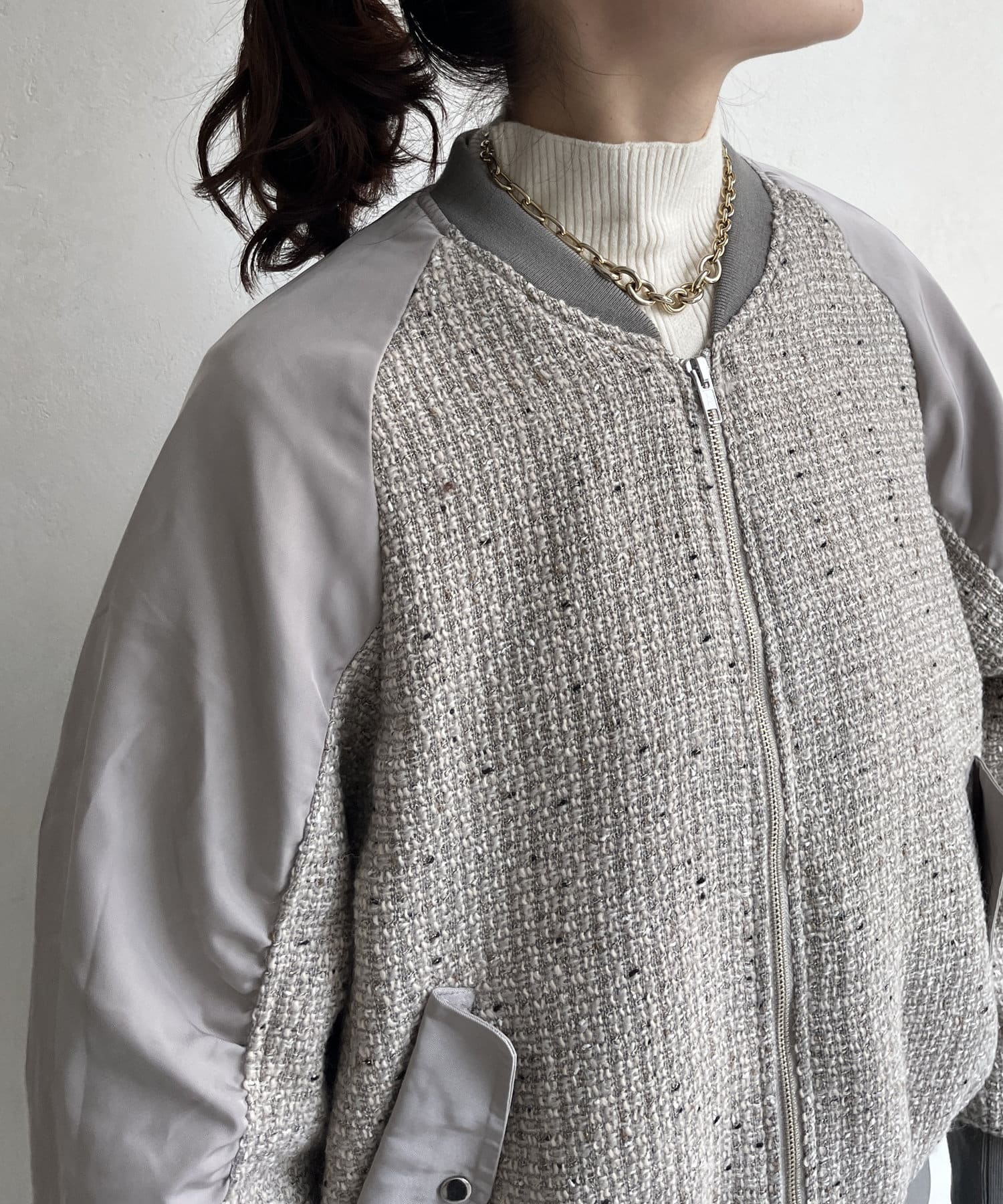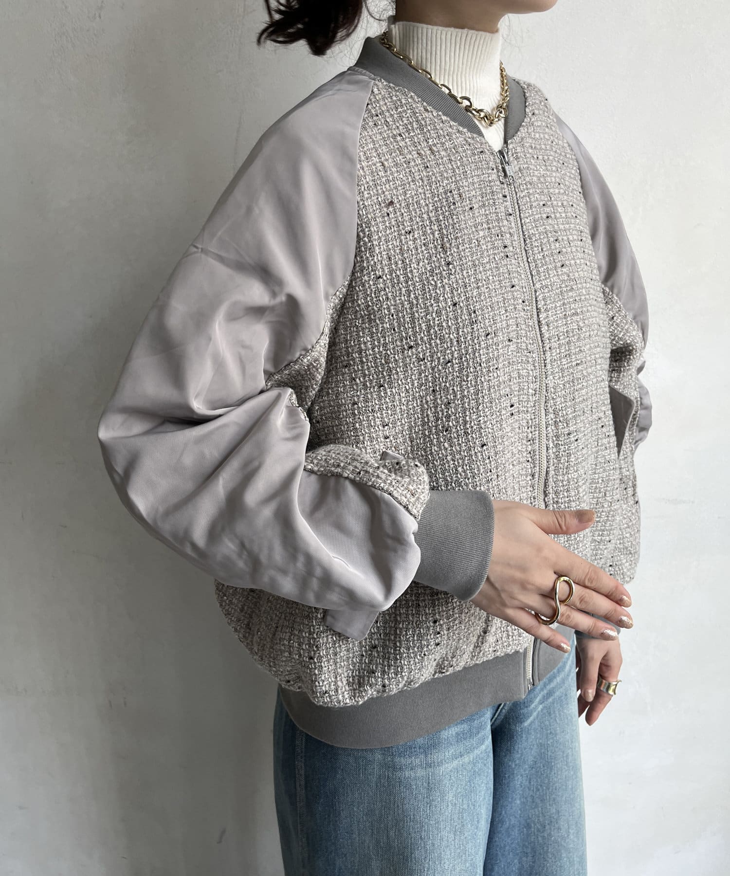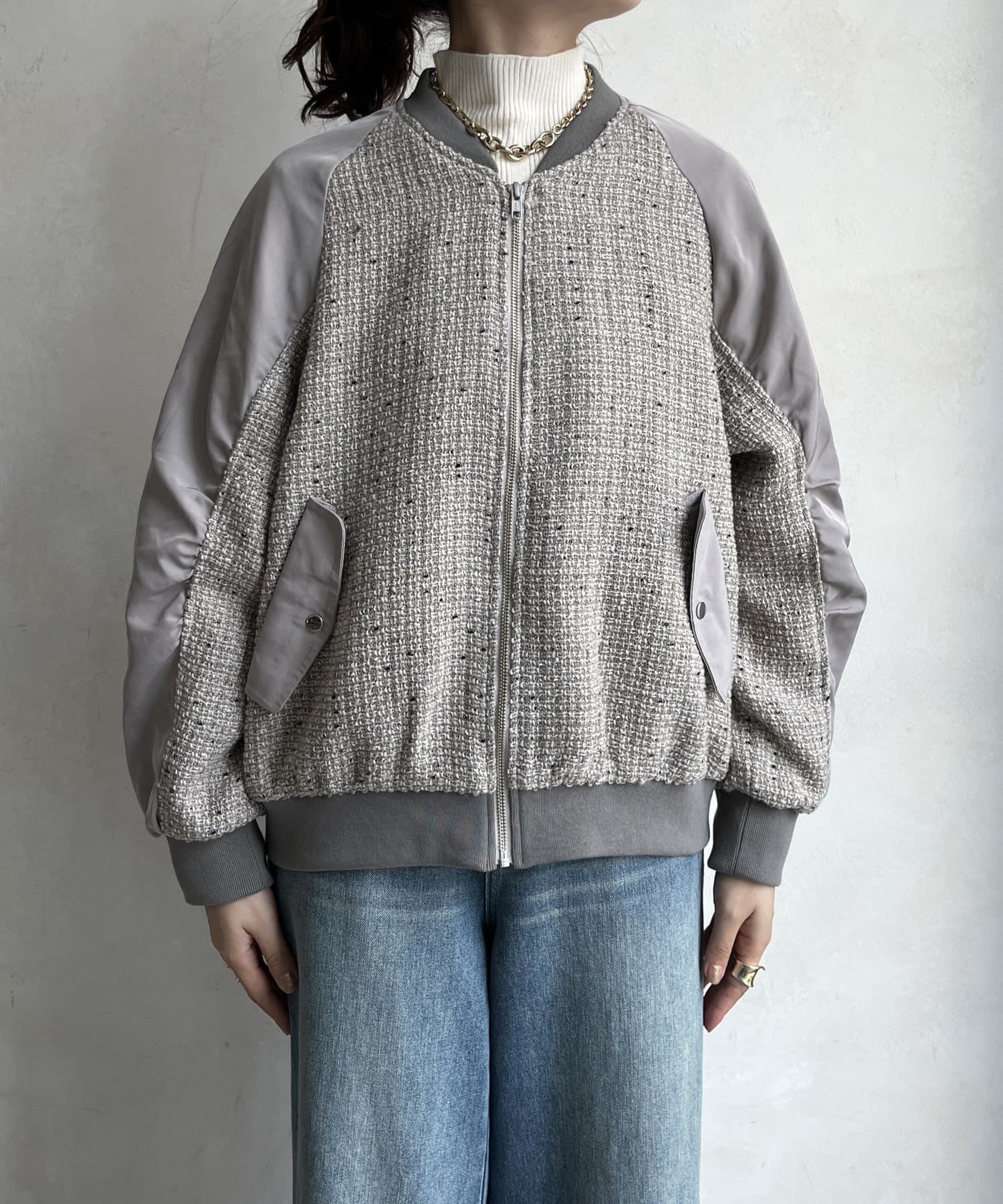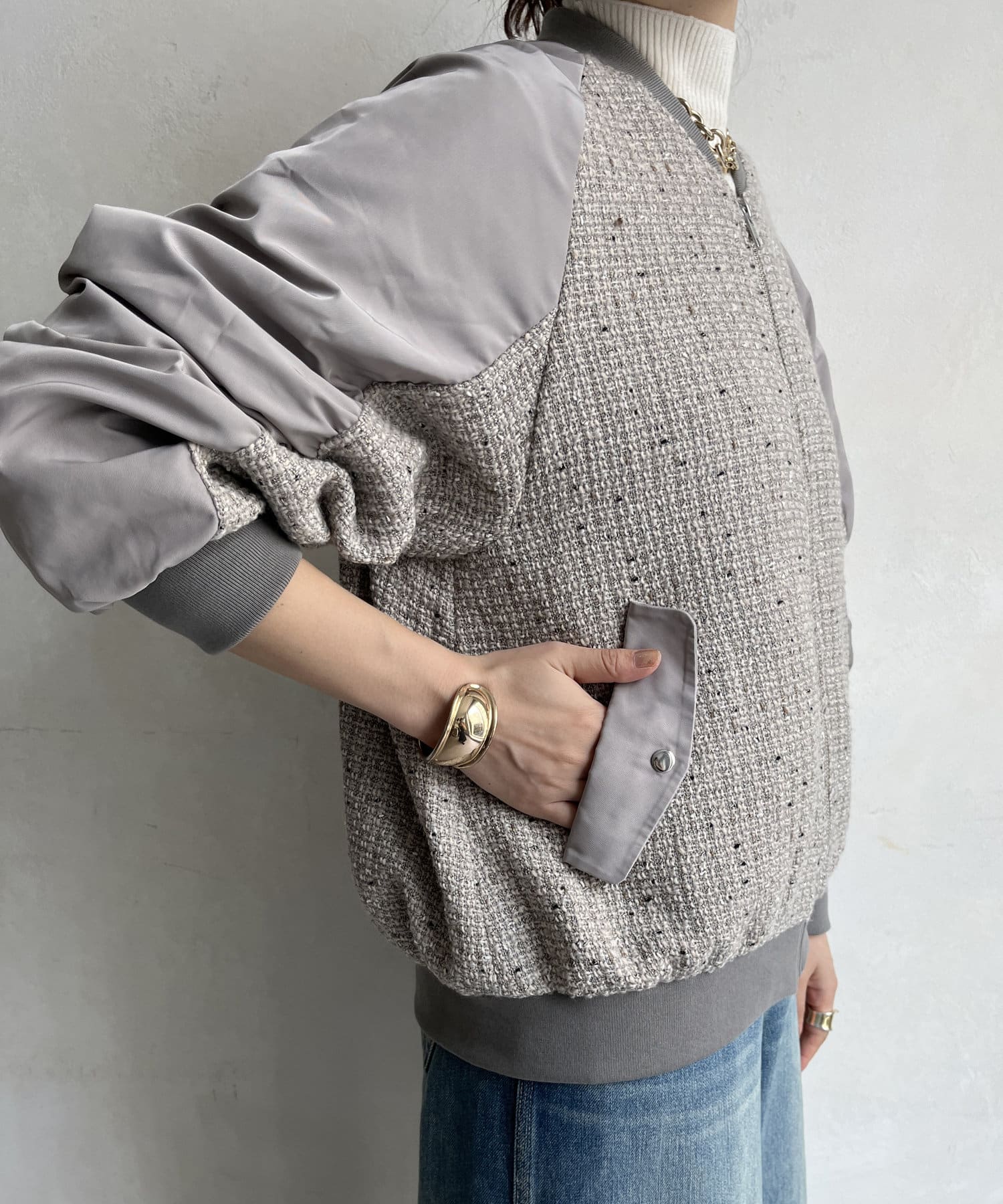 ファンシーツイードとツイルを組み合わせた異素材ブルゾン。