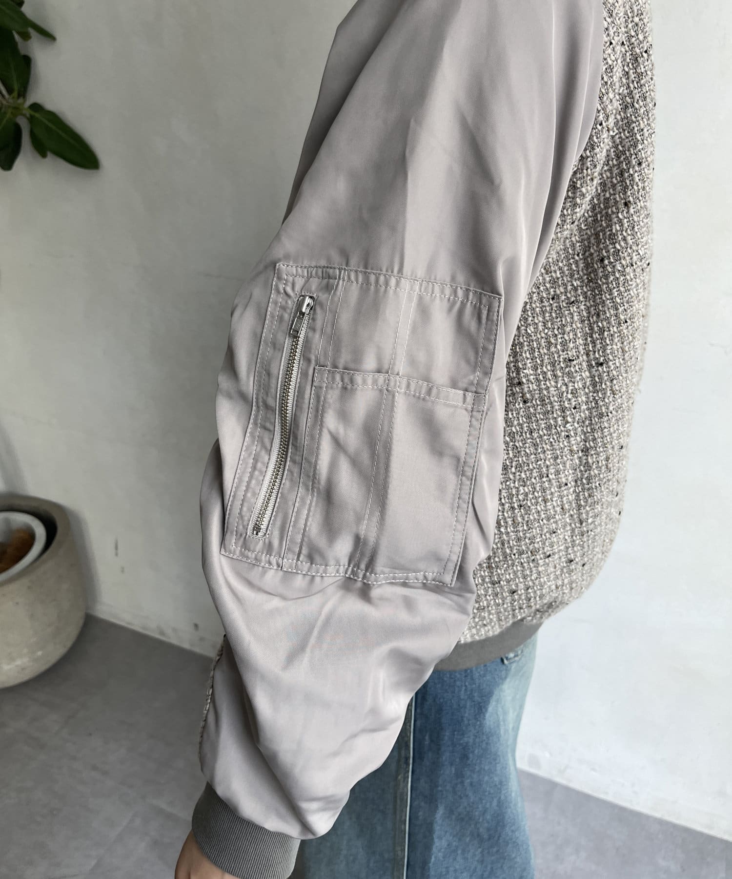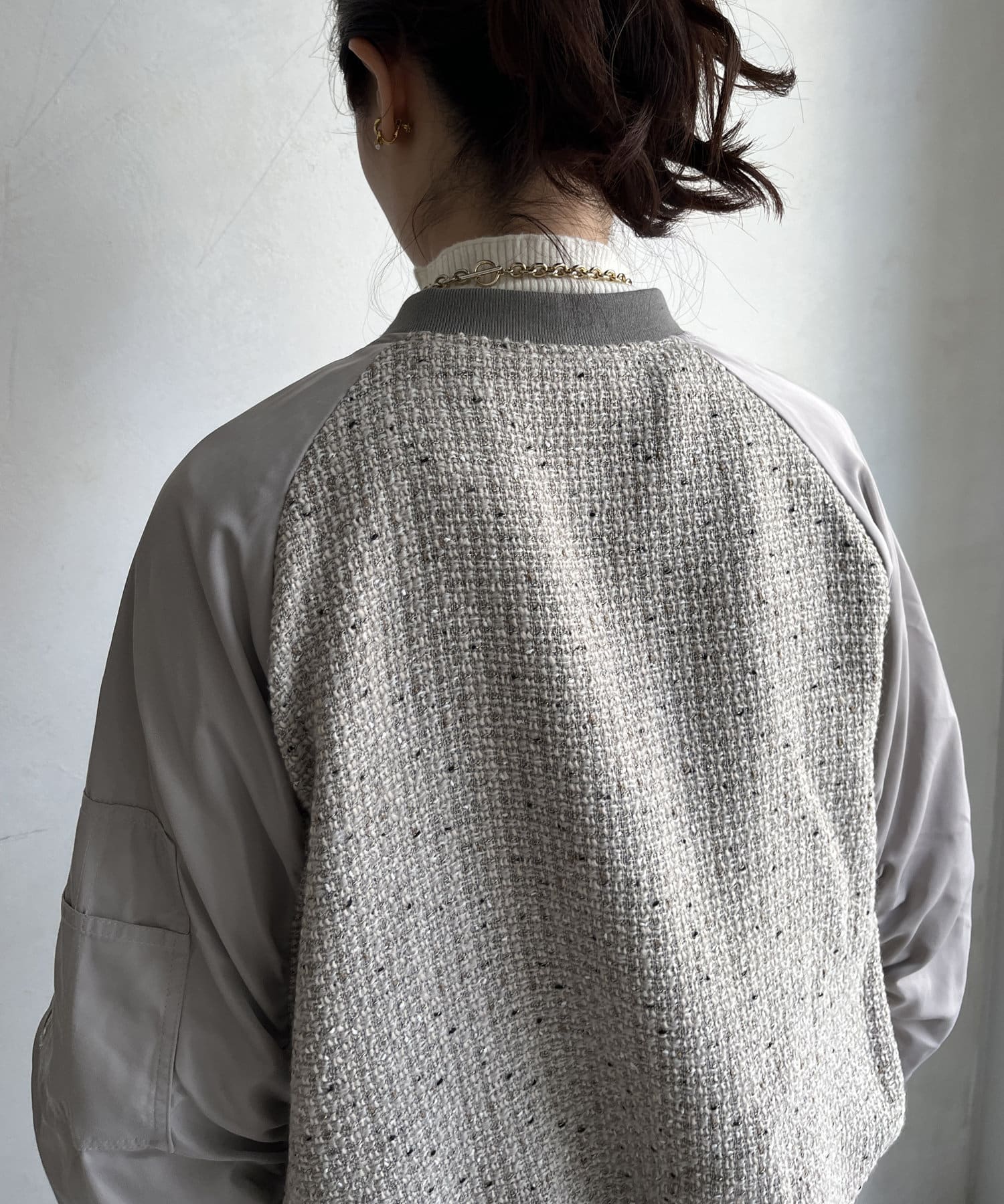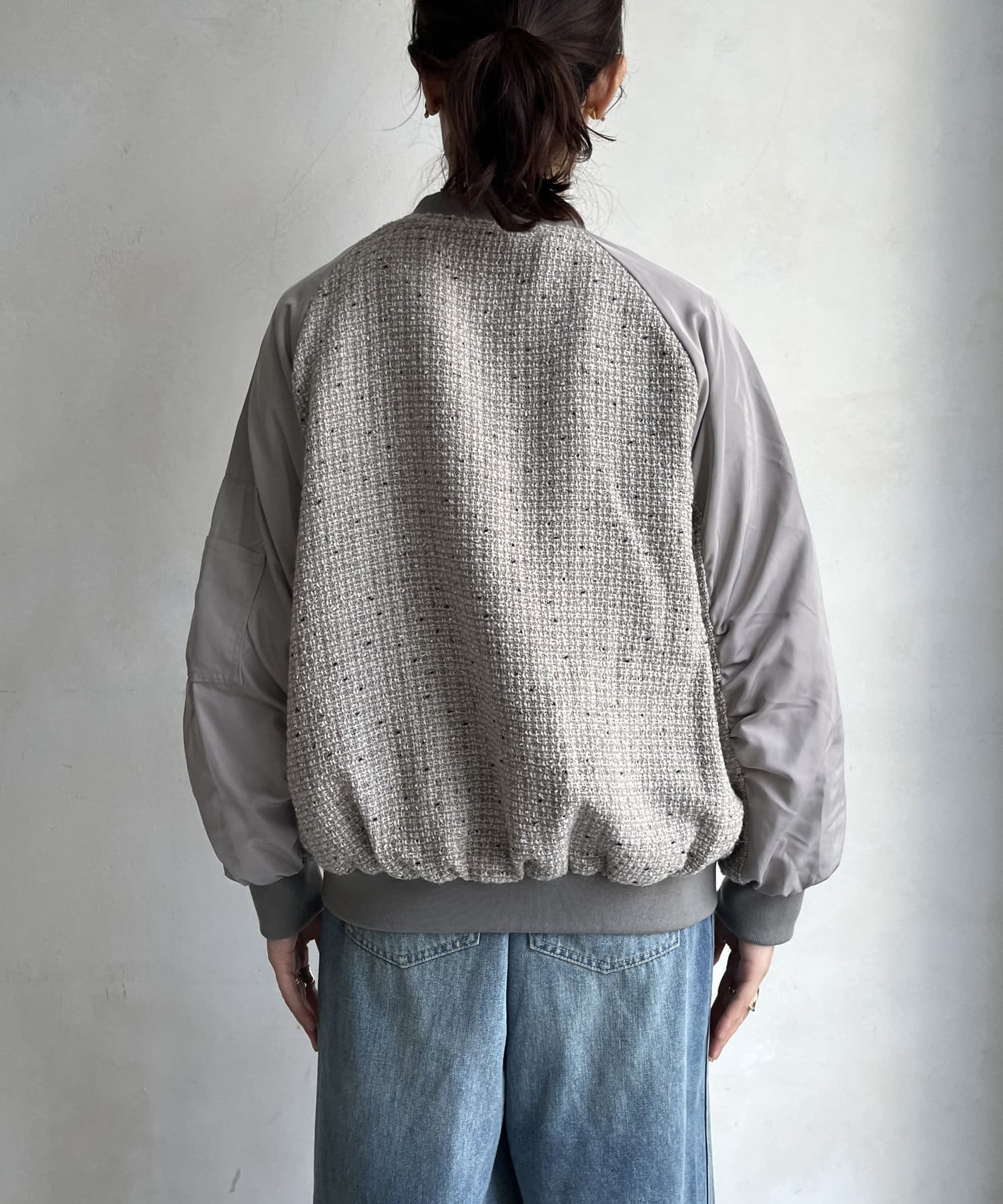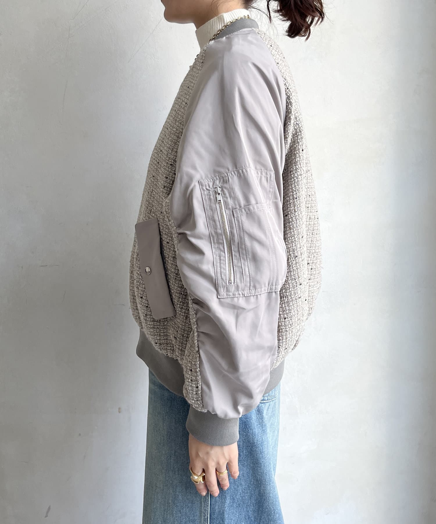 ツイード生地を合わせることで、カジュアMA1に女性らしさをプラスしました。