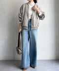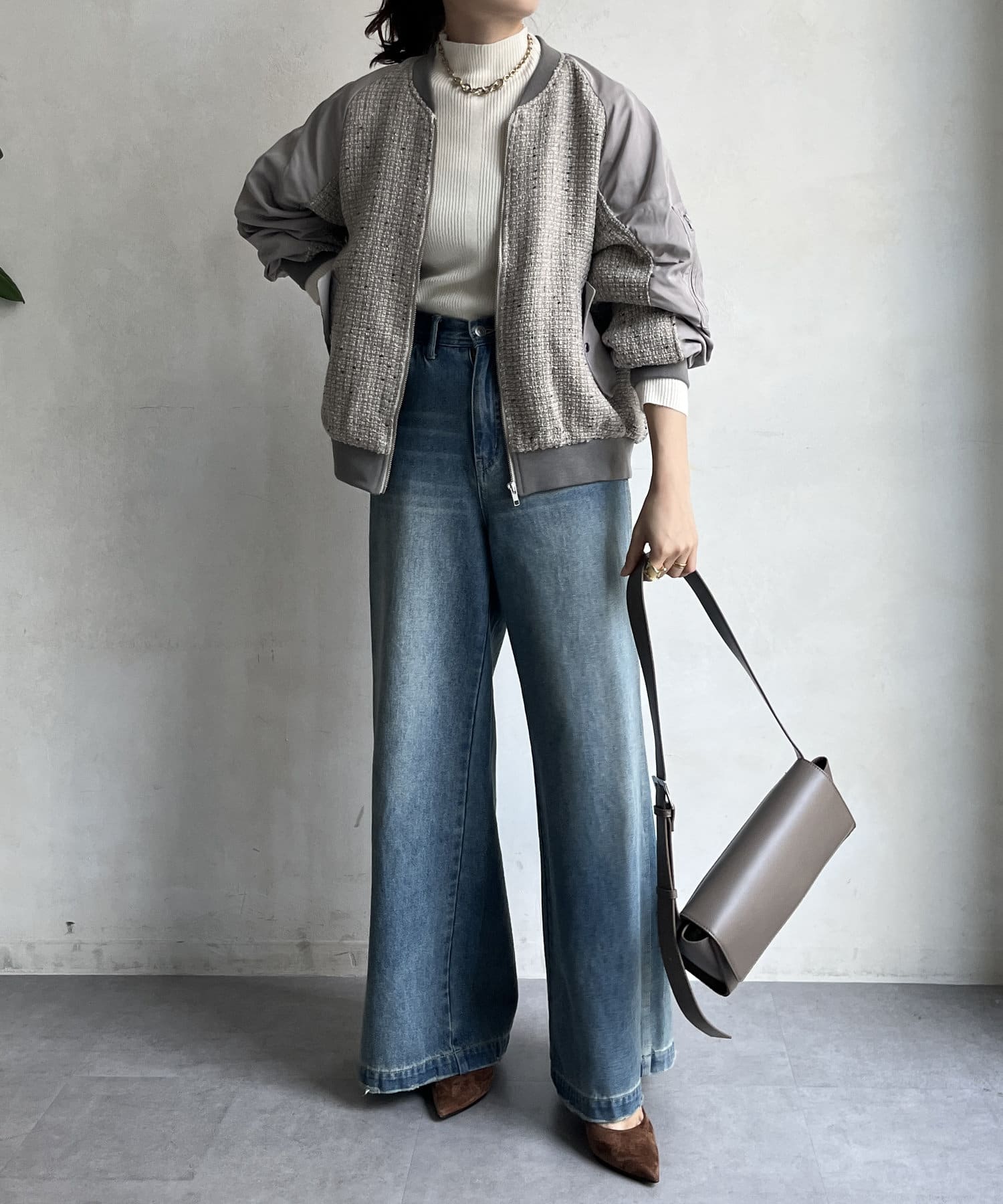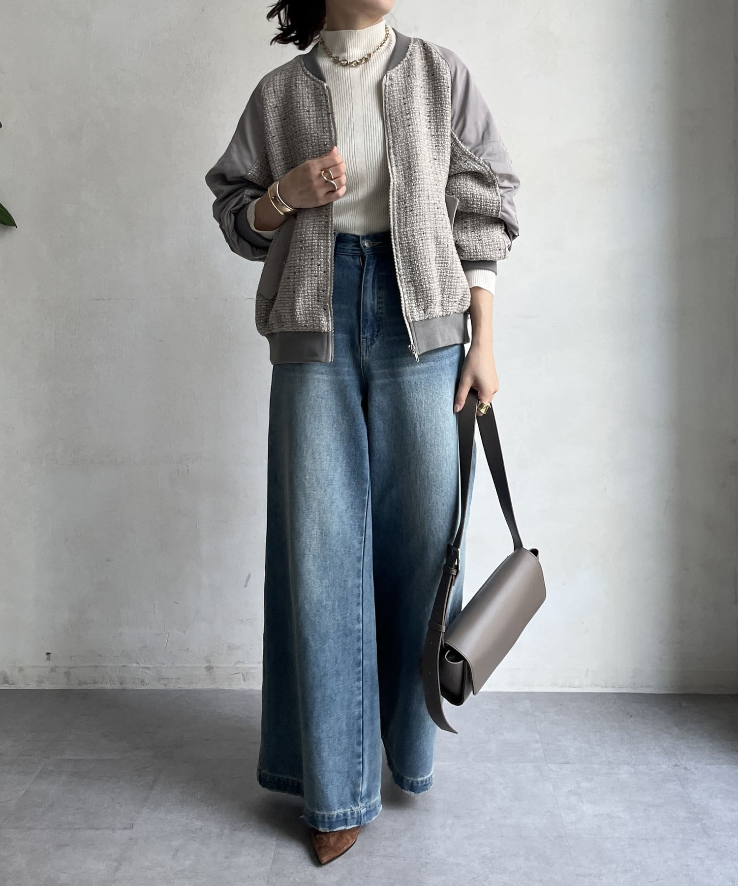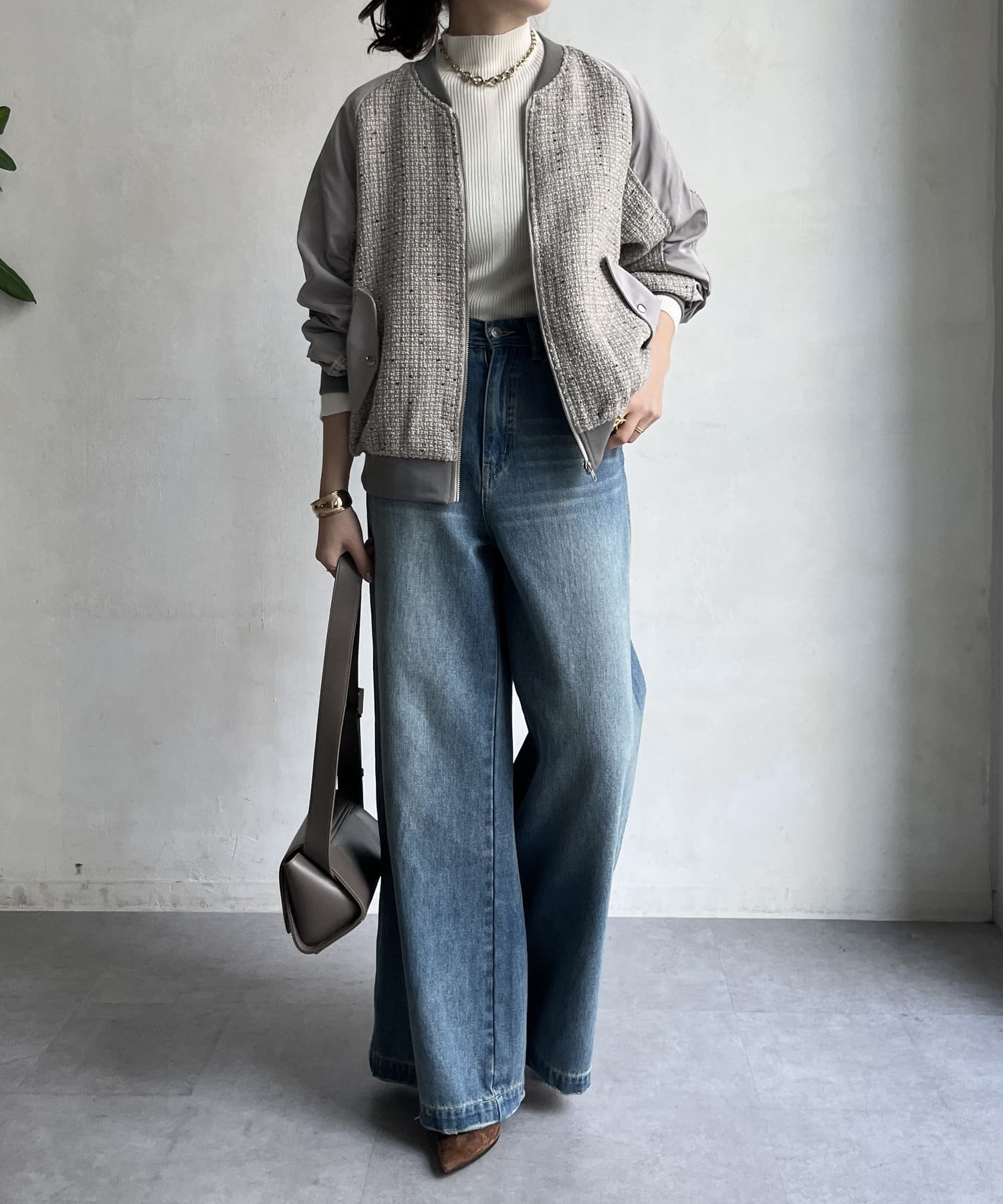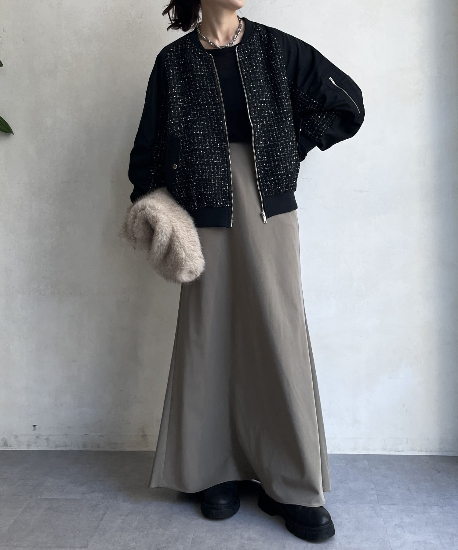 ツイード生地を合わせることで、カジュアMA1に女性らしさをプラスしました。
