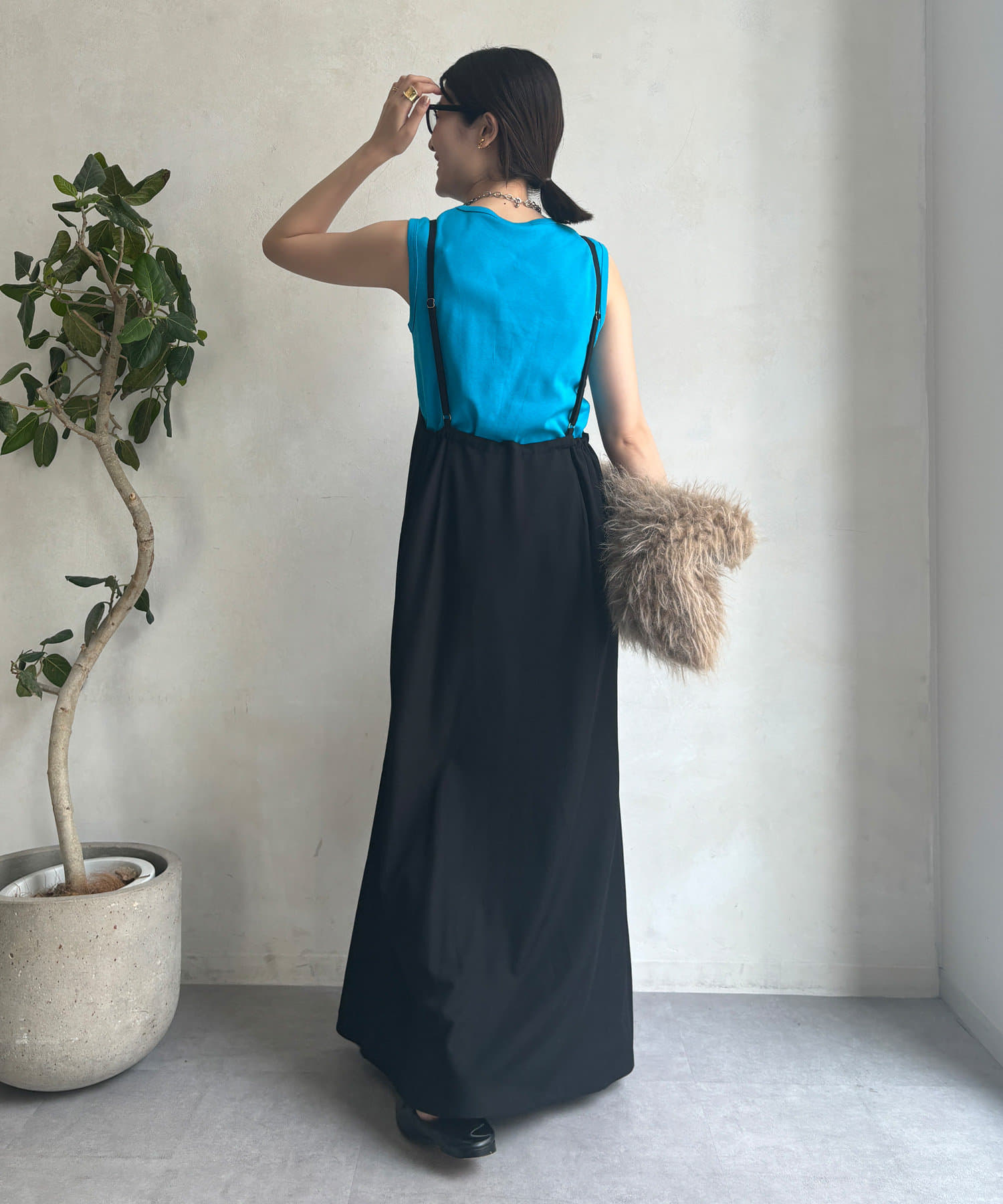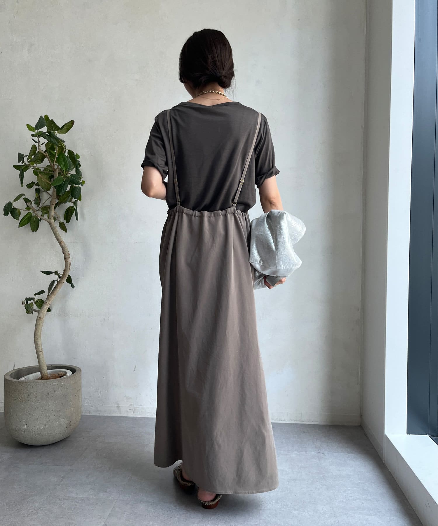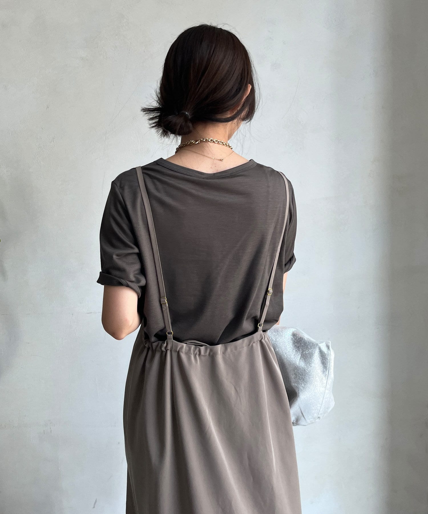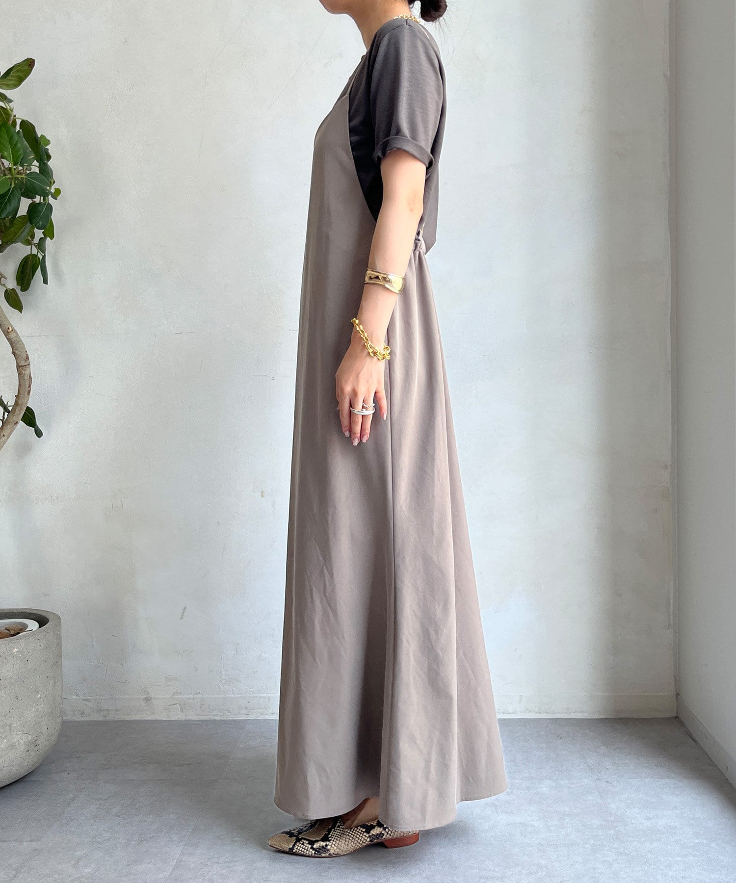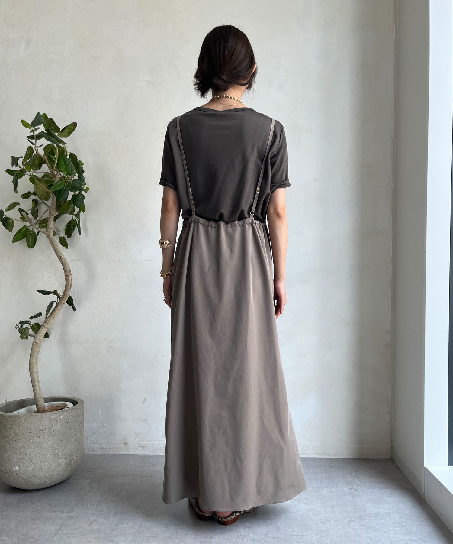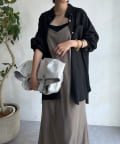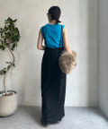 落ち感のある素材を使用し、裾に向かってマーメイドラインに広がるで綺麗なシルエットを表現。