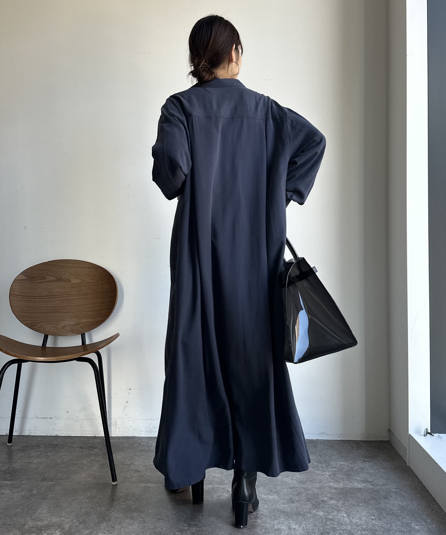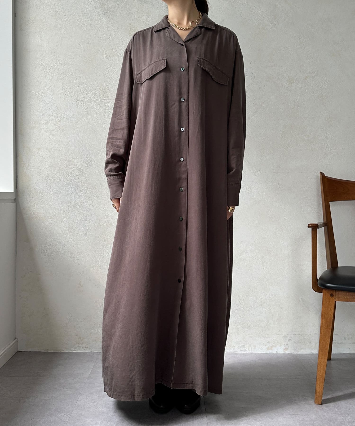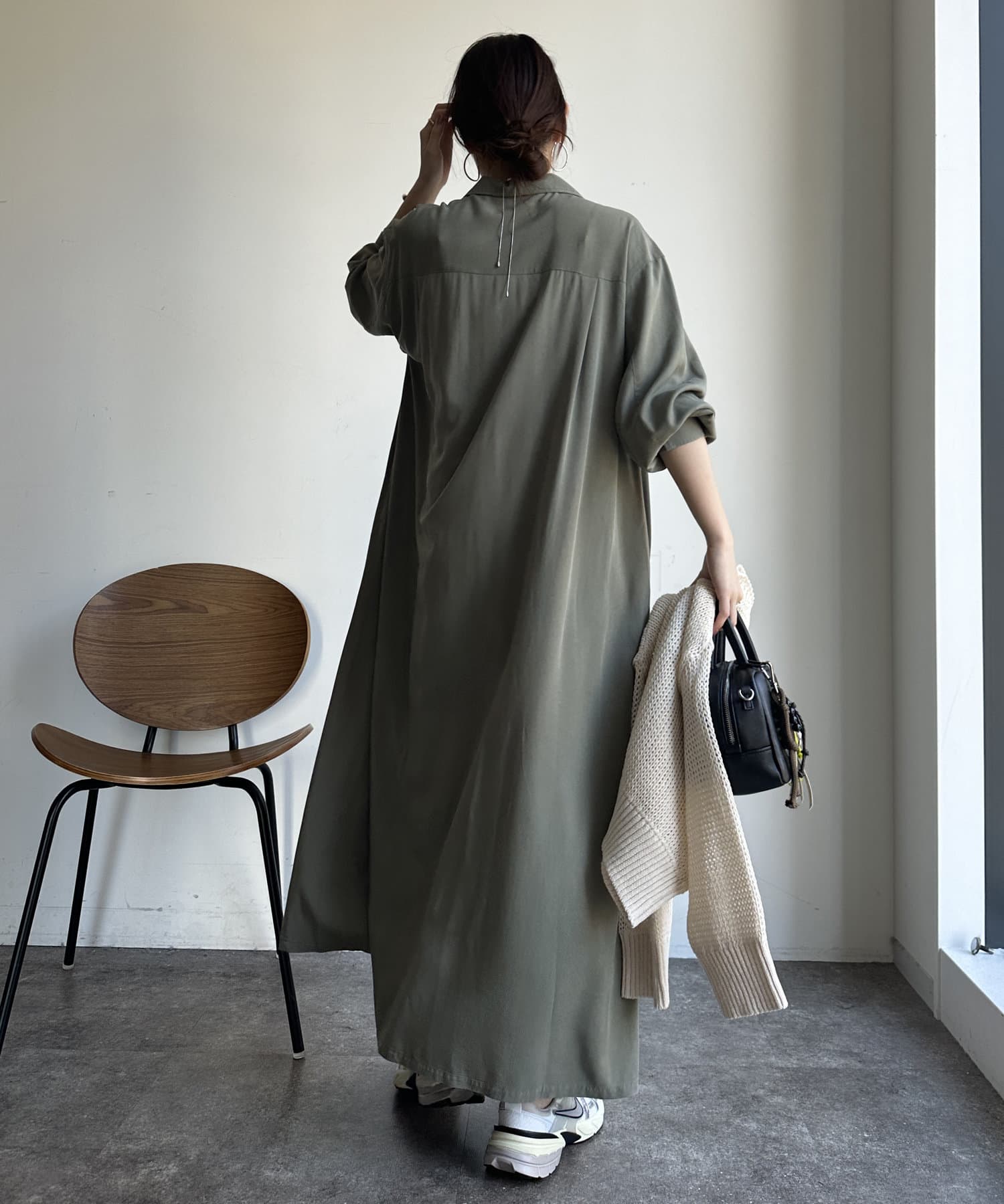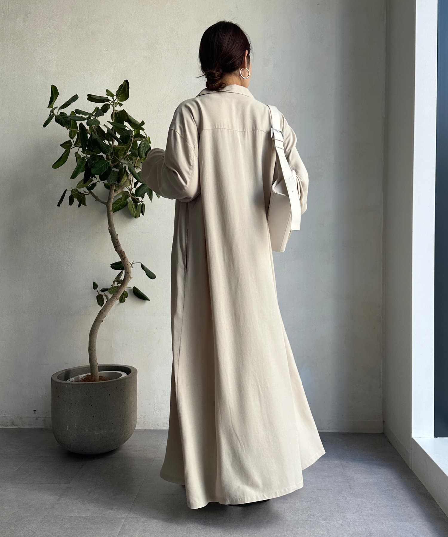 セルロースの落ち感ある素材で仕上げたロングシャツワンピース。