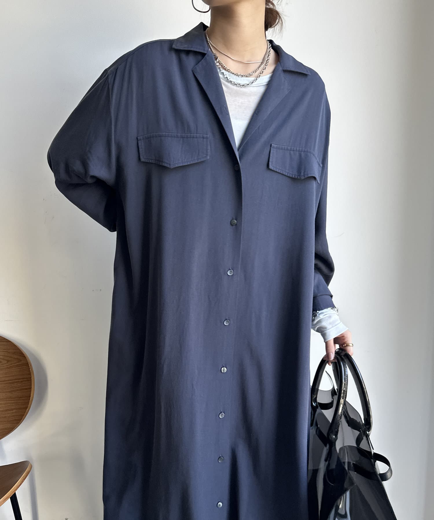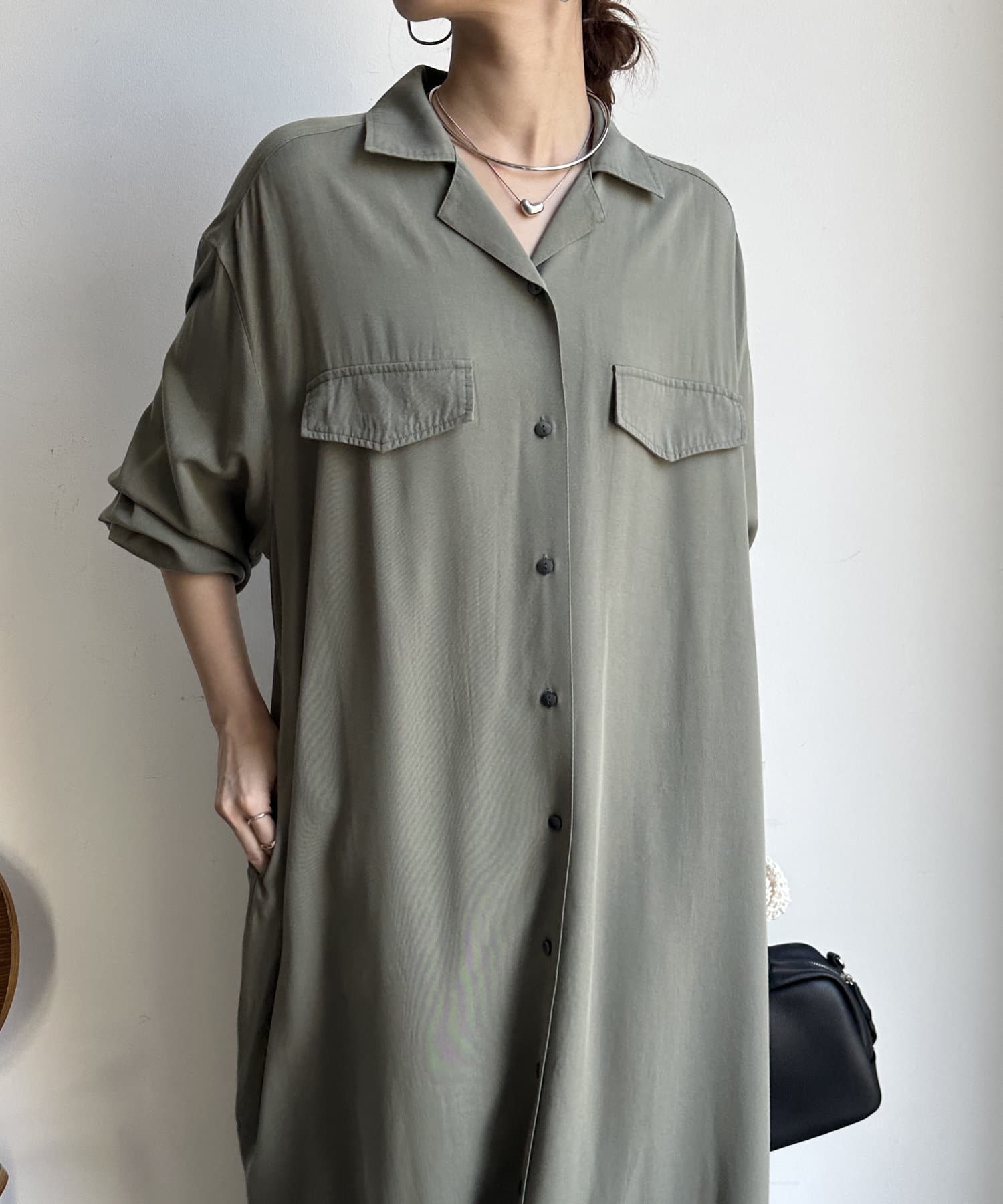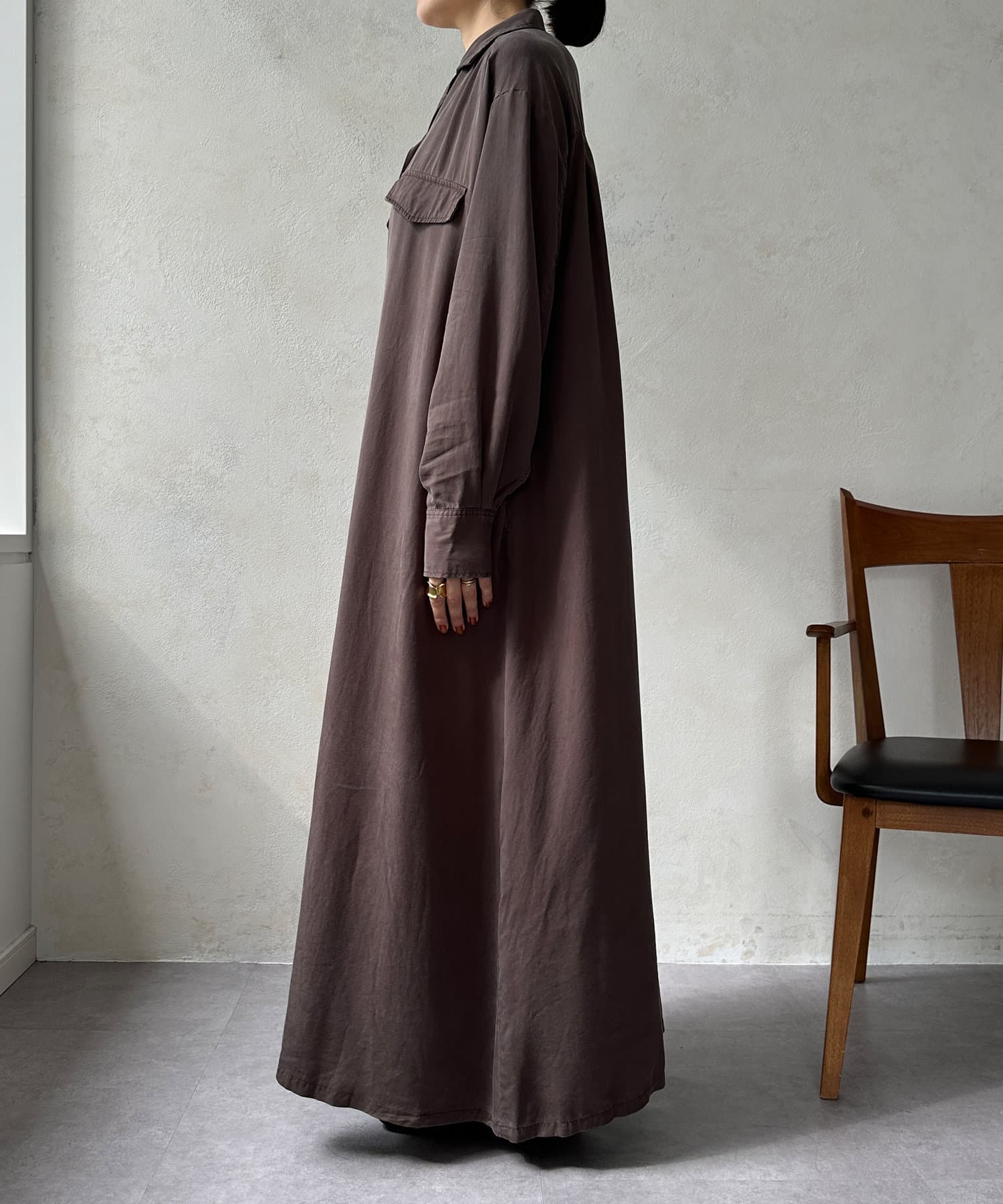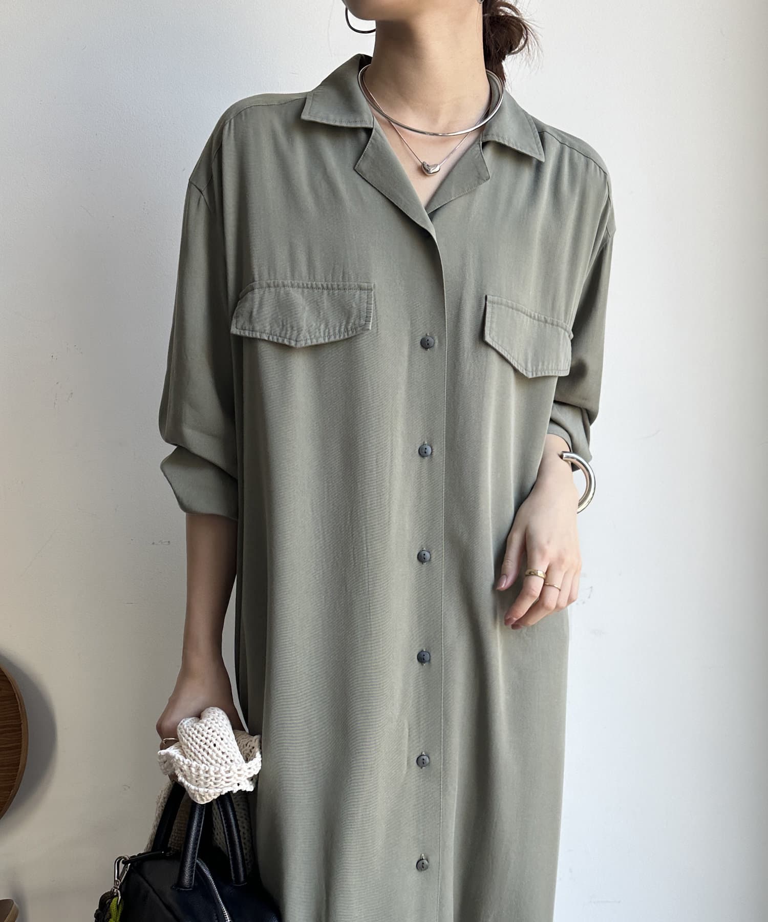 セルロースの落ち感ある素材で仕上げたロングシャツワンピース。