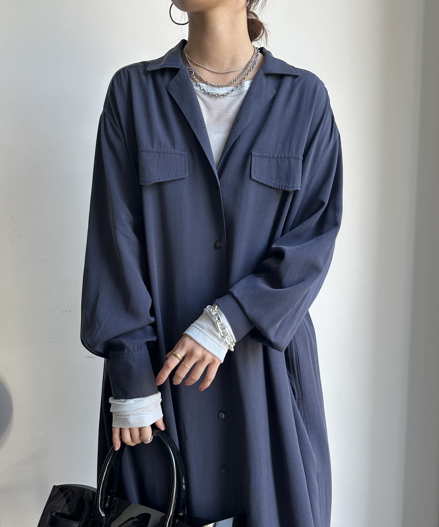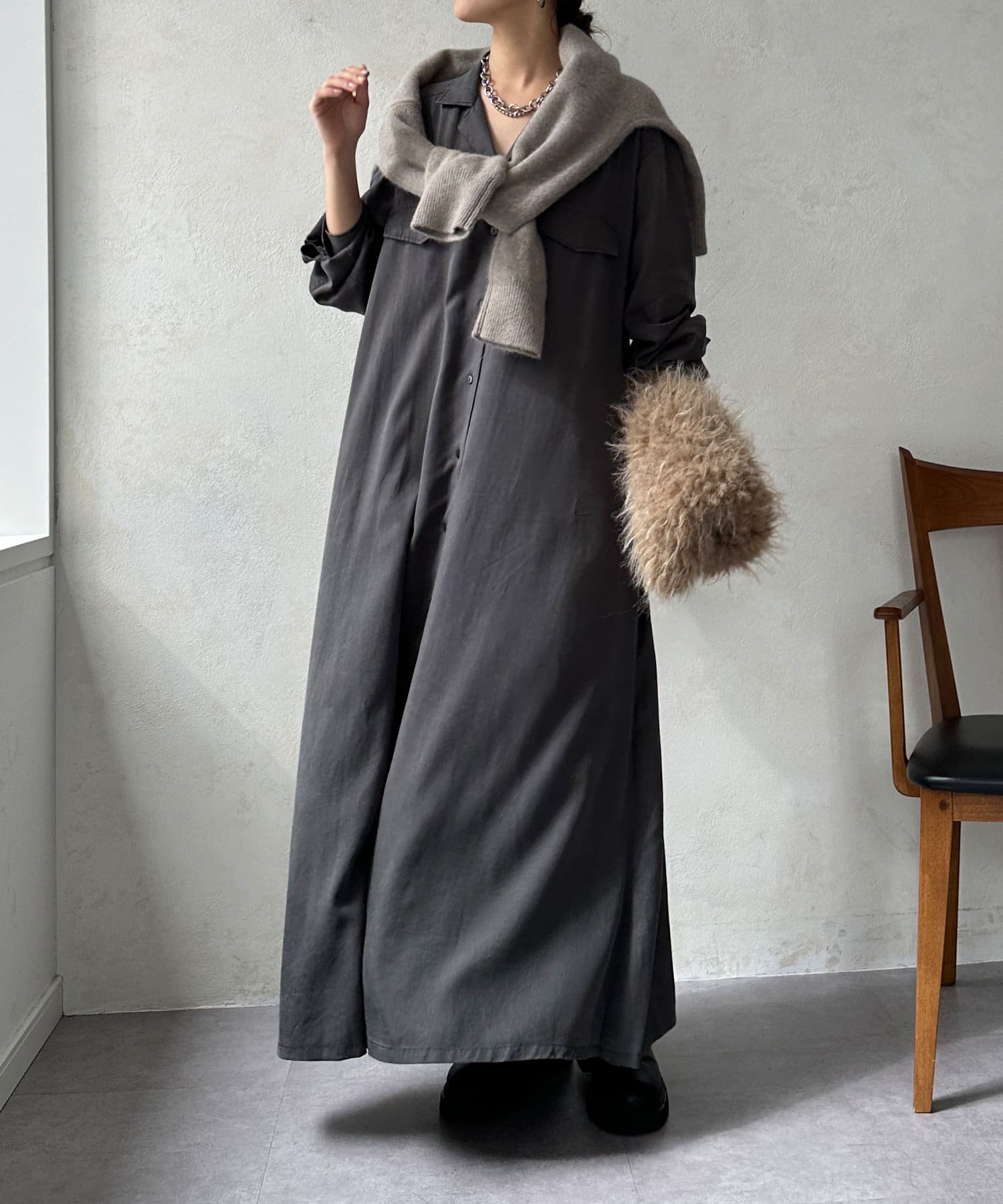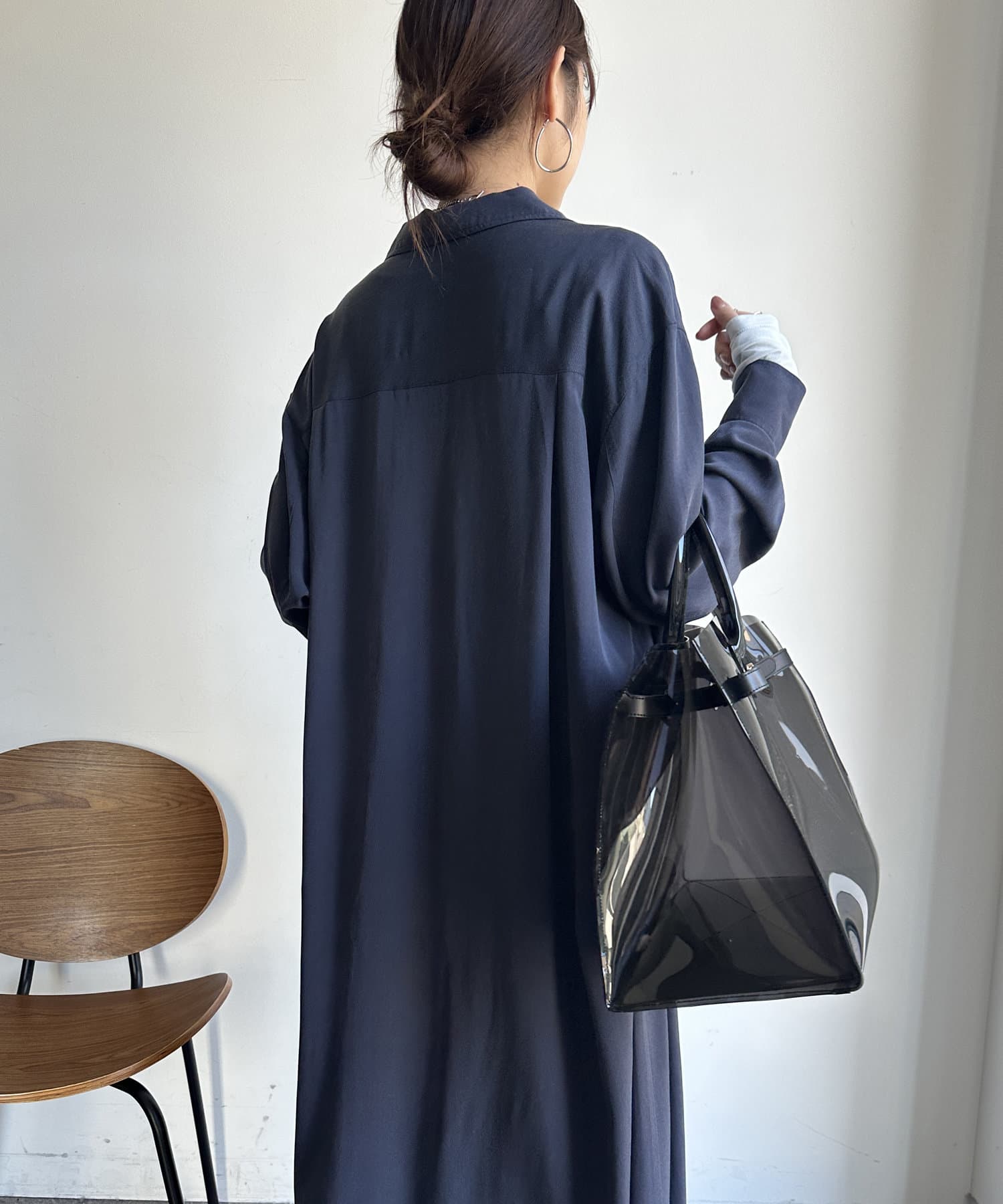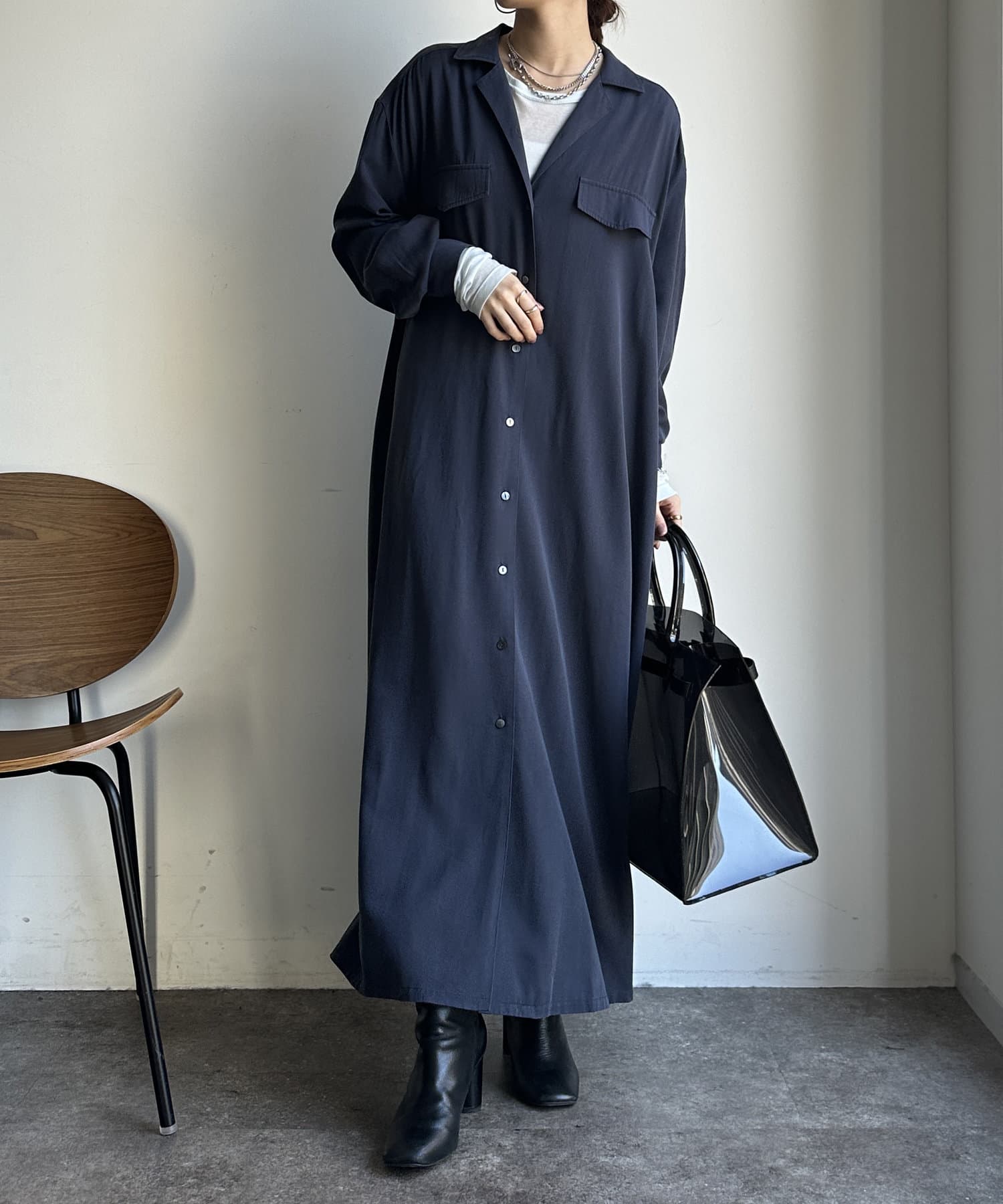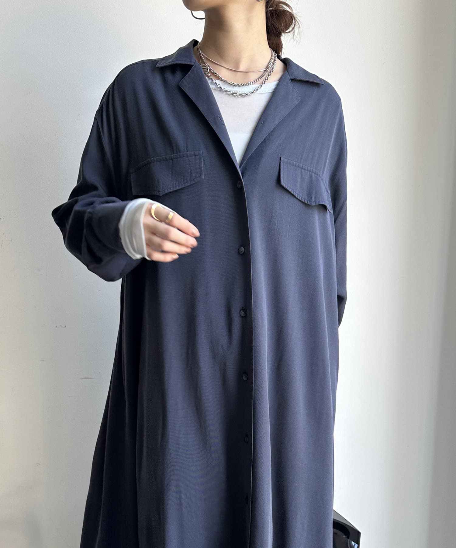 セルロースの落ち感ある素材で仕上げたロングシャツワンピース。