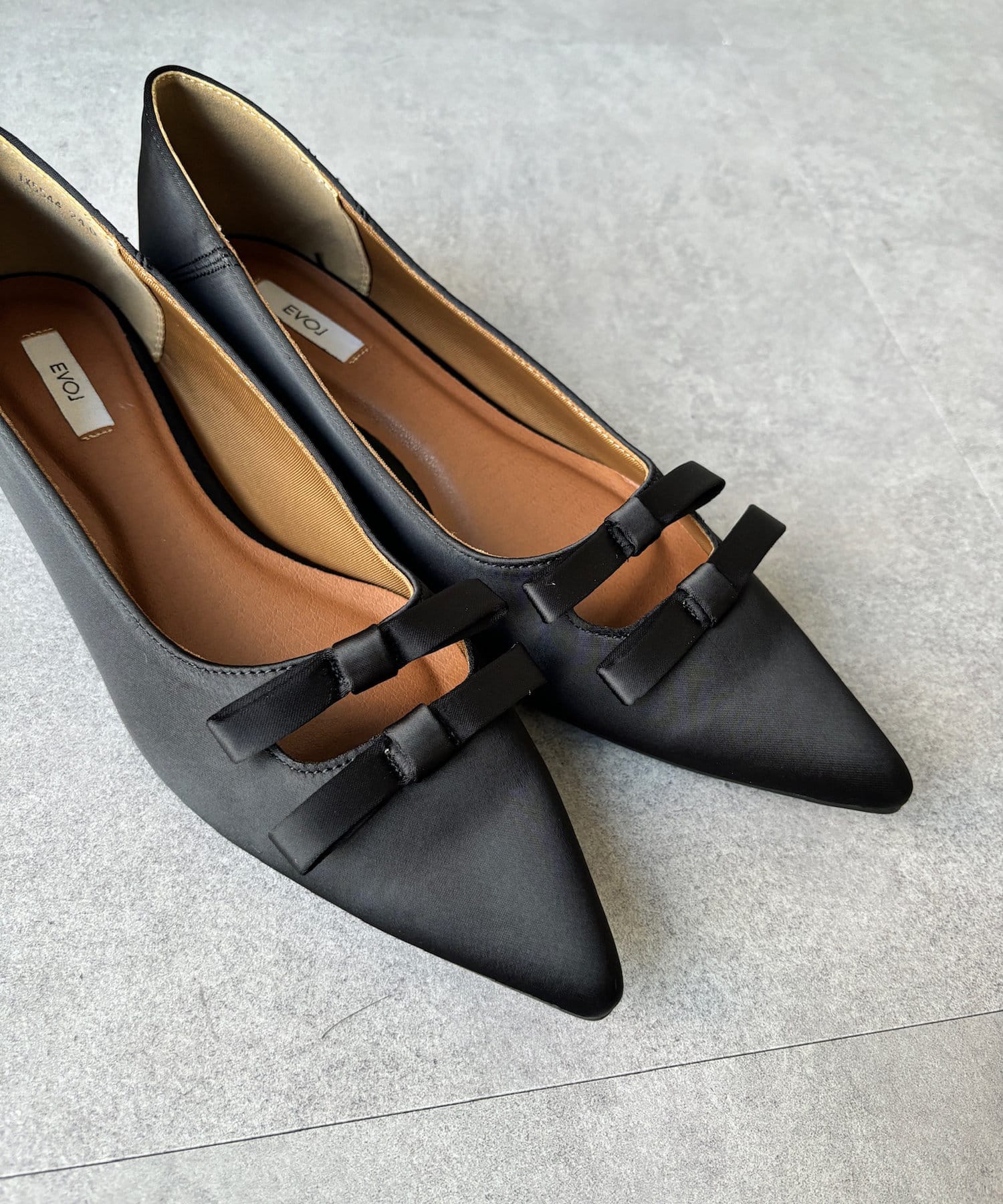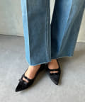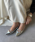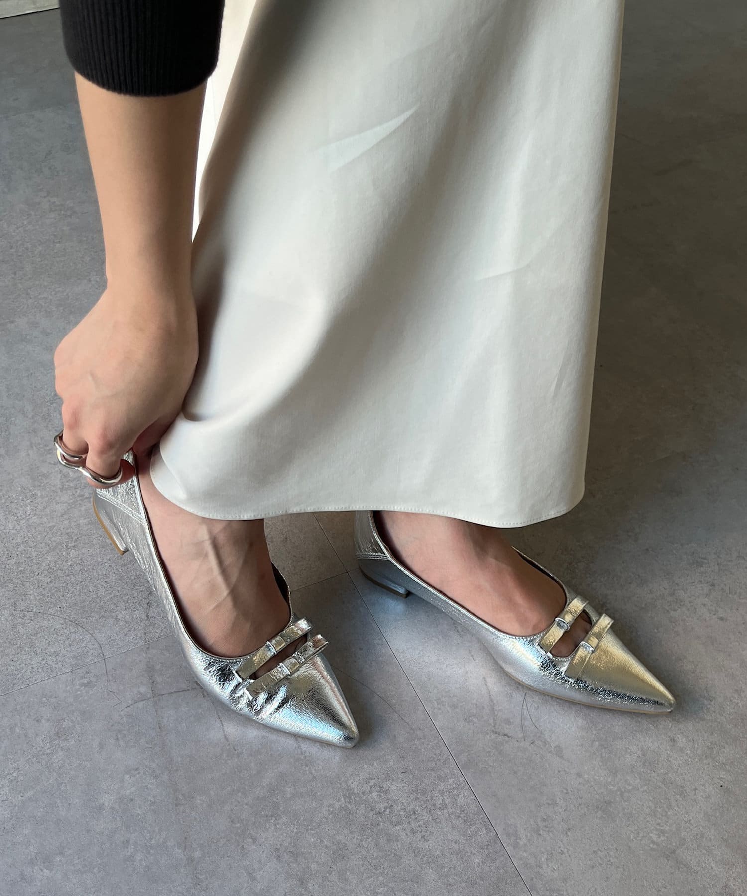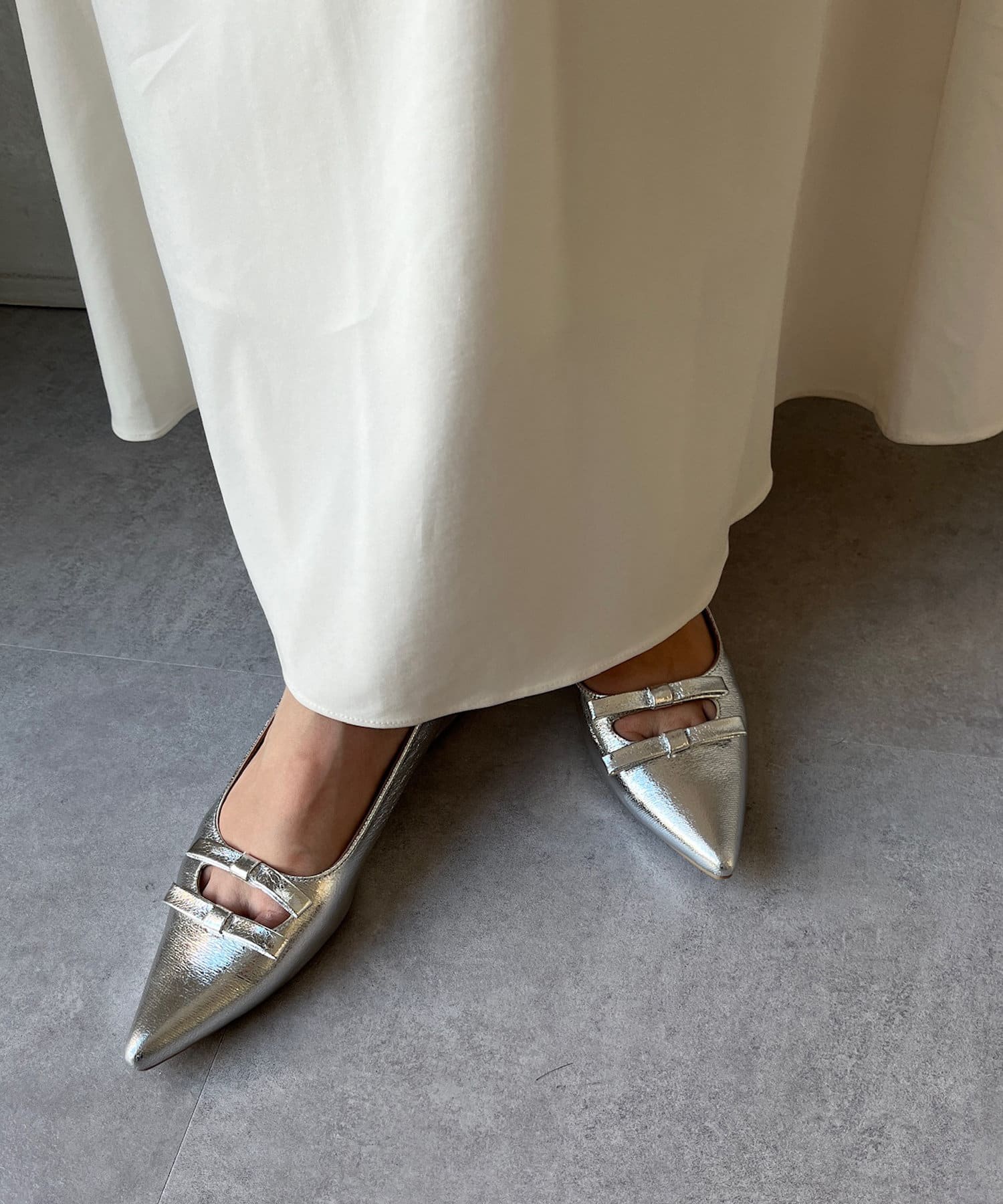 華奢なポインテッドトウと細身のリボンデザインなので、