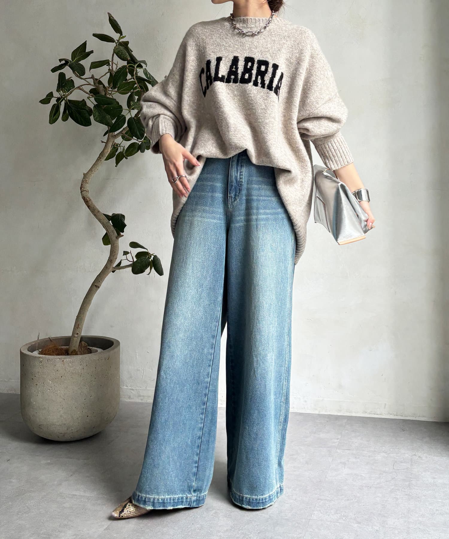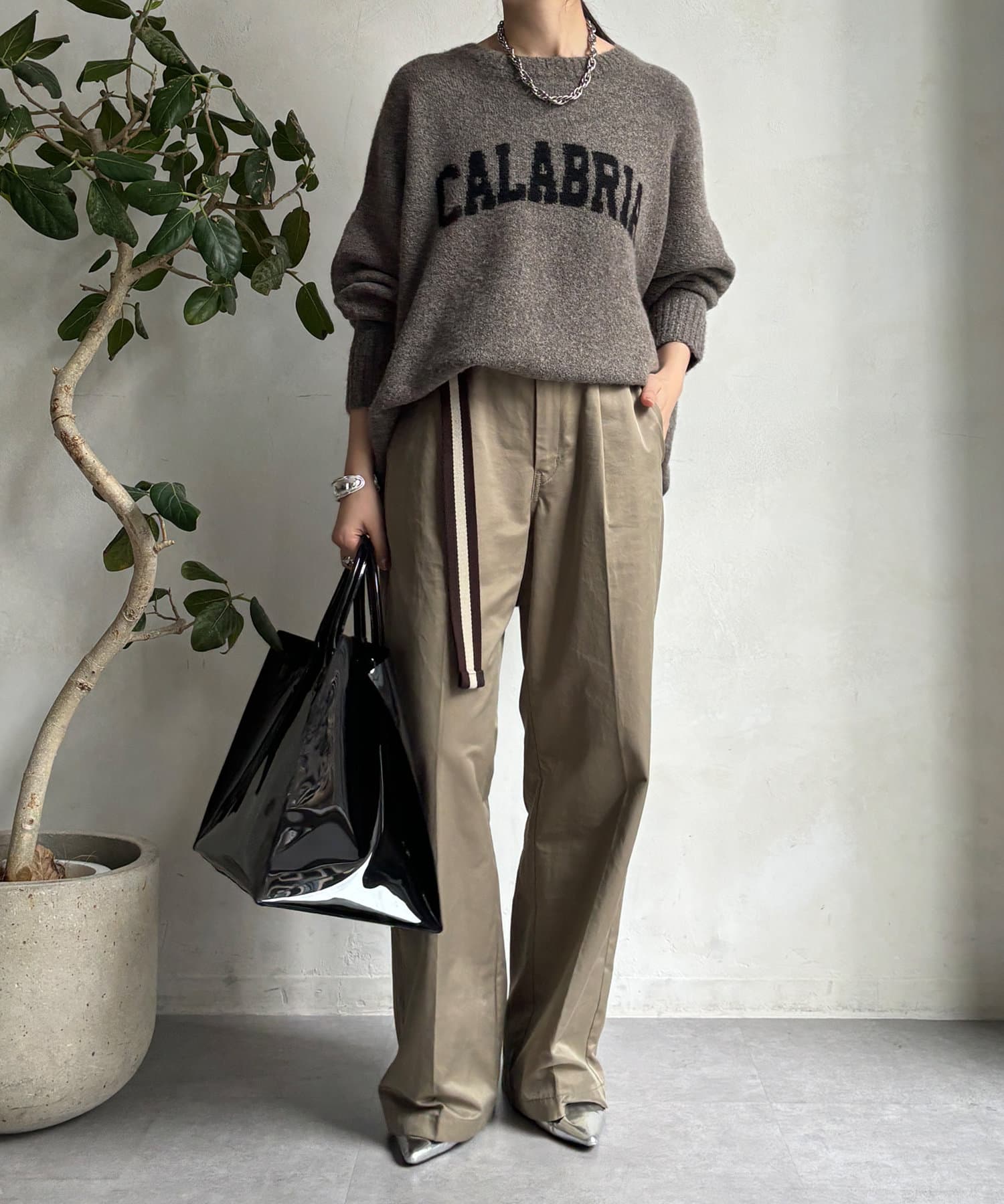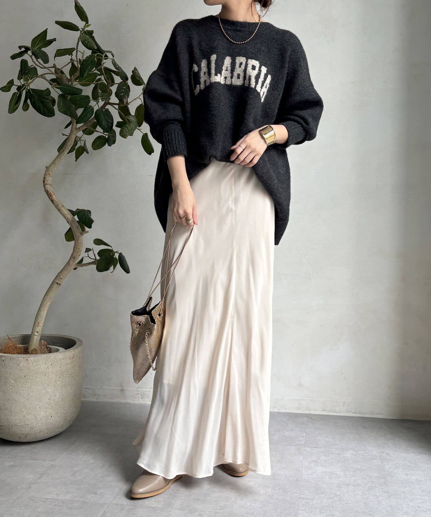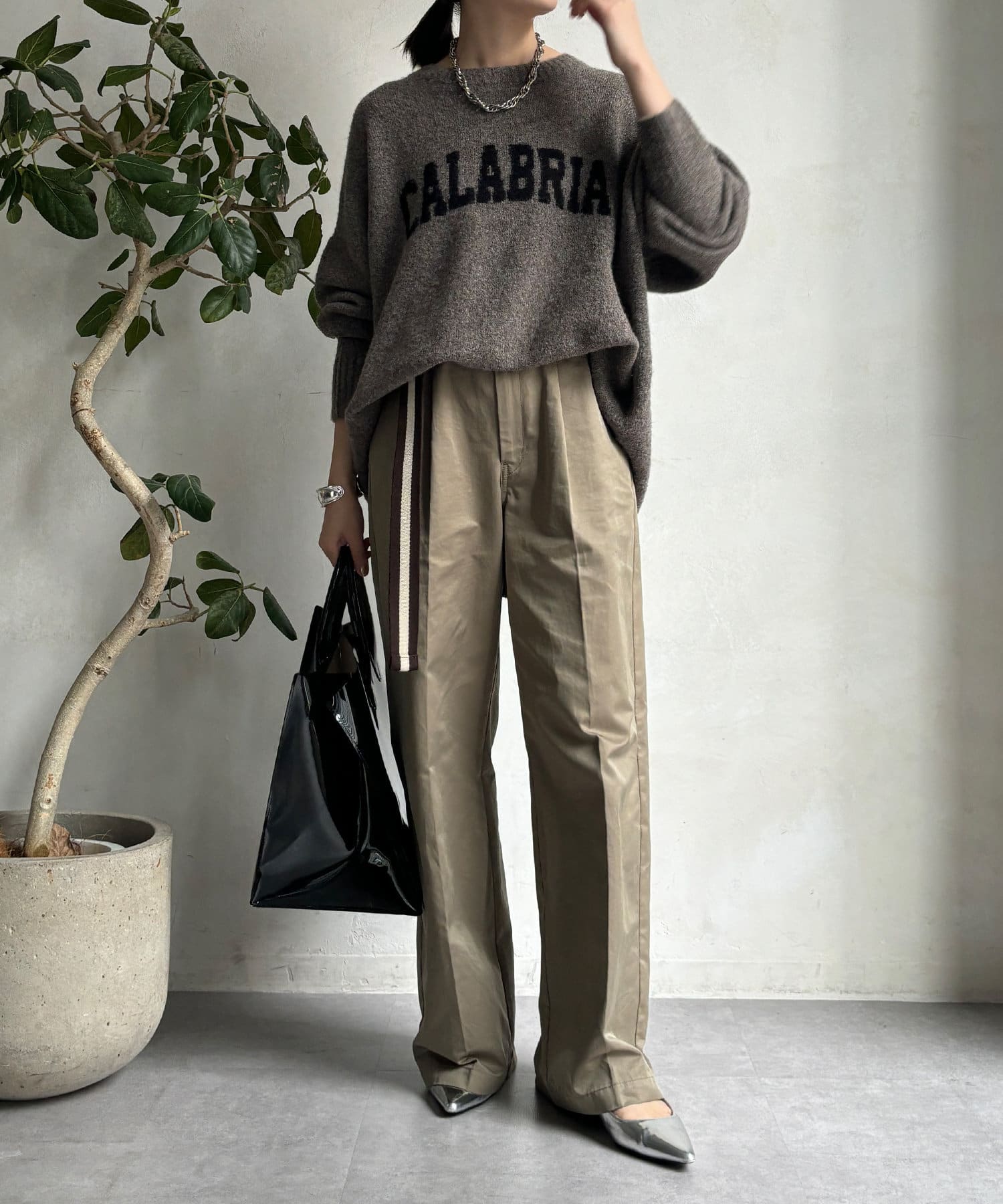 インターシャ編みでコーディネートしやすいシンプルなニットは、スウェットほどカジュアルにはなりすぎず、大人らしく着られるのがポイントです。