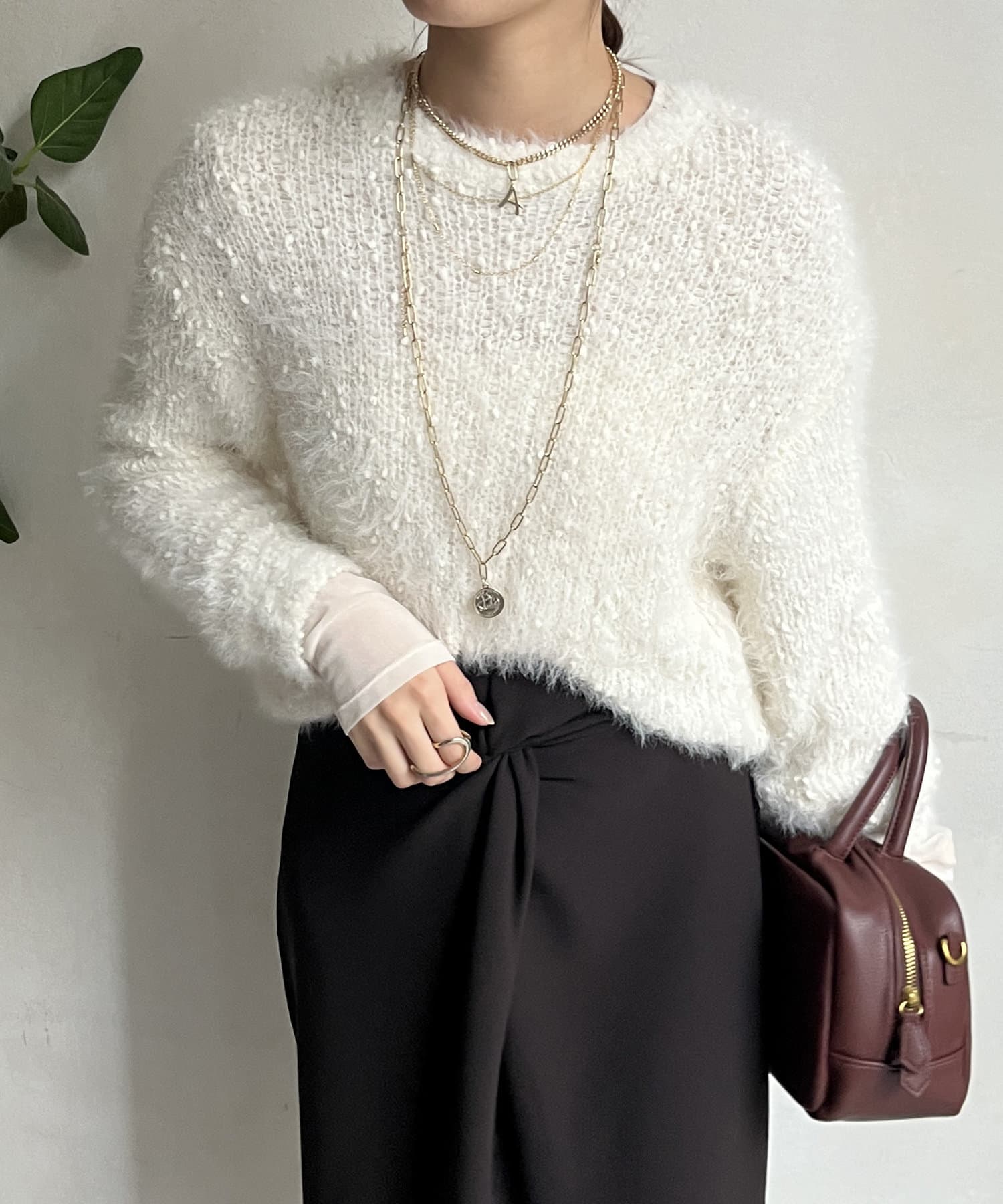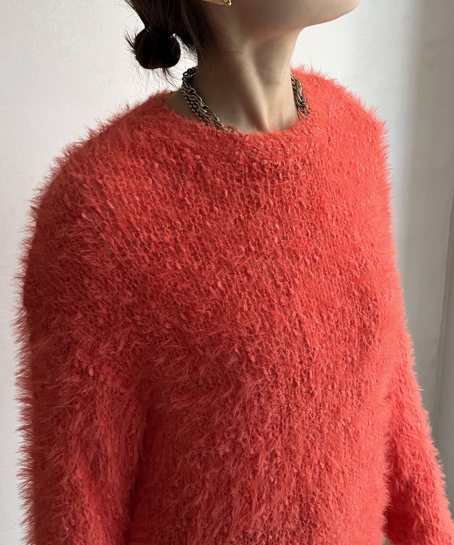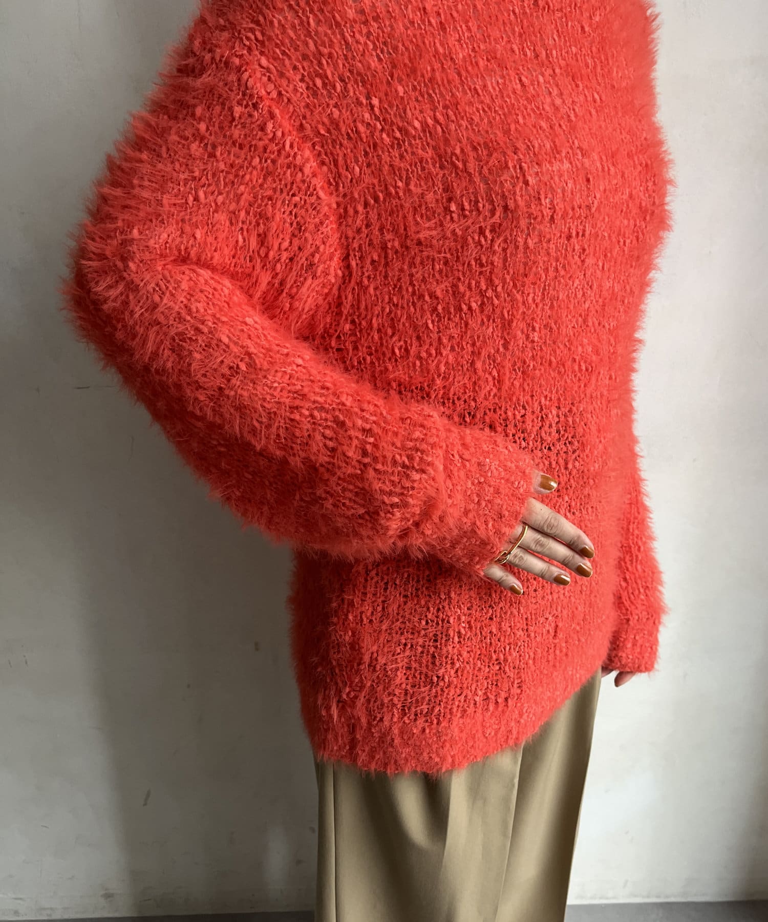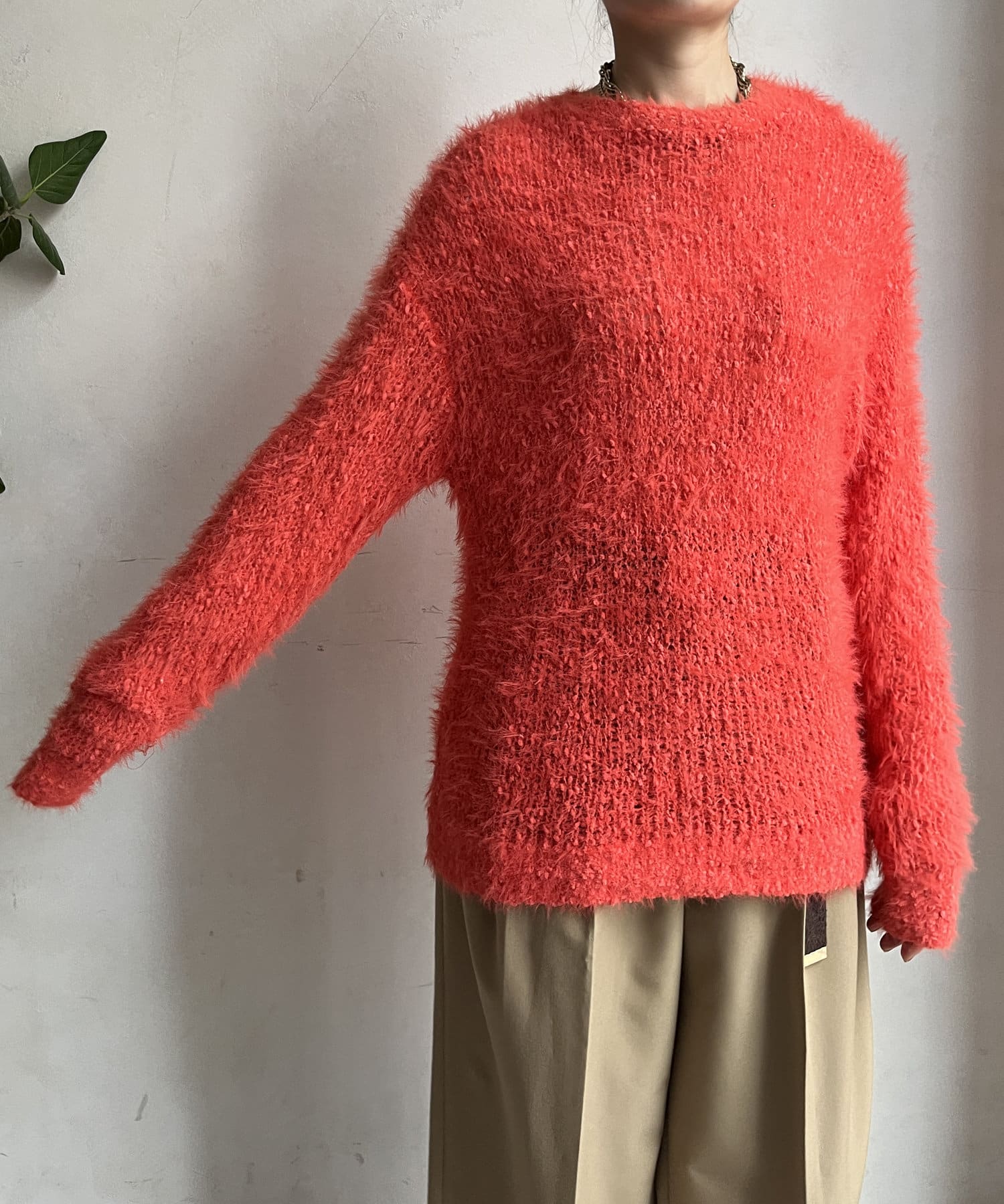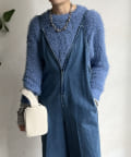 ポコポコしたニットとフェザーヤーンをミックスしたローゲージニット。