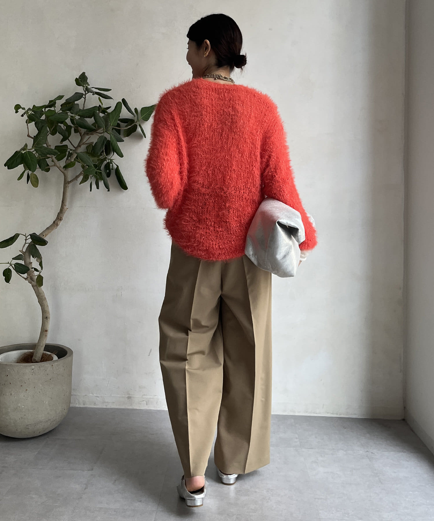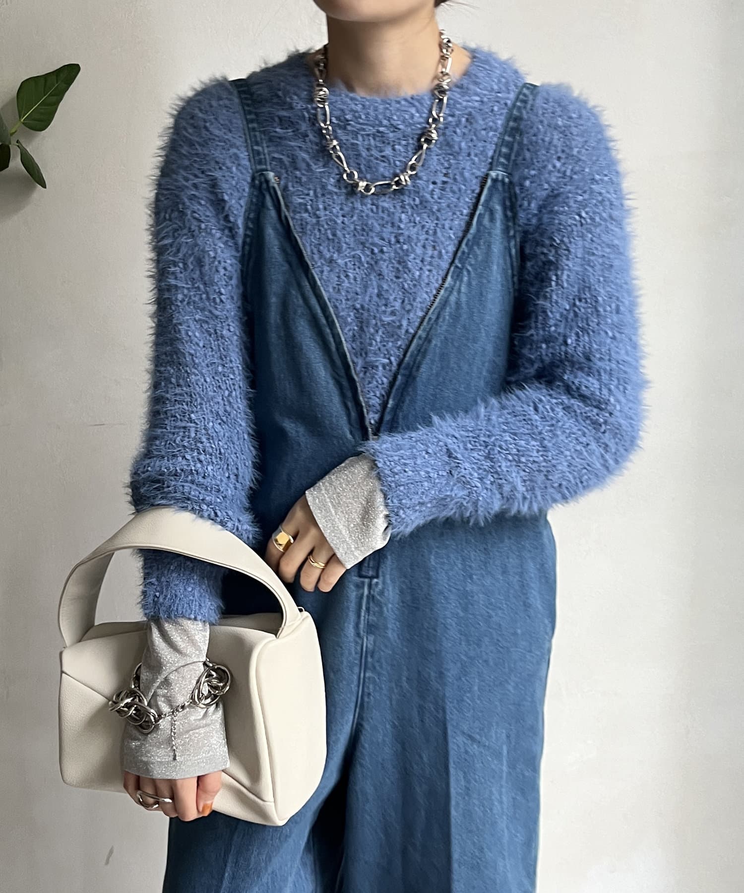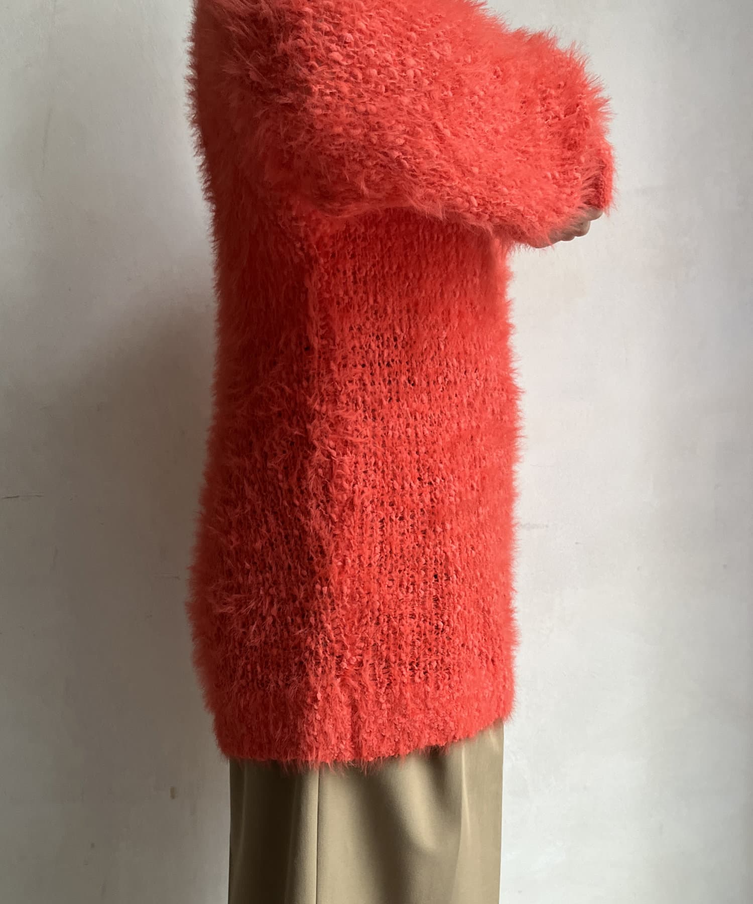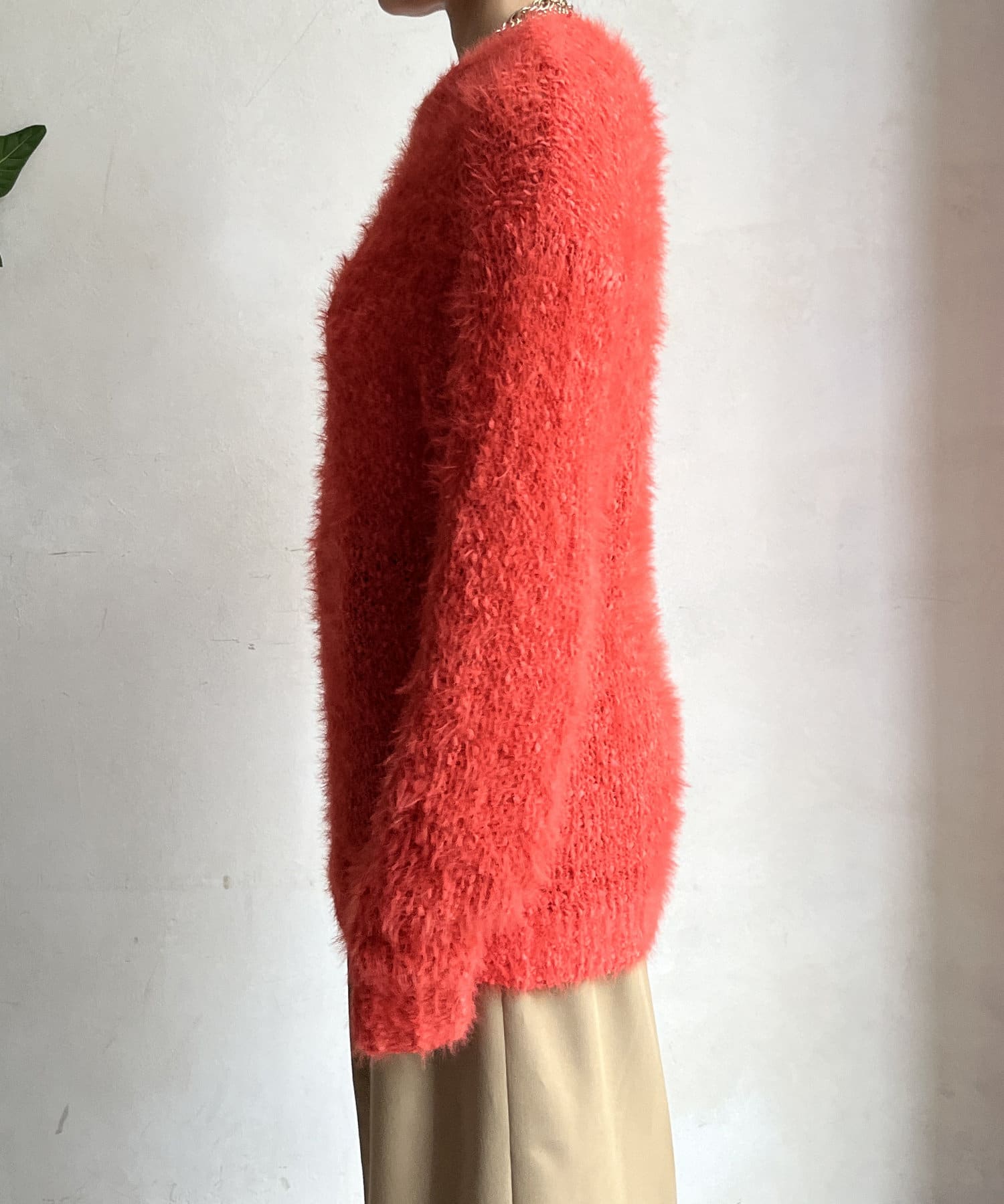ポコポコしたニットとフェザーヤーンをミックスしたローゲージニット。