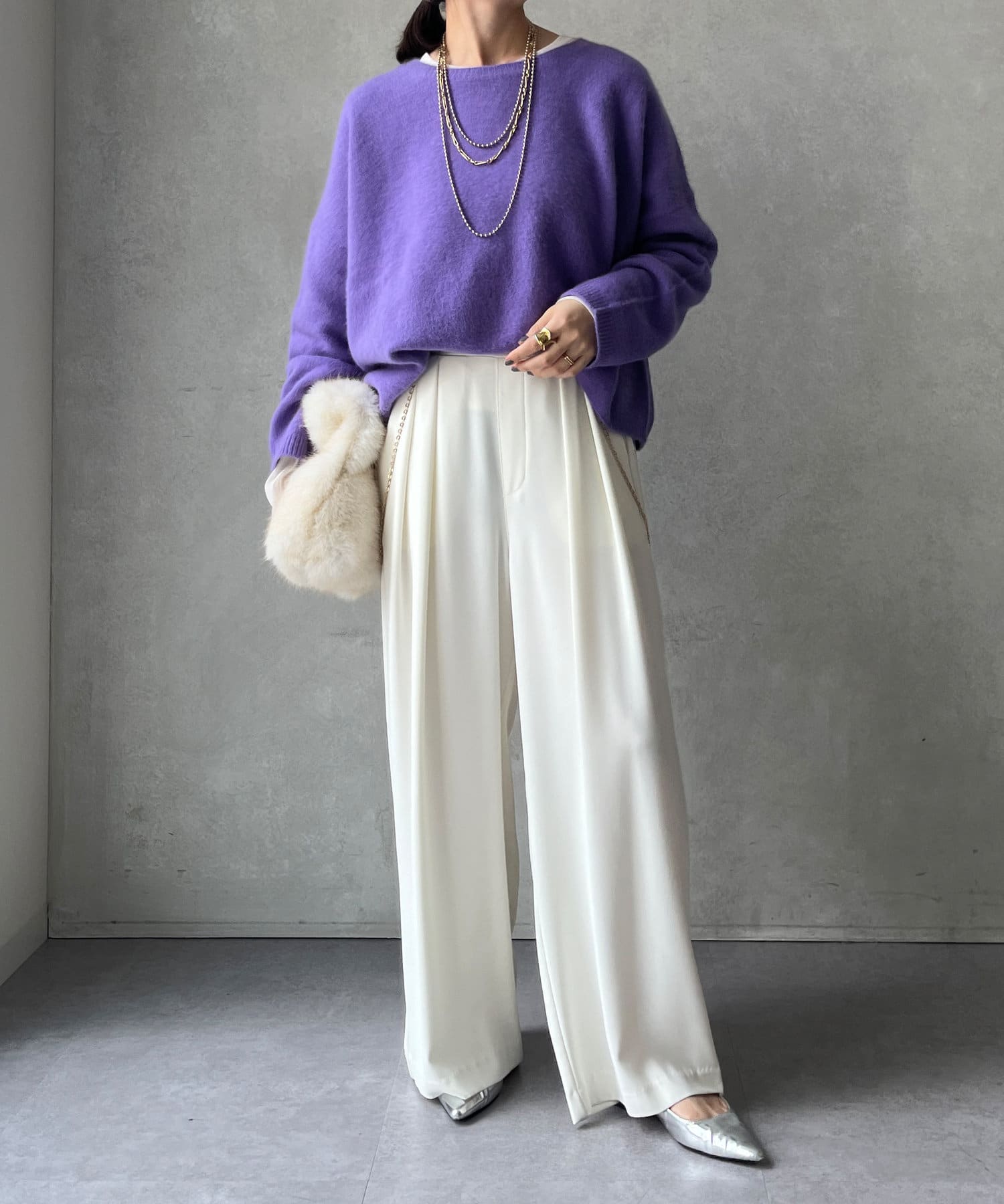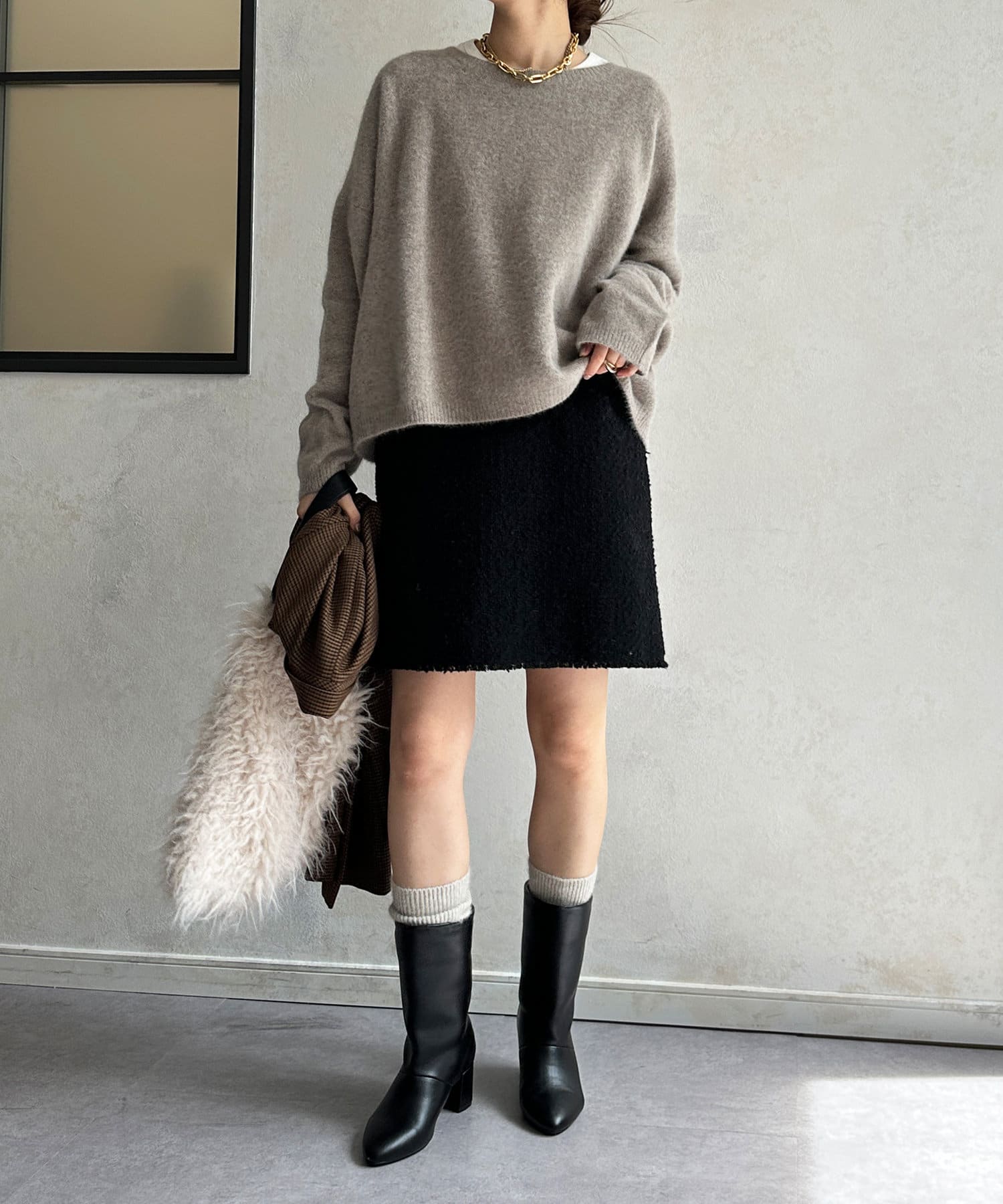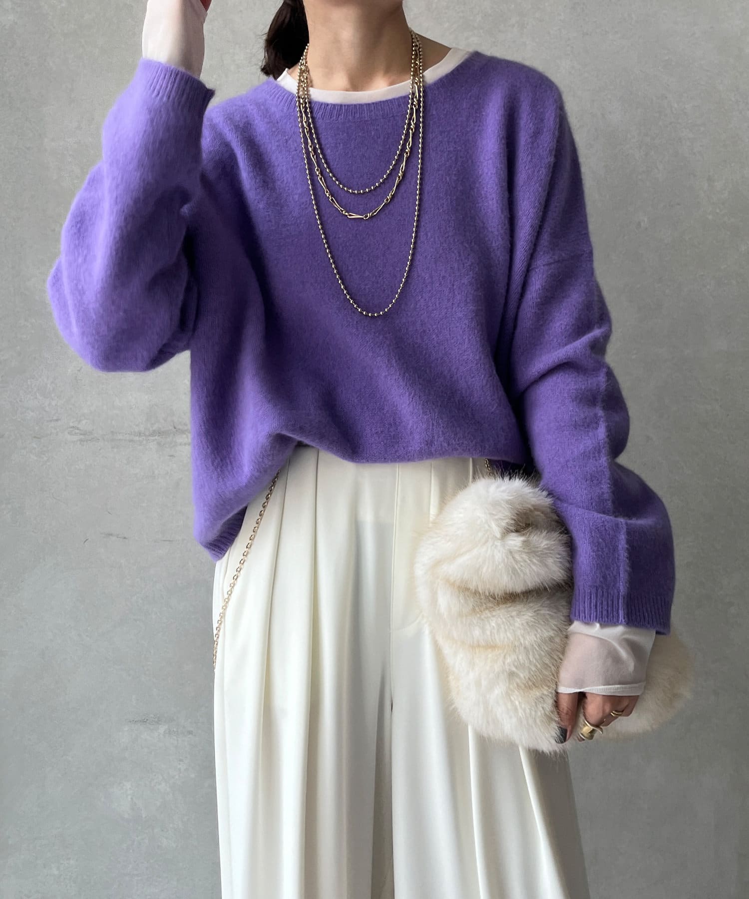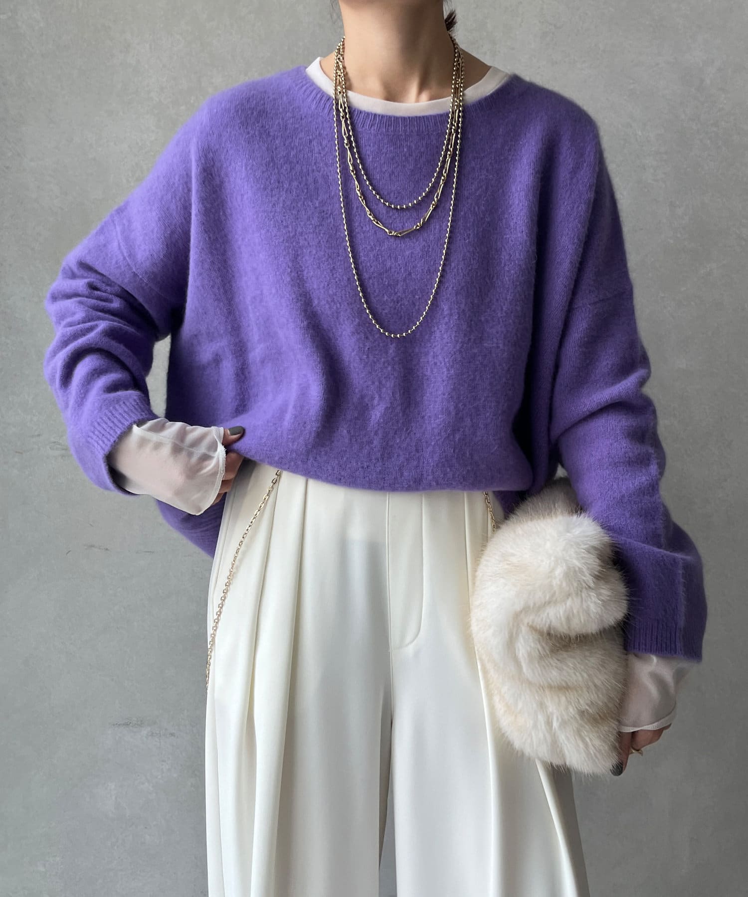 フォックス混のニットは保温性の高さが特徴なので、真冬でも軽く・暖かく着られるのがうれしいポイントです。