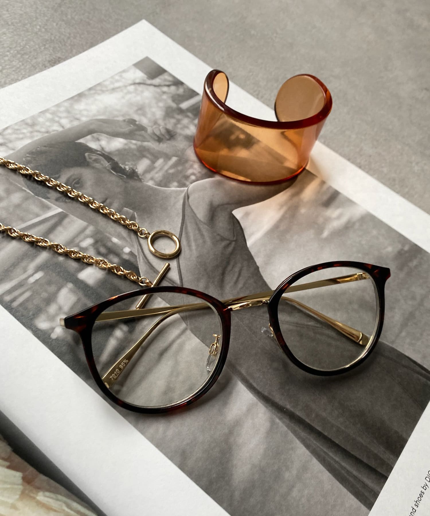 太すぎず細過ぎないフレームデザインが顔に馴染みやすく、テンプルが華奢なゴールドデザインなところも上品な大人っぽさ◎