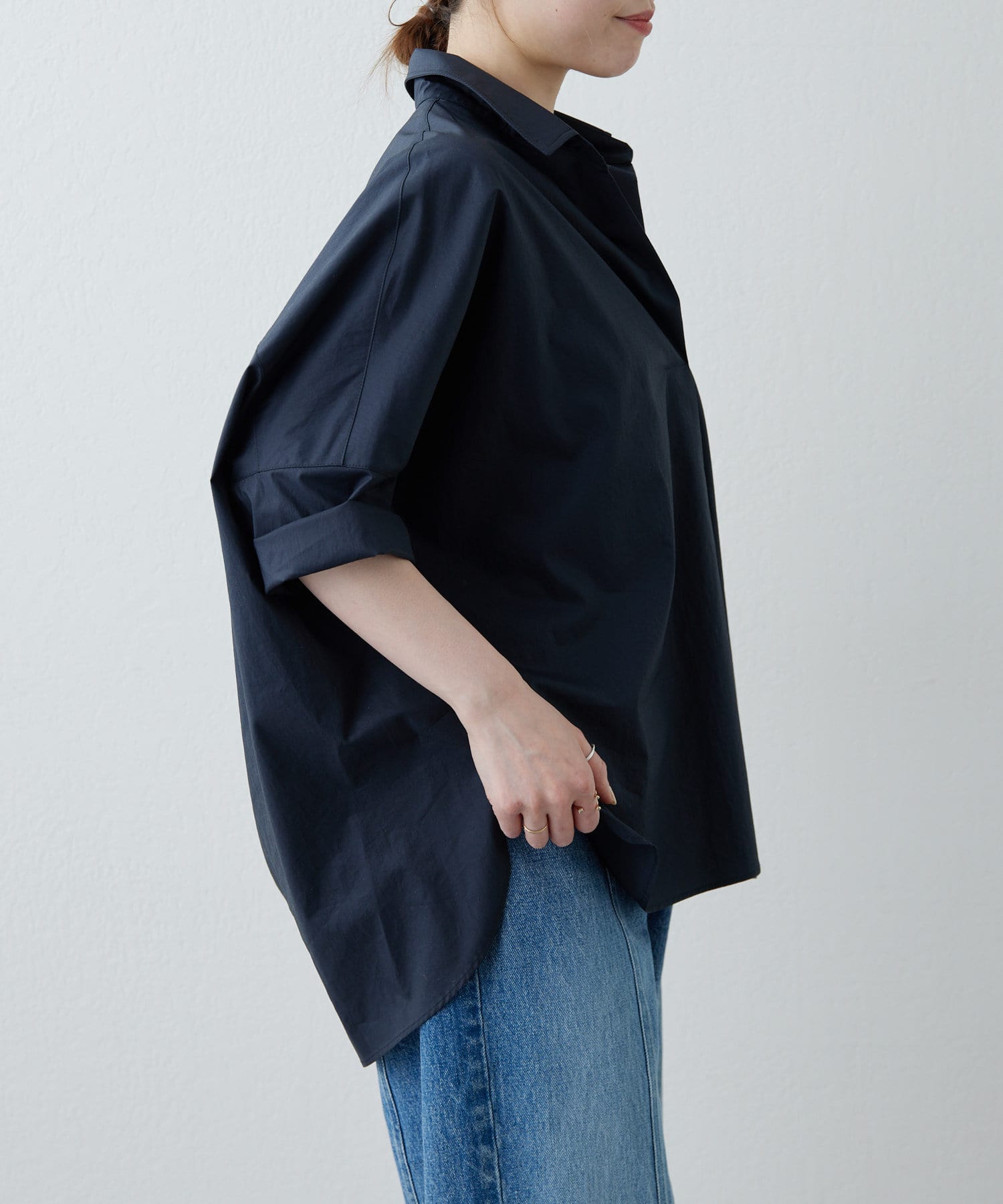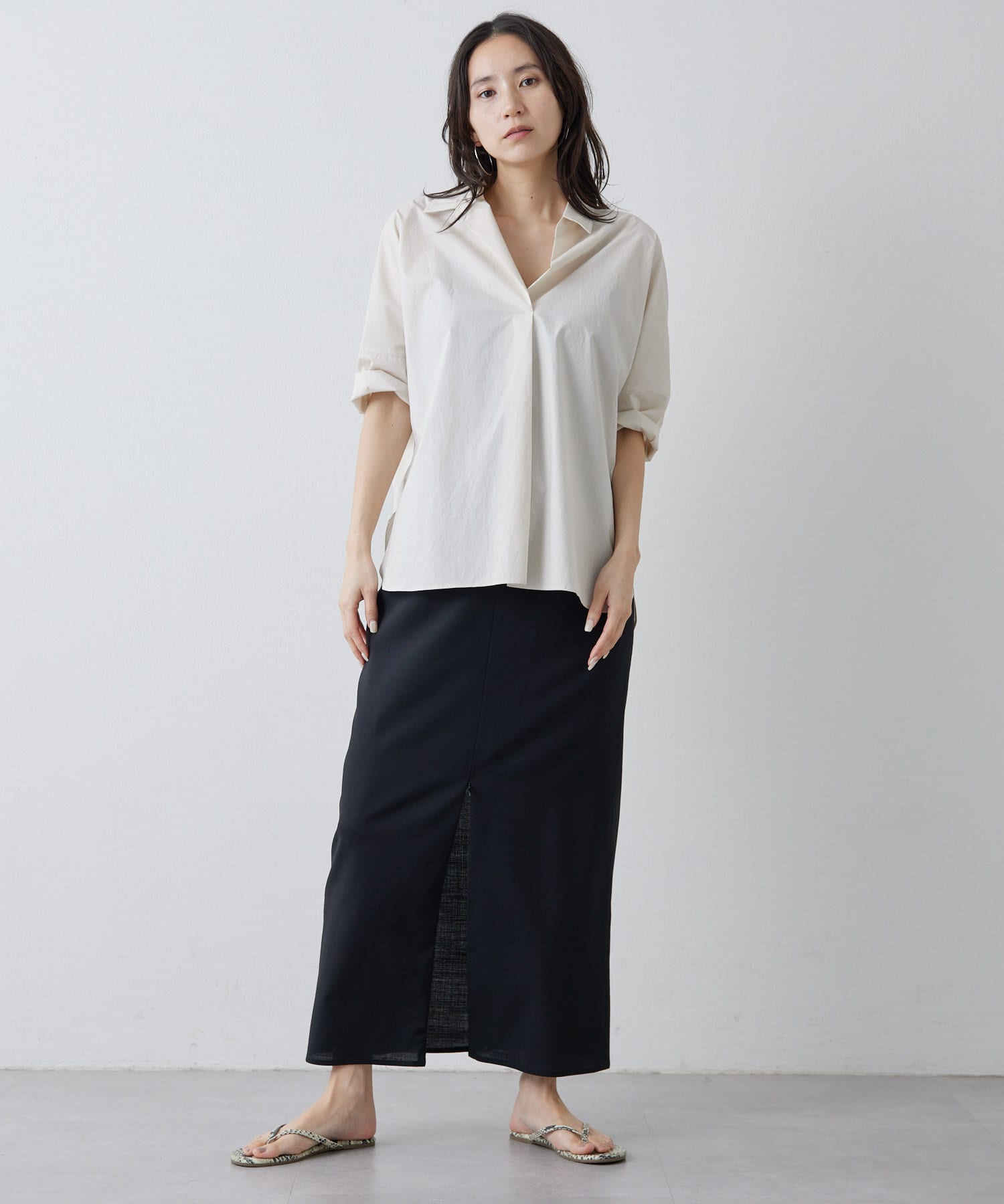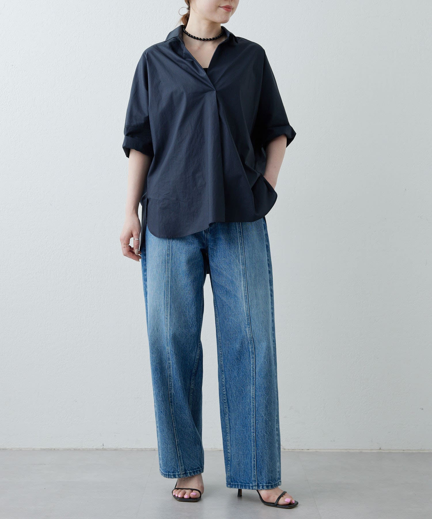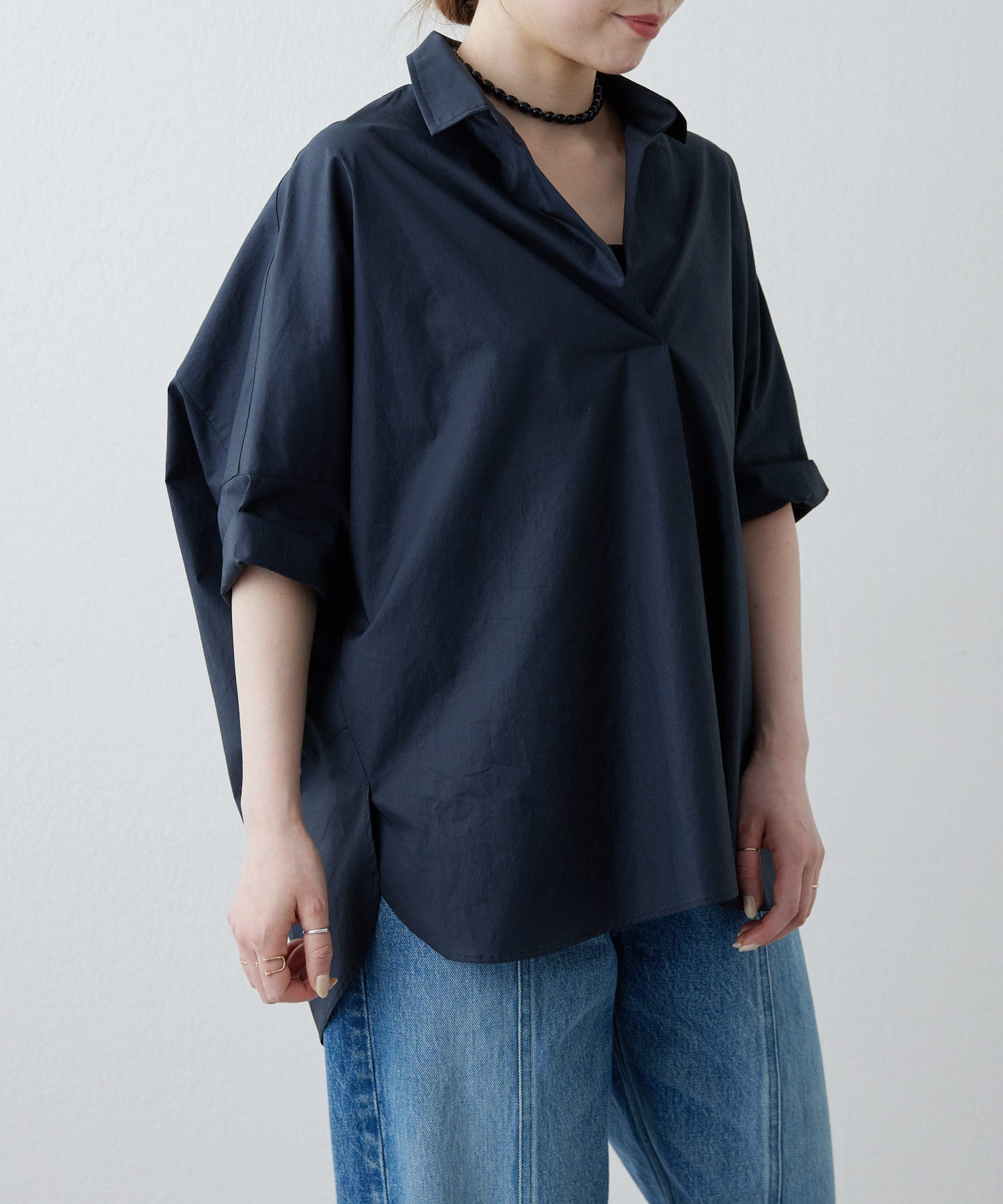 スキッパー仕様でデコルテを美しく魅せてくれます。自然と後ろに抜けるようなデザインで着るだけでこなれ見えします。