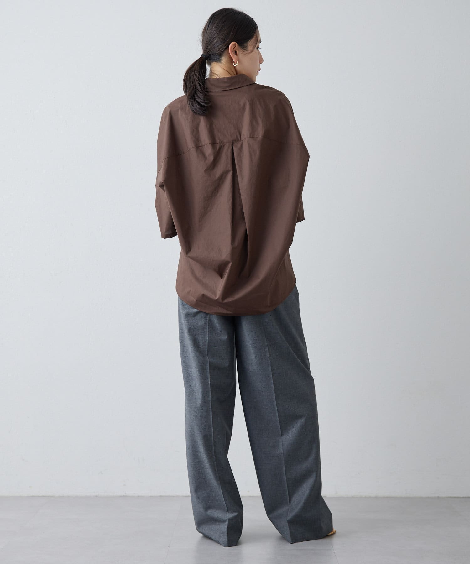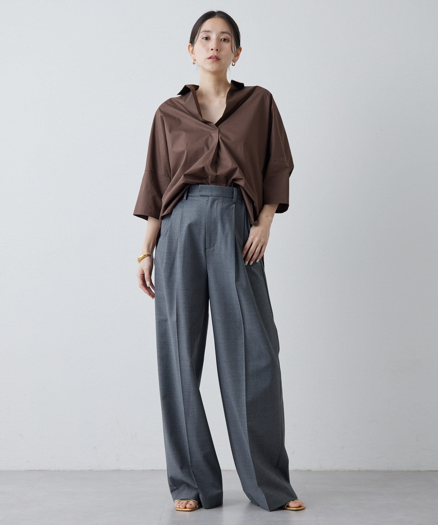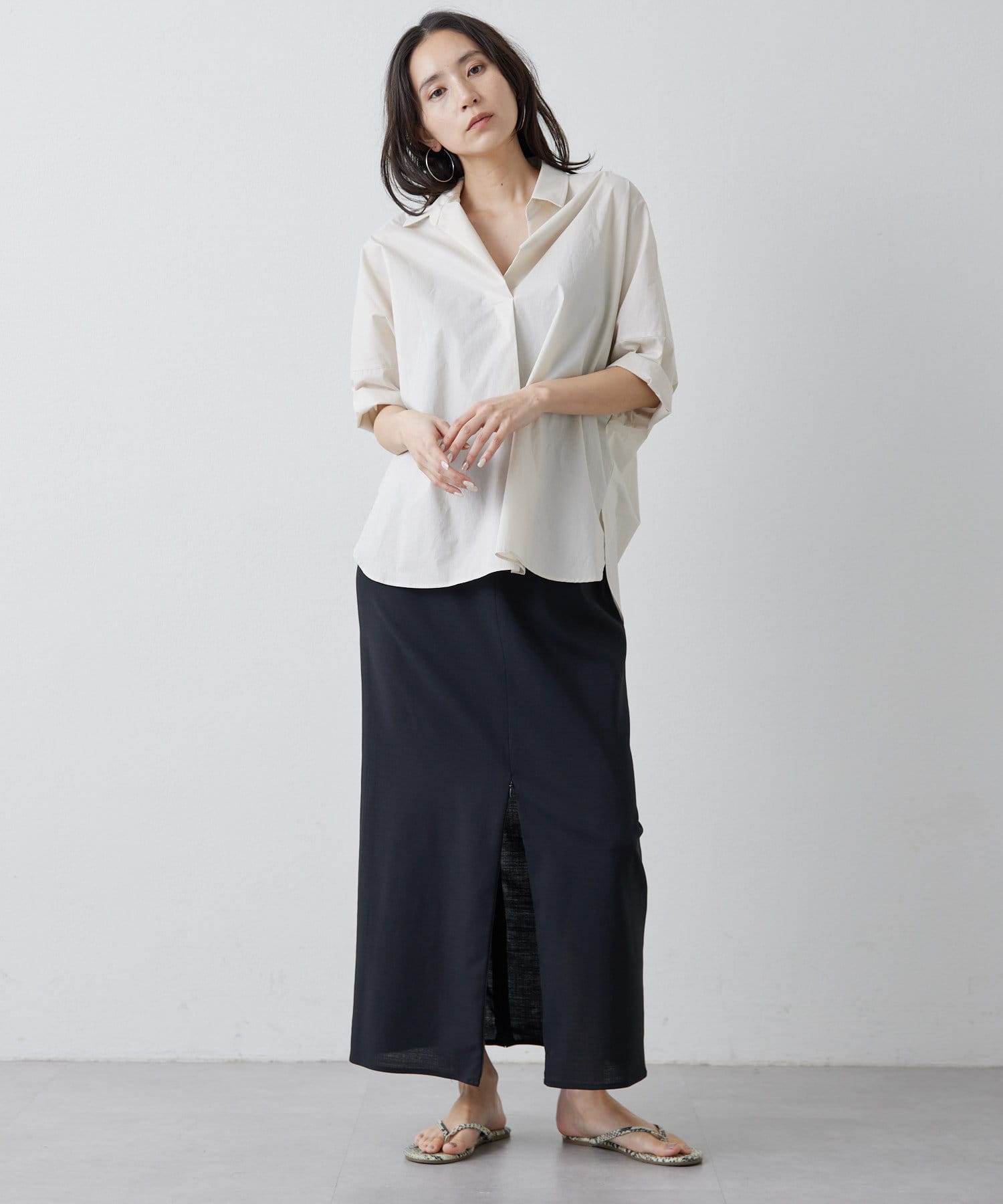 スキッパー仕様でデコルテを美しく魅せてくれます。自然と後ろに抜けるようなデザインで着るだけでこなれ見えします。