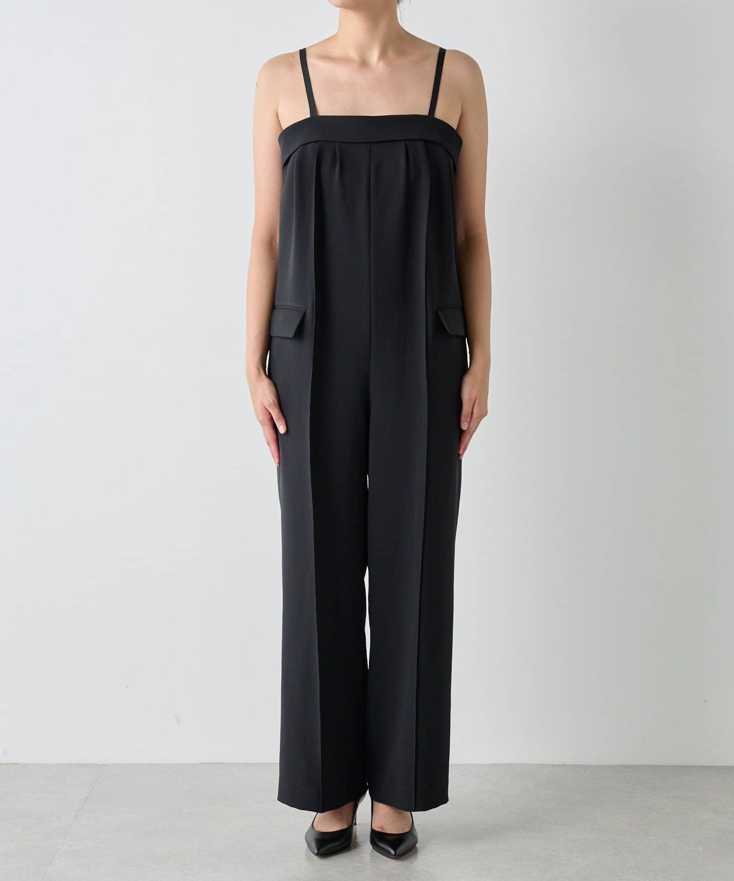 胸元はゆとりがありインナーのレイヤードもしやすいです。肩紐は後ろで調整可能で、私の場合一番短くして着用すると胸元の開きもあまり気にならずに着用でき、丈感はフラットサンダルでも擦れずに履けました。