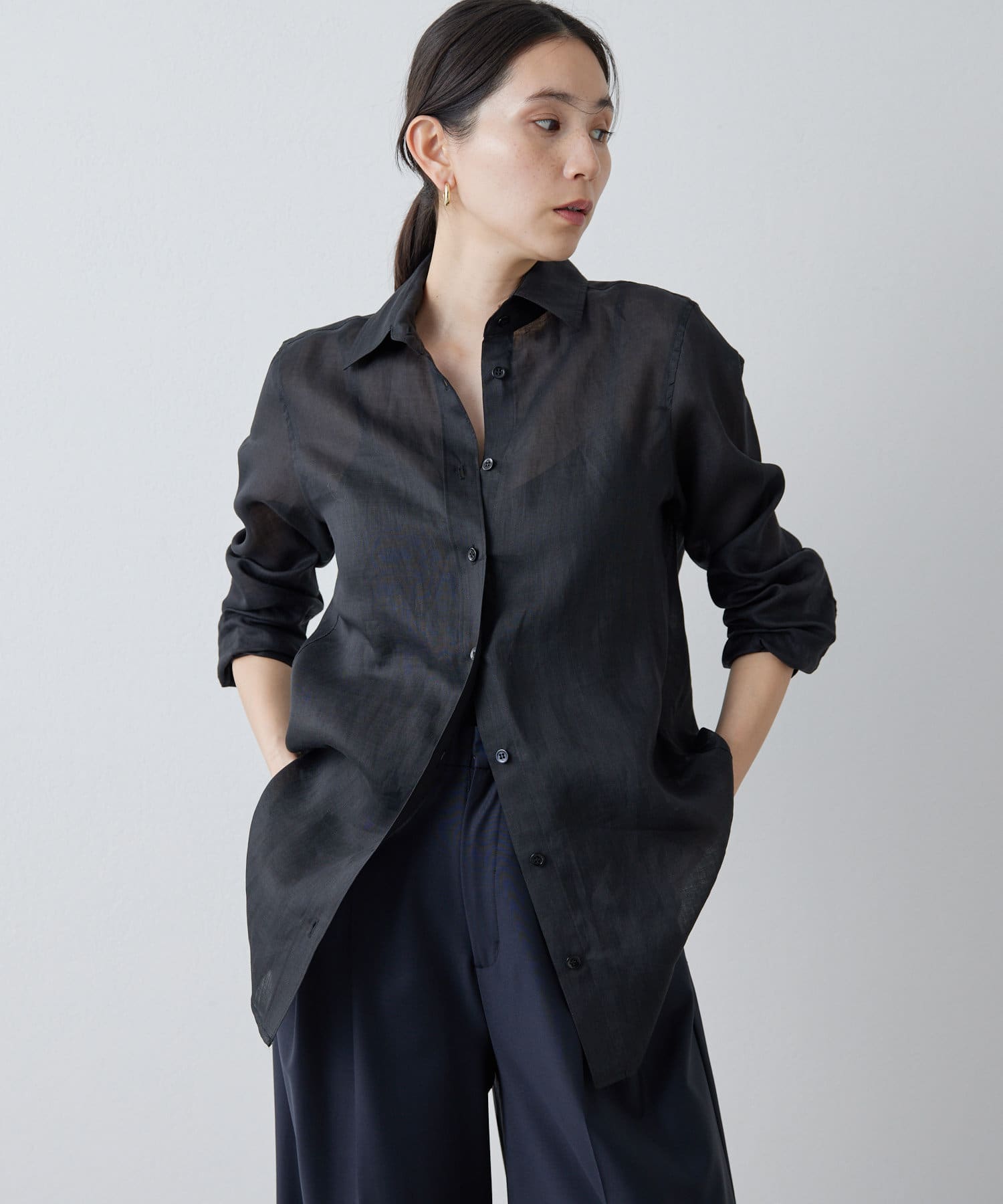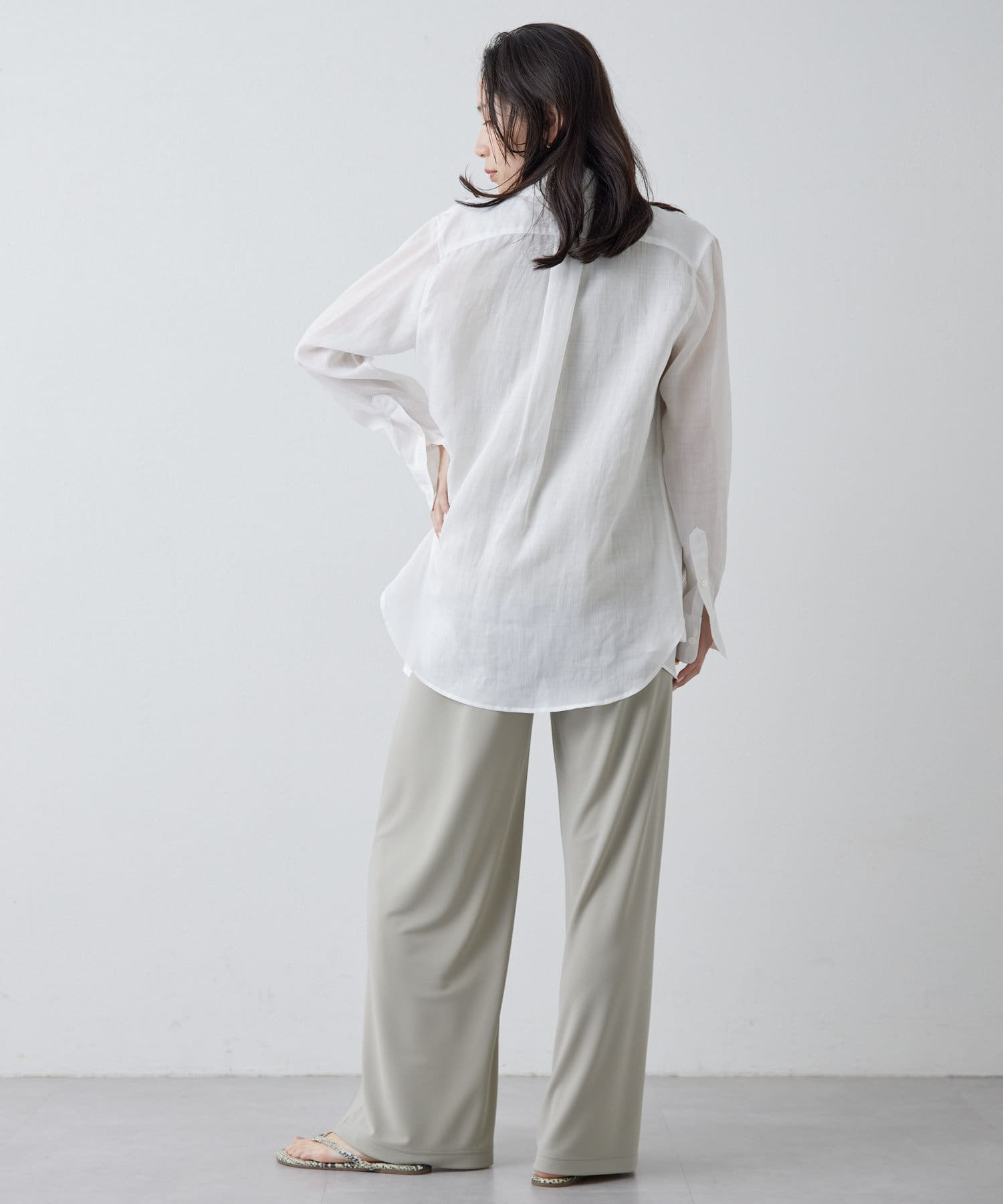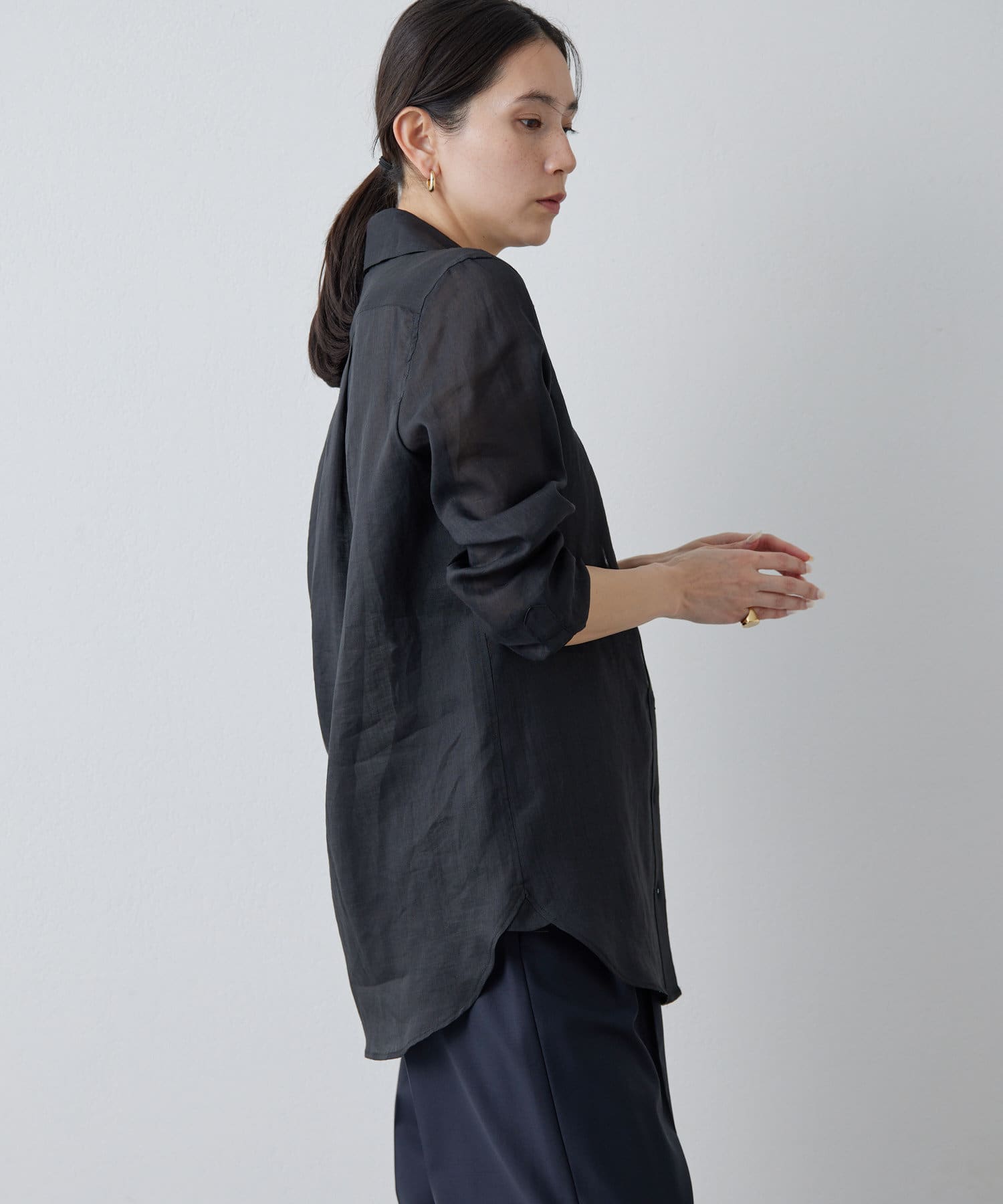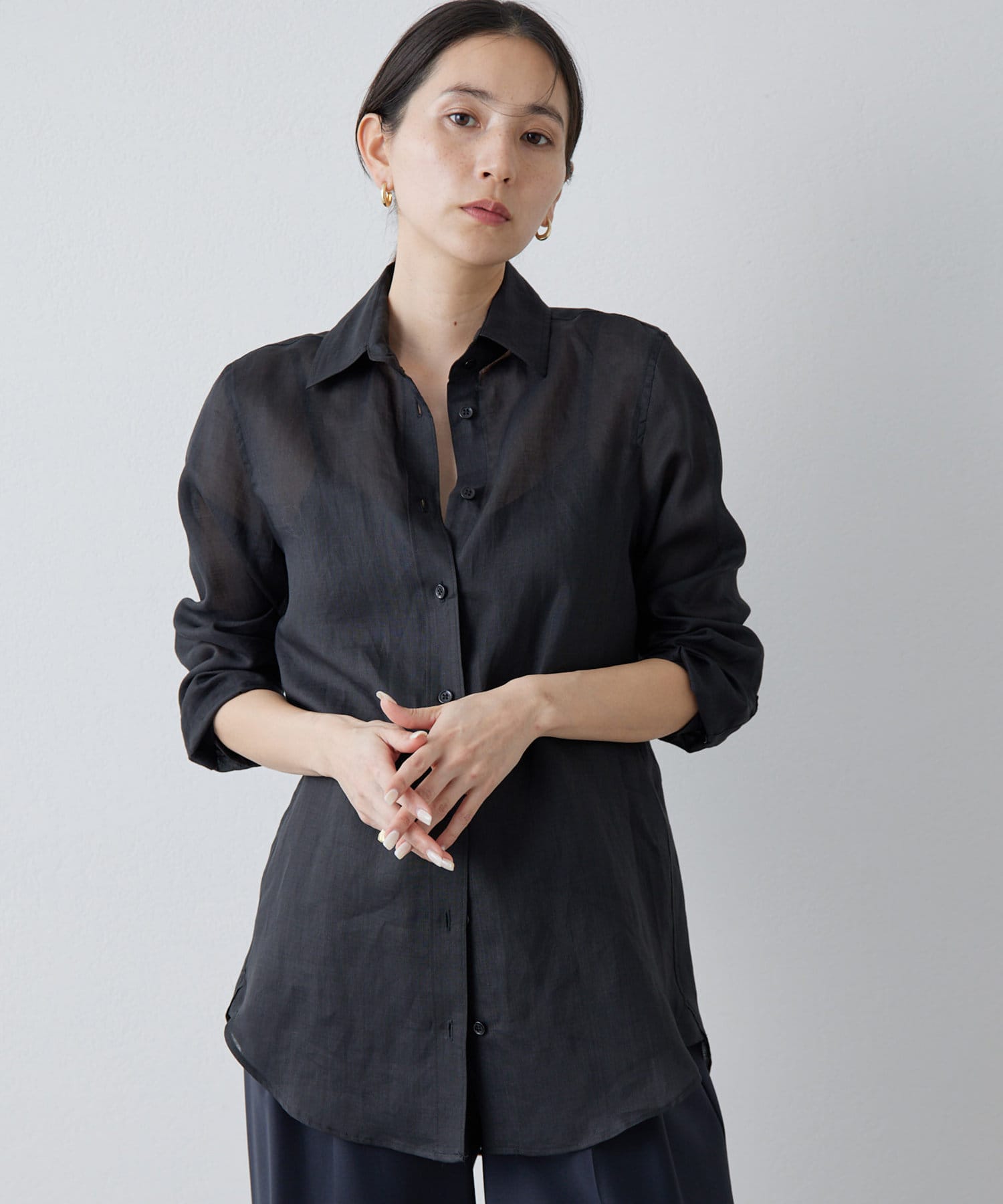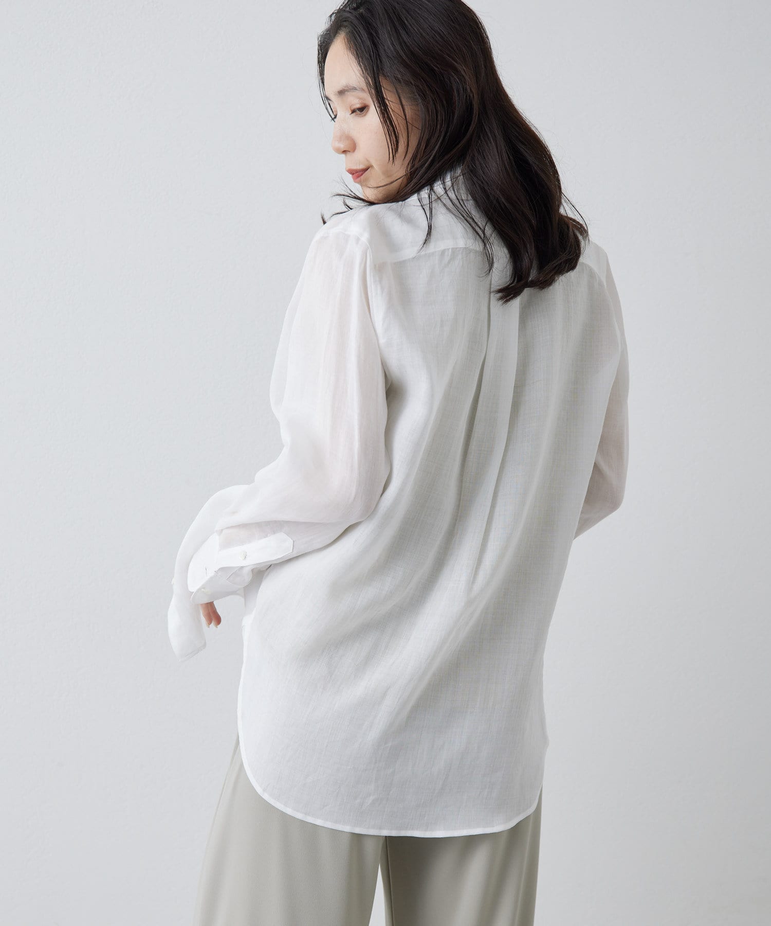 ■すっきりとしたシルエットと、程よく透け感のある風合いが女性らしい雰囲気を演出。