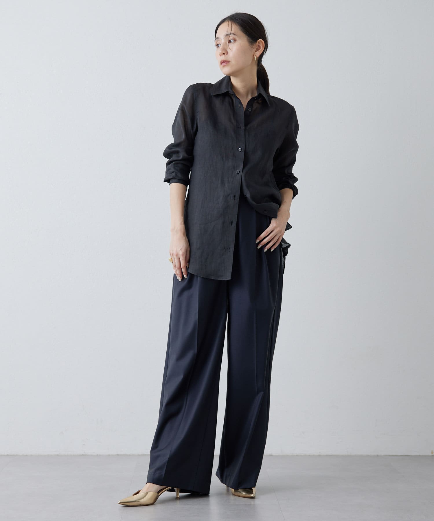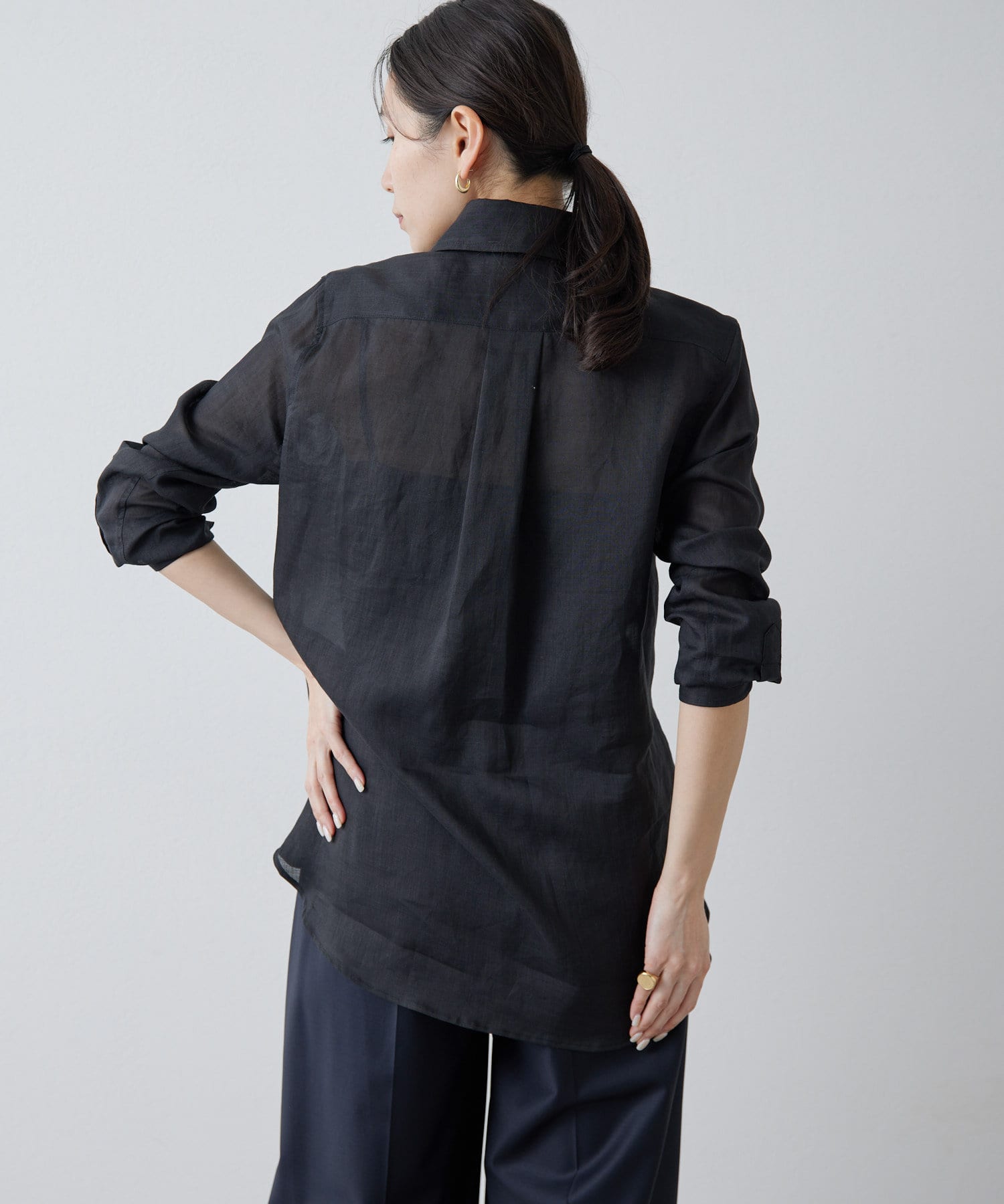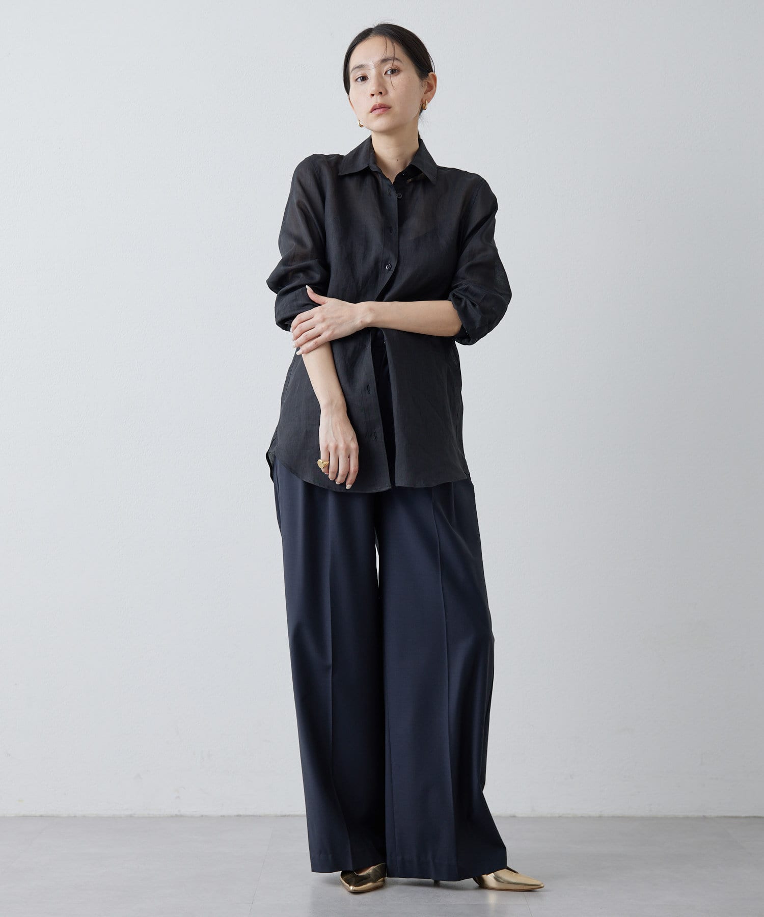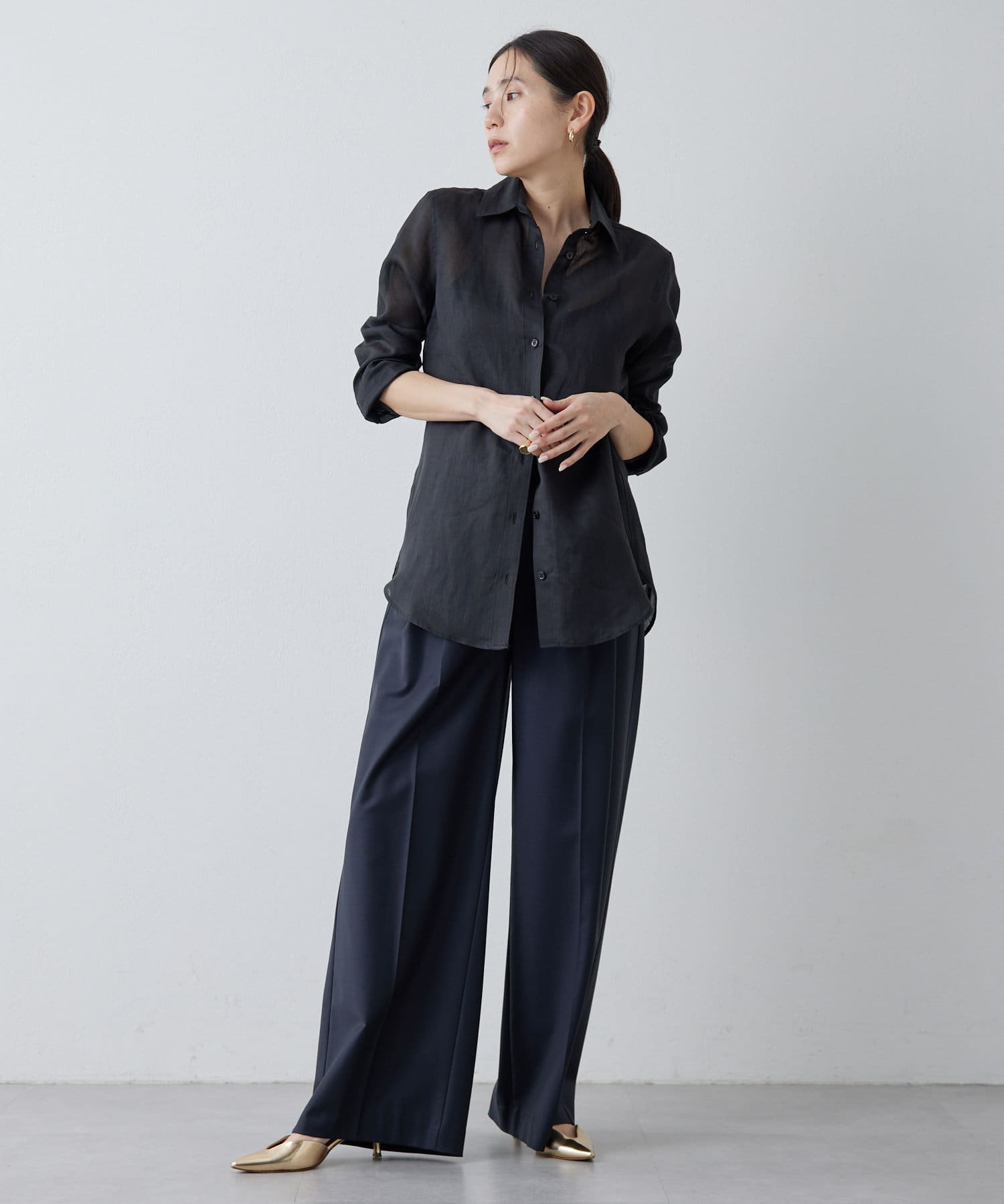 ■すっきりとしたシルエットと、程よく透け感のある風合いが女性らしい雰囲気を演出。