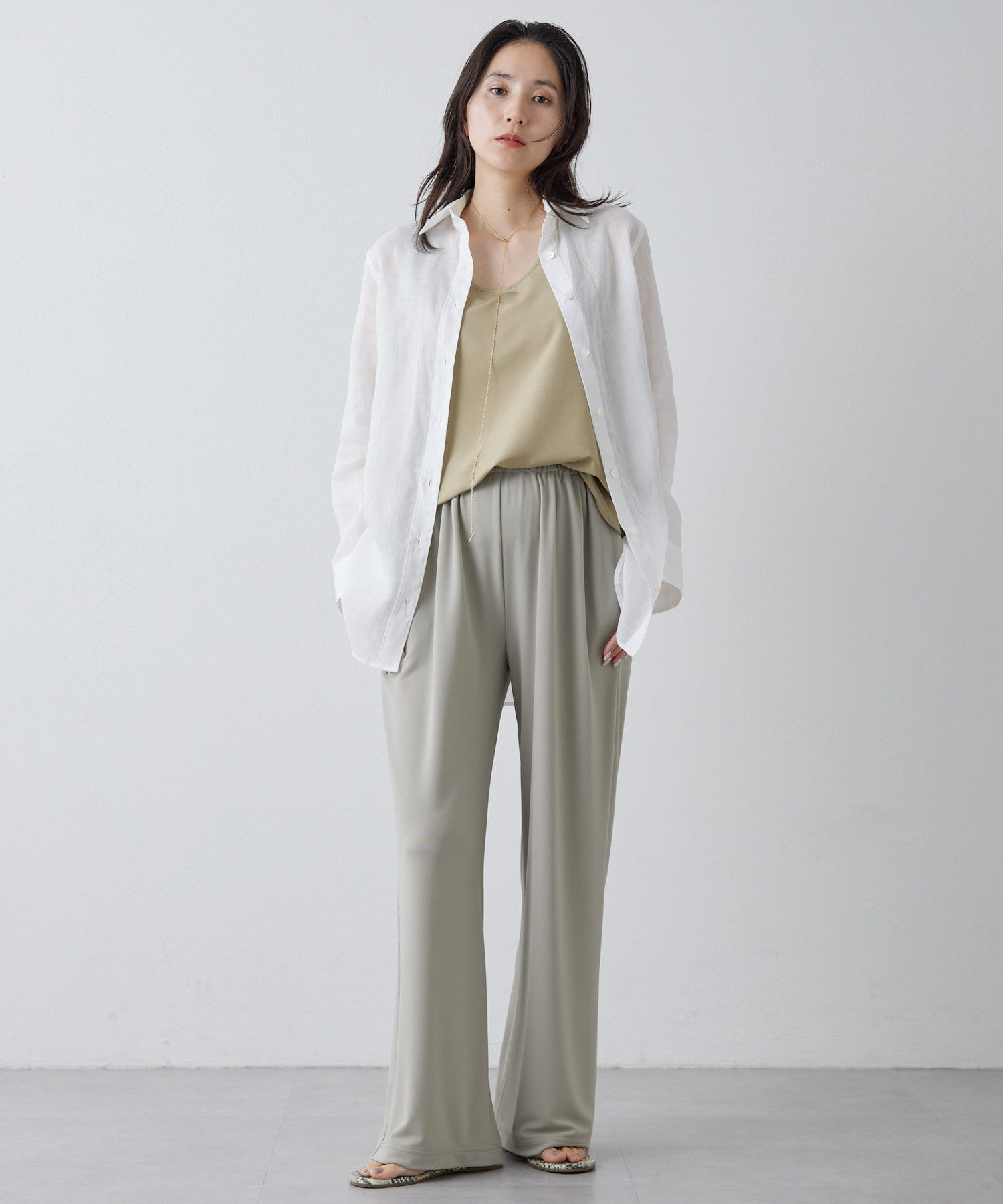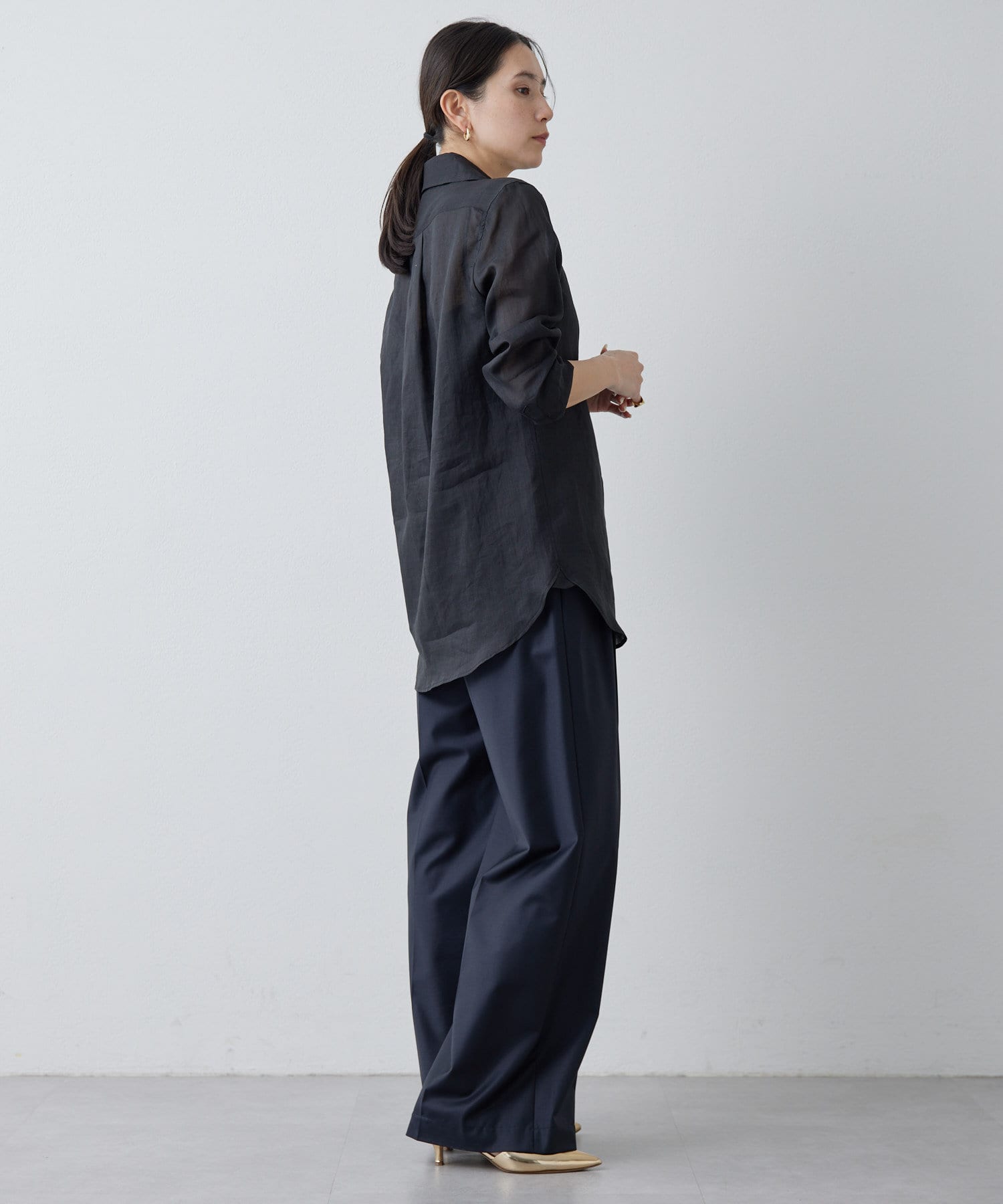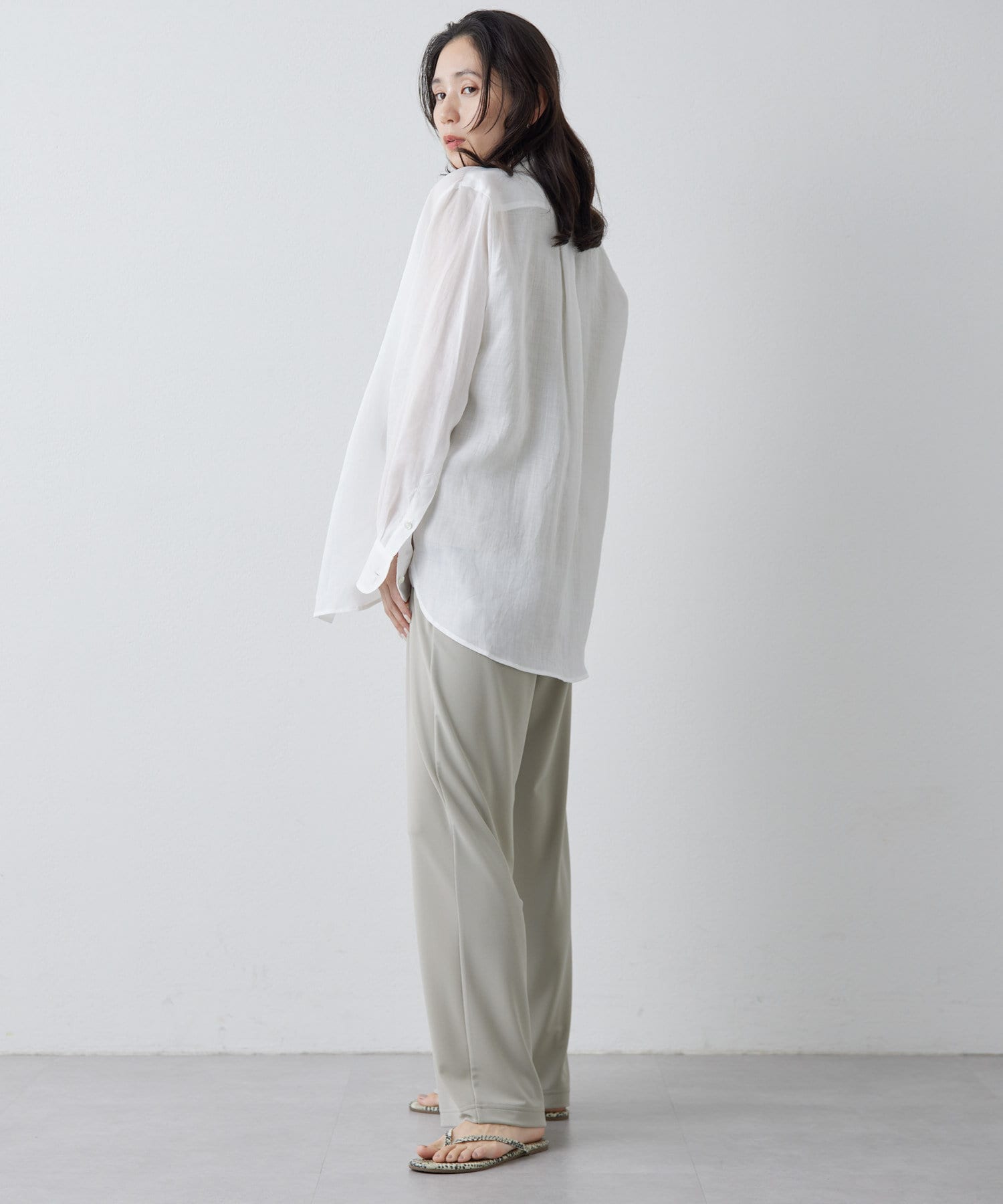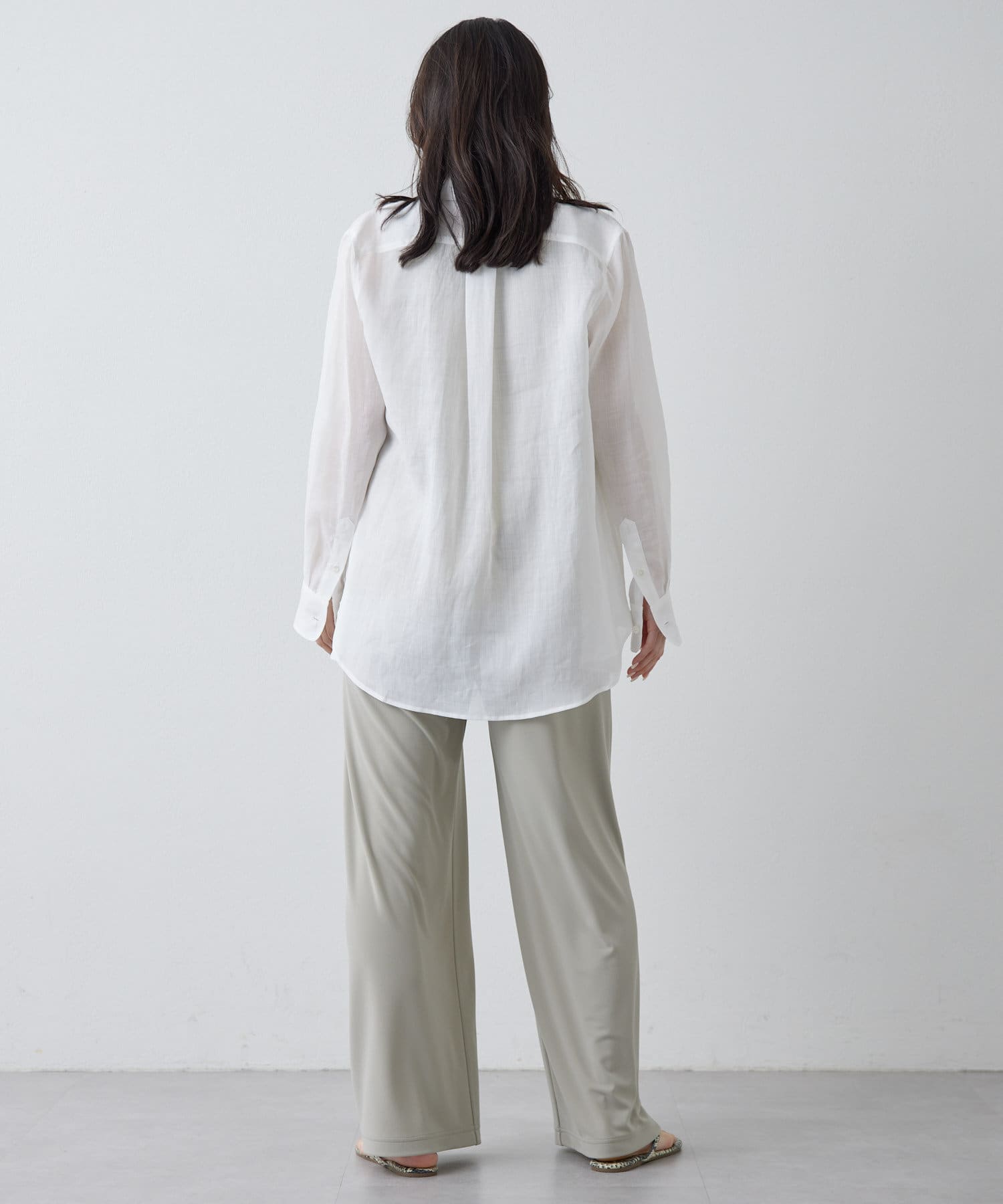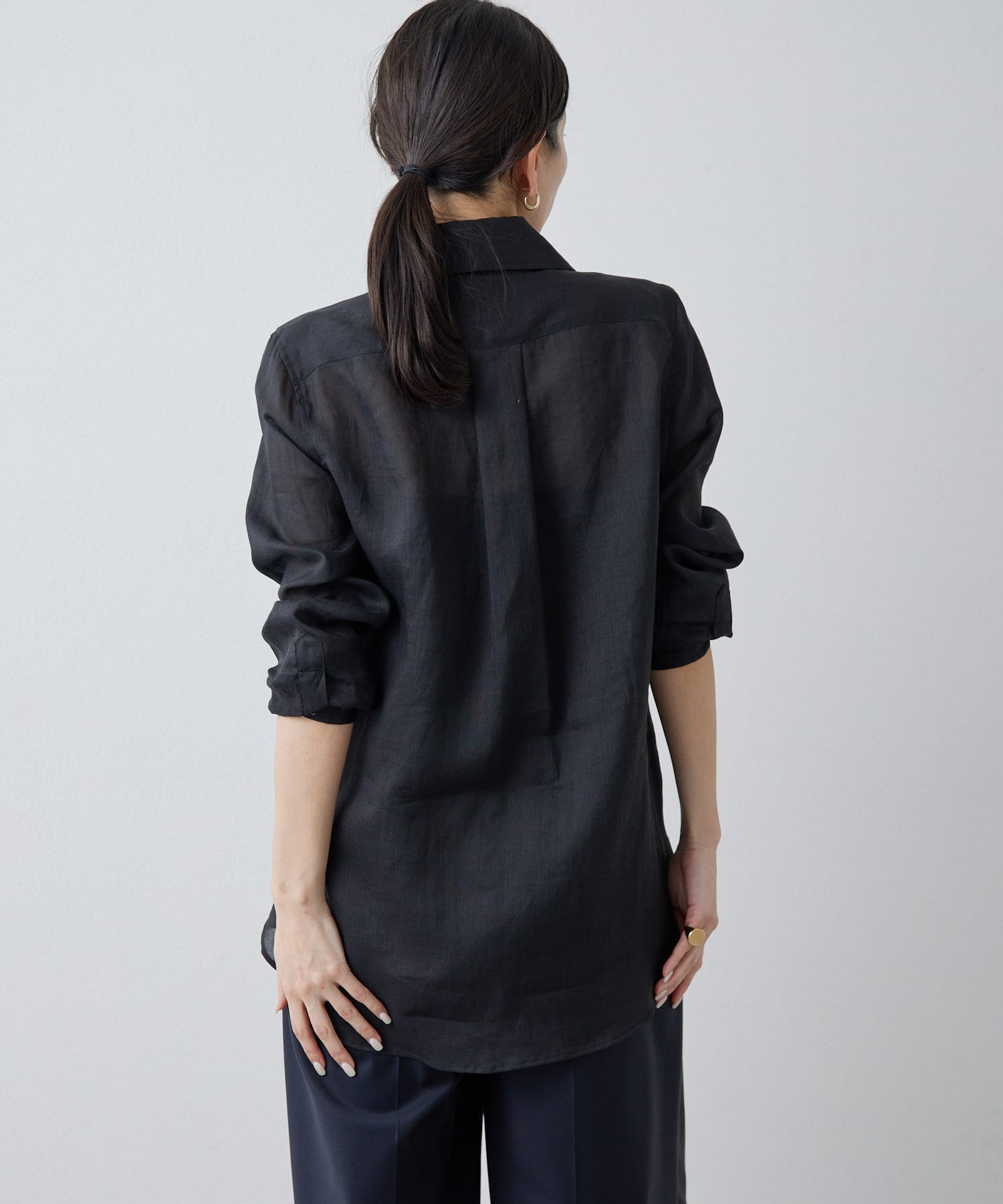 ■すっきりとしたシルエットと、程よく透け感のある風合いが女性らしい雰囲気を演出。