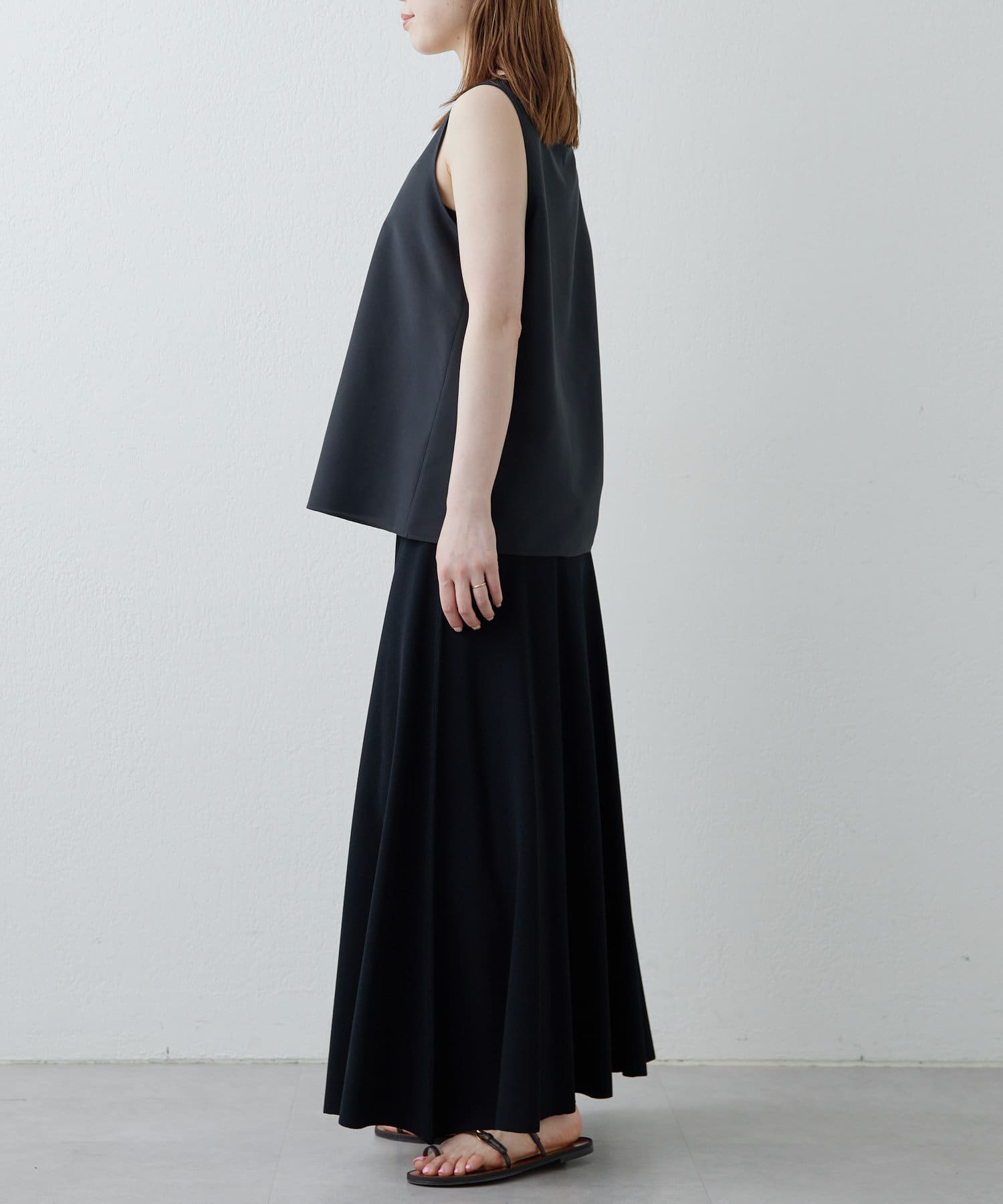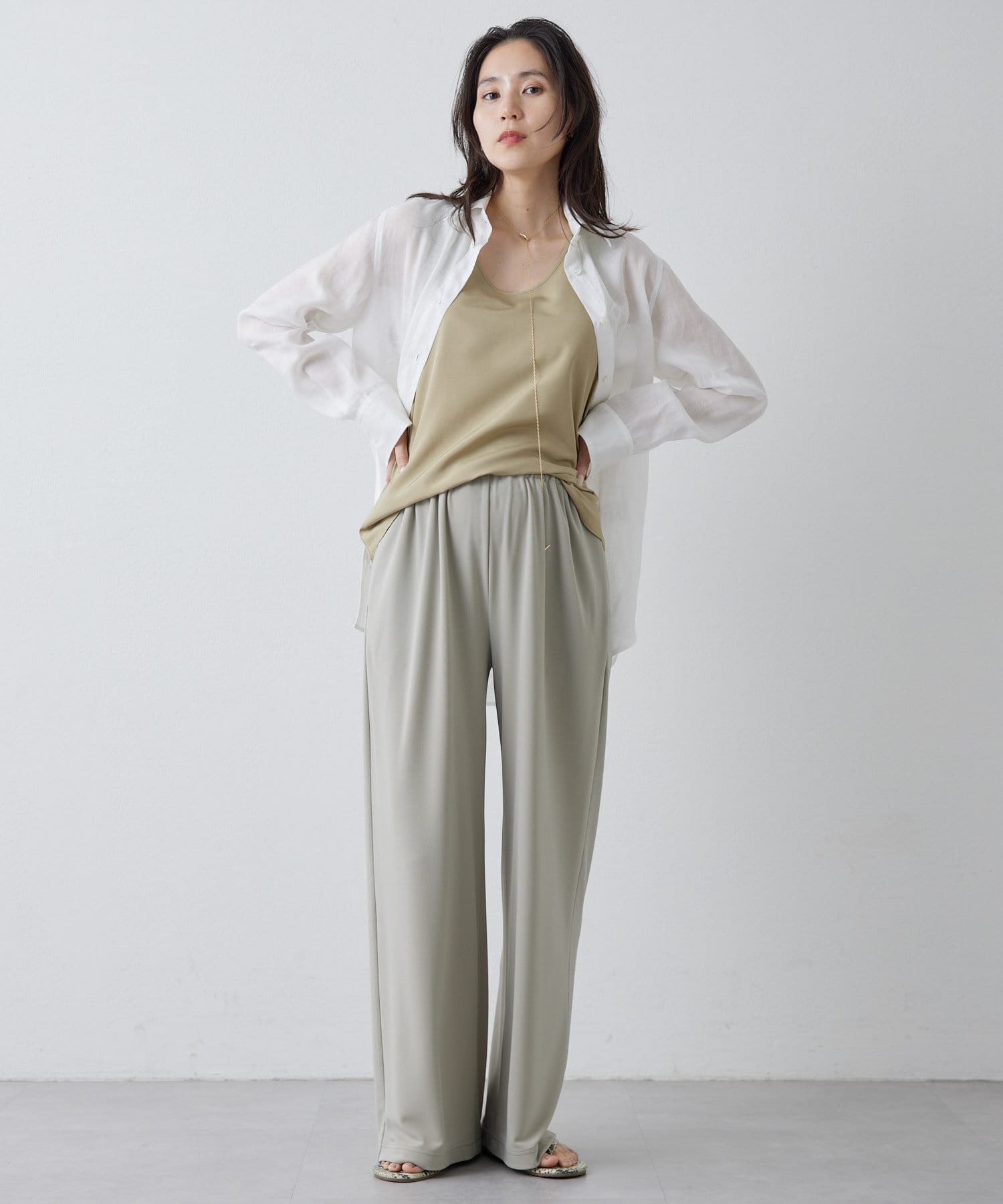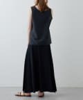 ■ツルツルとした素材感で上にシャツやカーディガンを羽織ても着膨れず、すっきりと着こなせるのも◎。