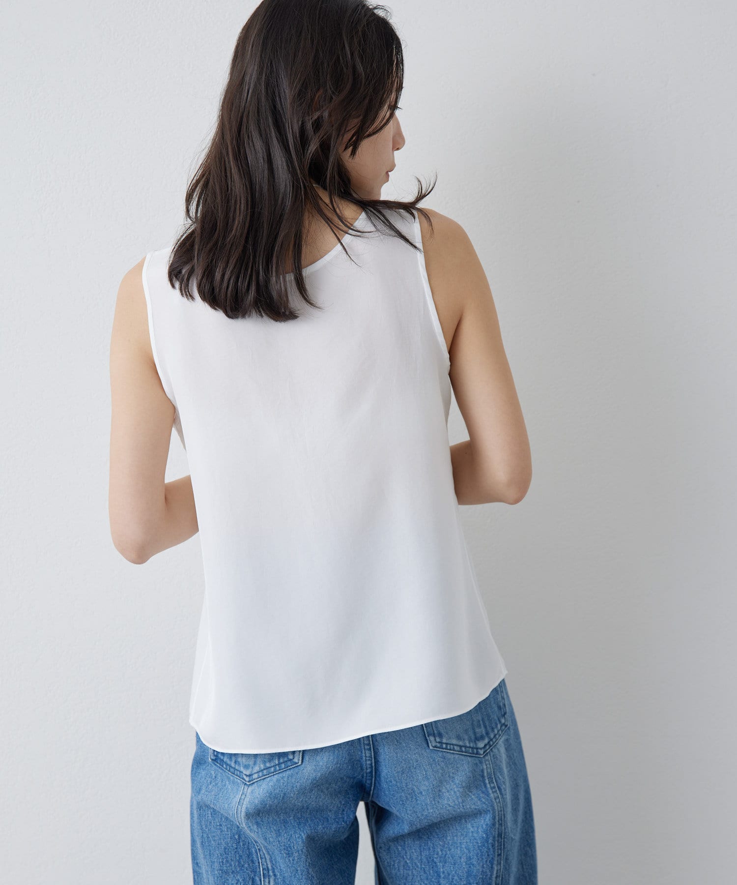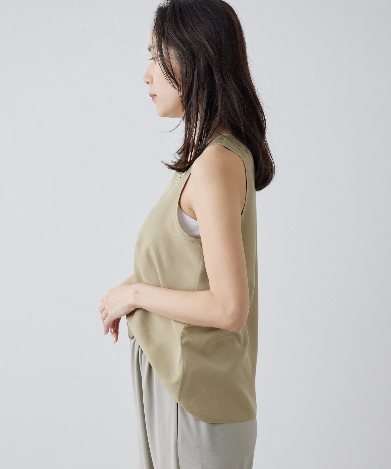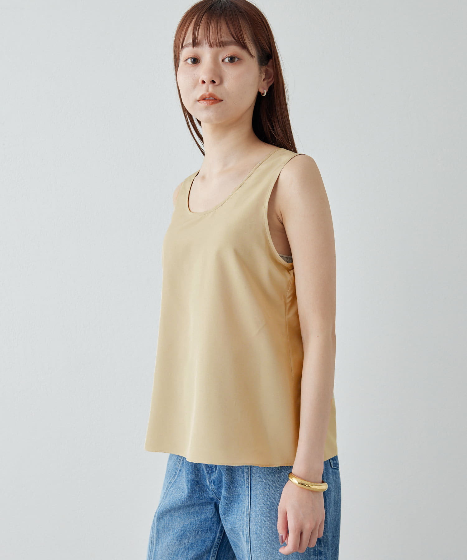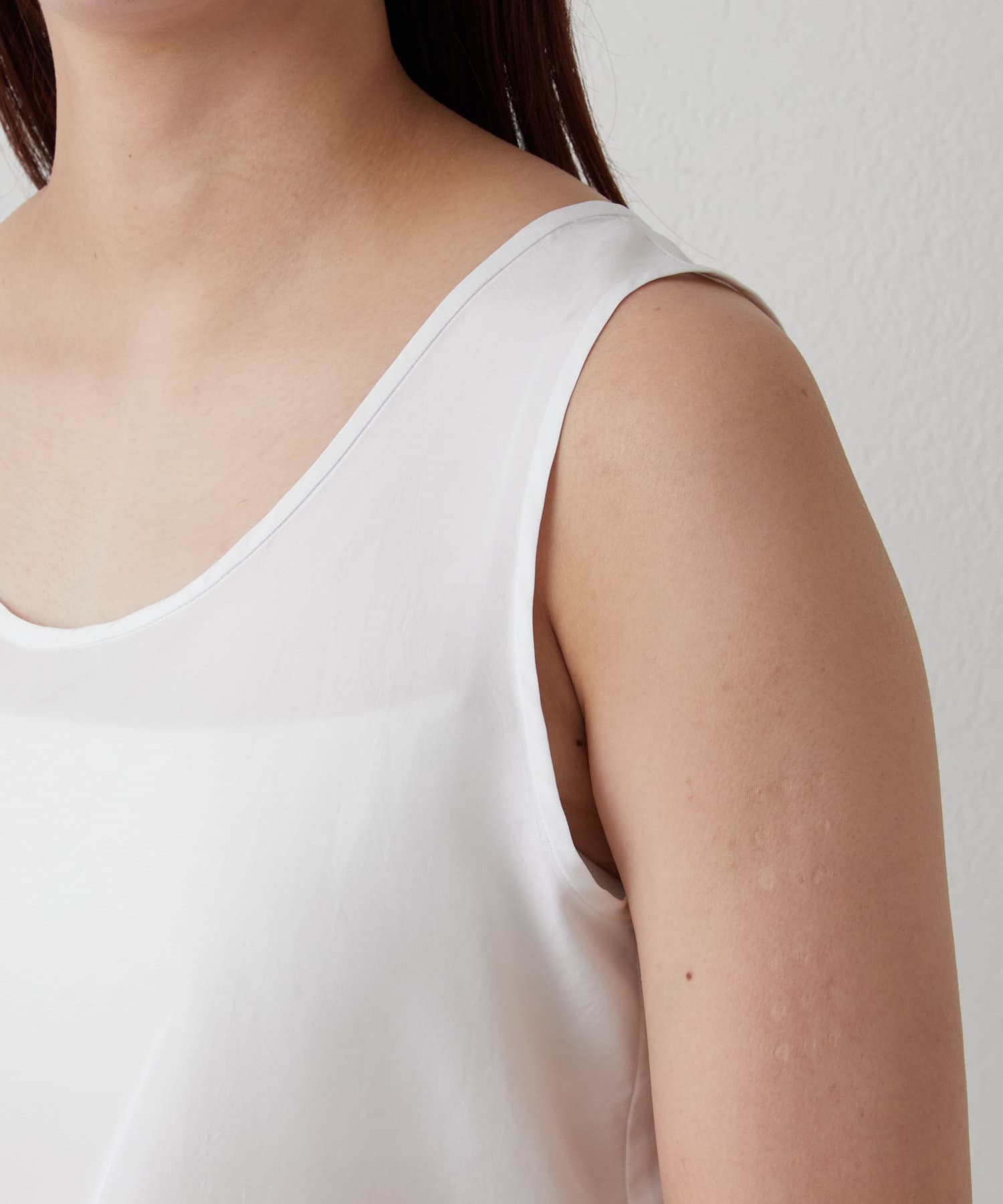 シルクライクな風合いが上品な、大人のサテンタンク
