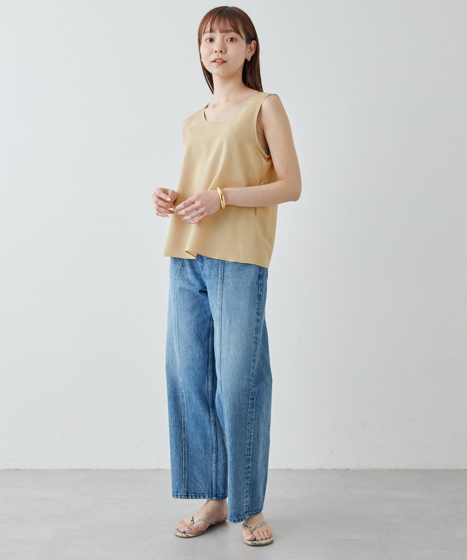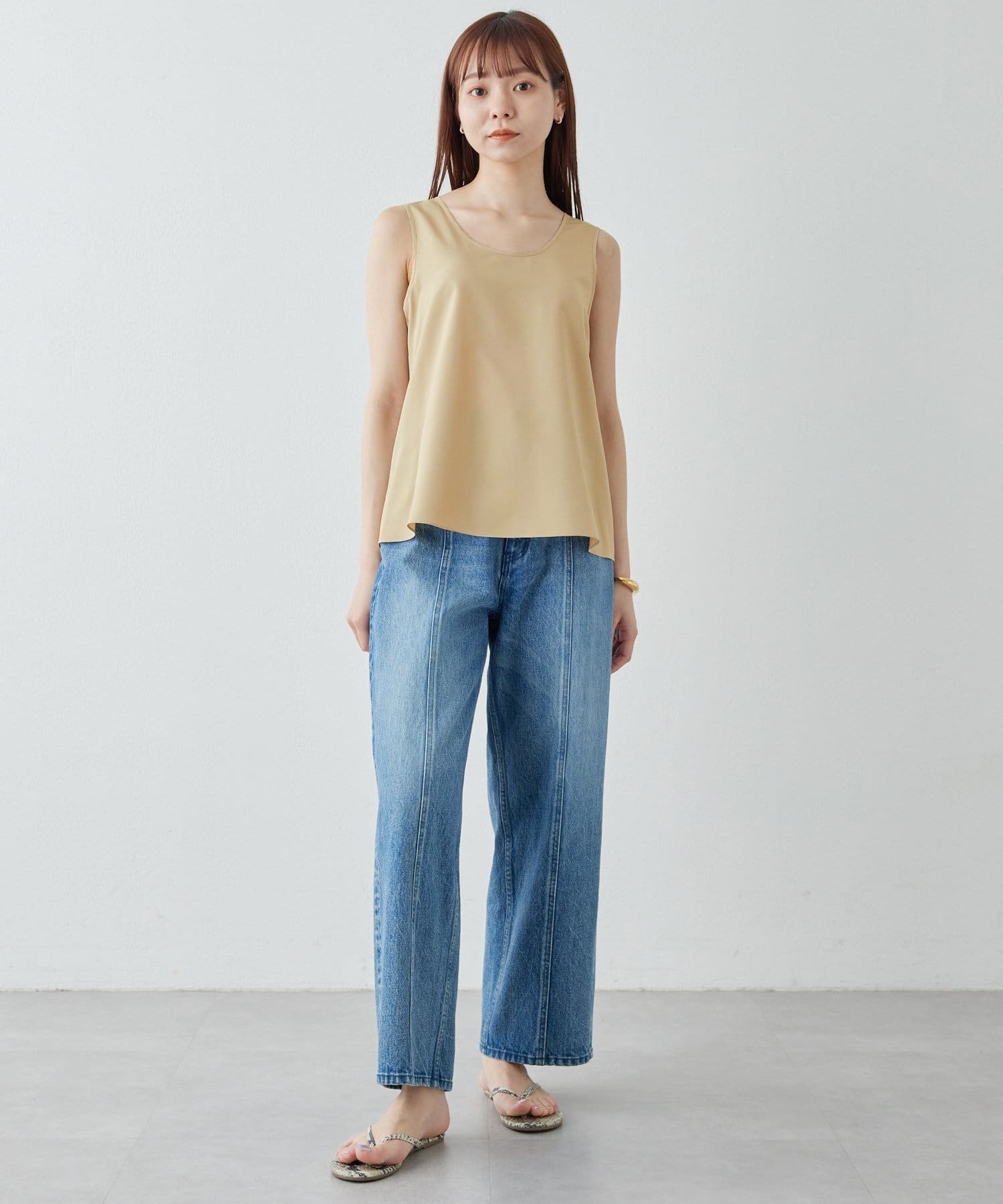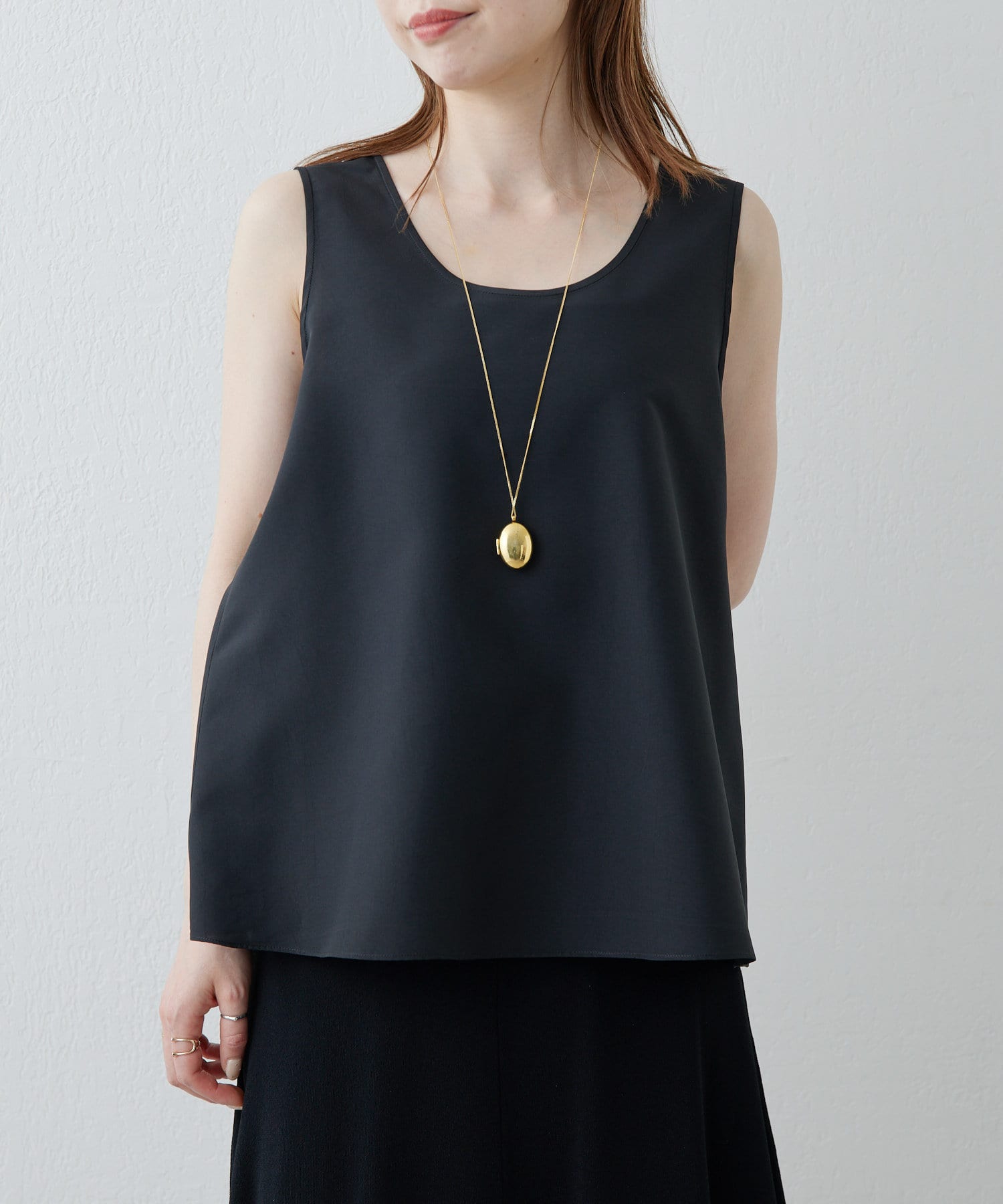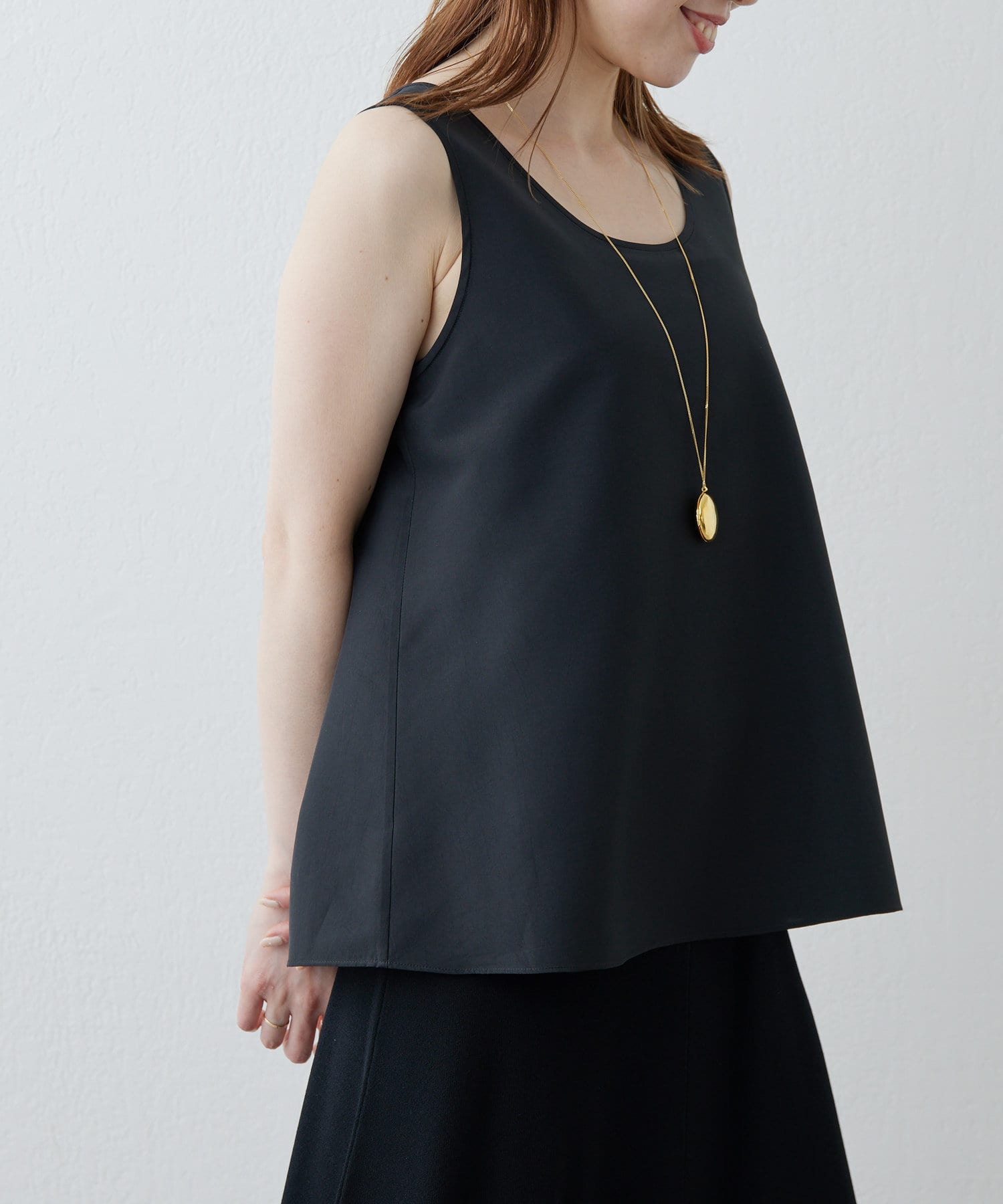 シルクライクな風合いが上品な、大人のサテンタンク