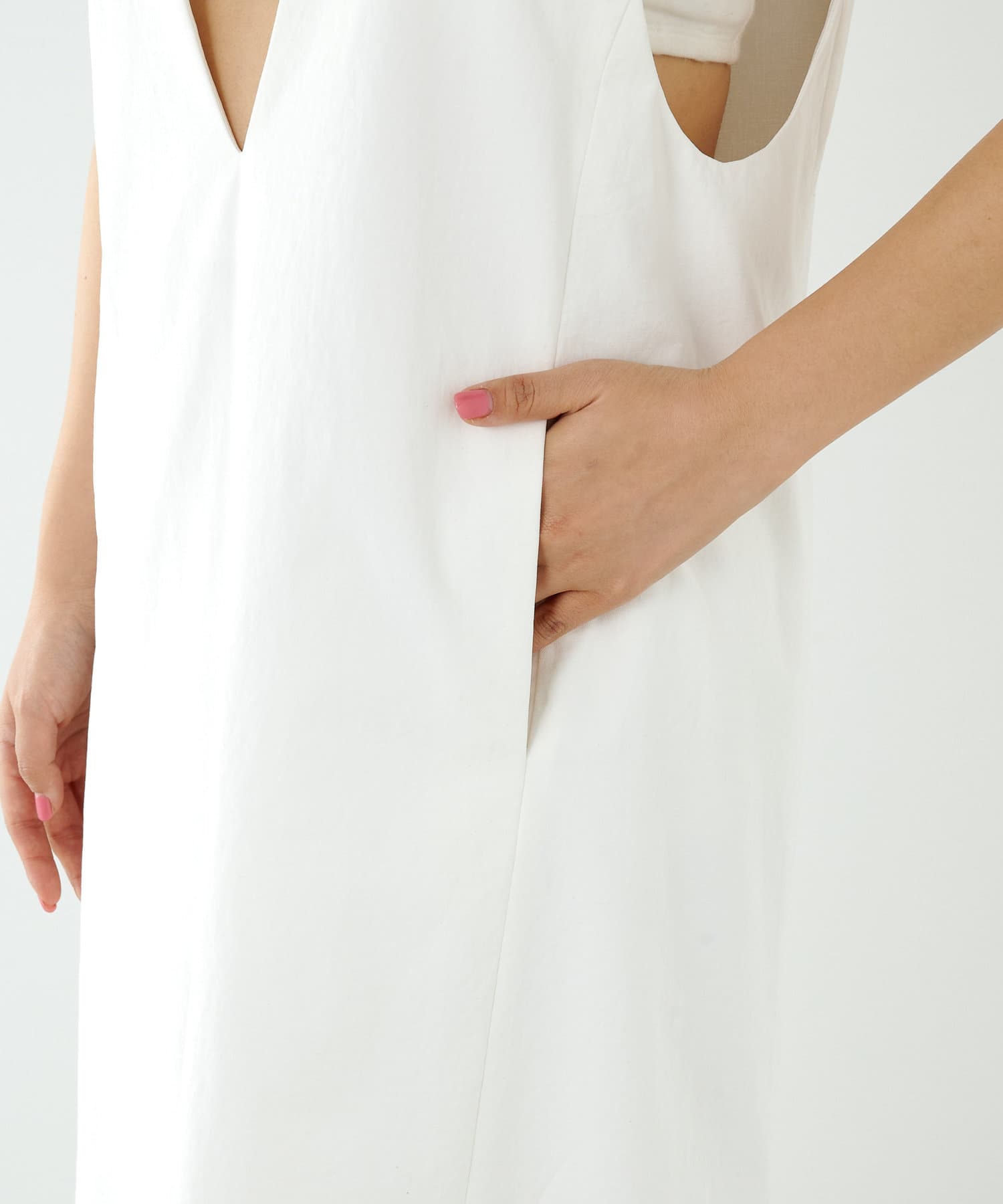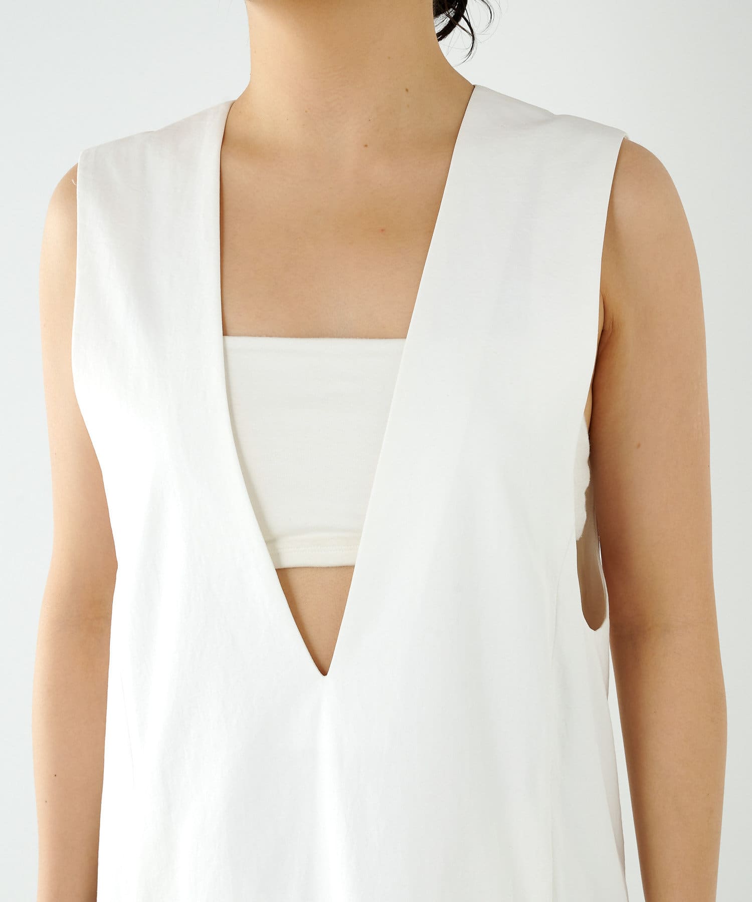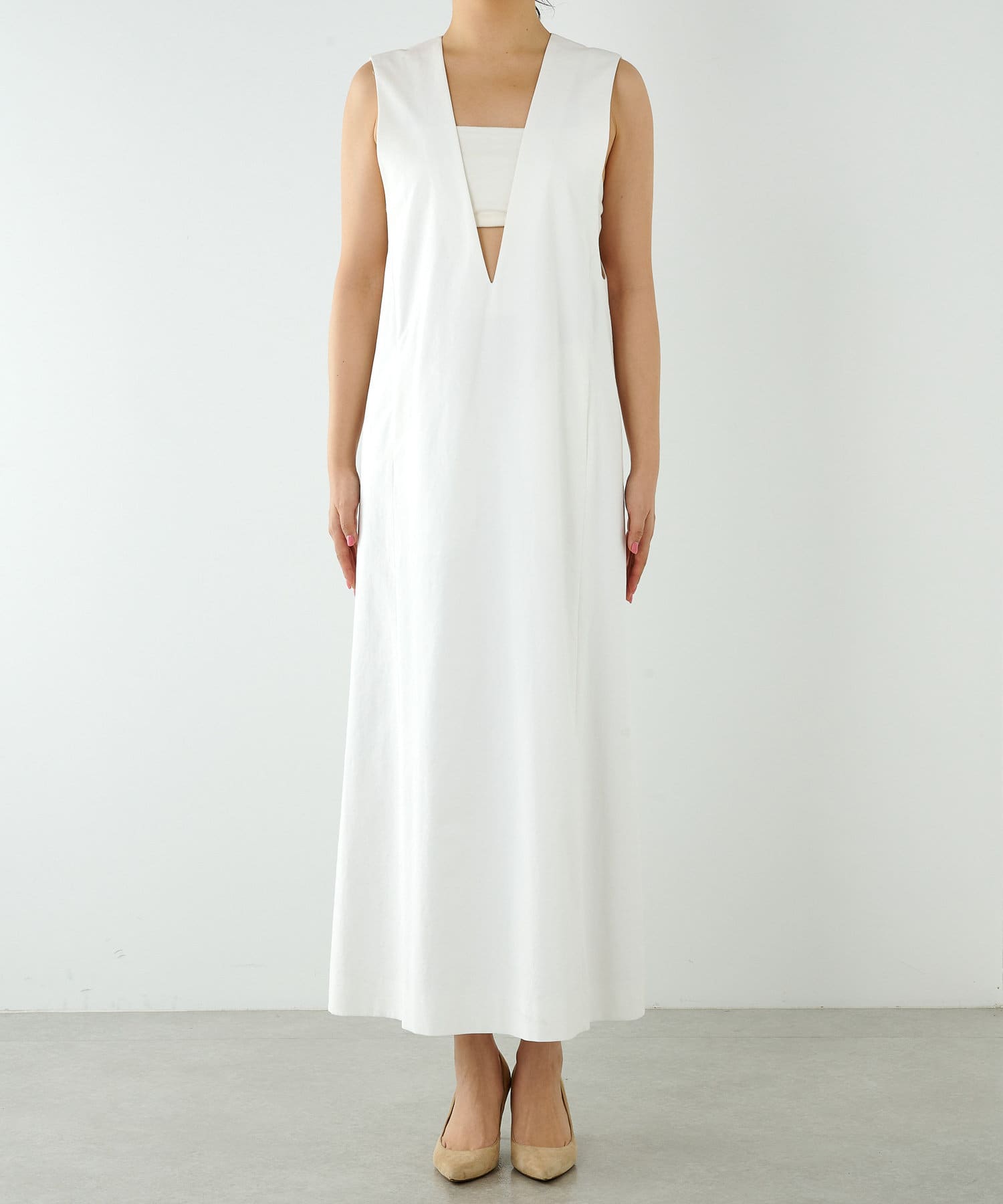 ■深めのVネック開きが特徴的なノースリーブワンピース。