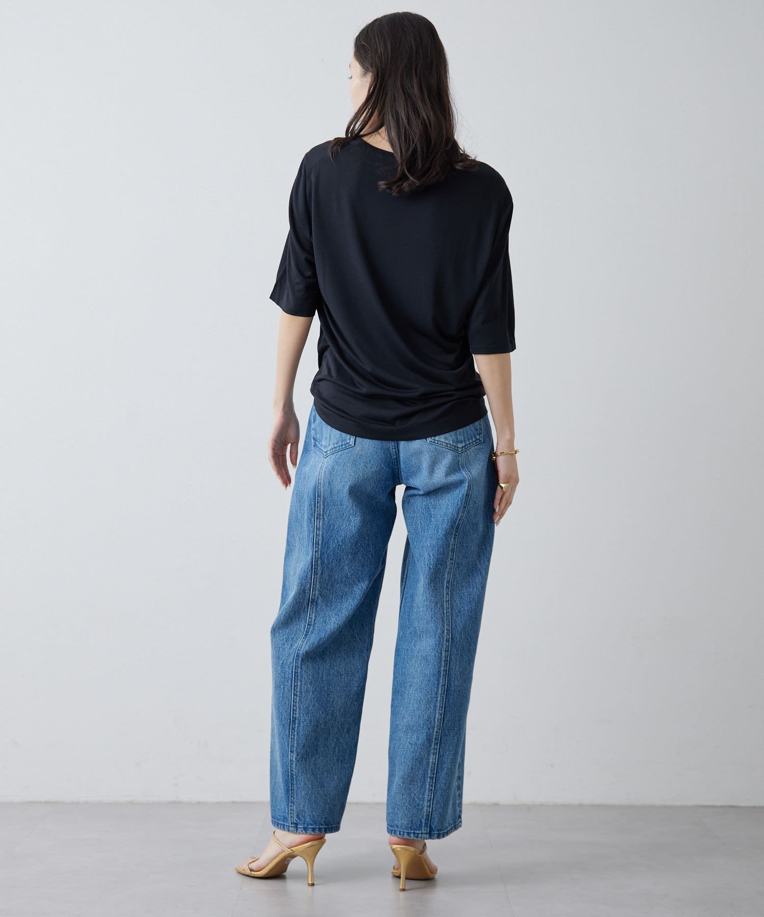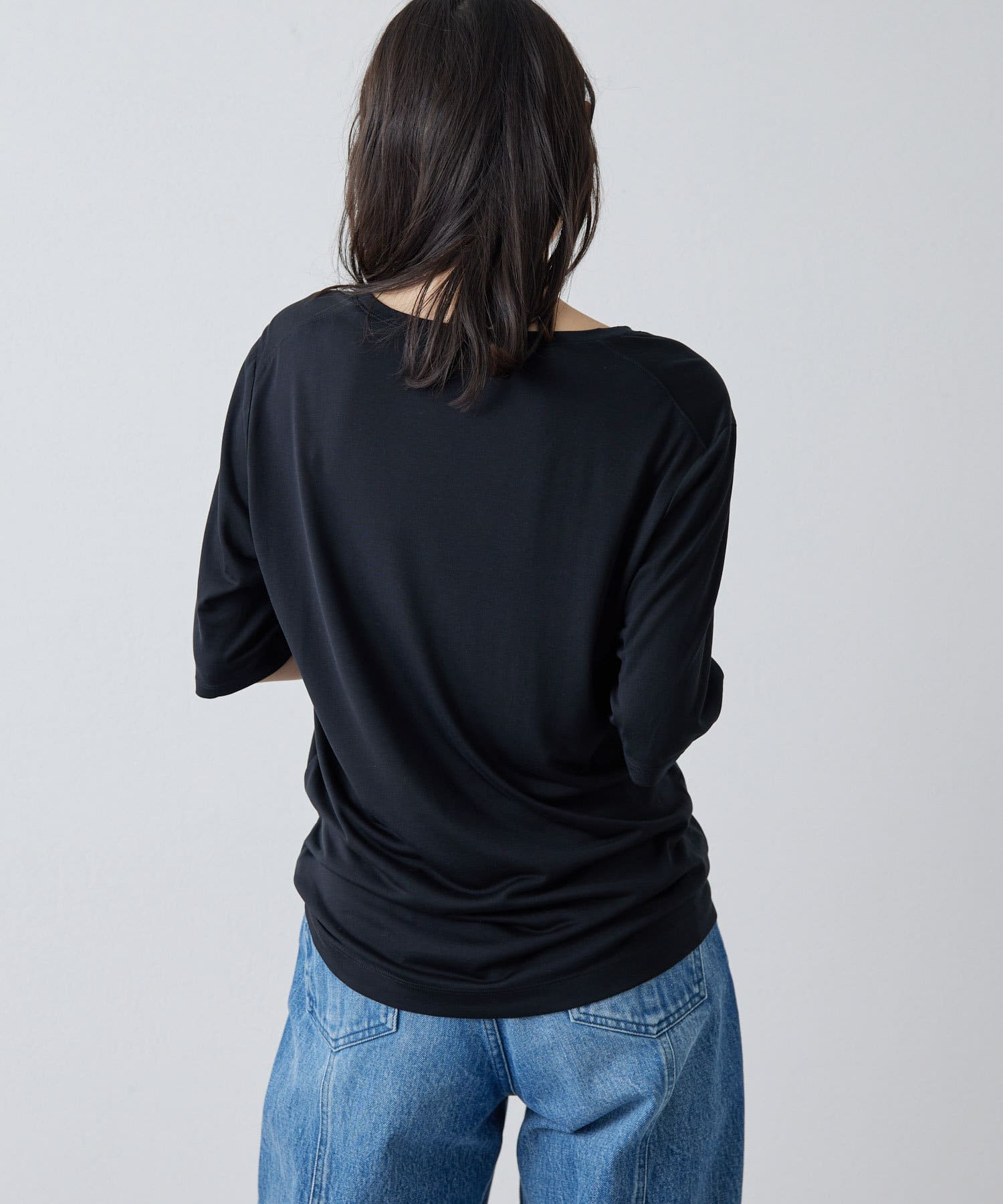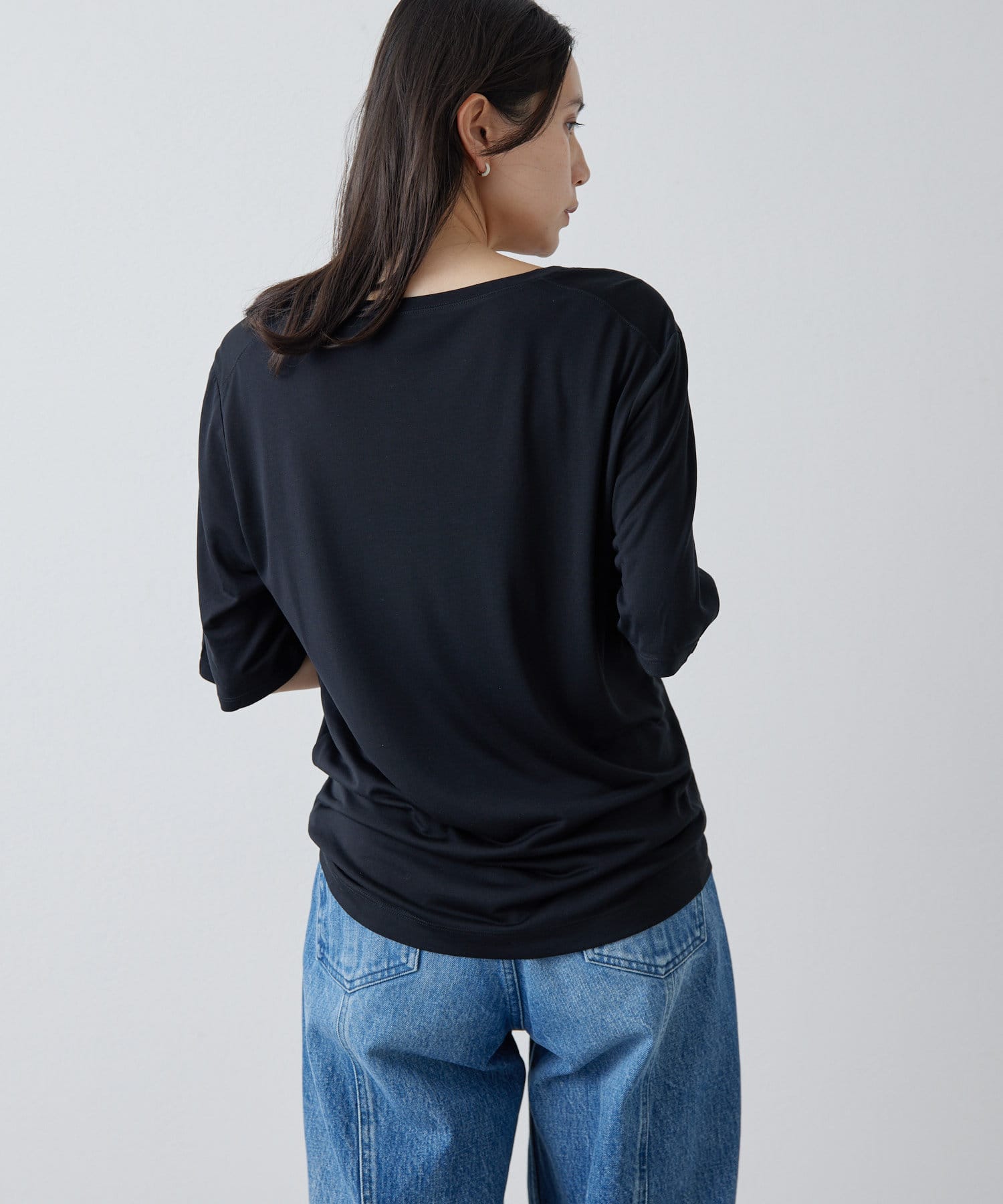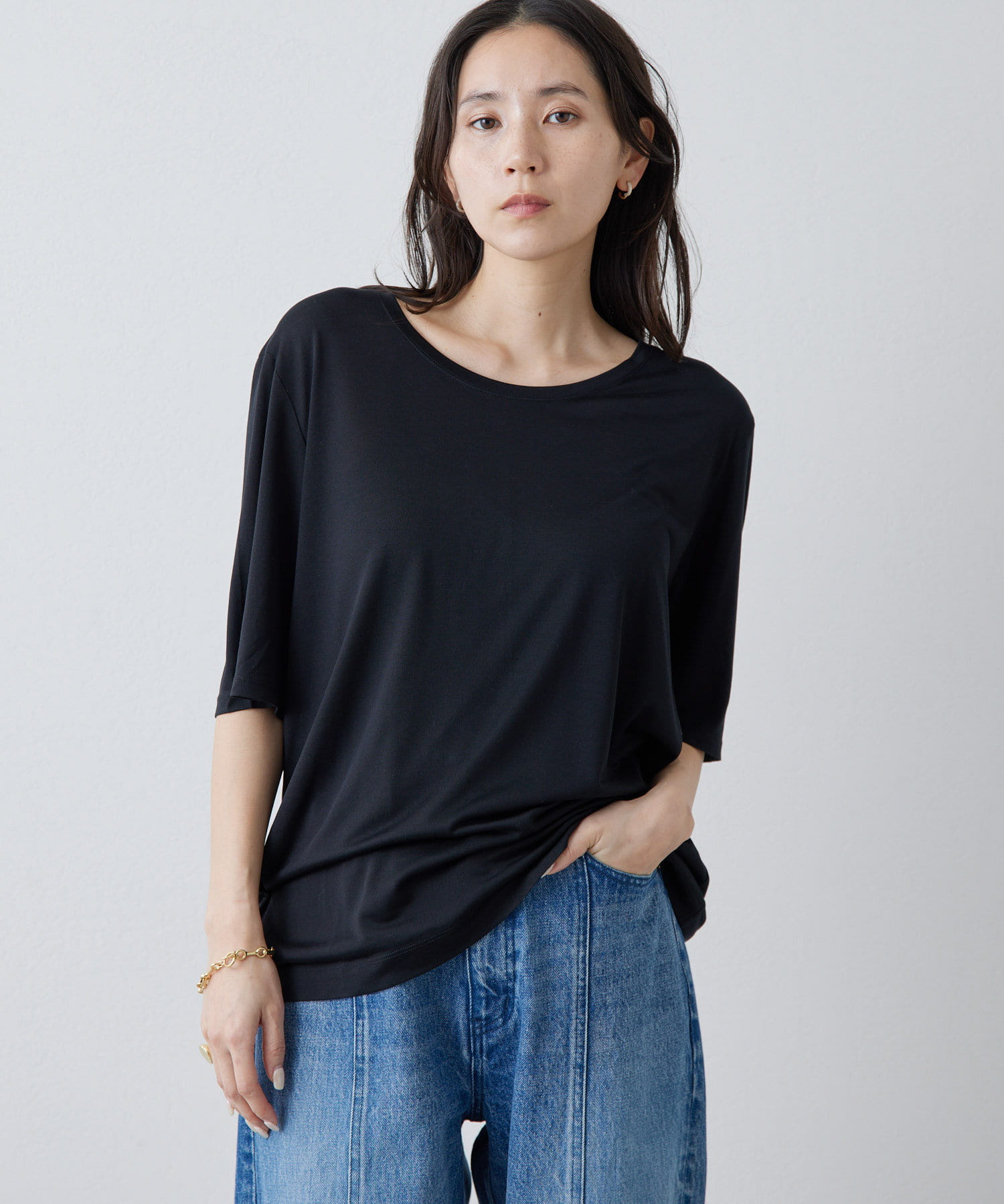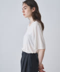■肘丈のハーフスリーブがカジュアル見えを抑え、気になる二の腕をカバー。
