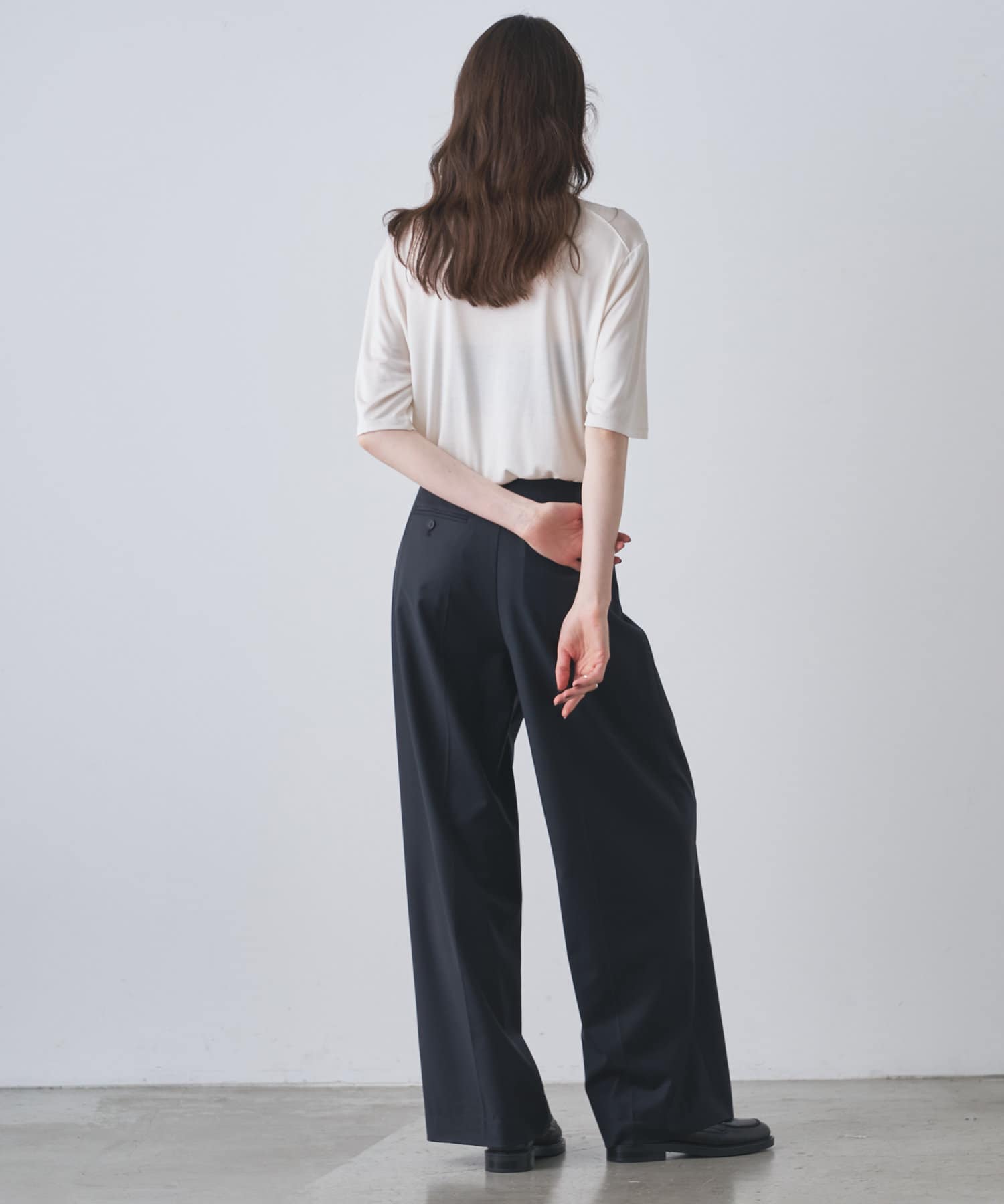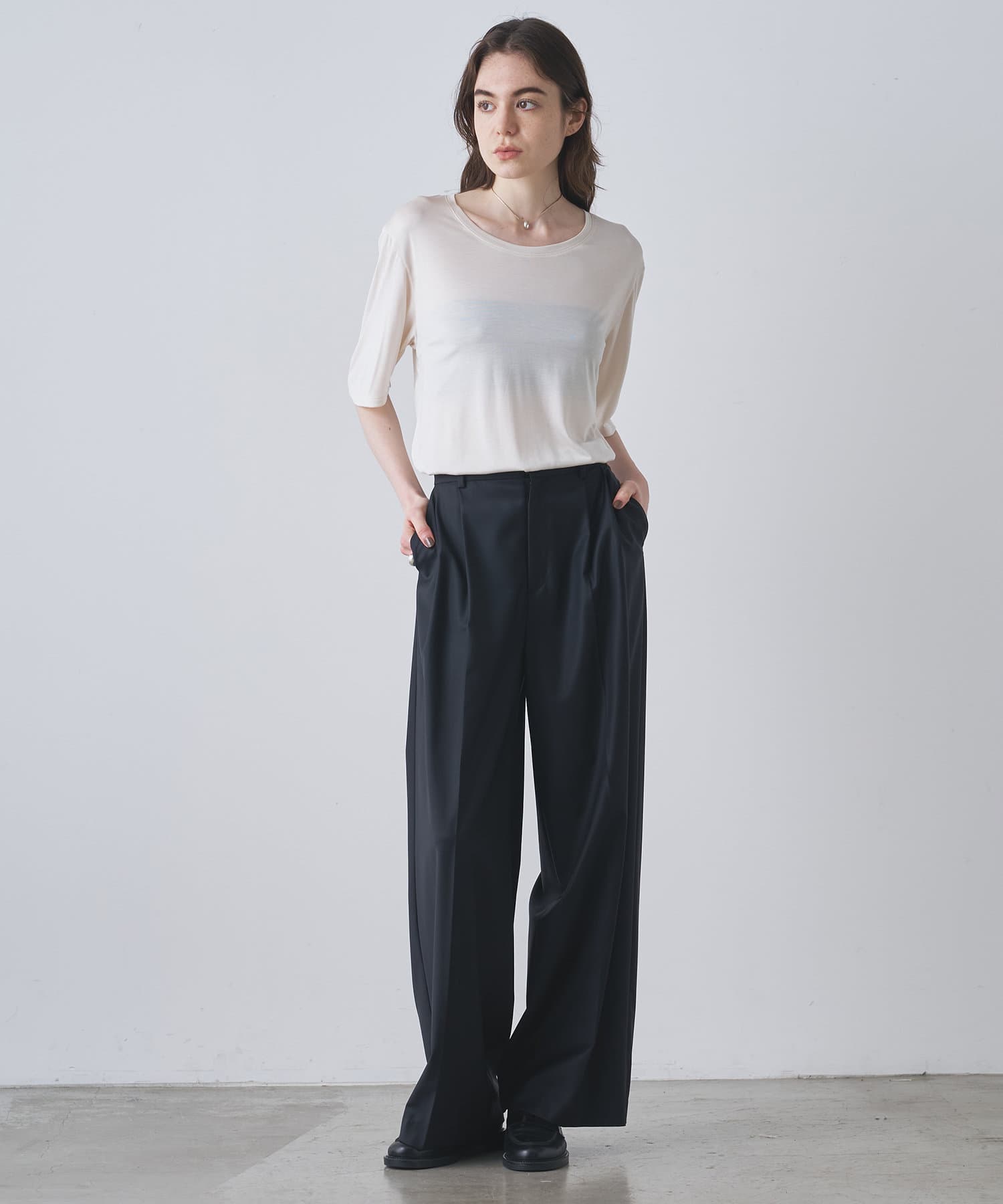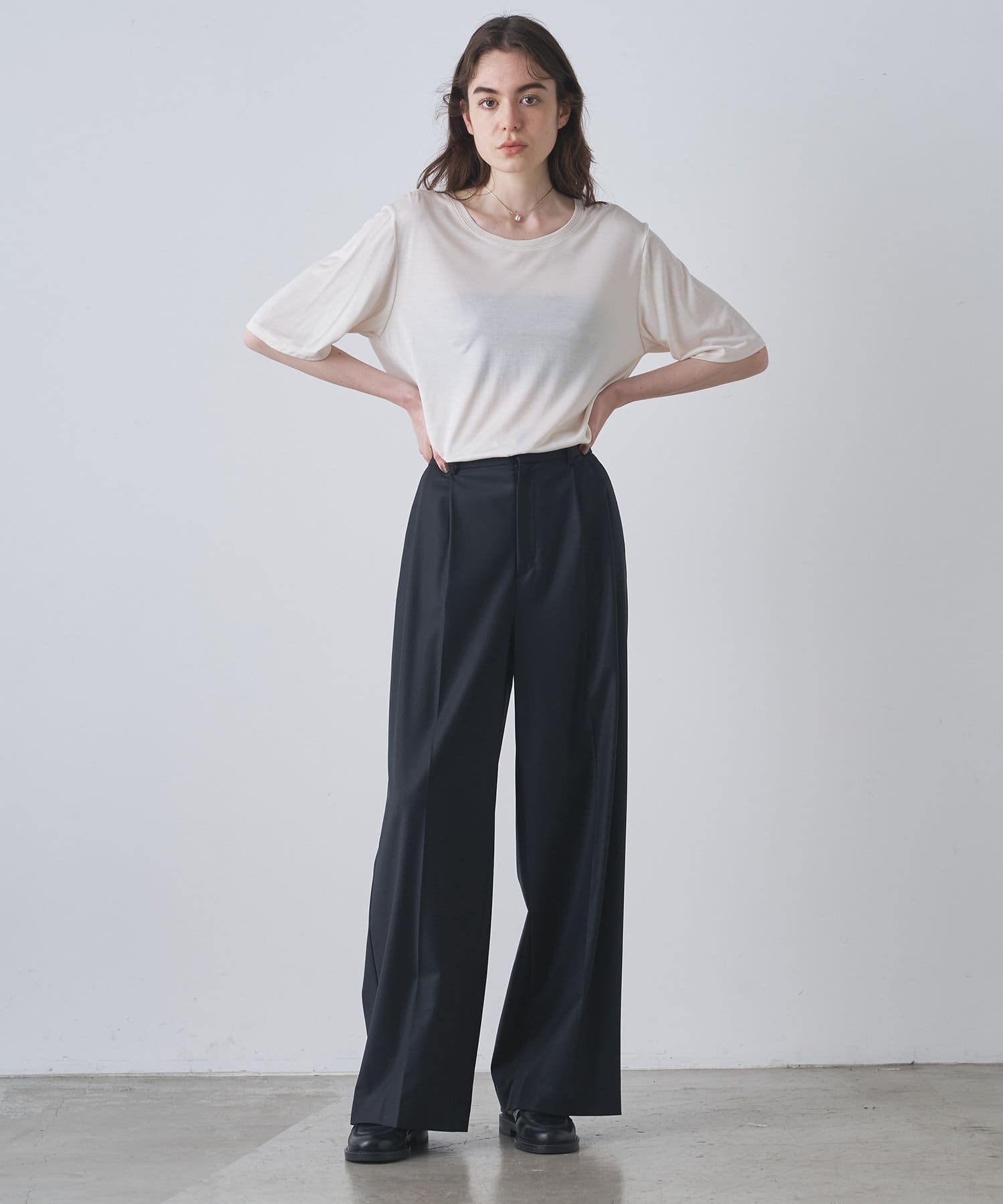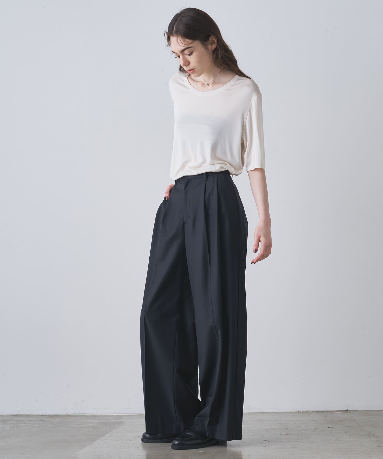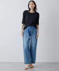 ■程よい開きのラウンドネックとワイドシルエットがリラクシーな一着。