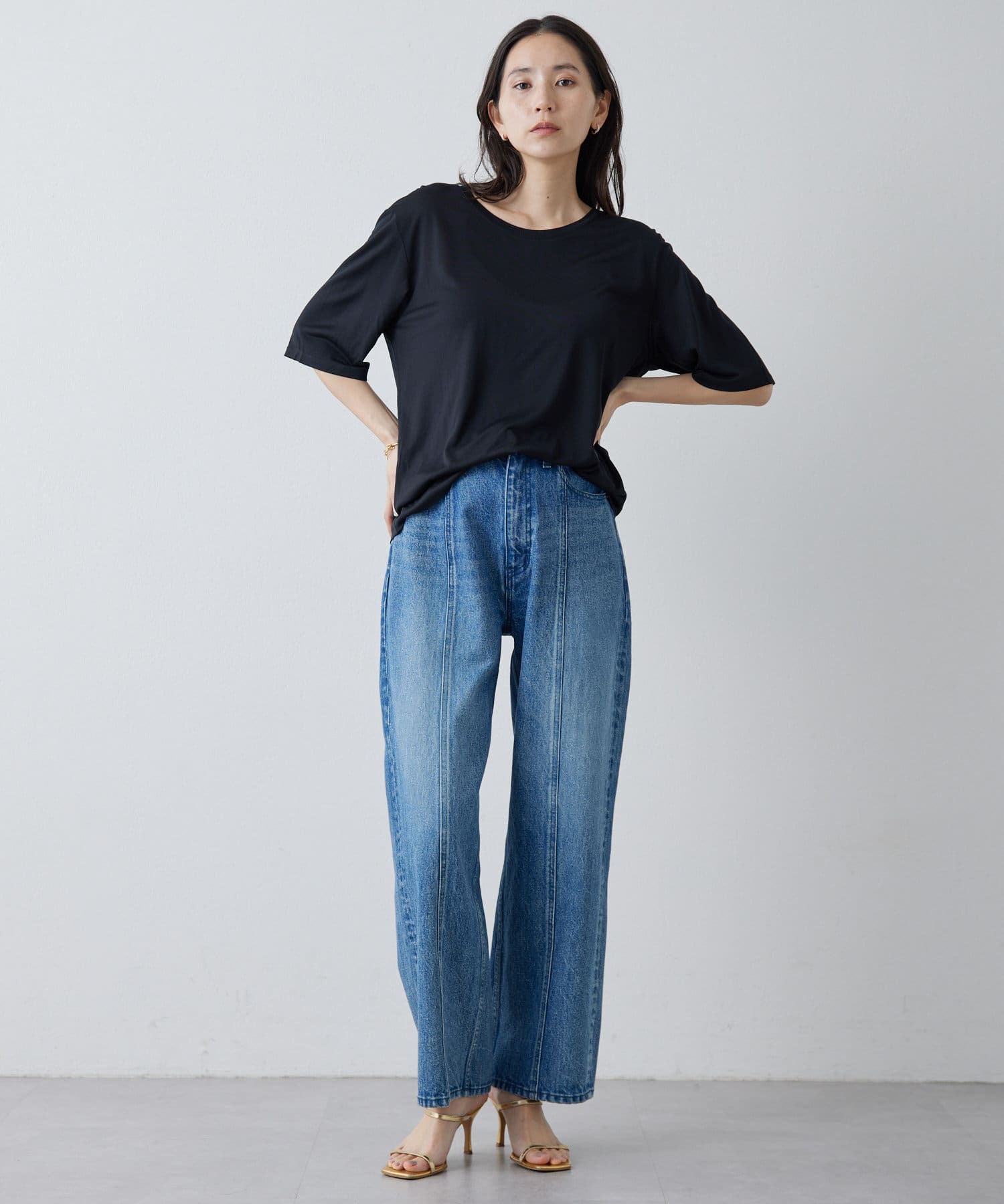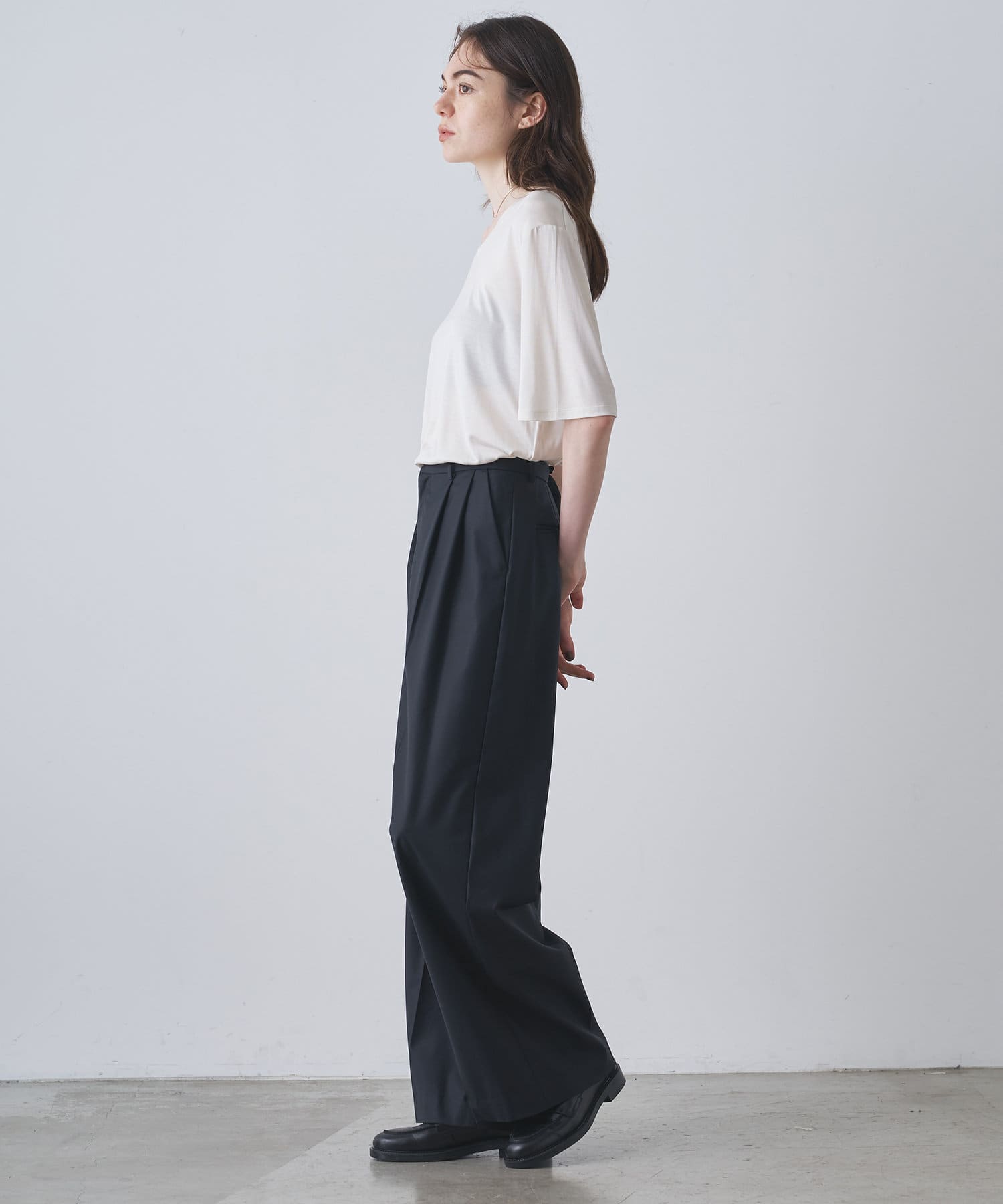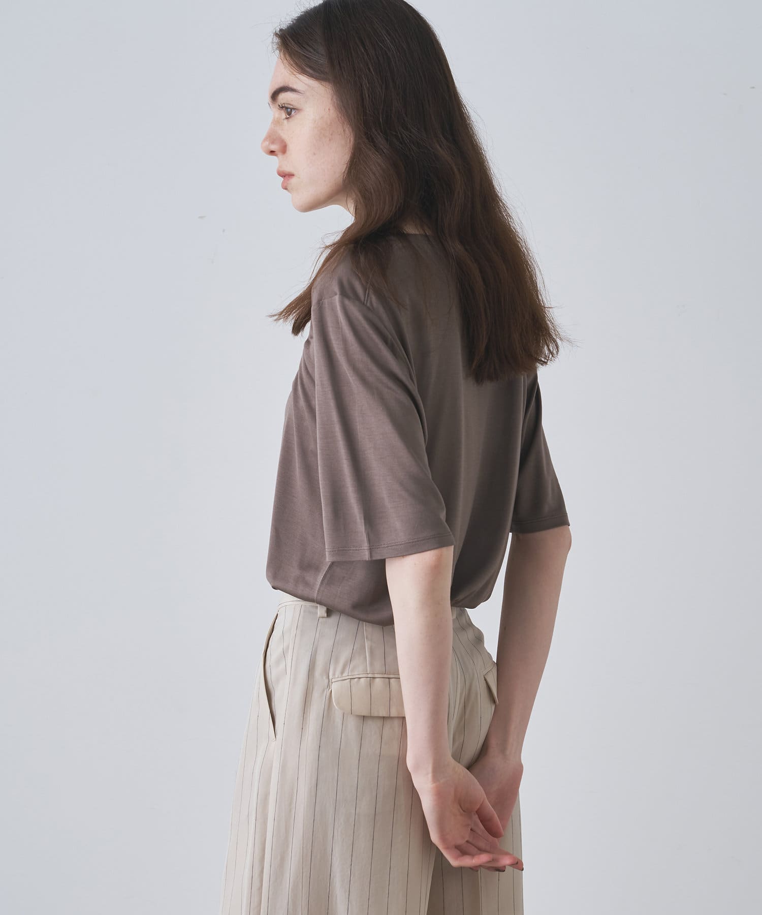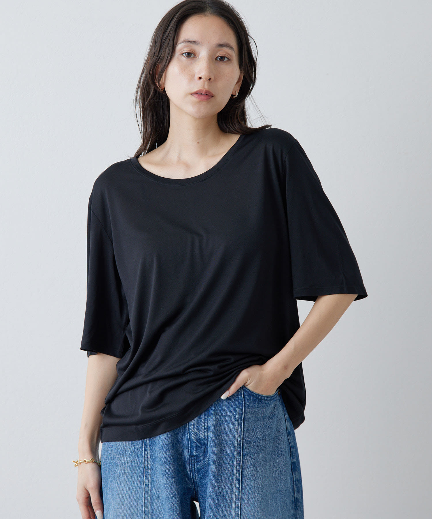 ■程よい開きのラウンドネックとワイドシルエットがリラクシーな一着。