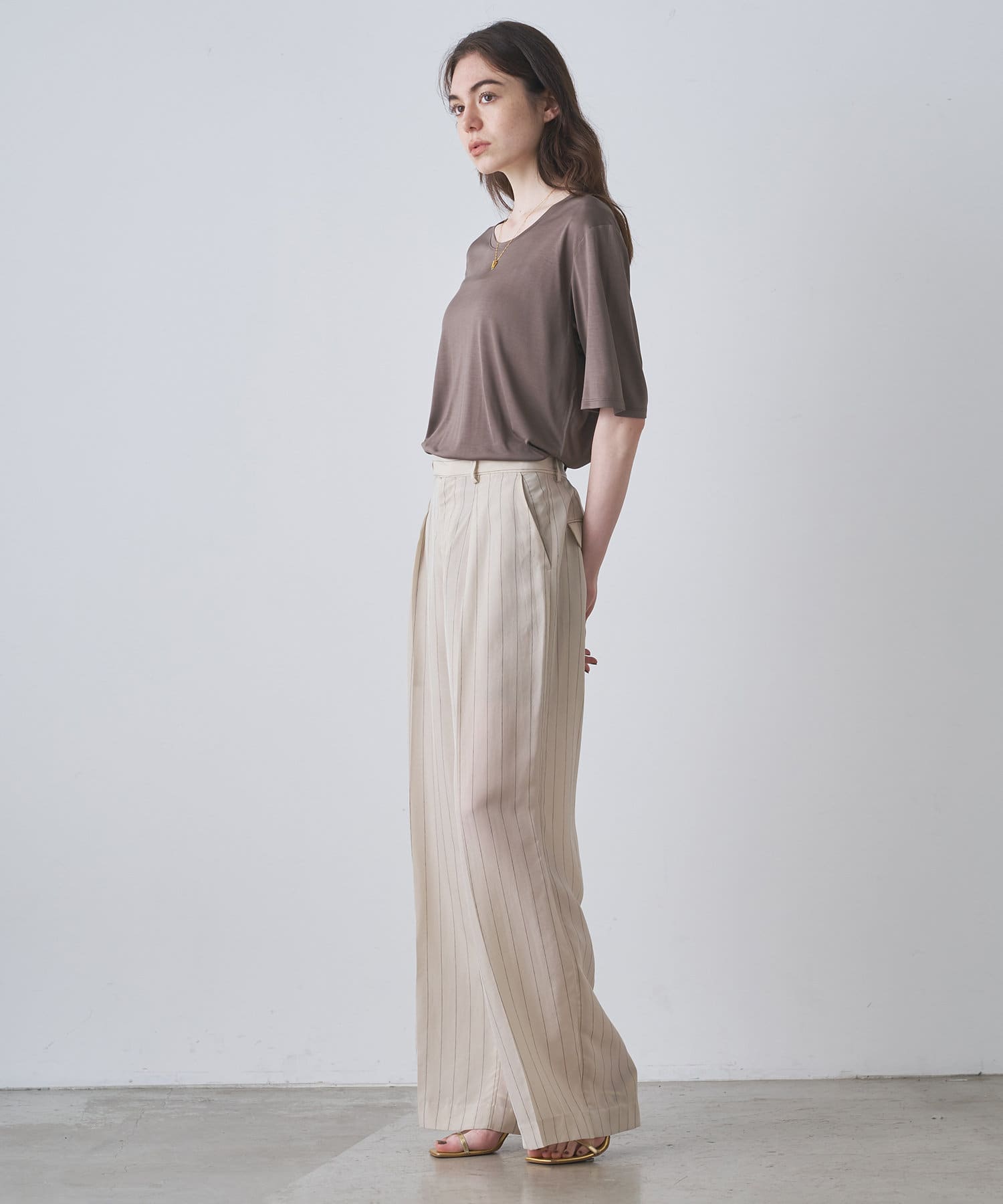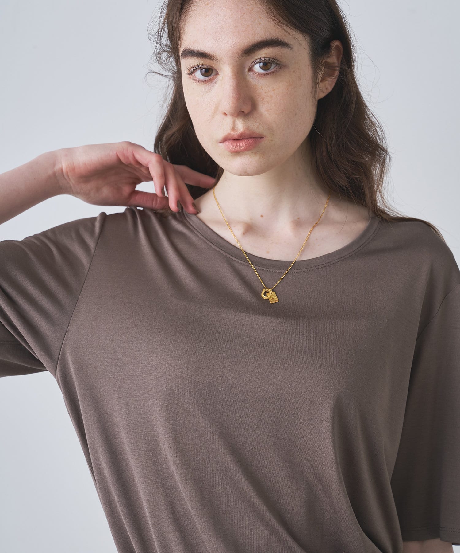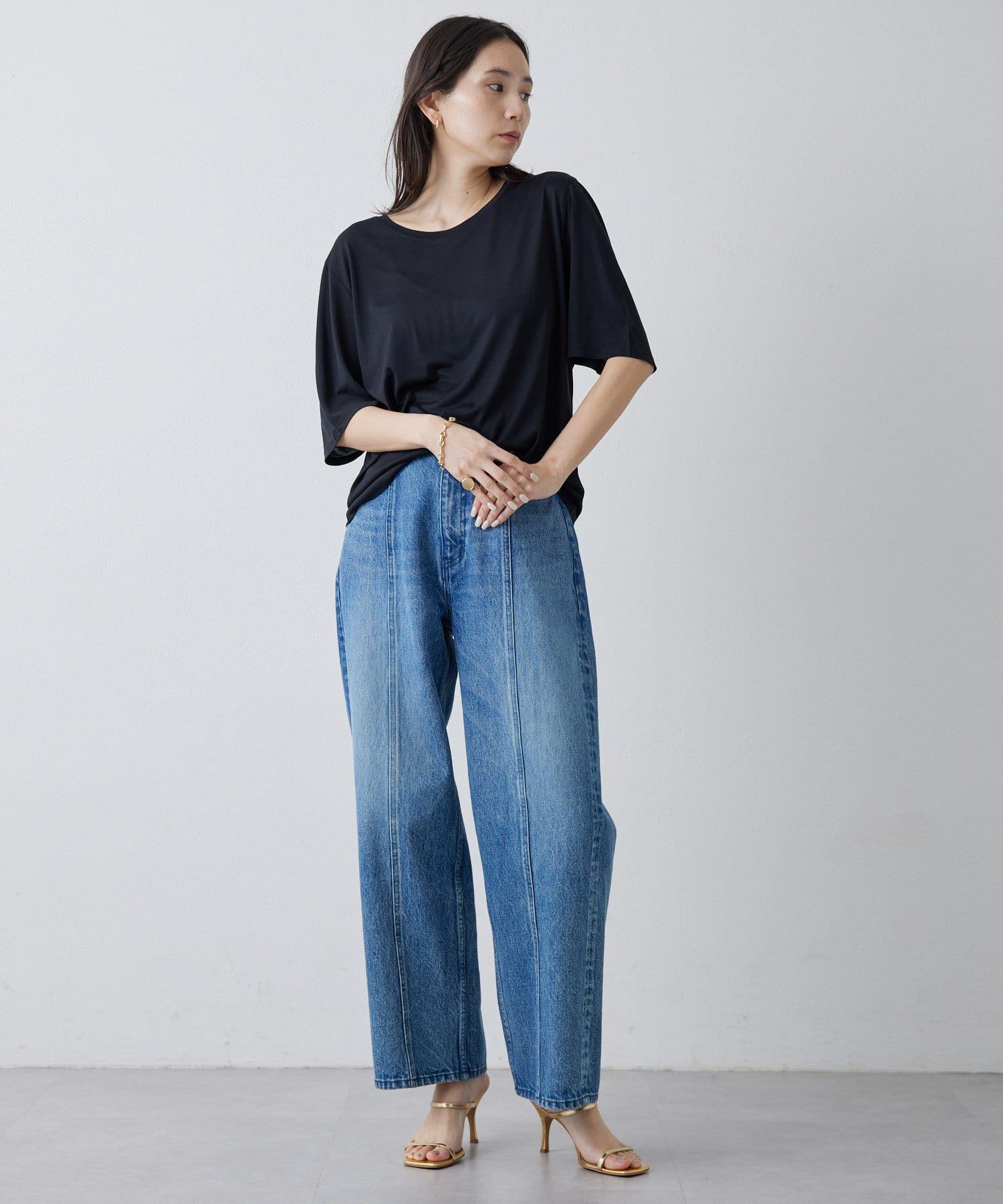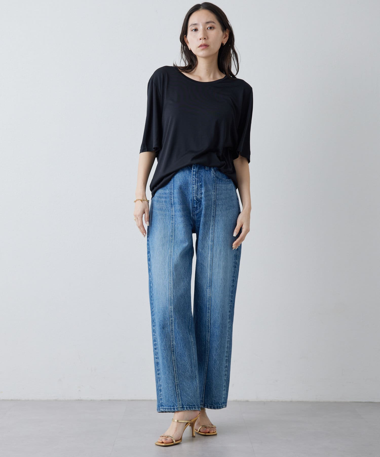■程よい開きのラウンドネックとワイドシルエットがリラクシーな一着。