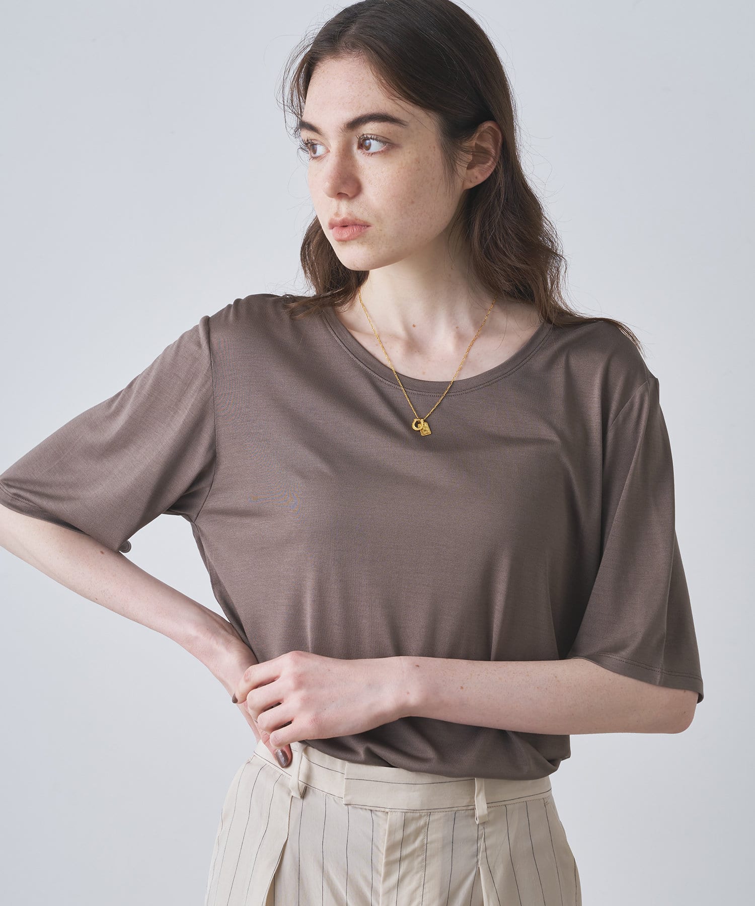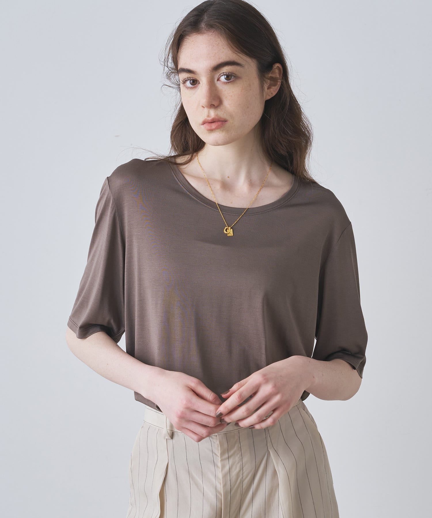 程よい光沢とドレープ感が特徴のシルク100%のシルクカットソー。
