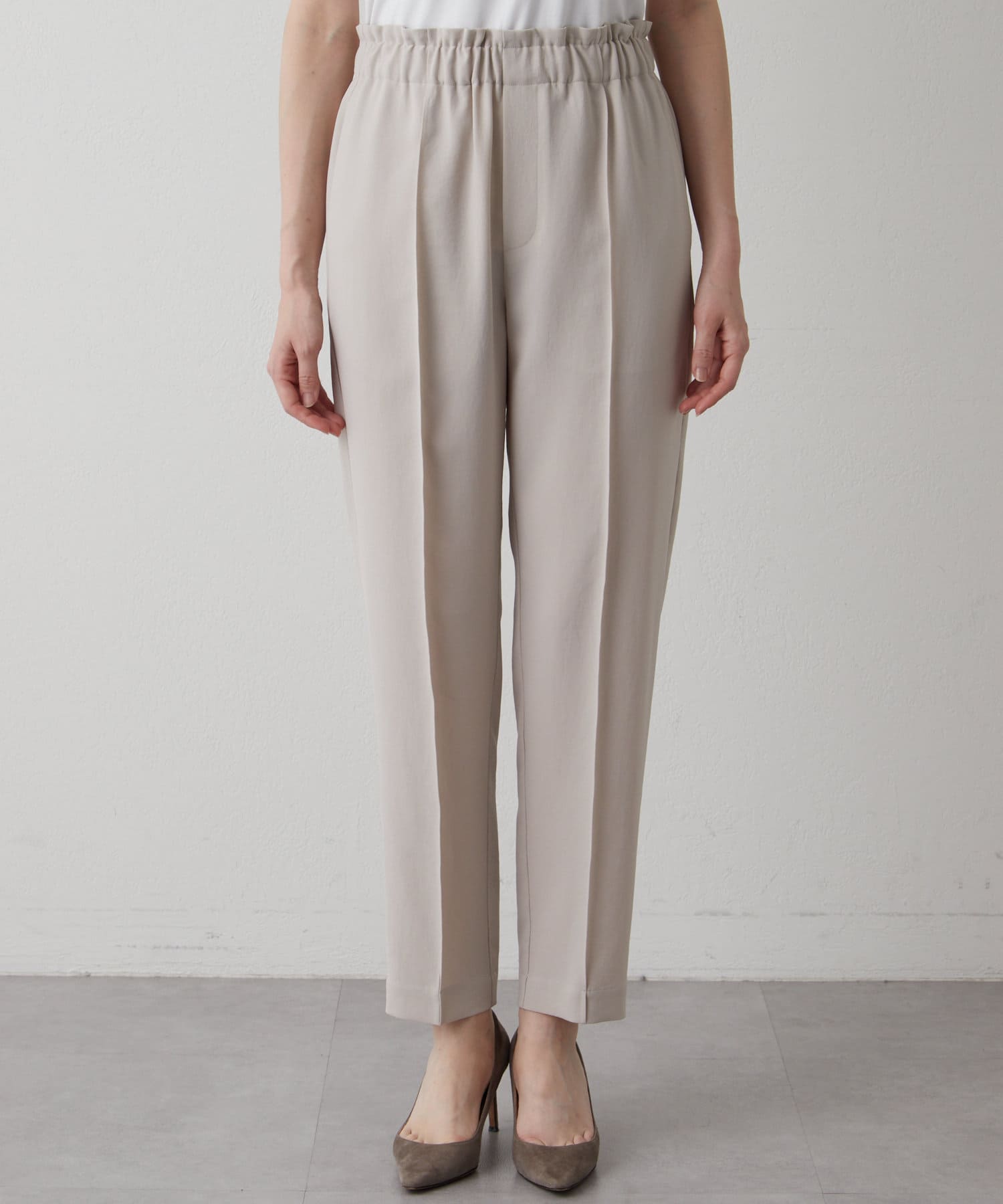 履いた瞬間これはいい!と感動したパンツ。ウエストがゴムなのでとにかく楽チン。テーパードシルエットなのできちんと感もありオフィスコーデにも。