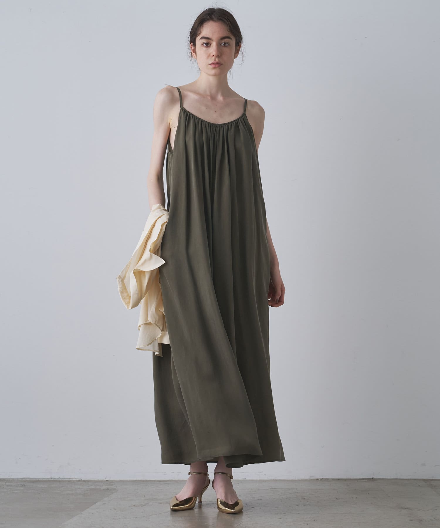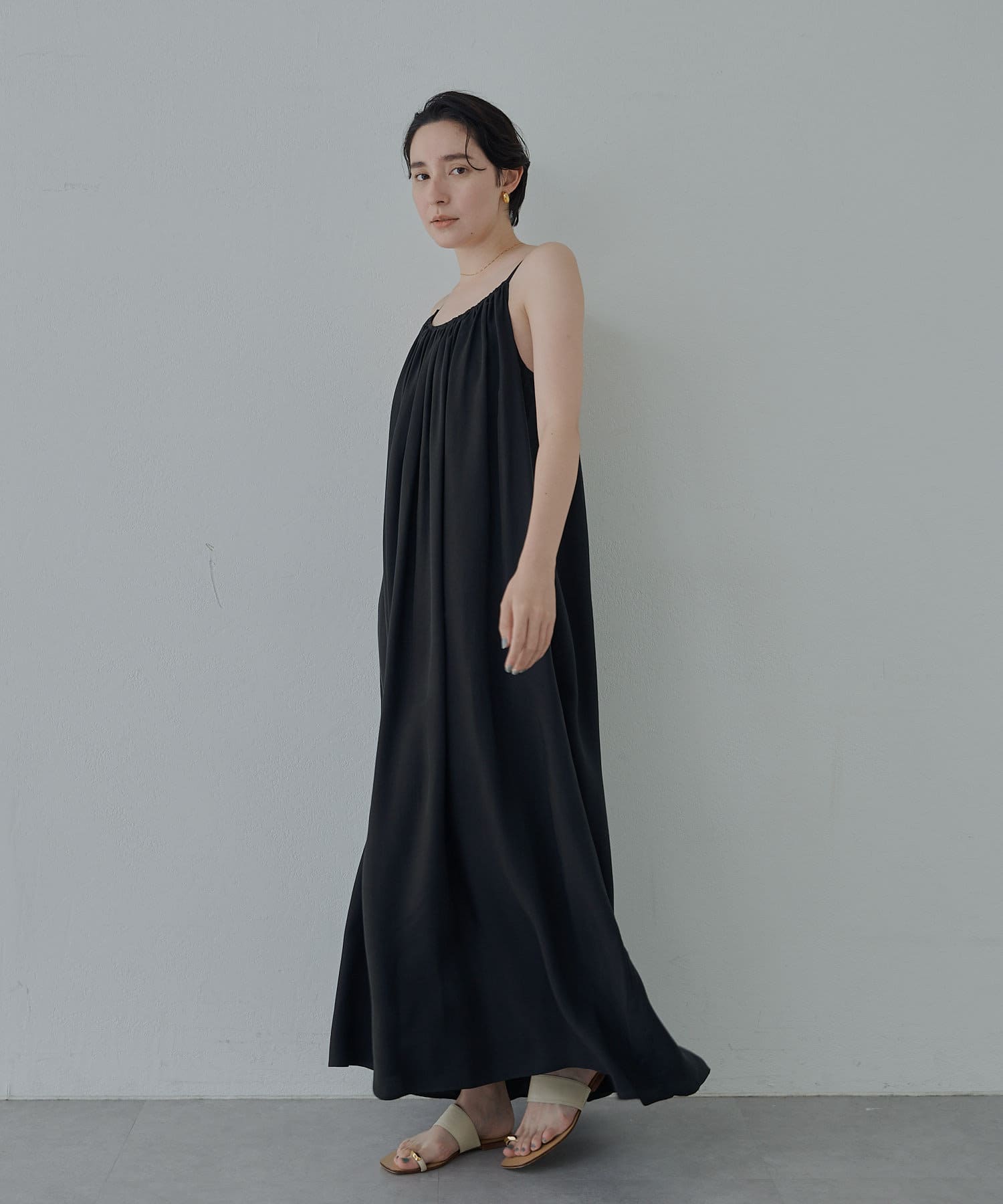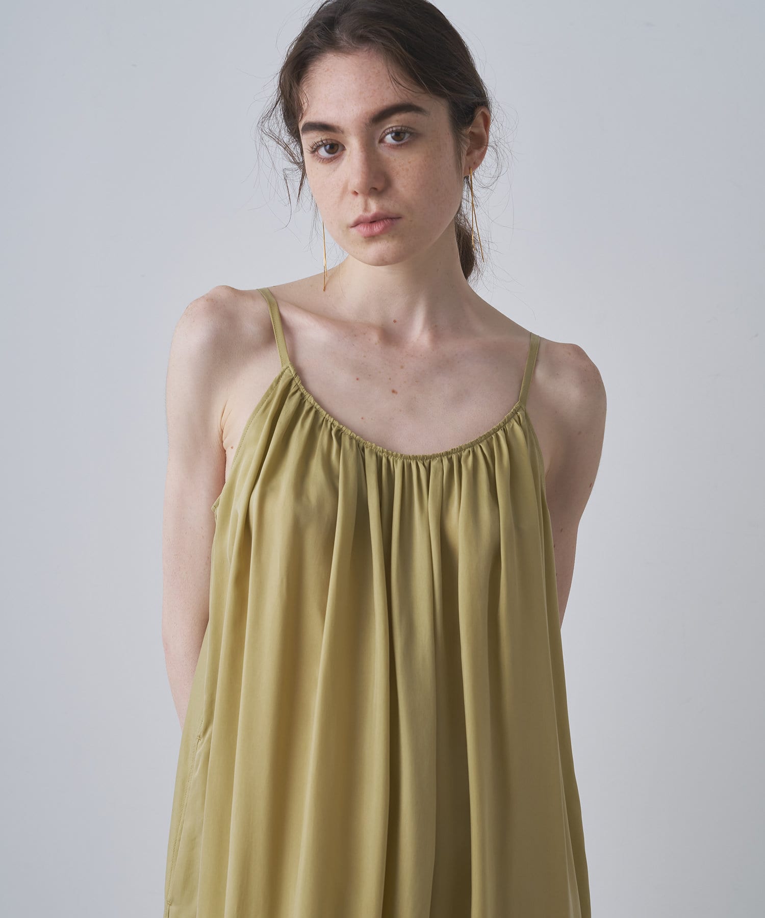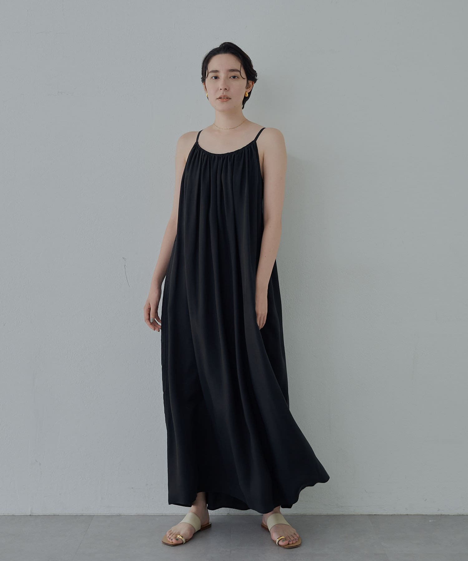■衿ぐりのたっぷりとしたタックギャザーが目を惹くキャミワンピース。