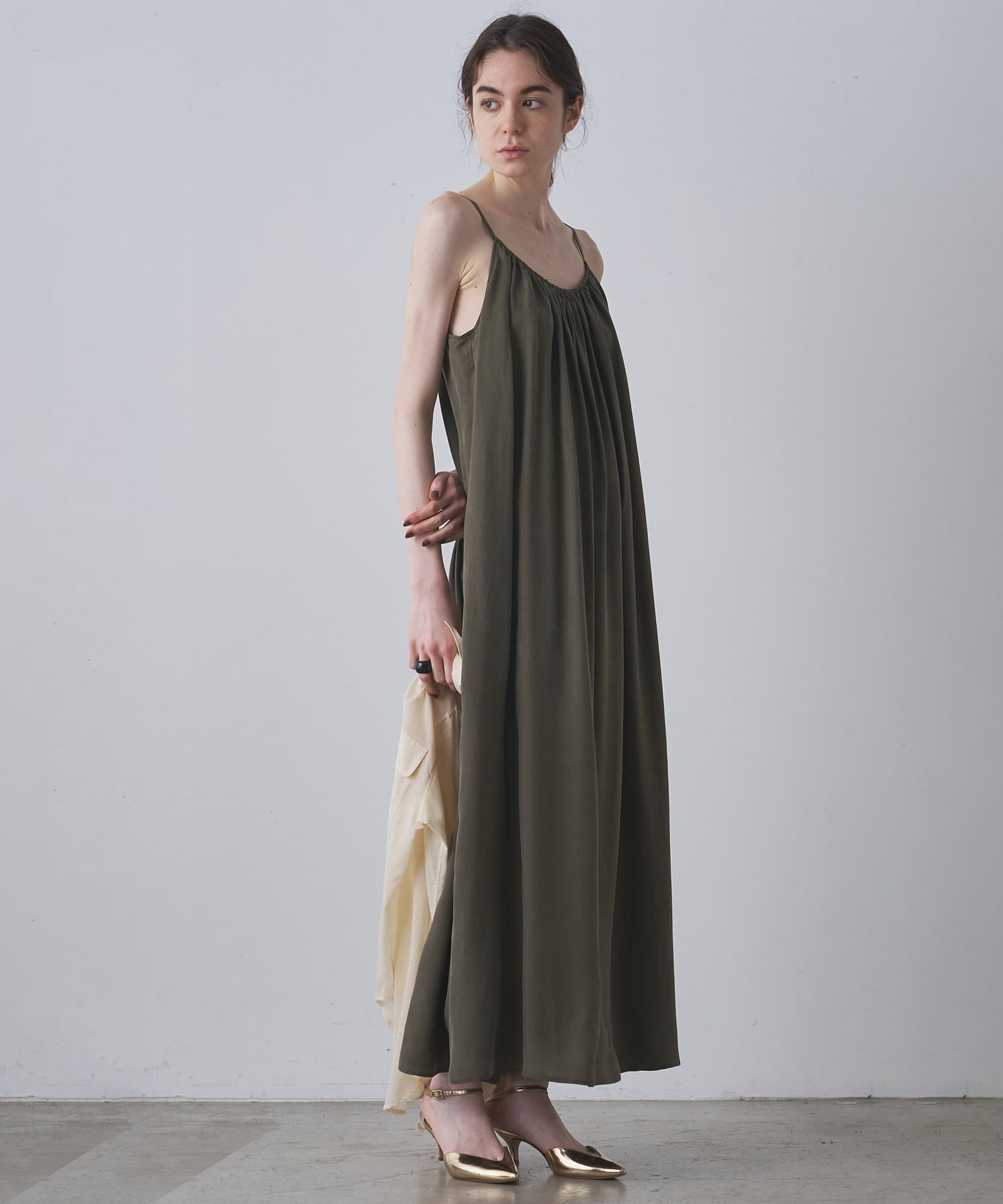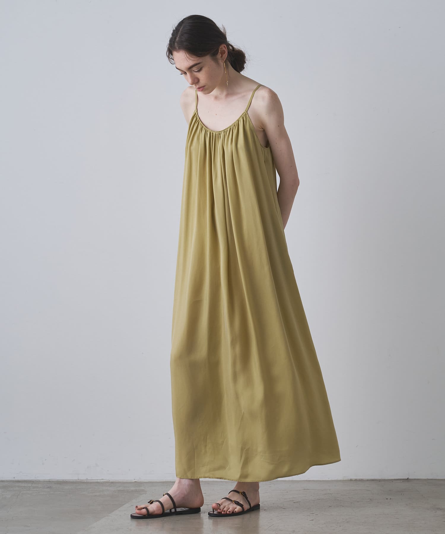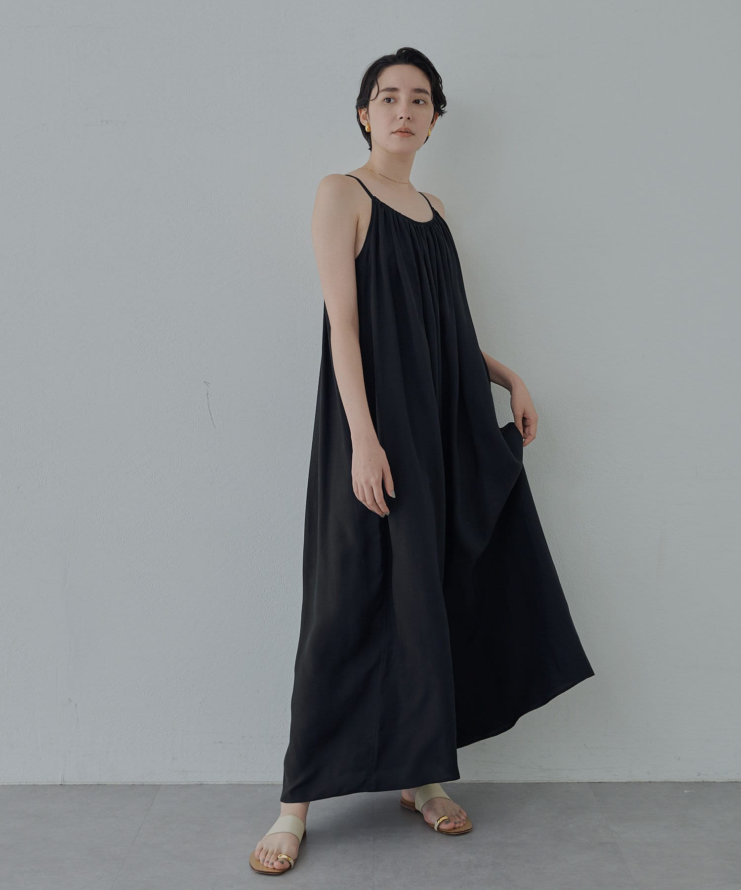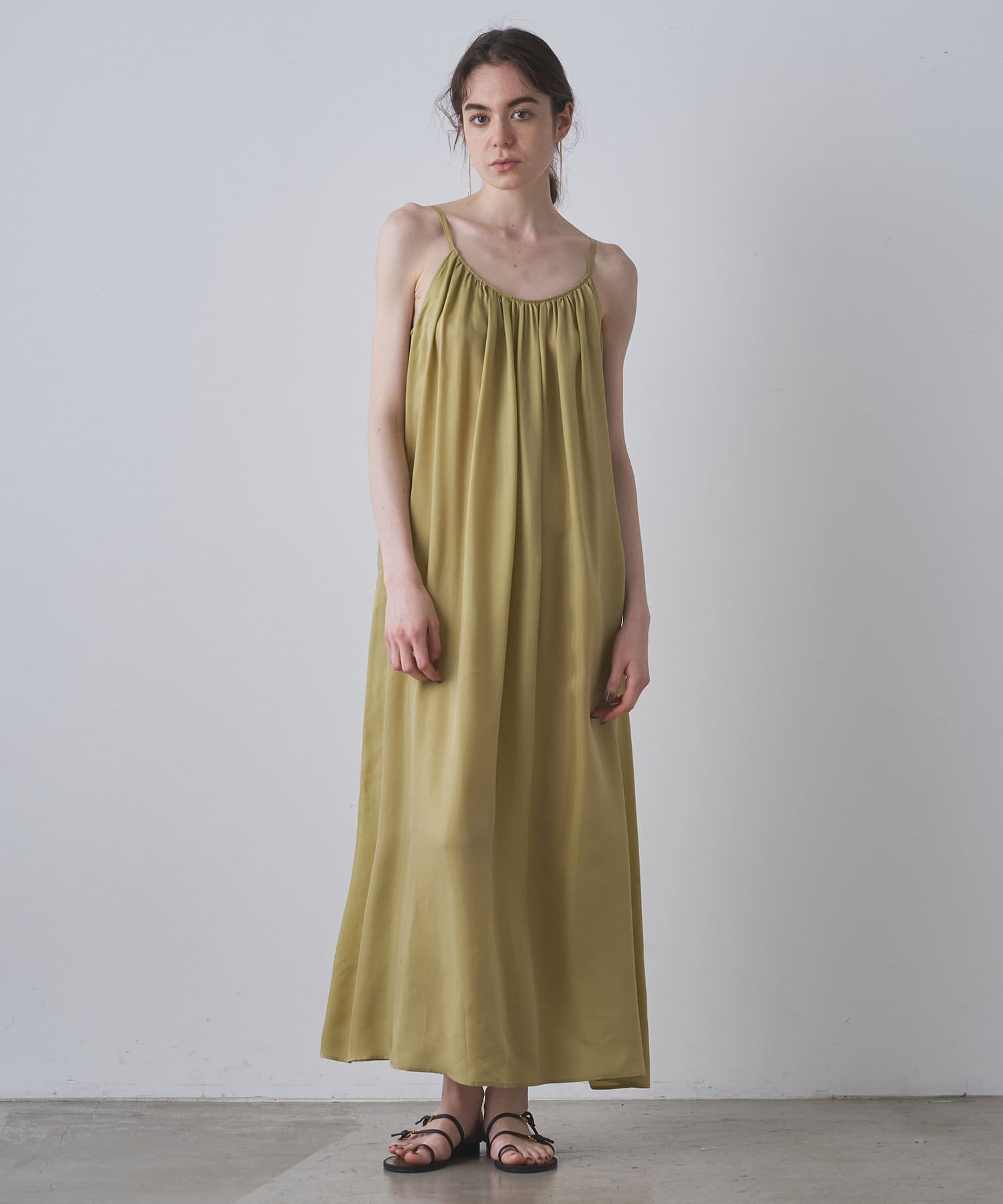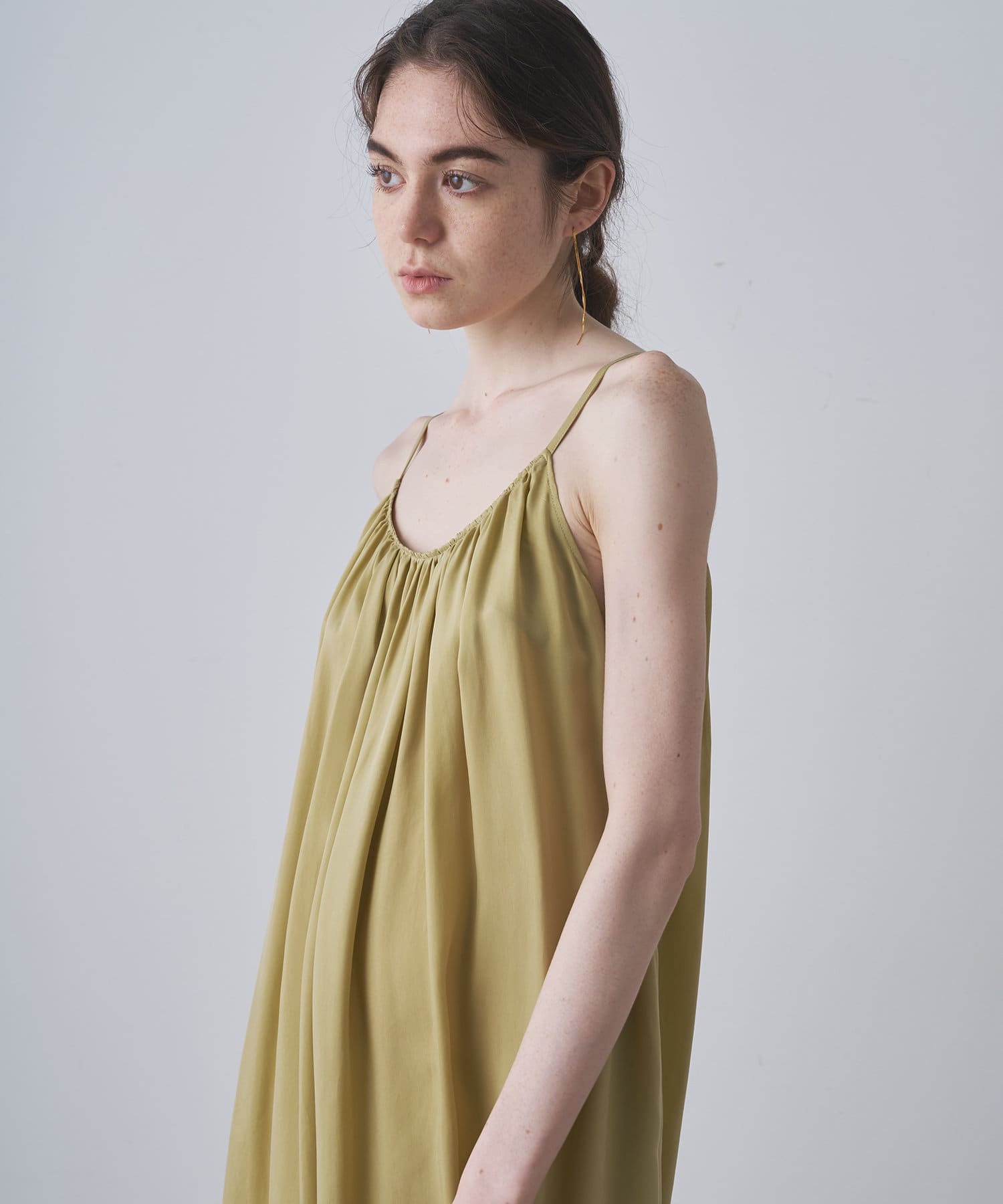 ■衿ぐりのたっぷりとしたタックギャザーが目を惹くキャミワンピース。