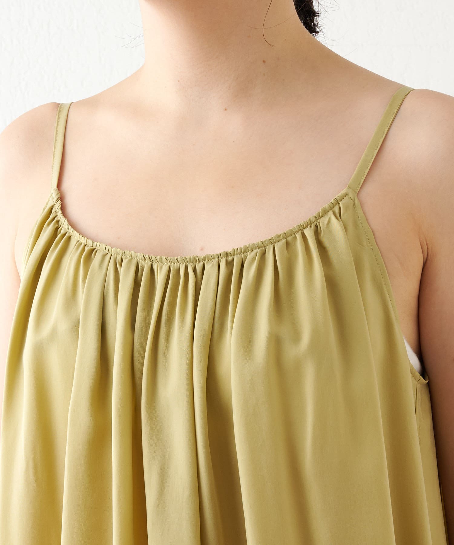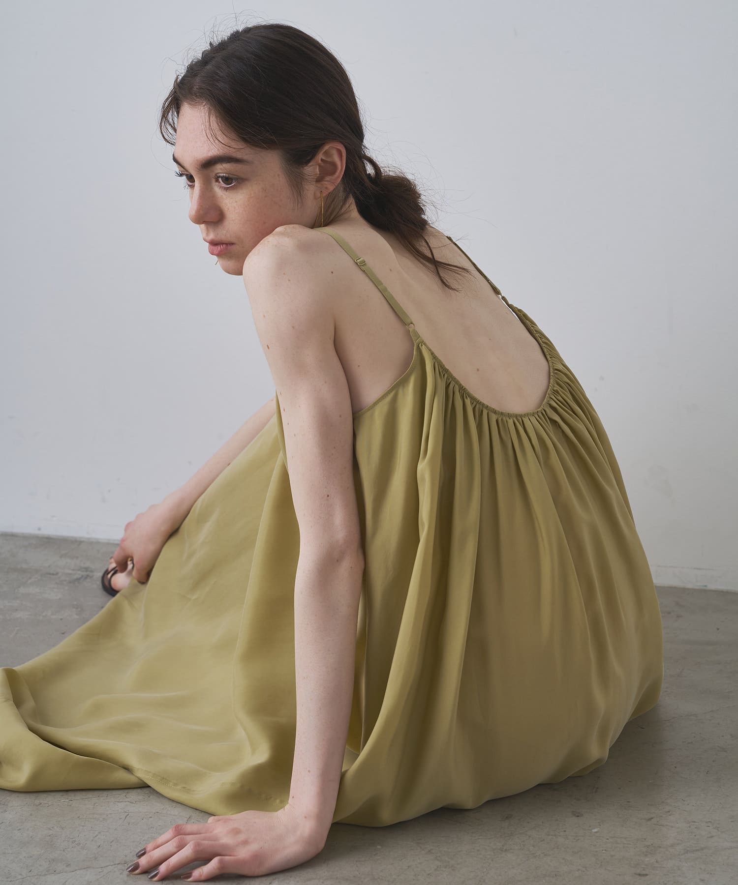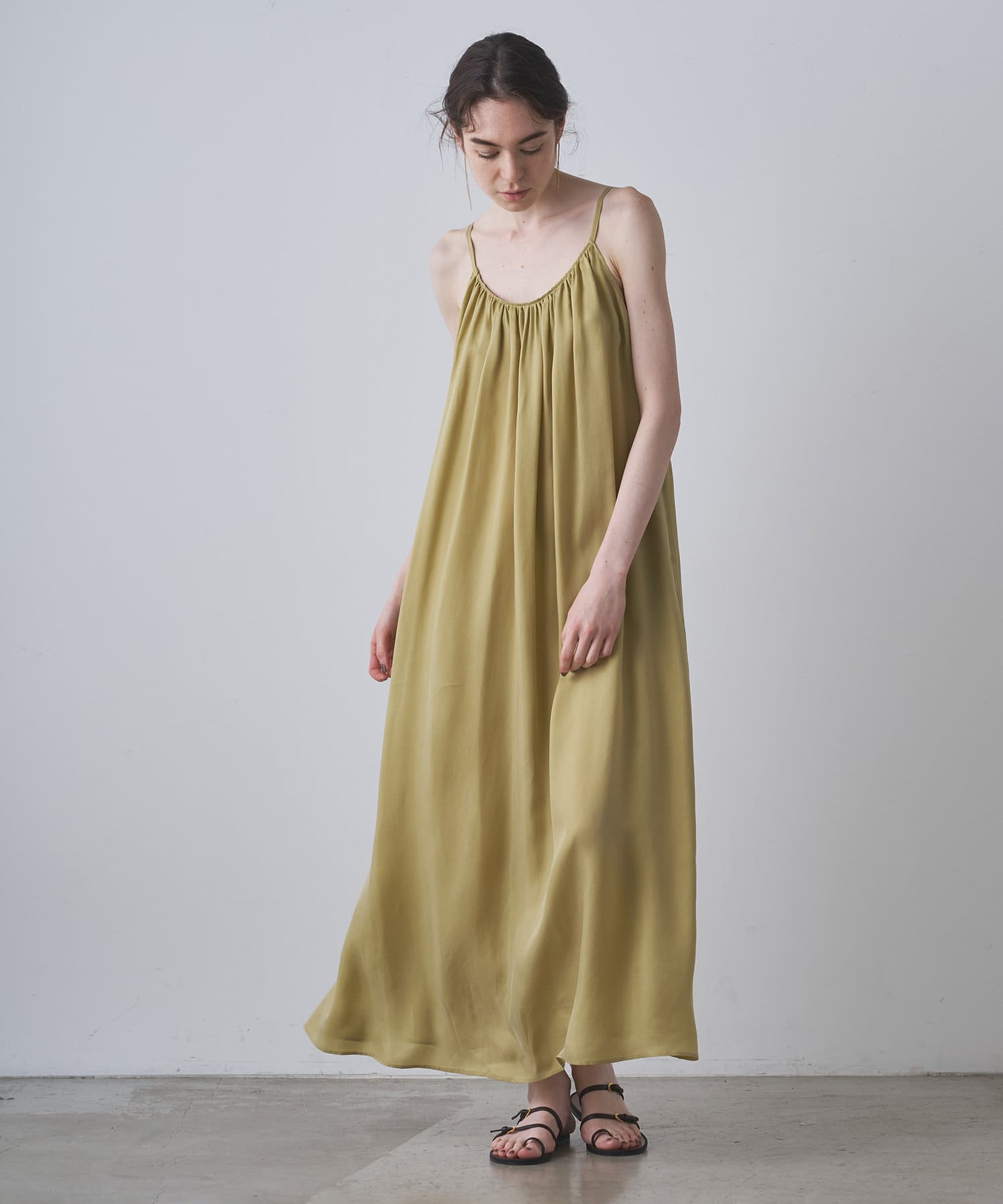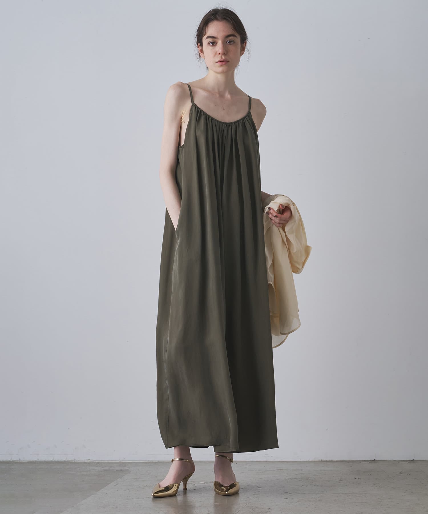 ■衿ぐりのたっぷりとしたタックギャザーが目を惹くキャミワンピース。