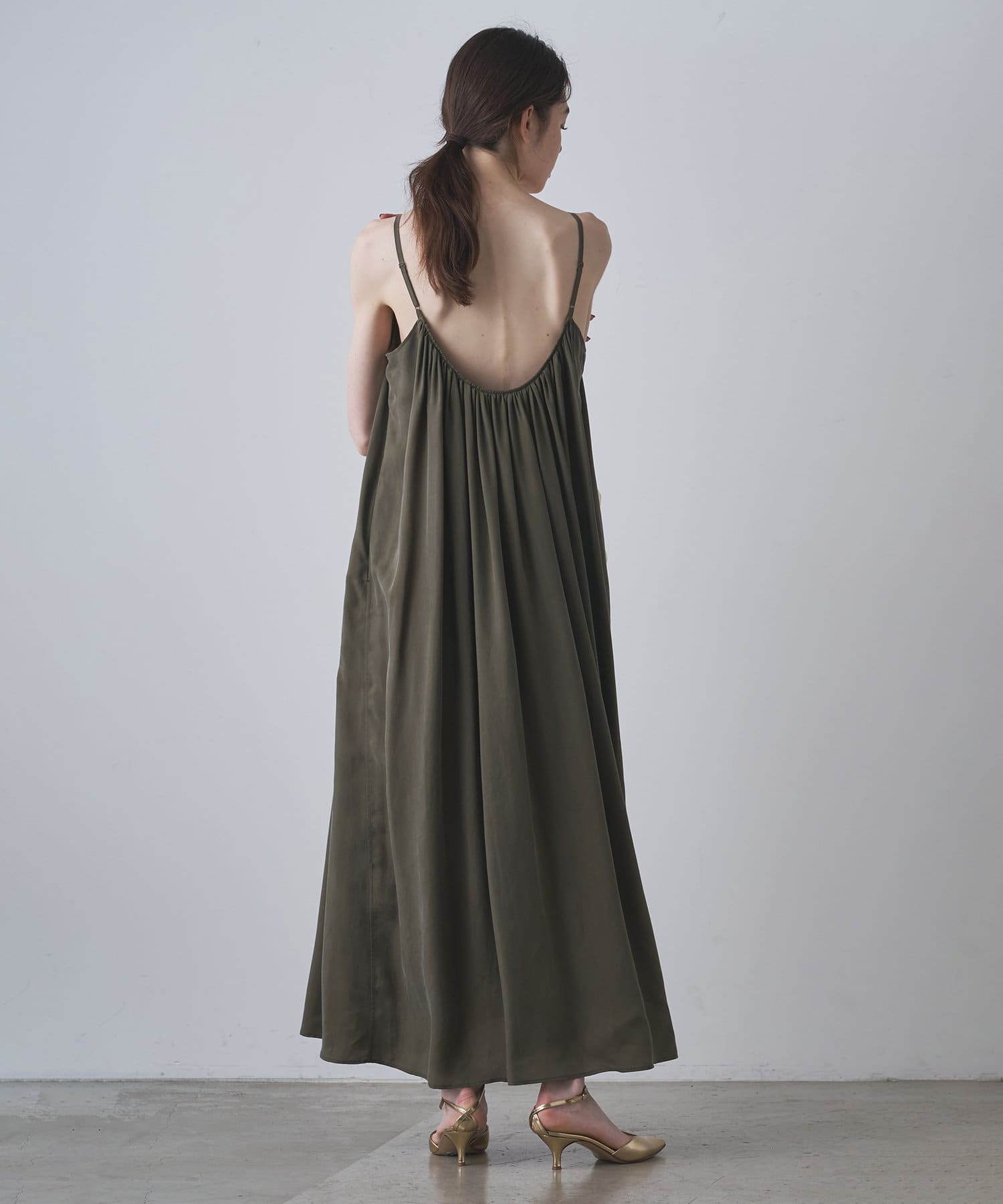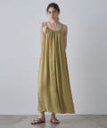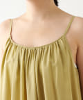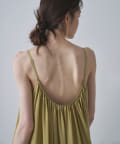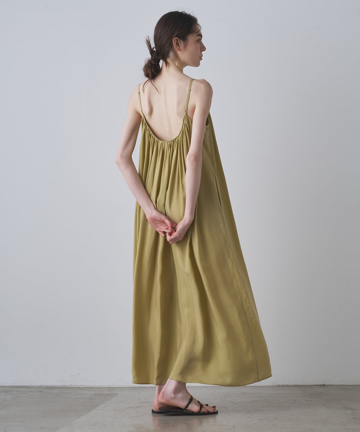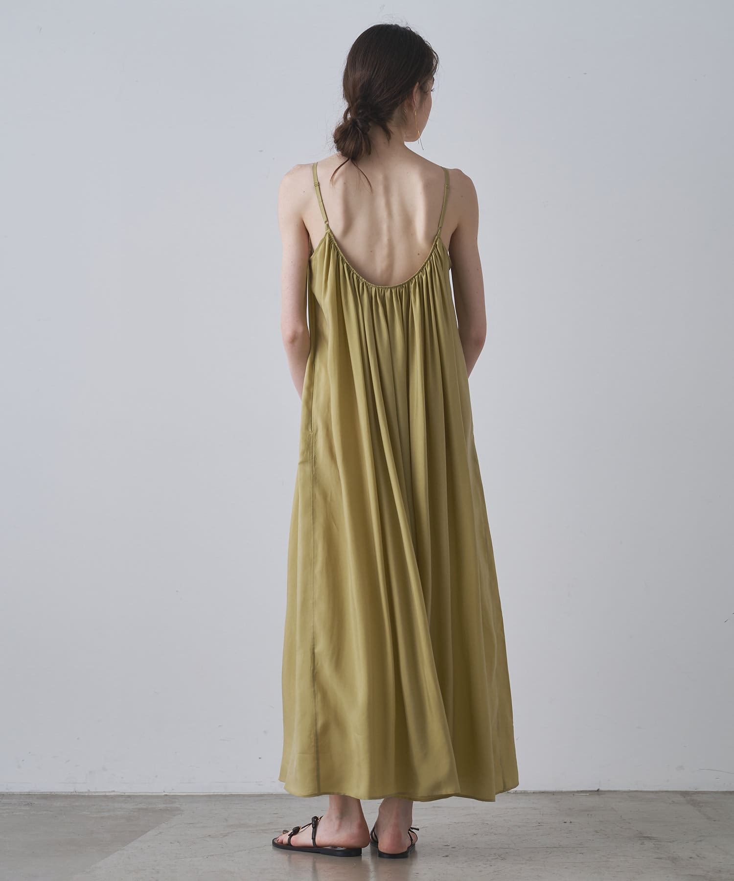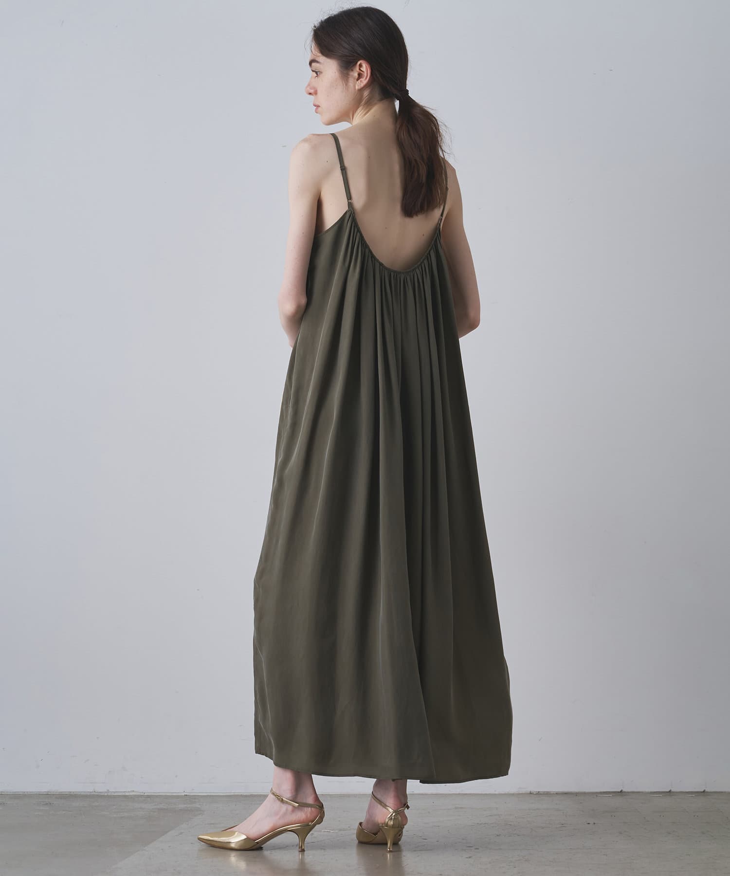 ■衿ぐりのたっぷりとしたタックギャザーが目を惹くキャミワンピース。